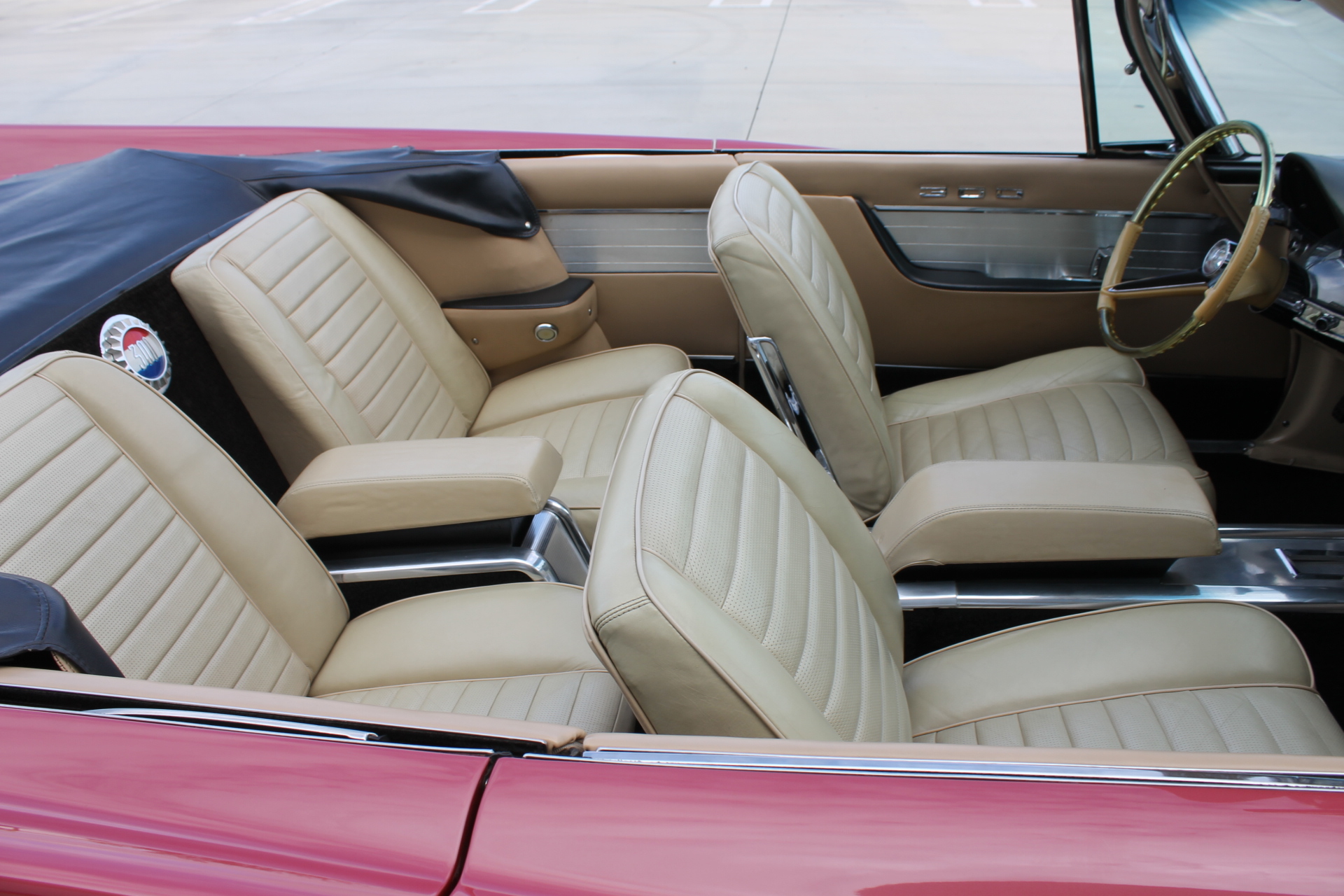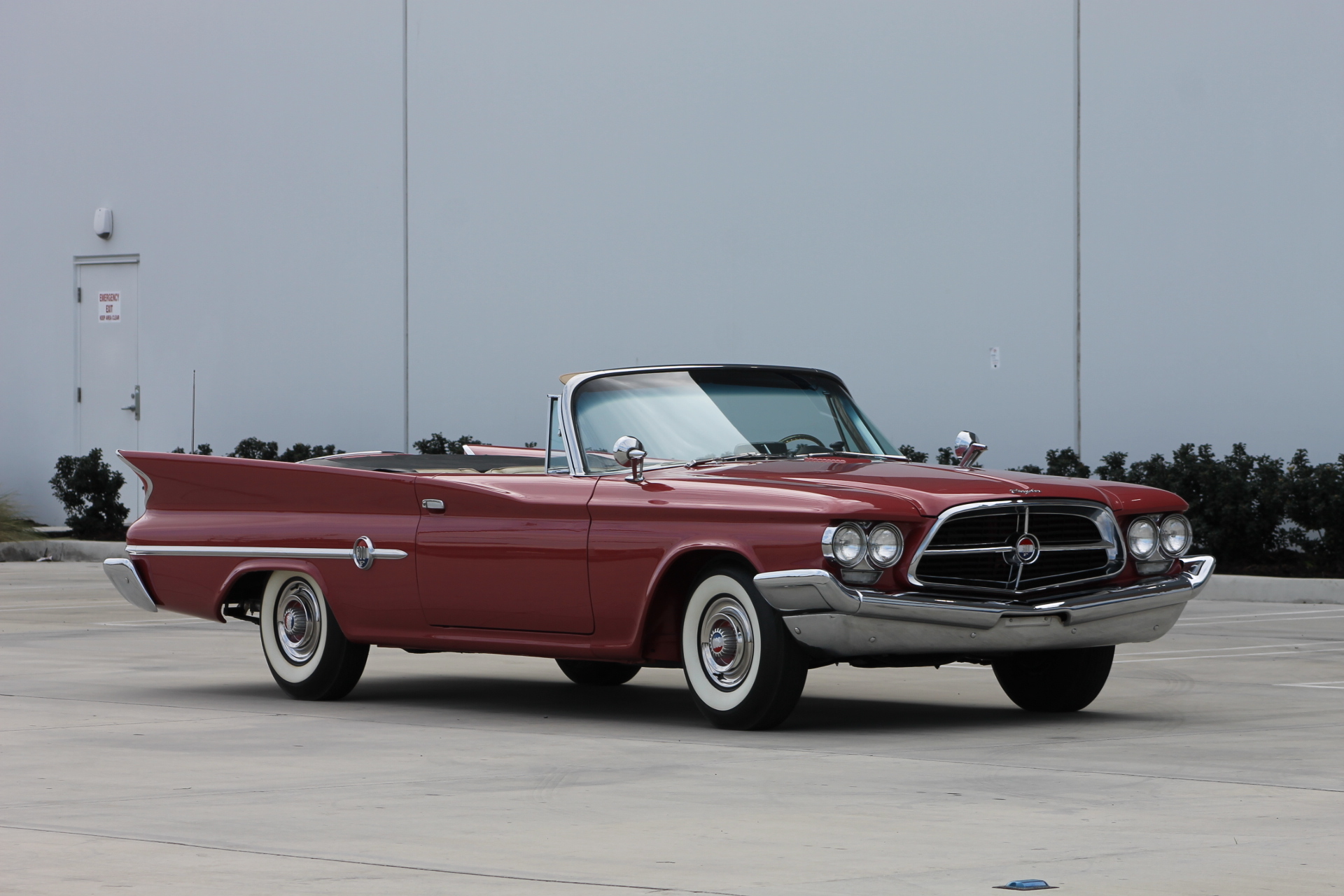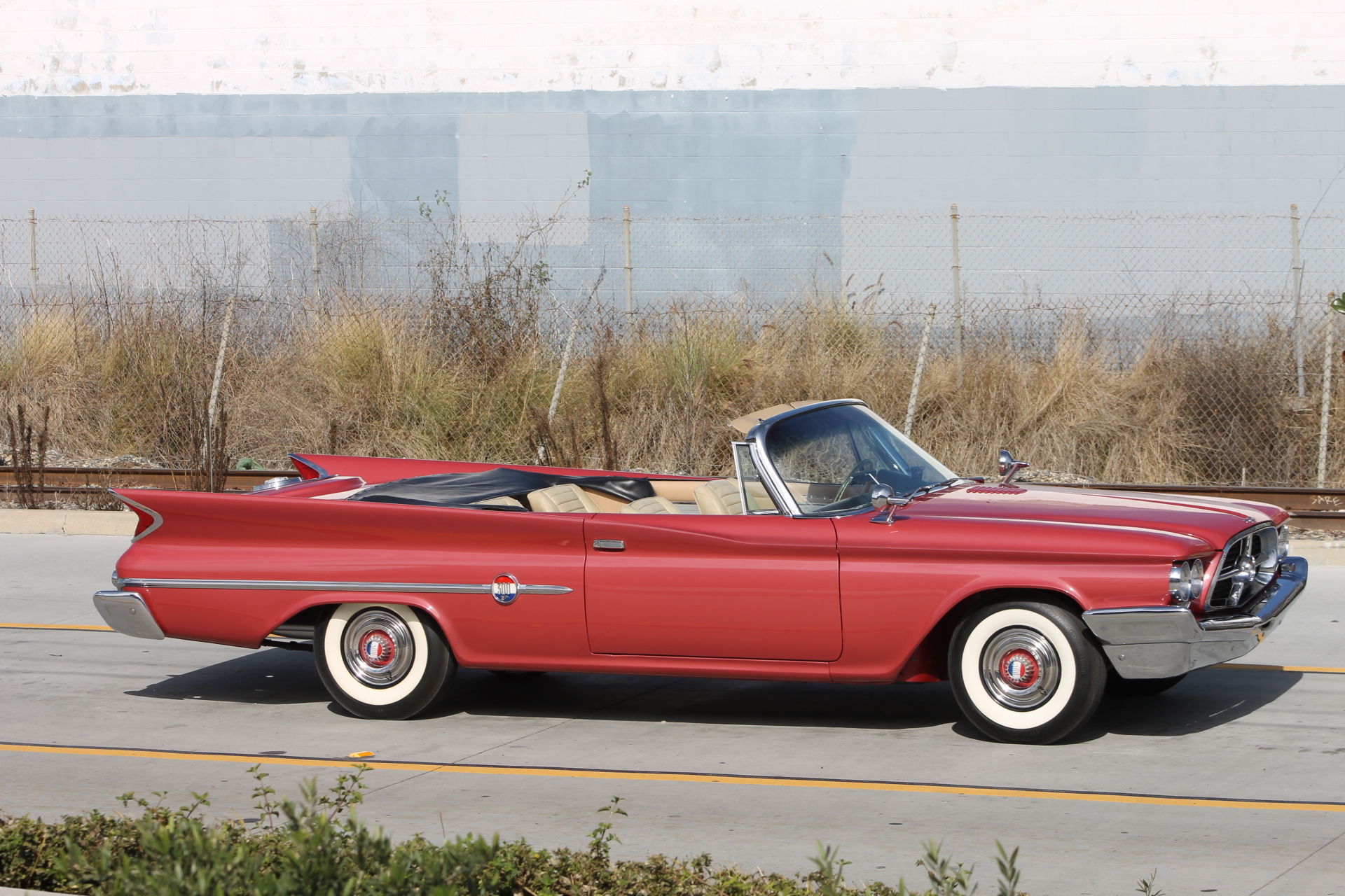 It is powered by a 413ci V8 linked with a push-button three-speed TorqueFlite automatic transmission, and it is refinished in Terra Cotta Metallic over beige leather. Equipment includes a power-operated beige convertible top, power steering, power-assisted brakes, 14″ steel wheels with chrome covers, an AstraDome instrument cluster, power-adjustable front bucket seats, power windows, an Electro Touch-Tuner AM radio, and a full-length center console with front and rear armrests.