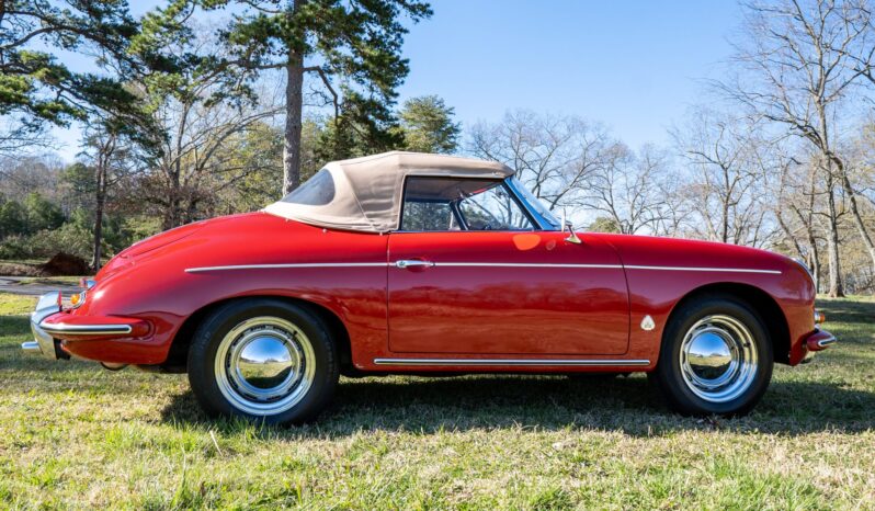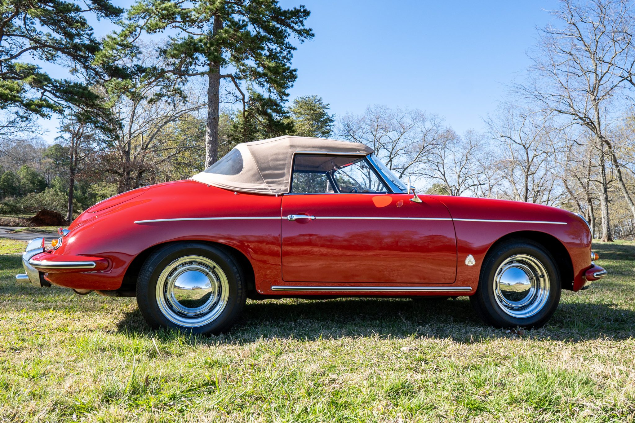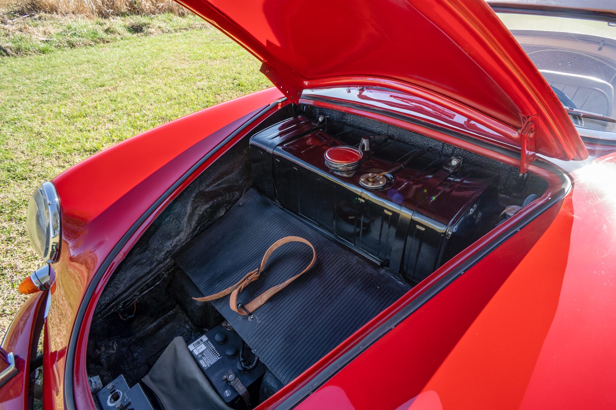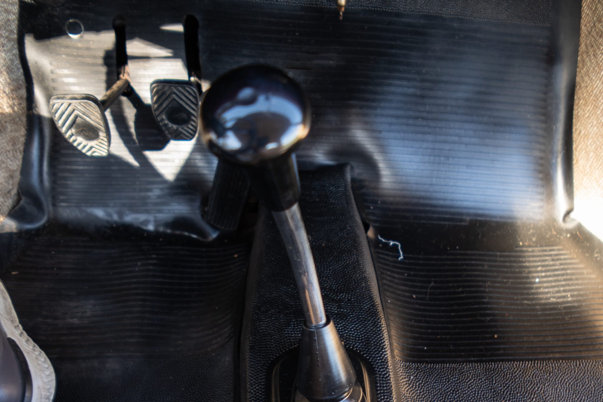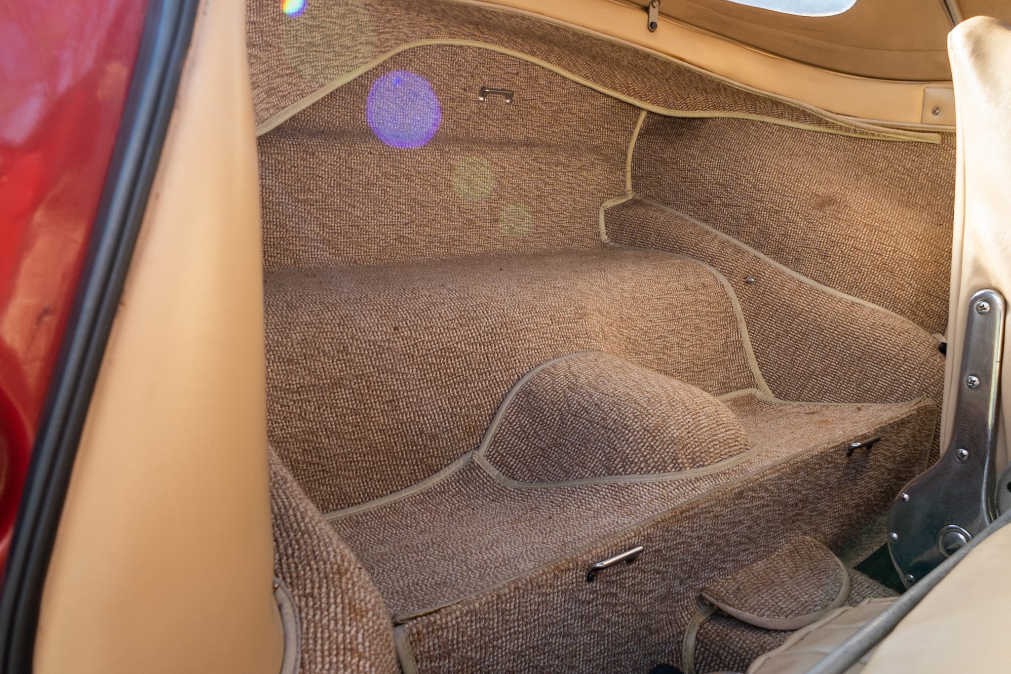The car is powered by a replacement 1.6-liter flat-four paired with a four-speed manual transaxle, and equipment includes a tan soft top, 15″ steel wheels, body-color bumpers, and front bucket seats.