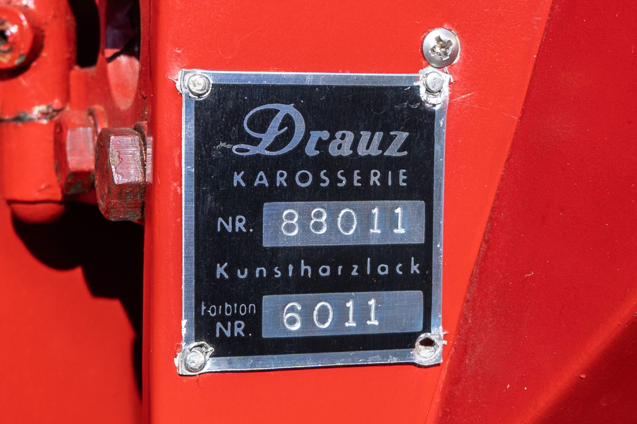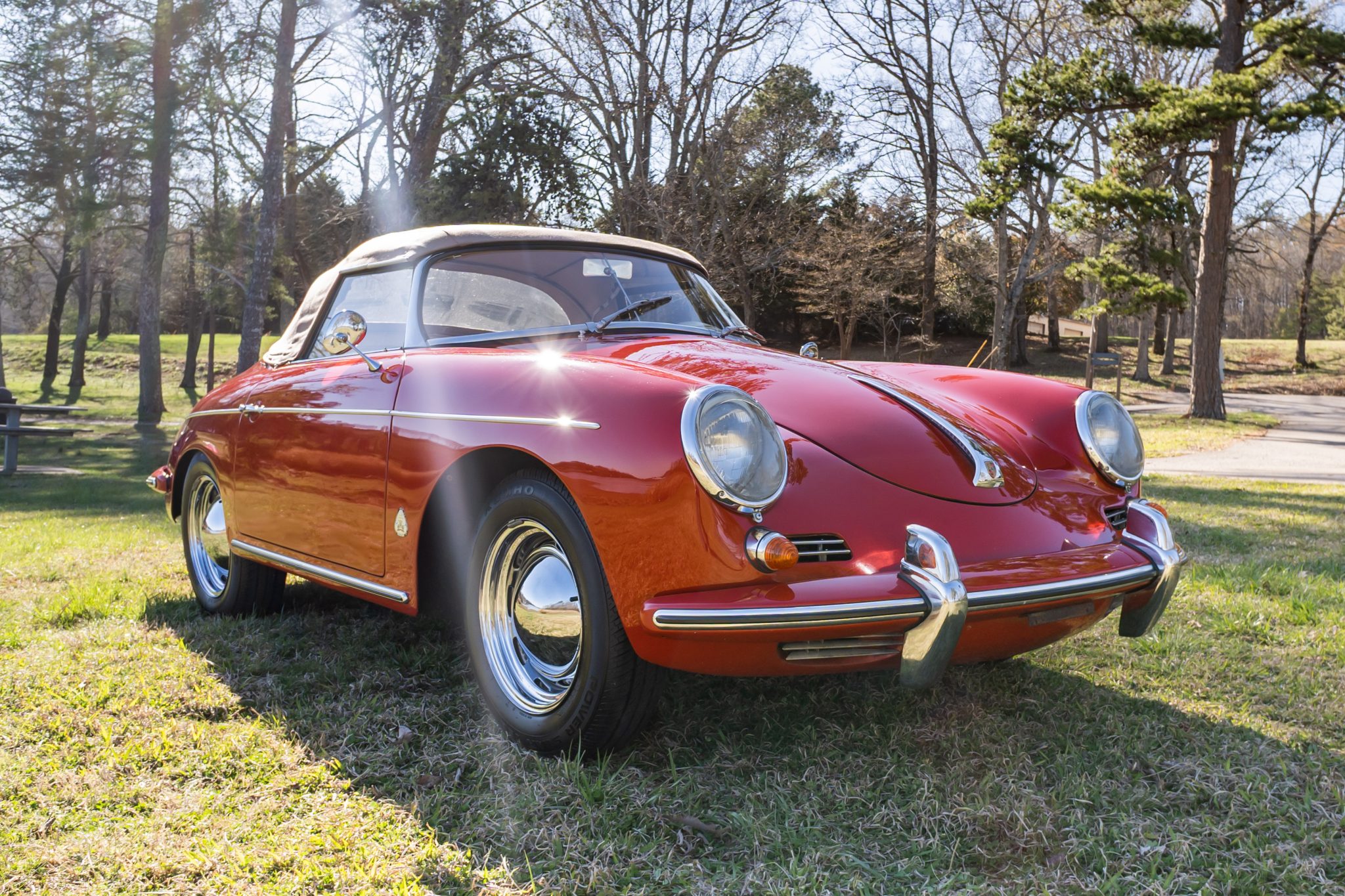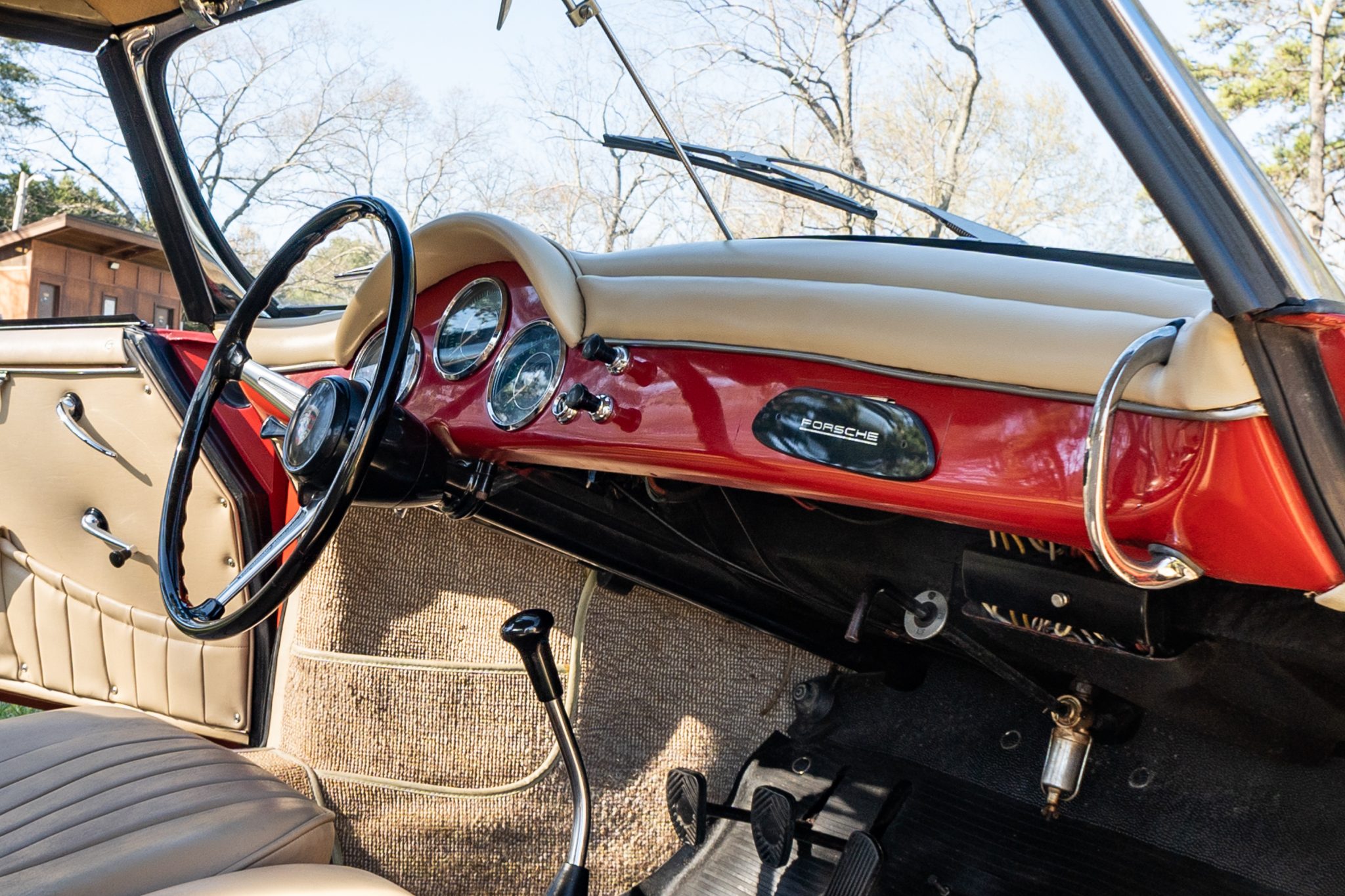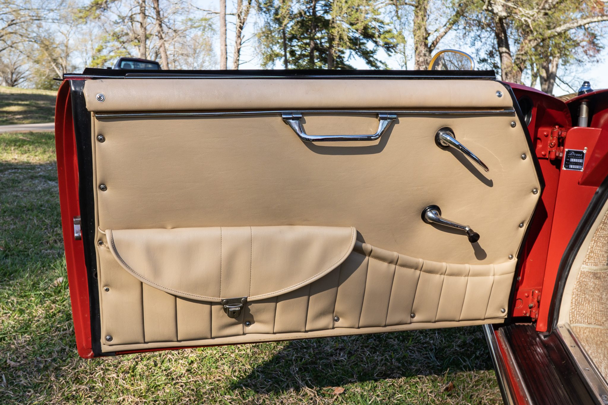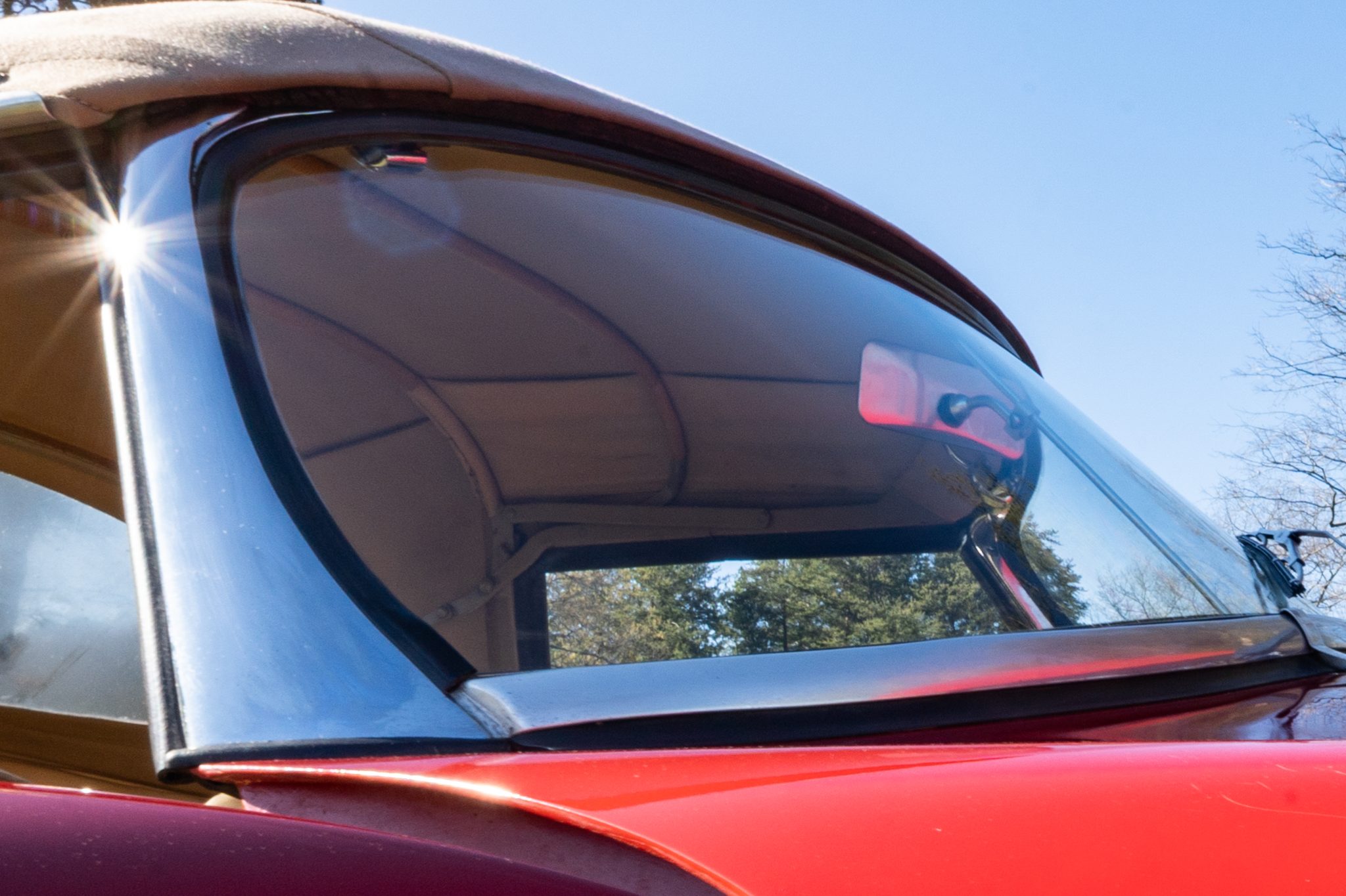The car is powered by a replacement 1.6-liter flat-four paired with a four-speed manual transaxle, and equipment includes a tan soft top, 15″ steel wheels, body-color bumpers, and front bucket seats.