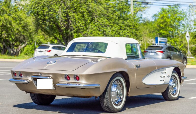 The car is finished in beige with white coves and a white top over Fawn vinyl upholstery, and it is powered by a 283ci V8 linked to a four-speed manual transmission and a Positraction differential. Additional equipment includes a dual exhaust system, a Wonder Bar AM radio, a four-barrel carburetor, and 15″ steel wheels with simulated knock-off spinner covers.
