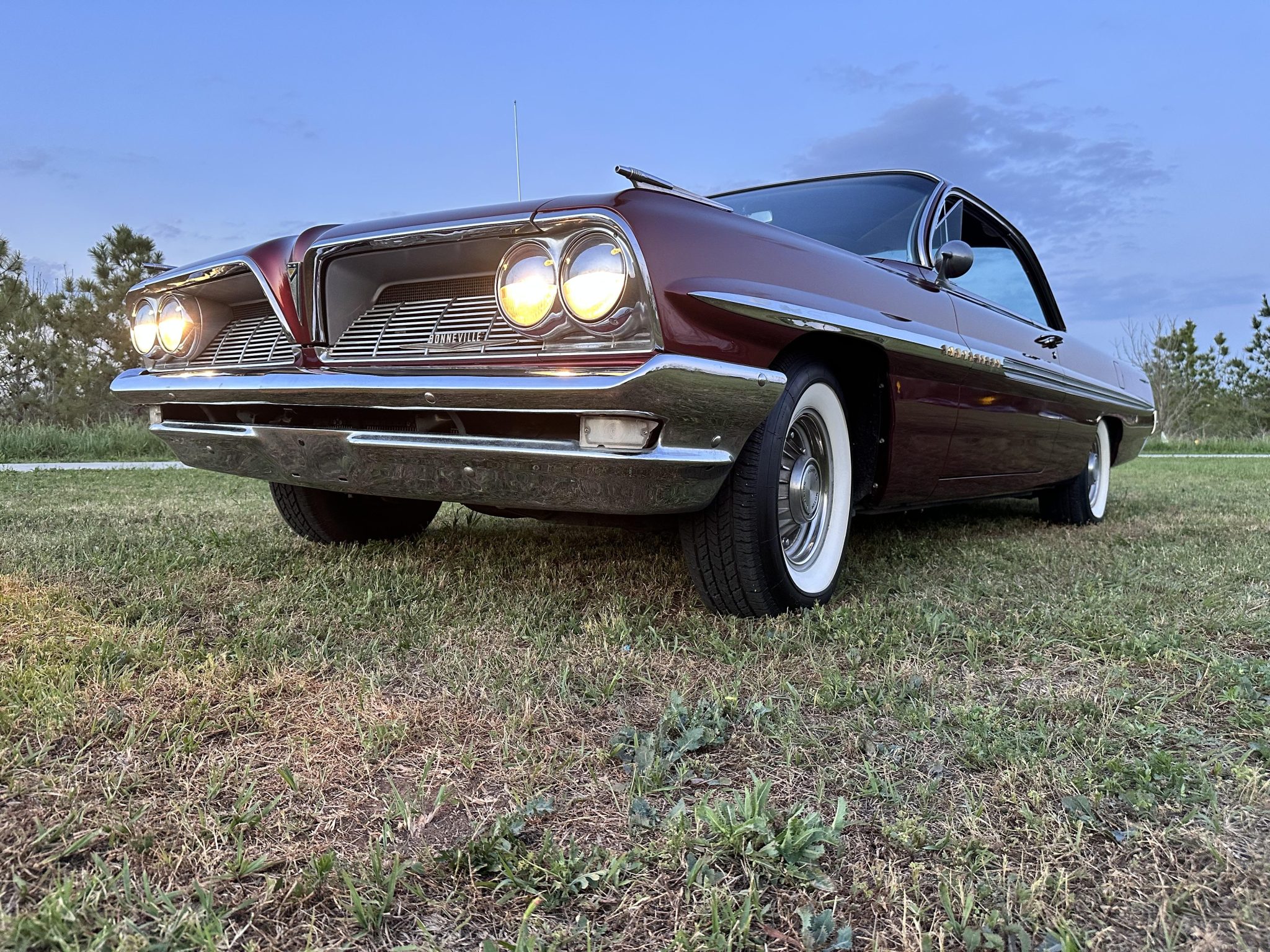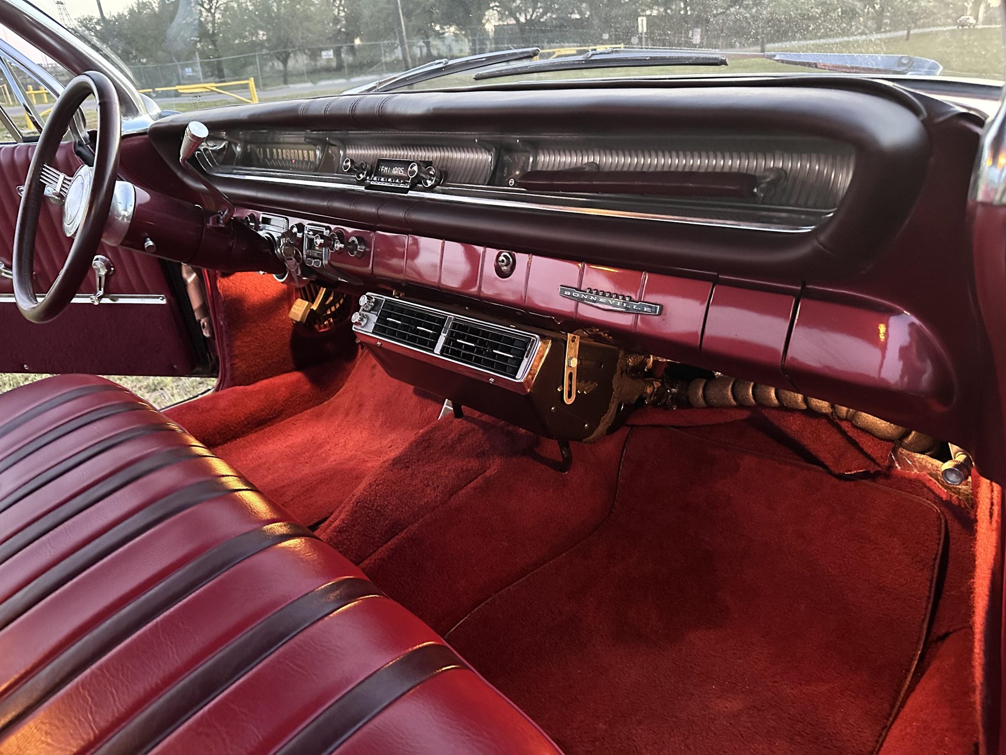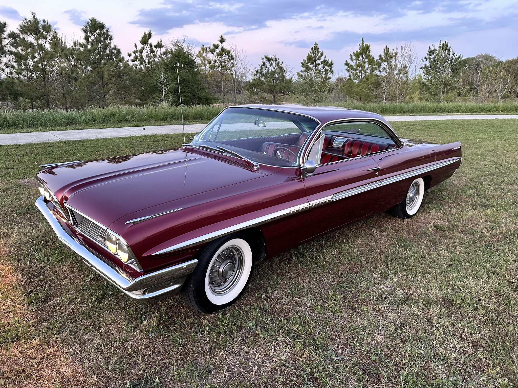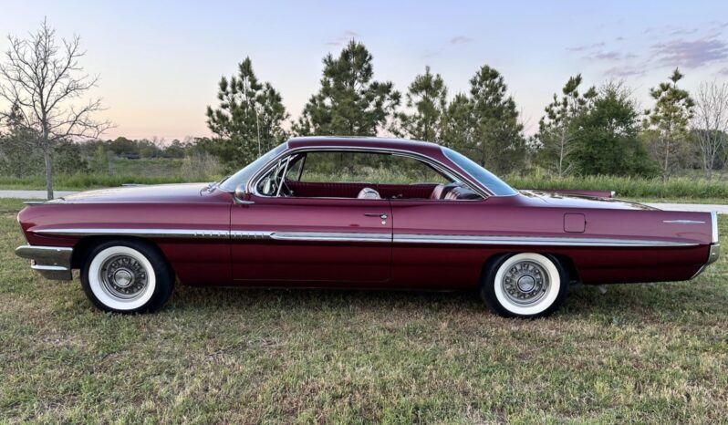 This 1961 Pontiac Bonneville coupe is finished in red over a tri-tone maroon interior and powered by a 389ci V8 mated to a four-speed automatic transmission. Equipment includes Vintage Air climate control, a digital stereo, power steering, power brakes, tilt steering, eight-lug wheels, and whitewall tires.
