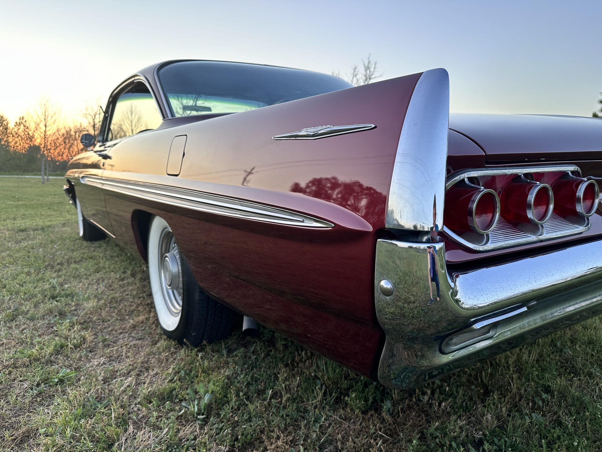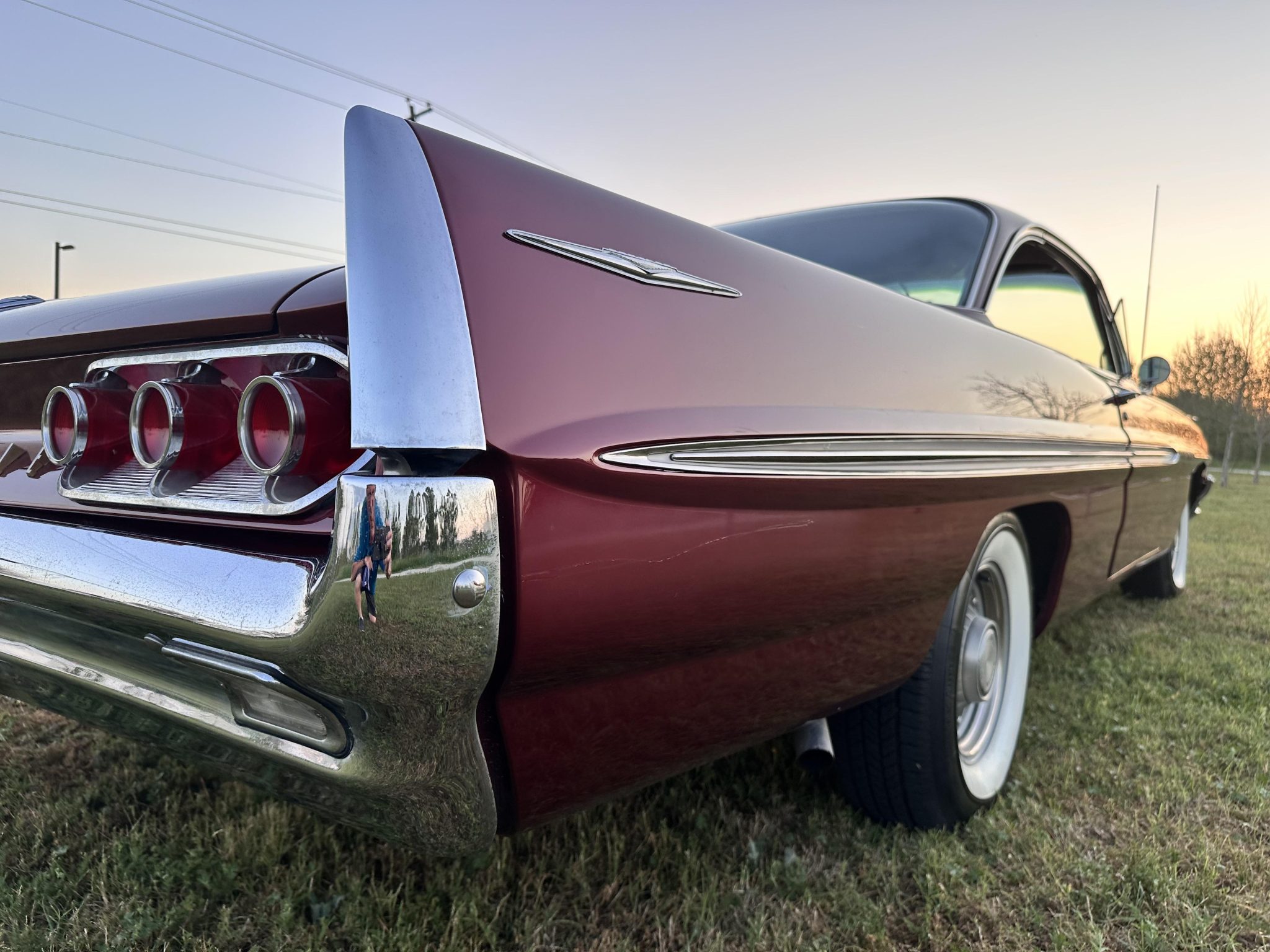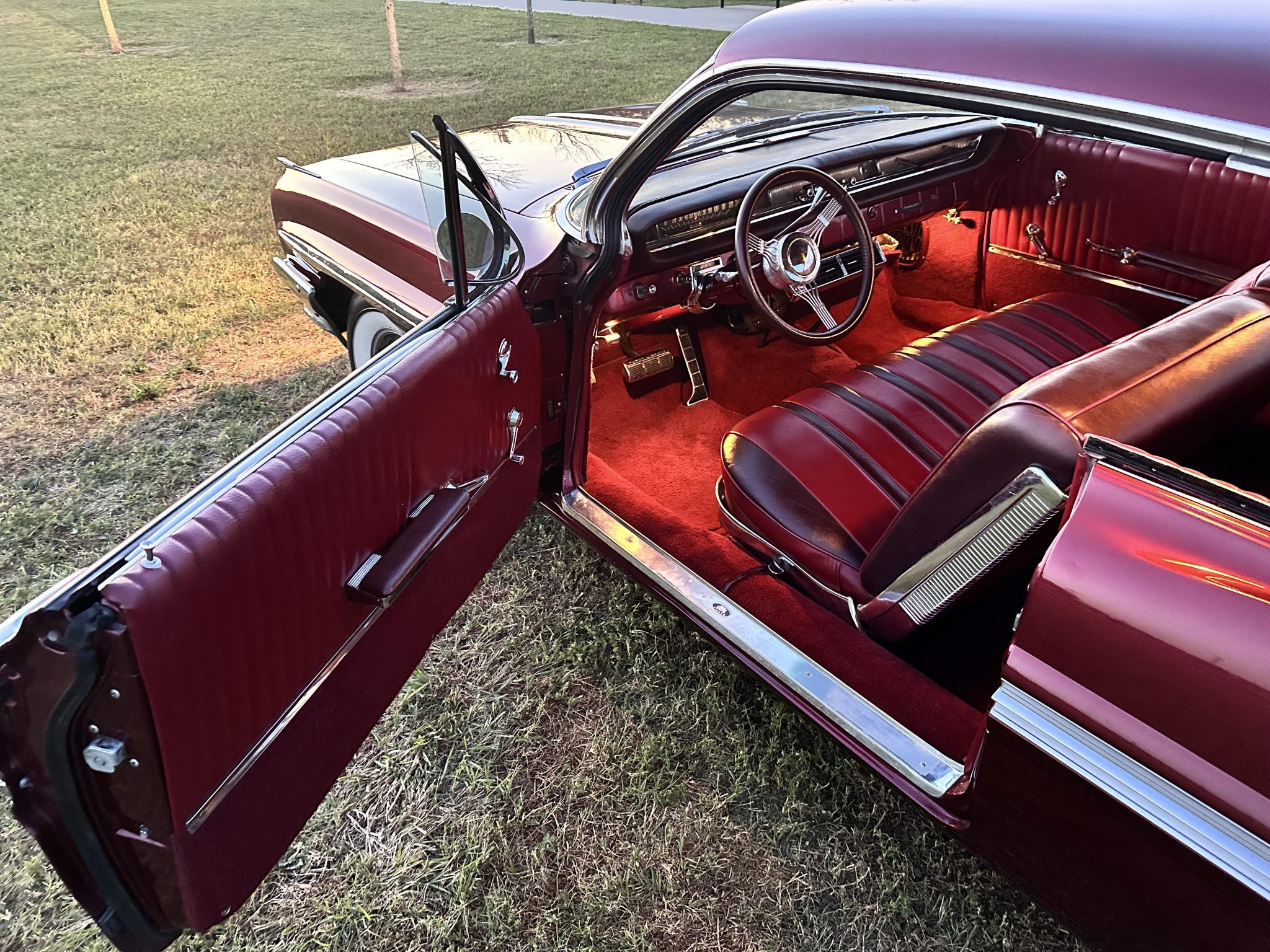 This 1961 Pontiac Bonneville coupe is finished in red over a tri-tone maroon interior and powered by a 389ci V8 mated to a four-speed automatic transmission. Equipment includes Vintage Air climate control, a digital stereo, power steering, power brakes, tilt steering, eight-lug wheels, and whitewall tires.