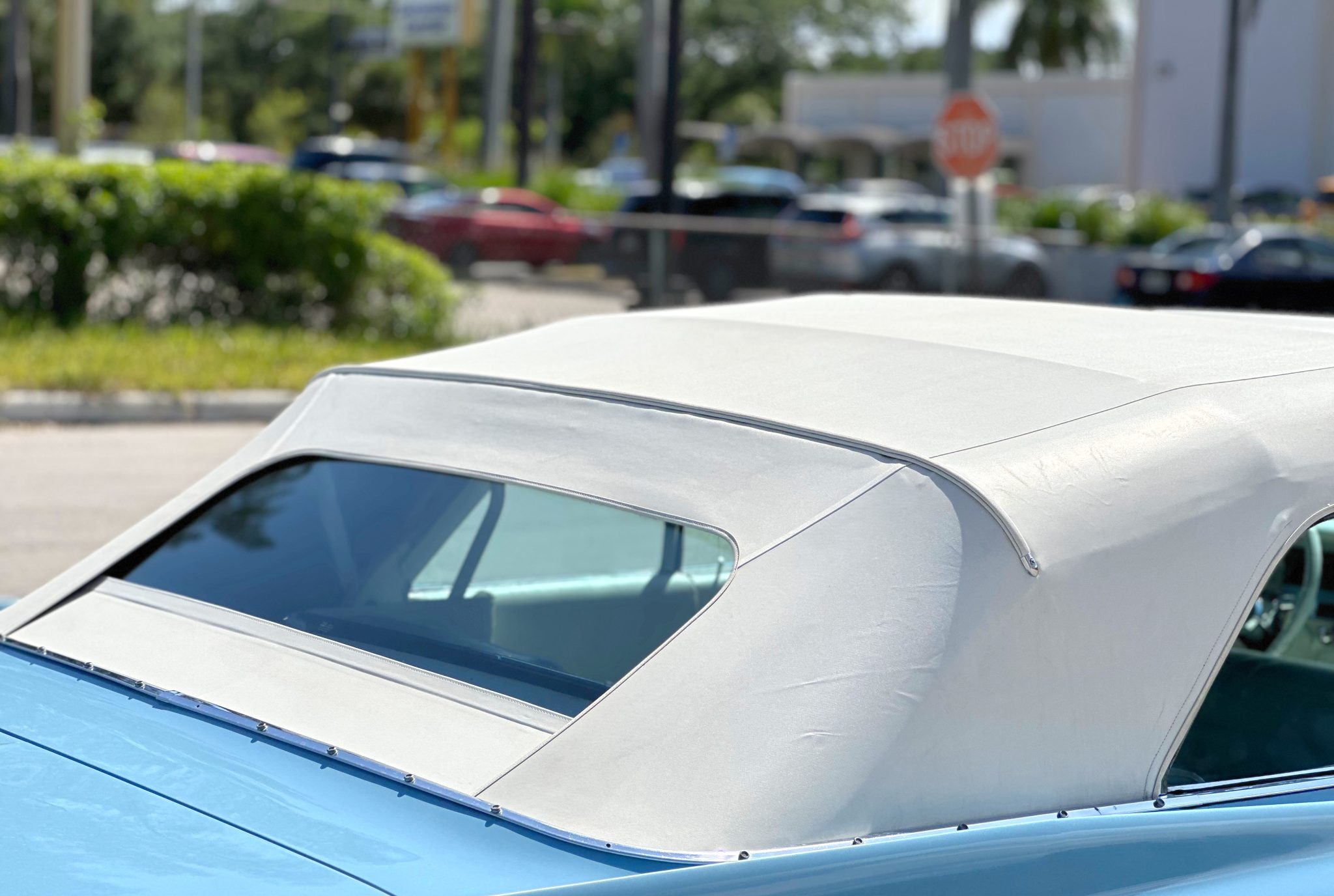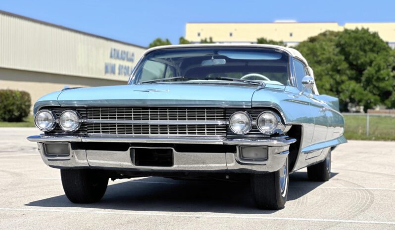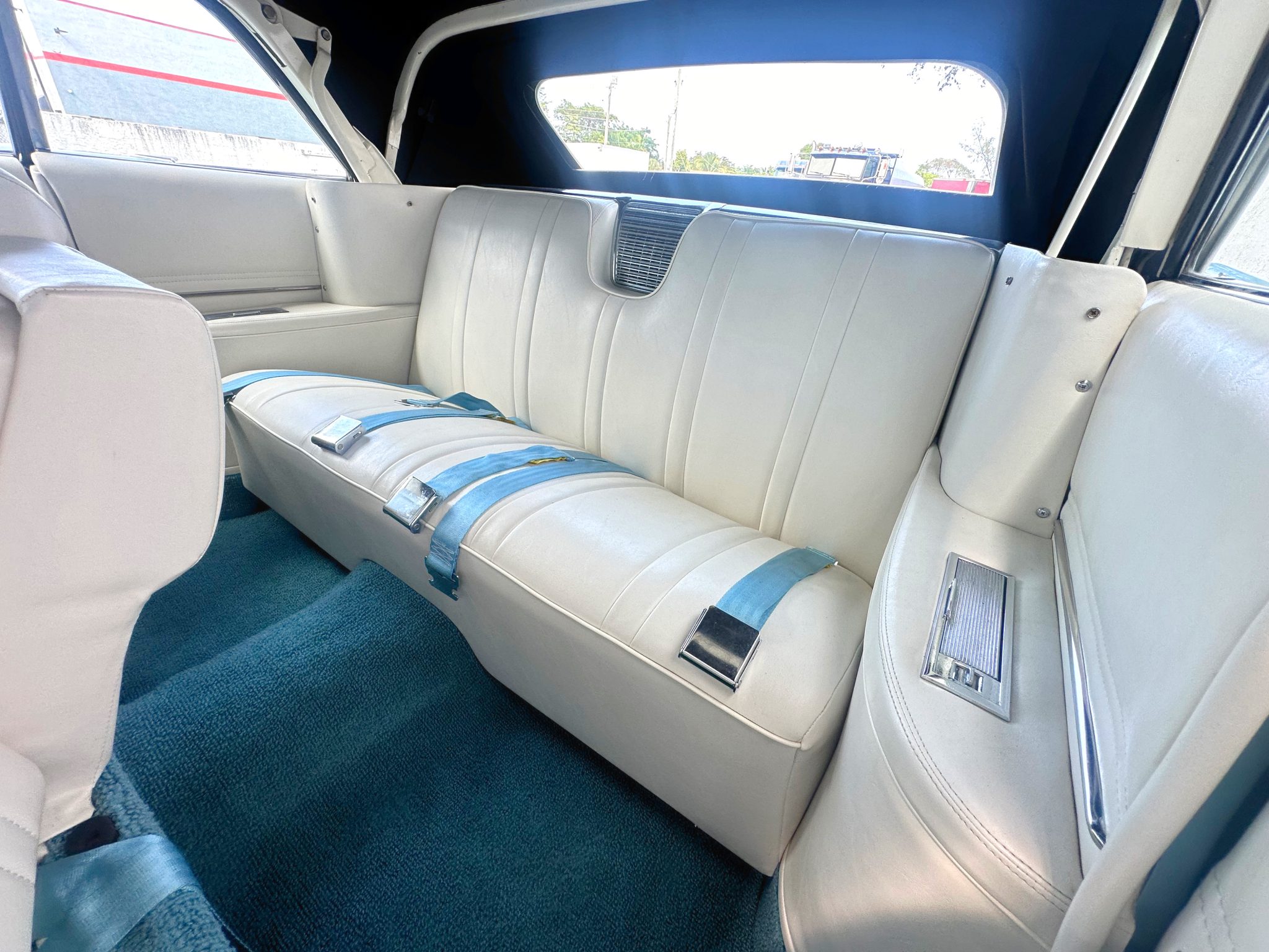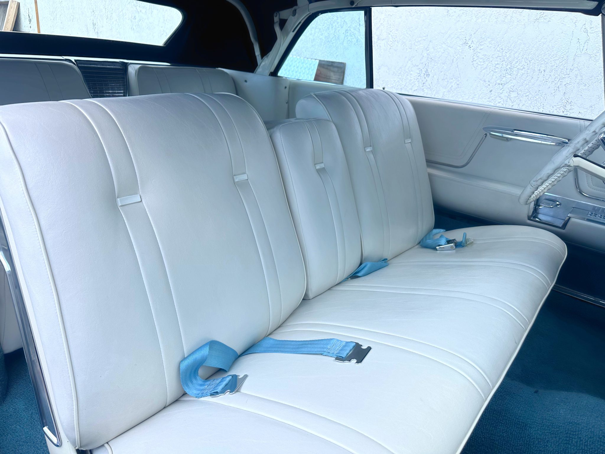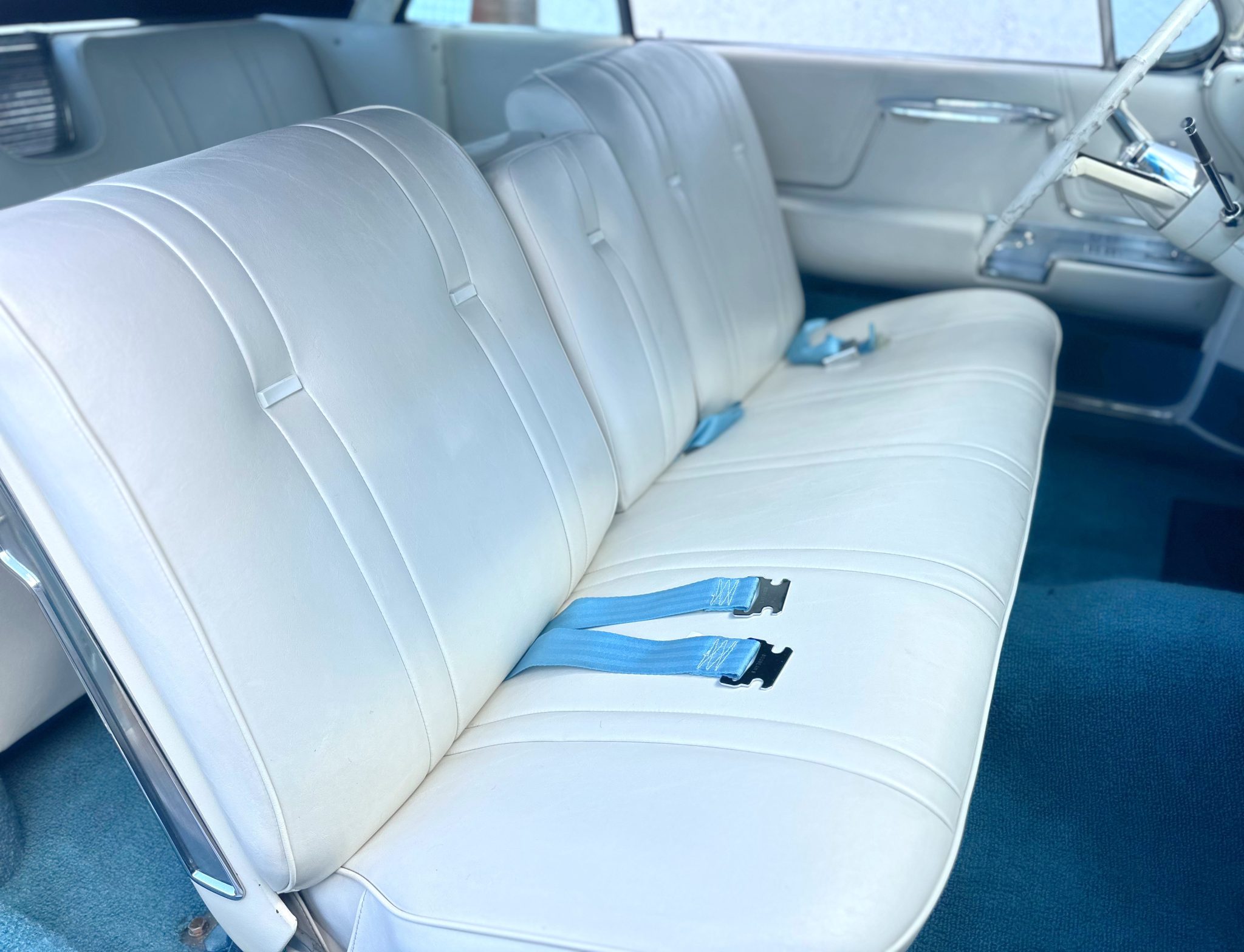 The car is finished in blue over white leather and is powered by a 390ci V8 paired with a four-speed Hydra-Matic automatic transmission. Equipment includes a white power-operated convertible top, power steering, power-assisted drum brakes, 15″ steel wheels with chrome-ribbed covers, air conditioning, a power-adjustable front seat, power windows, and a push-button AM radio.
