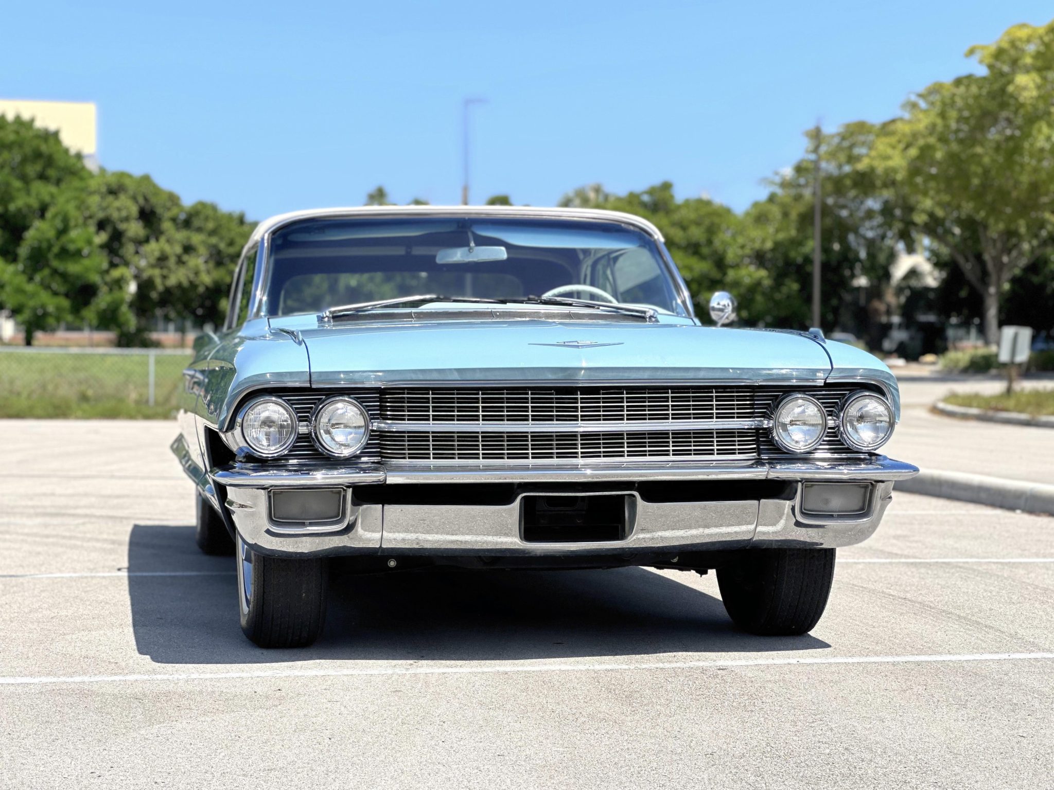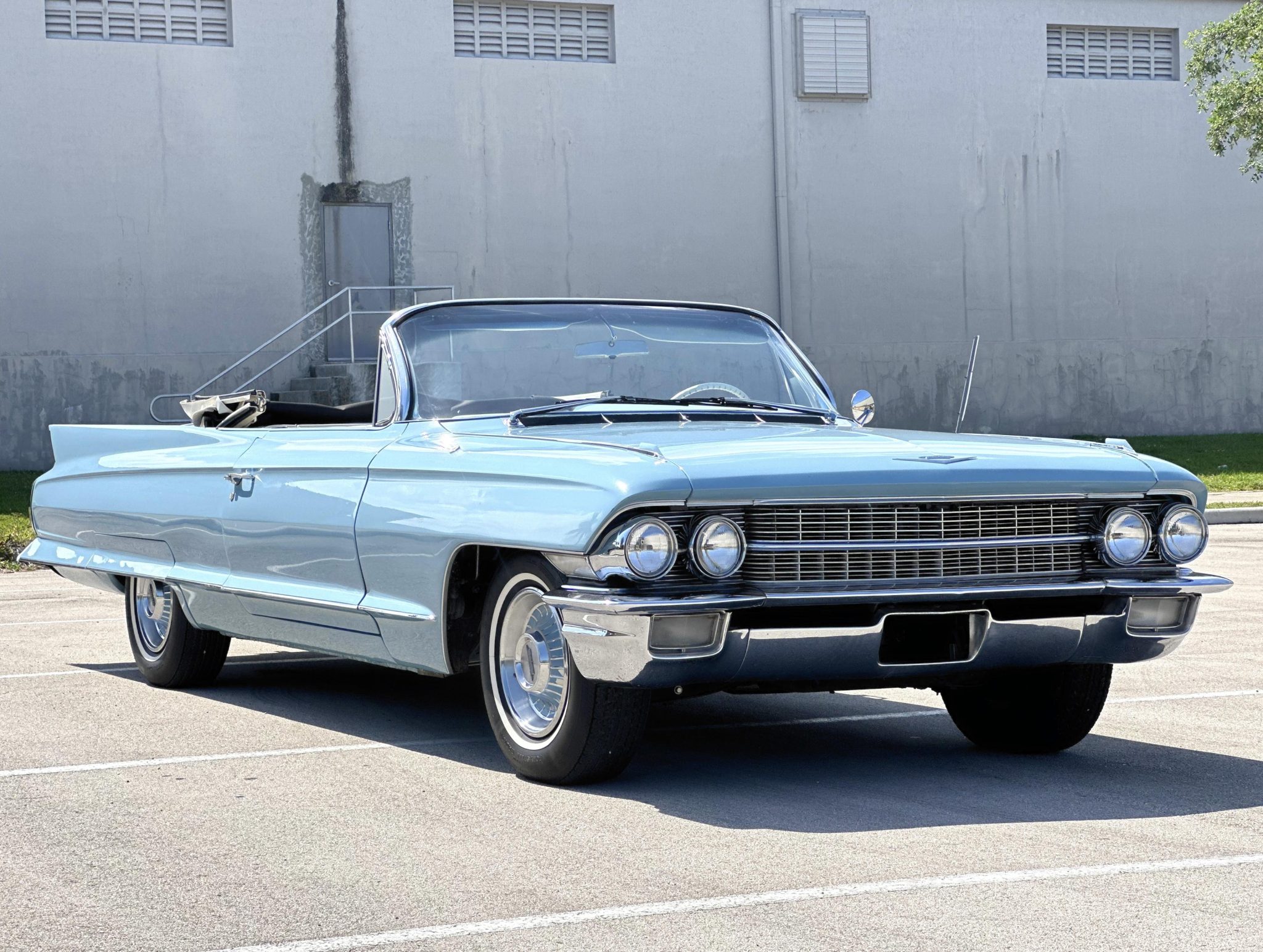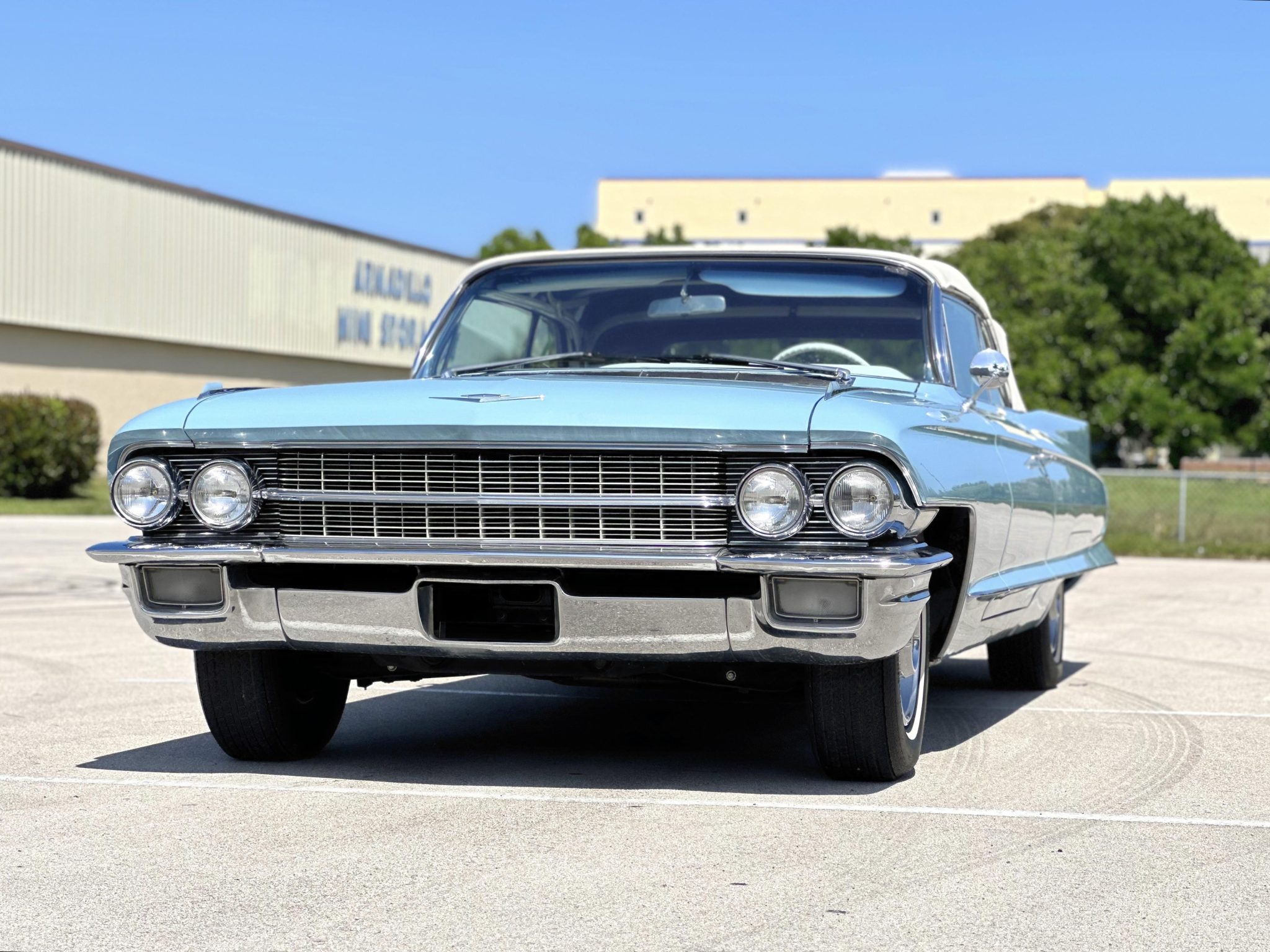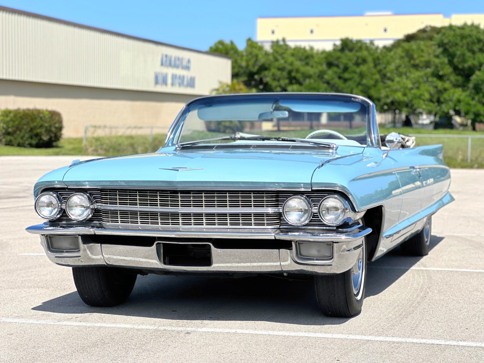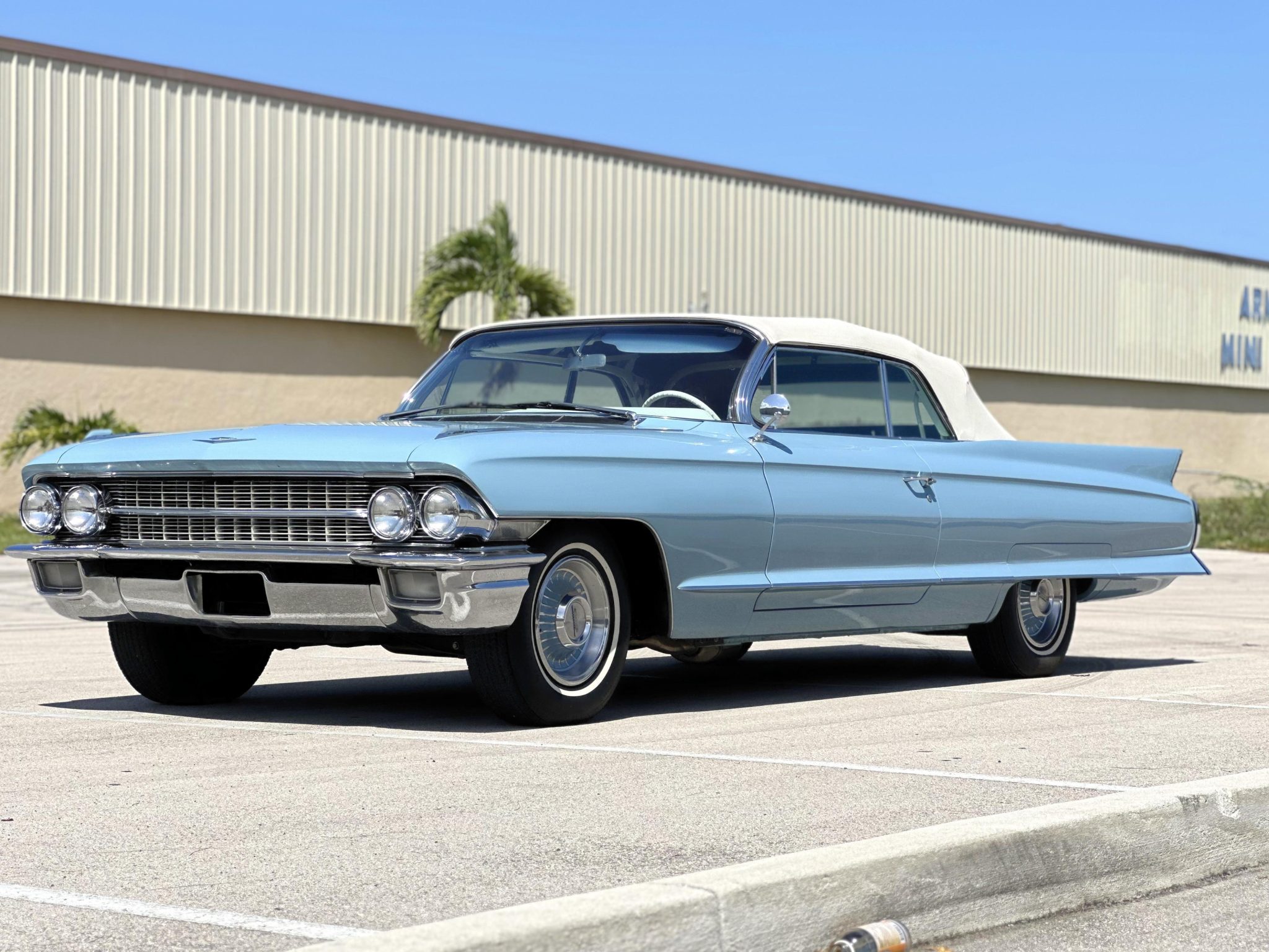 The car is finished in blue over white leather and is powered by a 390ci V8 paired with a four-speed Hydra-Matic automatic transmission. Equipment includes a white power-operated convertible top, power steering, power-assisted drum brakes, 15″ steel wheels with chrome-ribbed covers, air conditioning, a power-adjustable front seat, power windows, and a push-button AM radio.