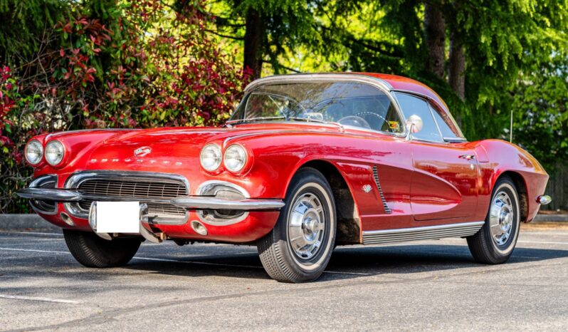 This 1962 Chevrolet Corvette is powered by a 327ci V8 paired with a four-speed manual transmission states that it was equipped with the RP0 686 metallic brakes option. The car is finished in maroon over black vinyl, and features include a removable hardtop, a Positraction limited-slip differential, a single four-barrel carburetor, 15″ steel wheels, a heater, and a Wonder Bar AM radio. The seller acquired the car in 2011, and it subsequently received the NCRS Bowtie Award.