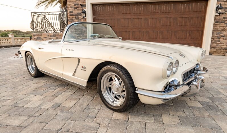 This 1962 Chevrolet Corvette was refinished n Light Gold Pearl Metallic over a refreshed brown leather interior and received a supercharged 5.7-liter LS1 V8, a Tremec five-speed manual transmission, and an independent rear suspension setup with a Ford 9″ Positraction differential. Additional features include a custom steel tube chassis, 16″ Boyd Coddington alloy wheels, power steering, four-wheel disc brakes, Mustang II-style front suspension components, coilover shocks, a stainless-steel exhaust system, LED taillights, a black soft top, a removable hardtop, a Hurst shifter, and an aftermarket stereo with an Alpine head unit.