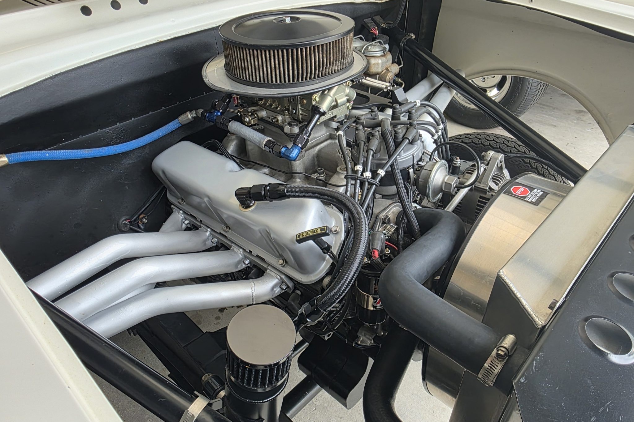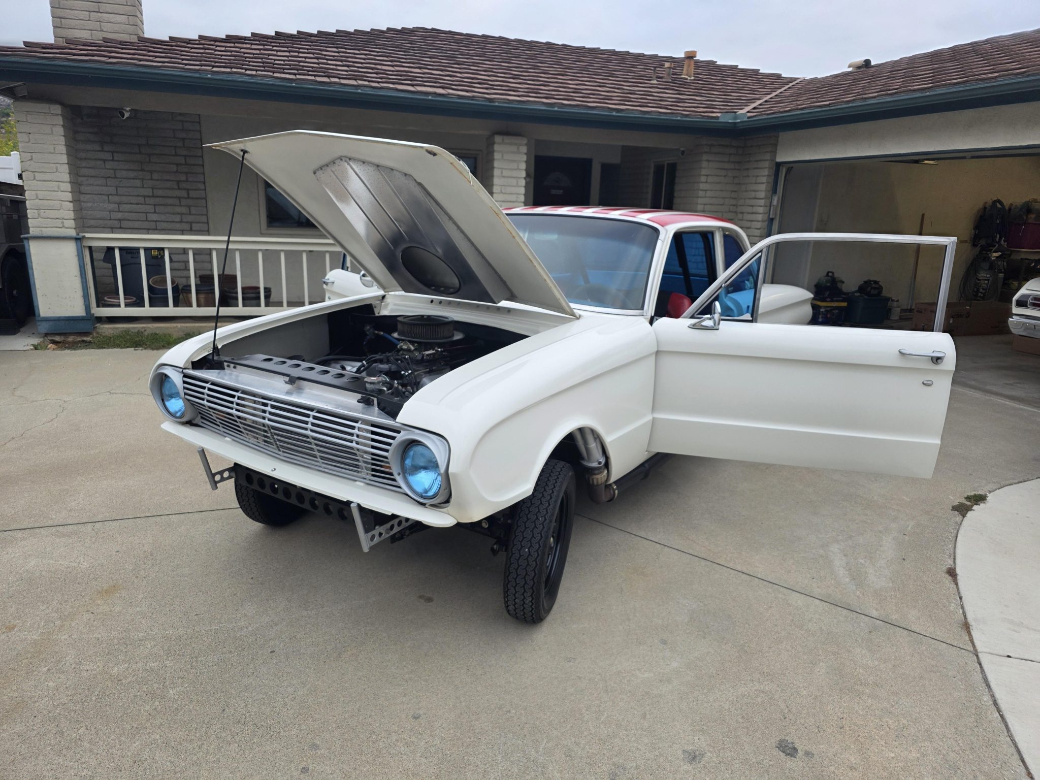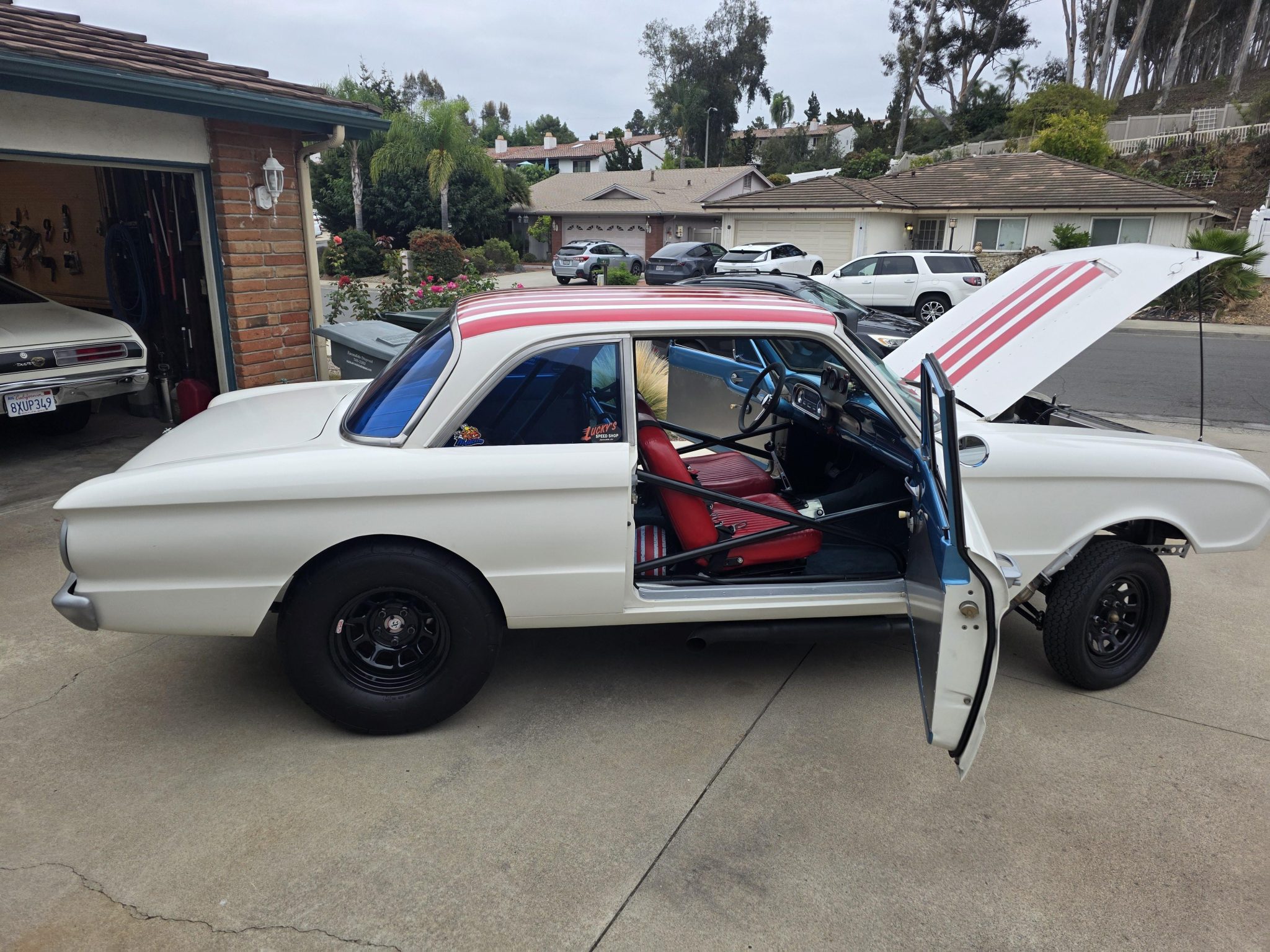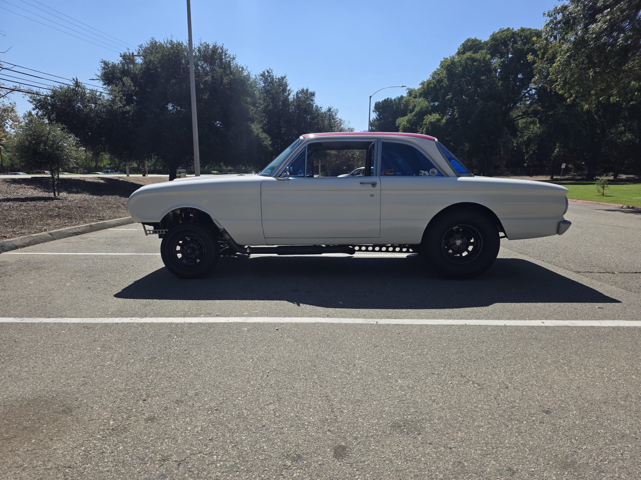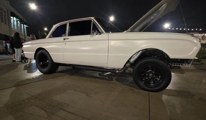 This 1962 Ford Falcon sedan has been built into a gasser-style drag car. Highlighting the modifications is the 347ci V8, which is equipped with a roller camshaft and rocker arms, World Products heads, a Weiand intake manifold, a Holley carburetor, and headers linked to side pipes. The engine is linked to a Tremec T-5 five-speed manual with a hydraulic clutch, and the narrowed Ford 9″ from Speedway features 4.56 gears and 31-spline axles. The front inner fenders have been removed, a solid front axle was fitted, and the front suspension was raised, while out back ladder bars were fitted. The car rides on staggered wheels mounted over discs at all four corners, and the interior has been outfitted with a roll cage, harnesses, extra gauges, and a billet shifter.