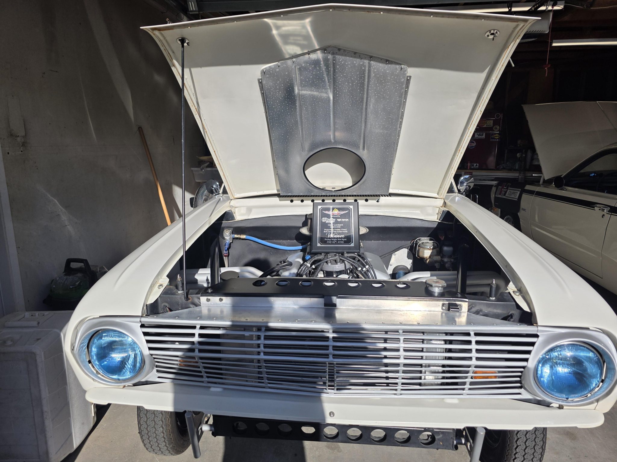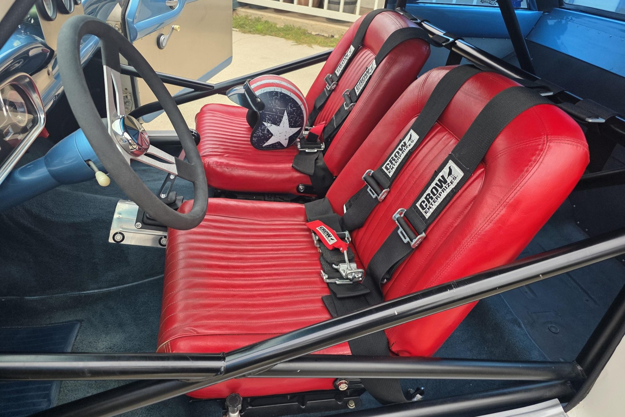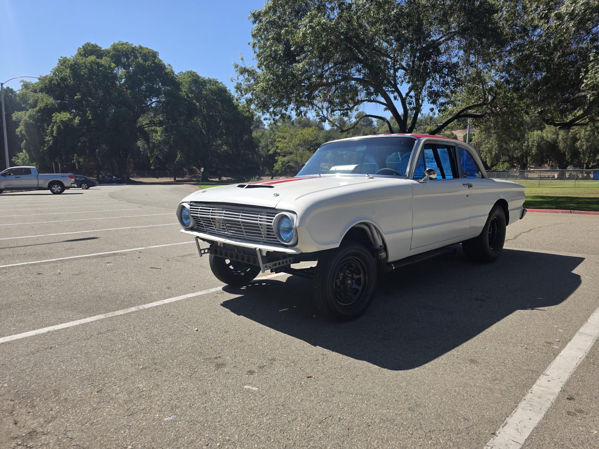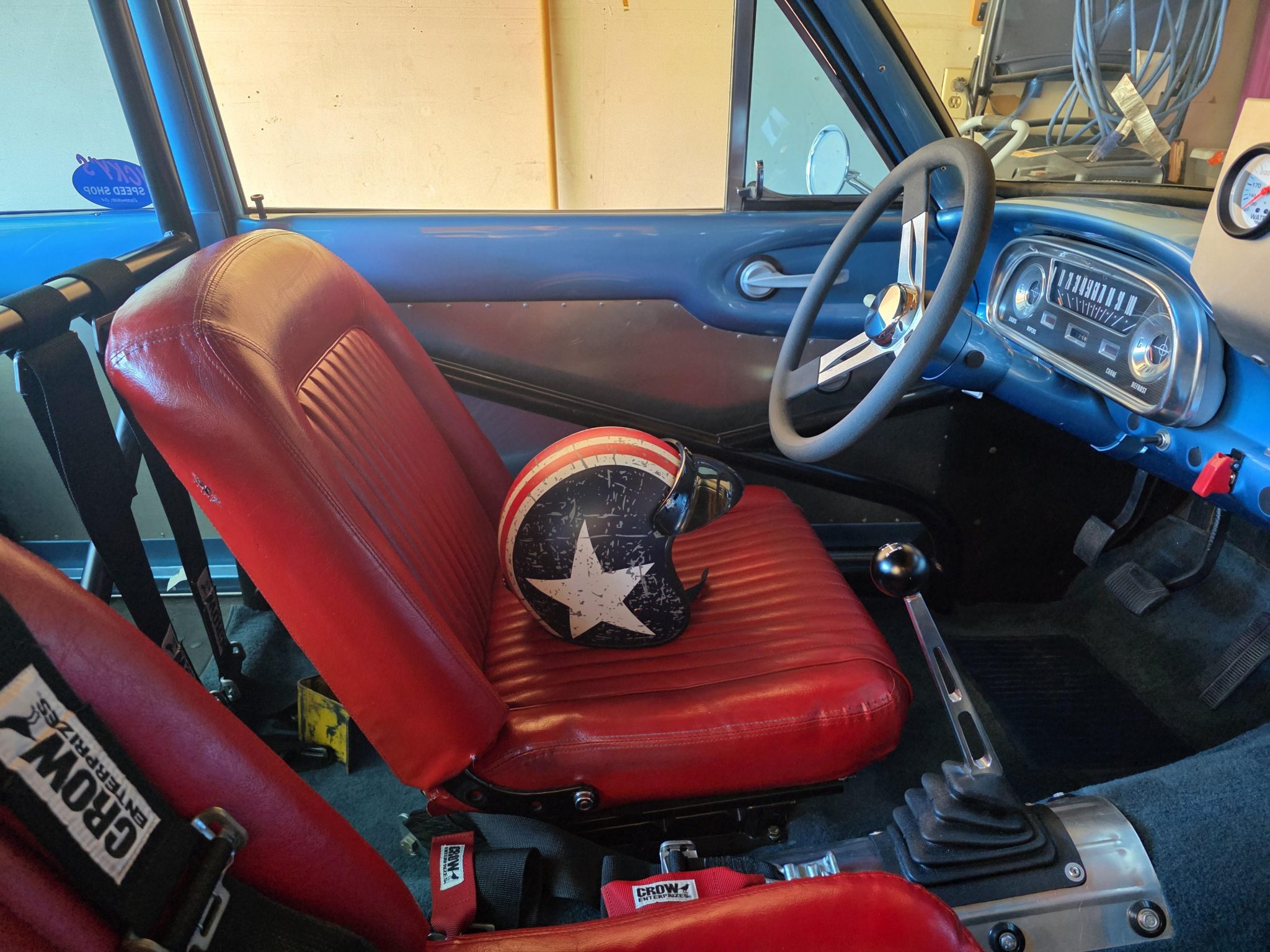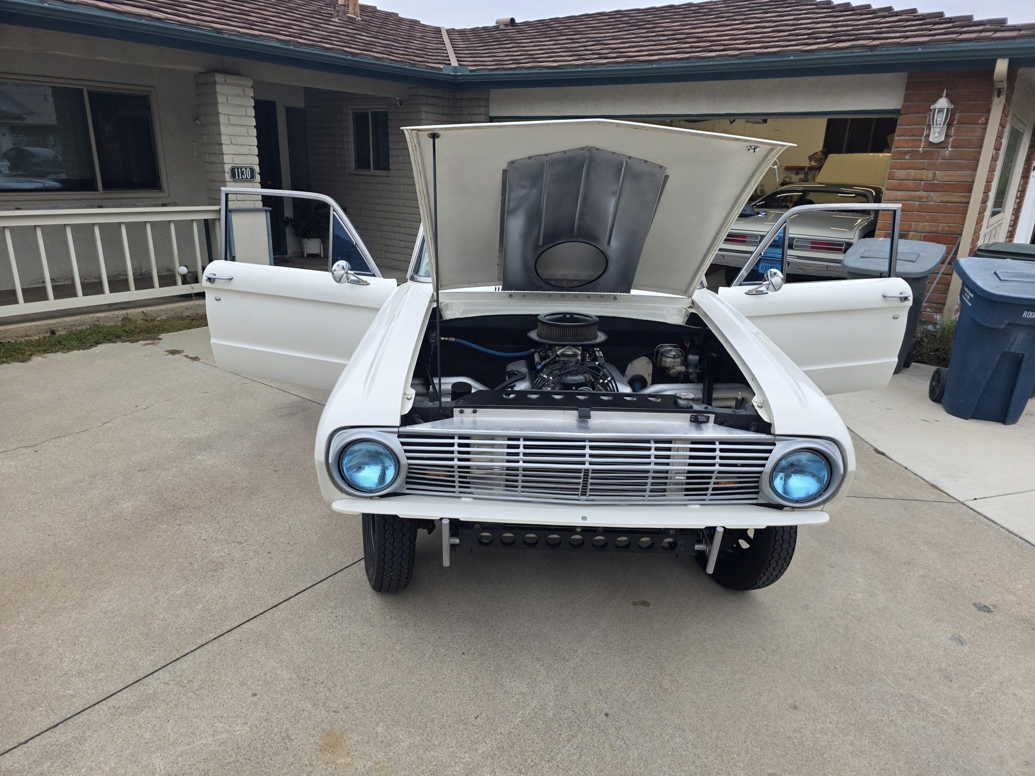 This 1962 Ford Falcon sedan has been built into a gasser-style drag car. Highlighting the modifications is the 347ci V8, which is equipped with a roller camshaft and rocker arms, World Products heads, a Weiand intake manifold, a Holley carburetor, and headers linked to side pipes. The engine is linked to a Tremec T-5 five-speed manual with a hydraulic clutch, and the narrowed Ford 9″ from Speedway features 4.56 gears and 31-spline axles. The front inner fenders have been removed, a solid front axle was fitted, and the front suspension was raised, while out back ladder bars were fitted. The car rides on staggered wheels mounted over discs at all four corners, and the interior has been outfitted with a roll cage, harnesses, extra gauges, and a billet shifter.