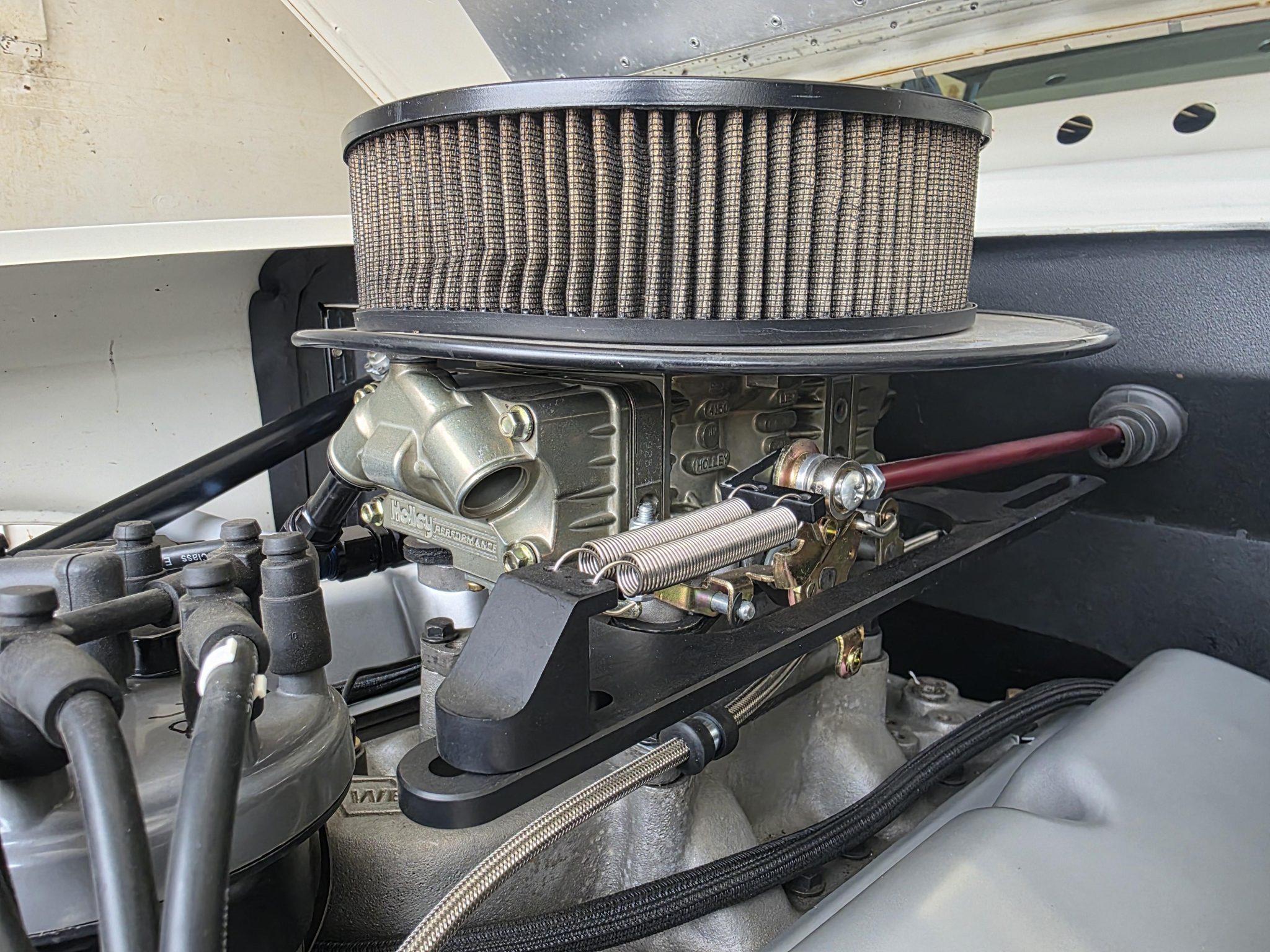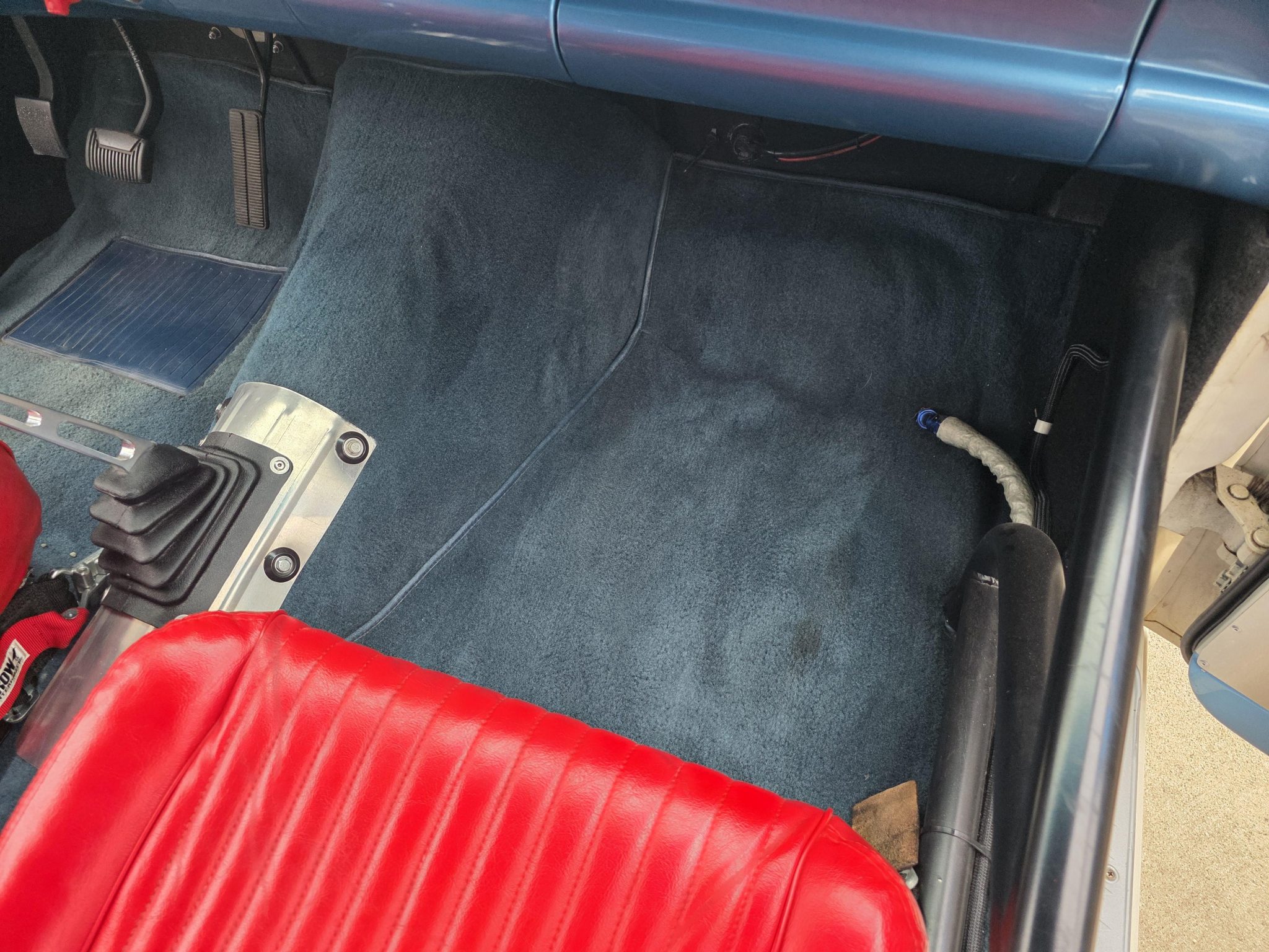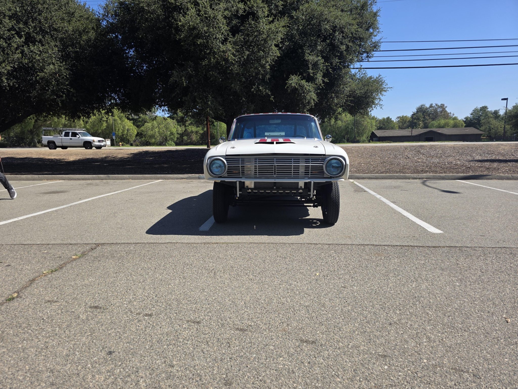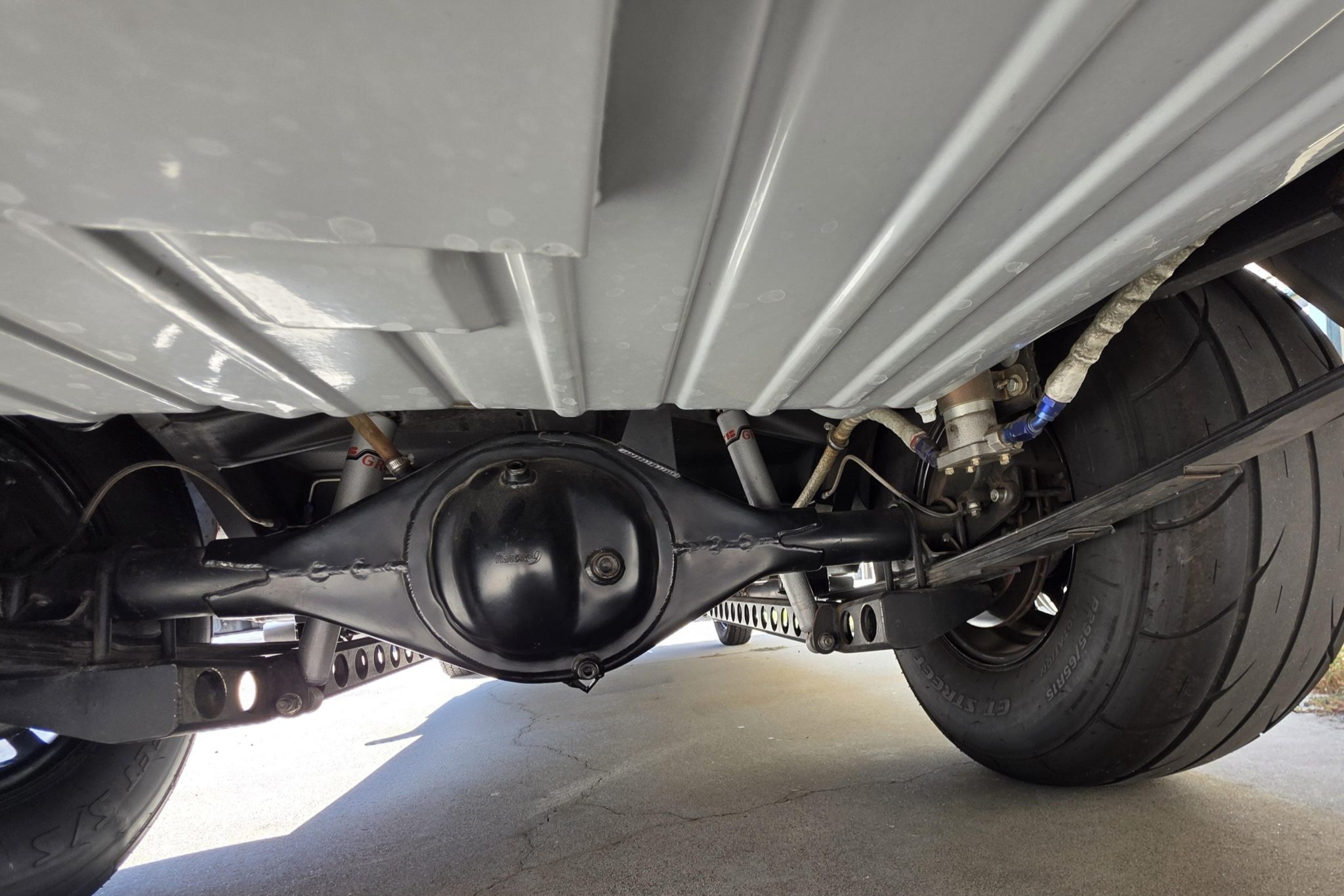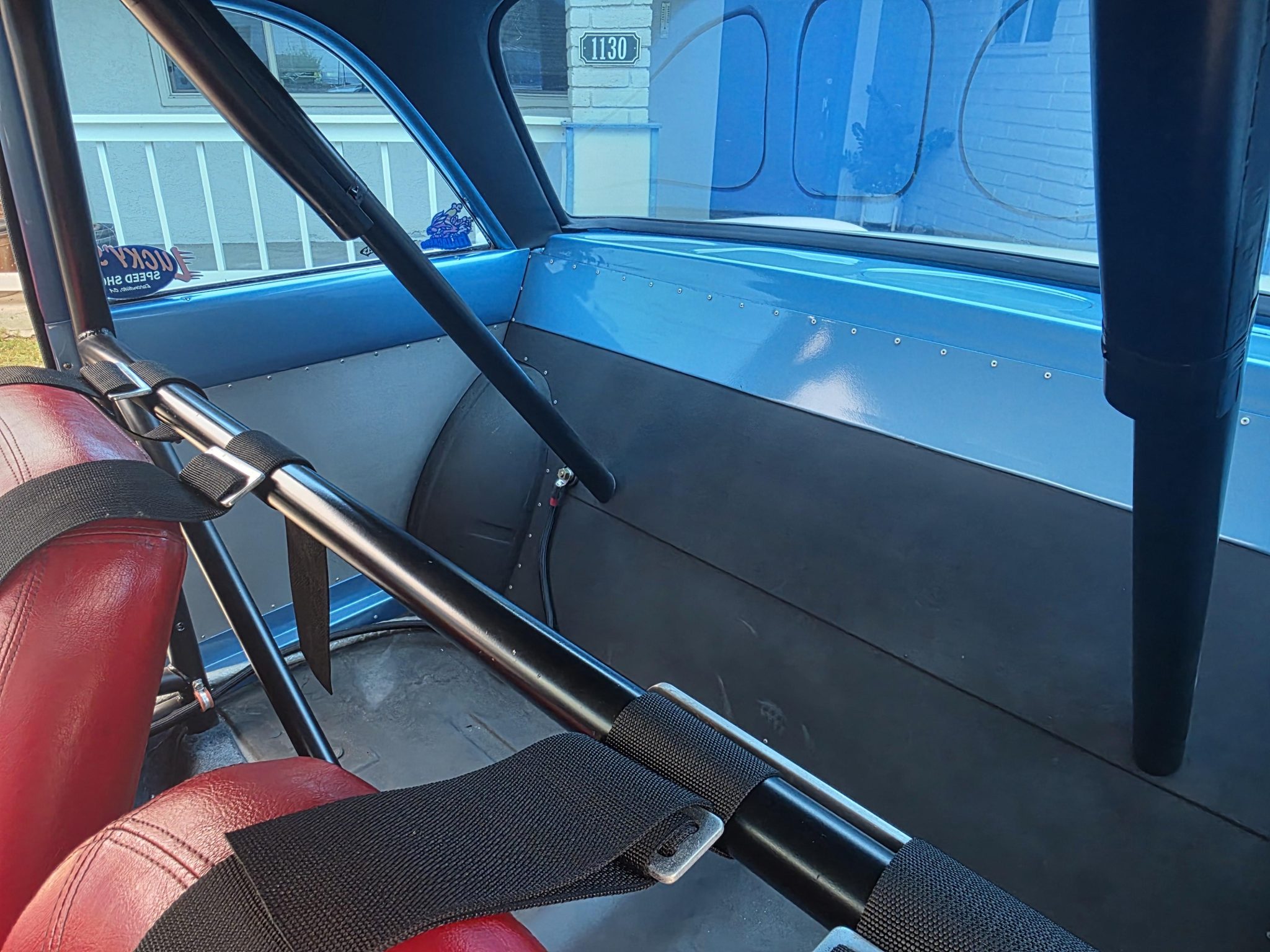 This 1962 Ford Falcon sedan has been built into a gasser-style drag car. Highlighting the modifications is the 347ci V8, which is equipped with a roller camshaft and rocker arms, World Products heads, a Weiand intake manifold, a Holley carburetor, and headers linked to side pipes. The engine is linked to a Tremec T-5 five-speed manual with a hydraulic clutch, and the narrowed Ford 9″ from Speedway features 4.56 gears and 31-spline axles. The front inner fenders have been removed, a solid front axle was fitted, and the front suspension was raised, while out back ladder bars were fitted. The car rides on staggered wheels mounted over discs at all four corners, and the interior has been outfitted with a roll cage, harnesses, extra gauges, and a billet shifter.