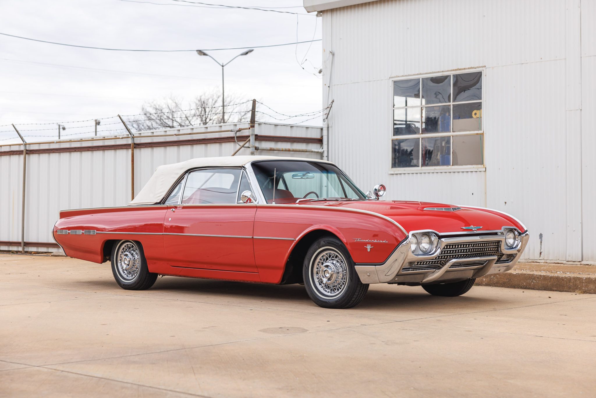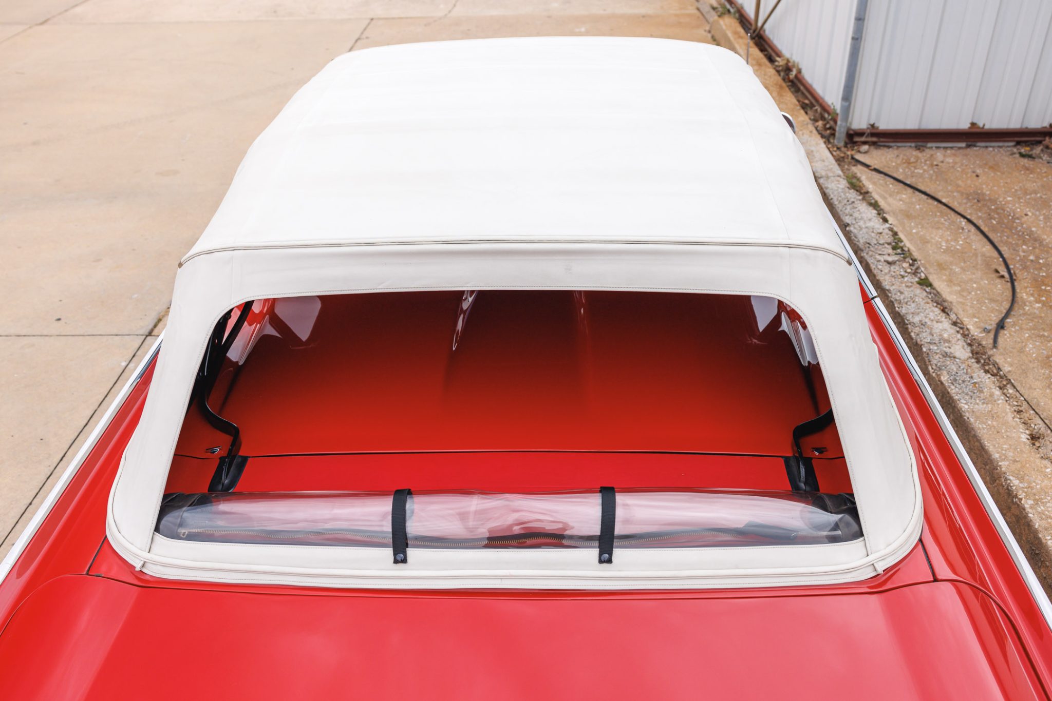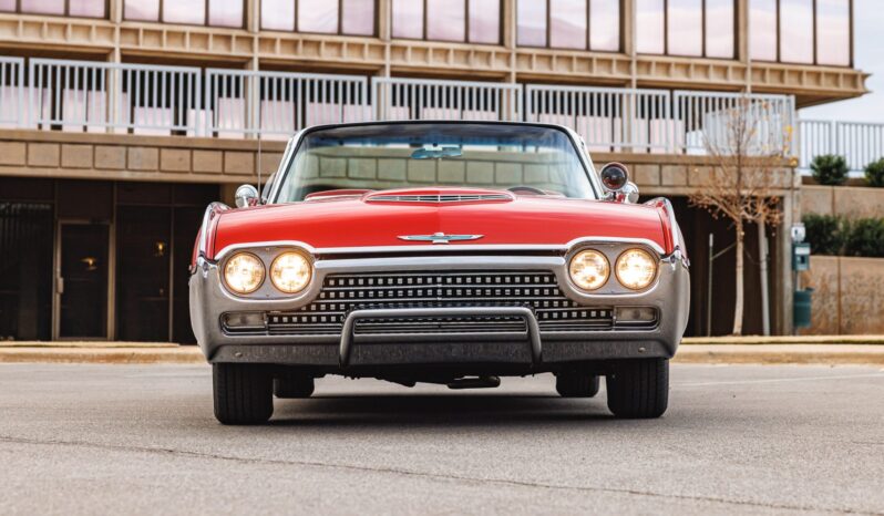 It was refurbished prior to the seller’s 2021 acquisition, and the car’s 390ci V8 has been fitted with a triple-carburetor induction setup, the body has been refinished in red, and the interior color has been changed to red. Sports Roadsters were equipped with wire wheels, front fender badges, a passenger-side dashboard grab bar, and a fiberglass tonneau cover that covered the back seat of the car. This example is also fitted with a three-speed automatic transmission, a power-operated white soft top, dual side mirrors, power-adjustable front seats, power windows, a swing-away steering wheel, an AM radio, and a MagicAire heater/defroster.