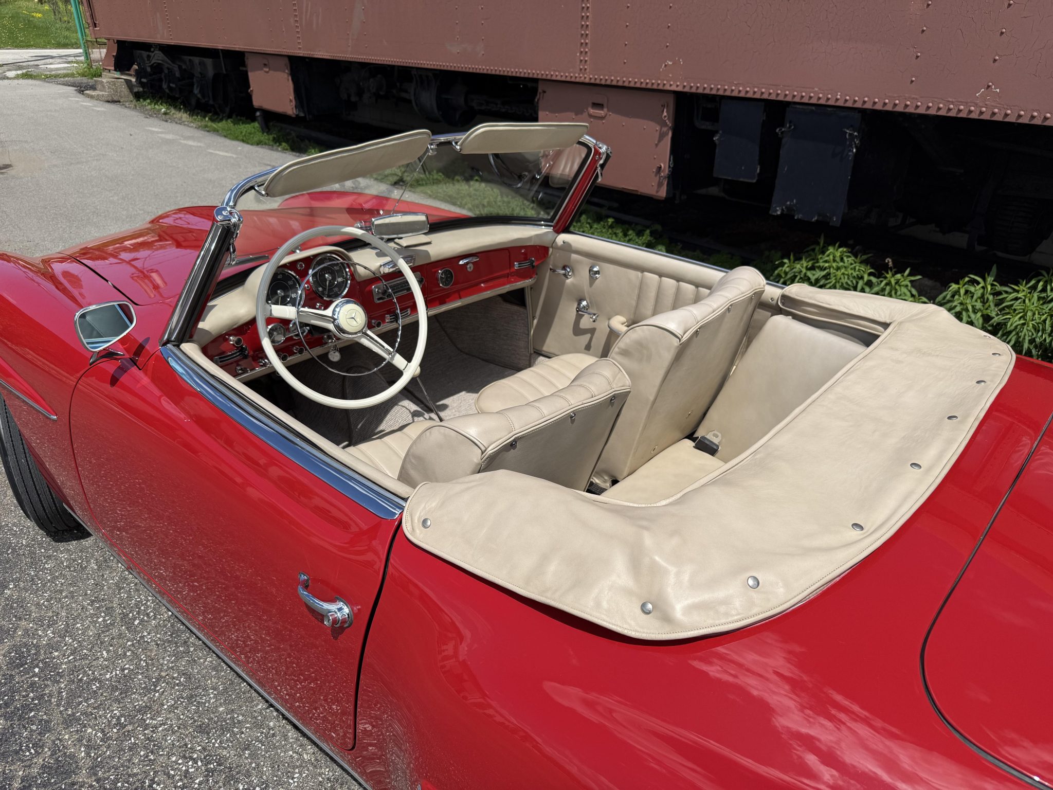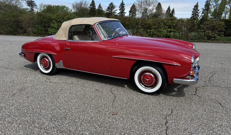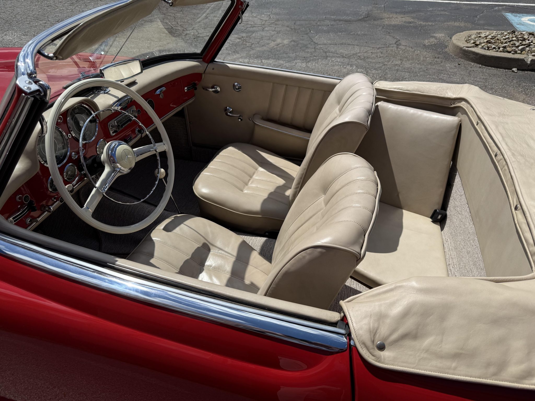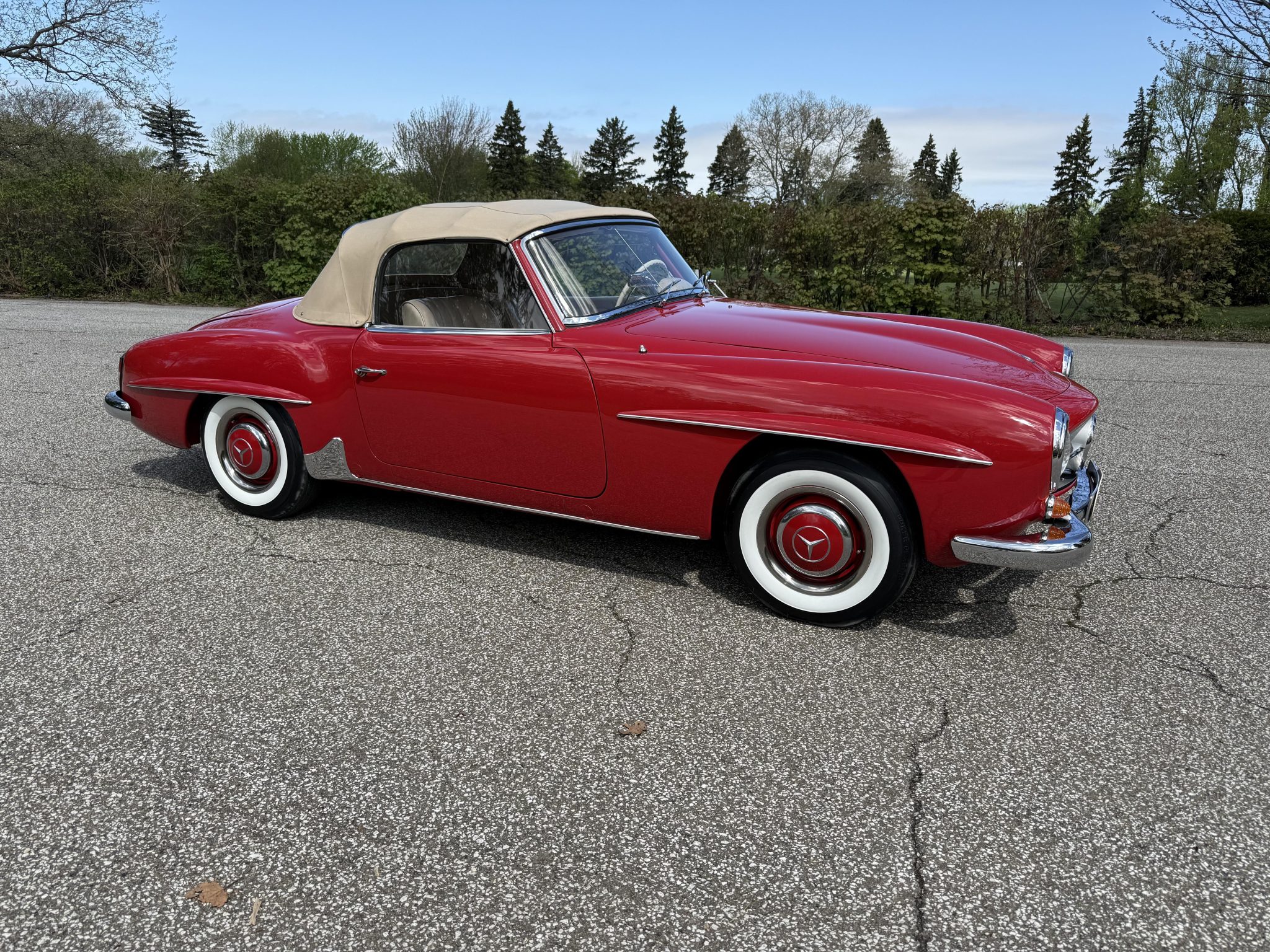 The car is finished in Signal Red over natural leather and powered by a 1.9-liter M121 inline-four paired with a four-speed manual transmission. Equipment includes a tan convertible top, 13″ steel wheels with body-color hubcaps, power-assisted drum brakes, a Becker Europa AM/FM radio, and a rear “Kinder” jump seat.