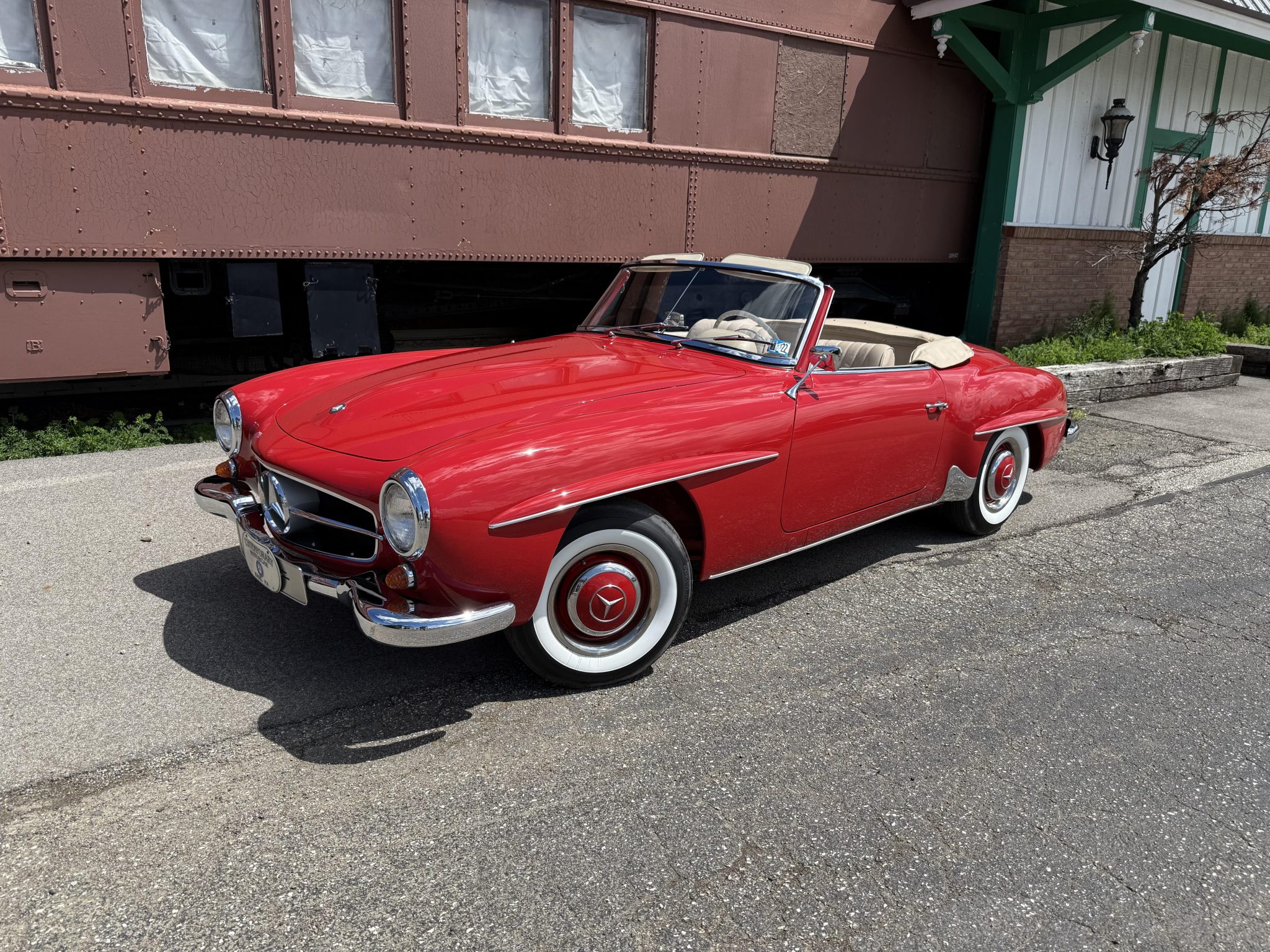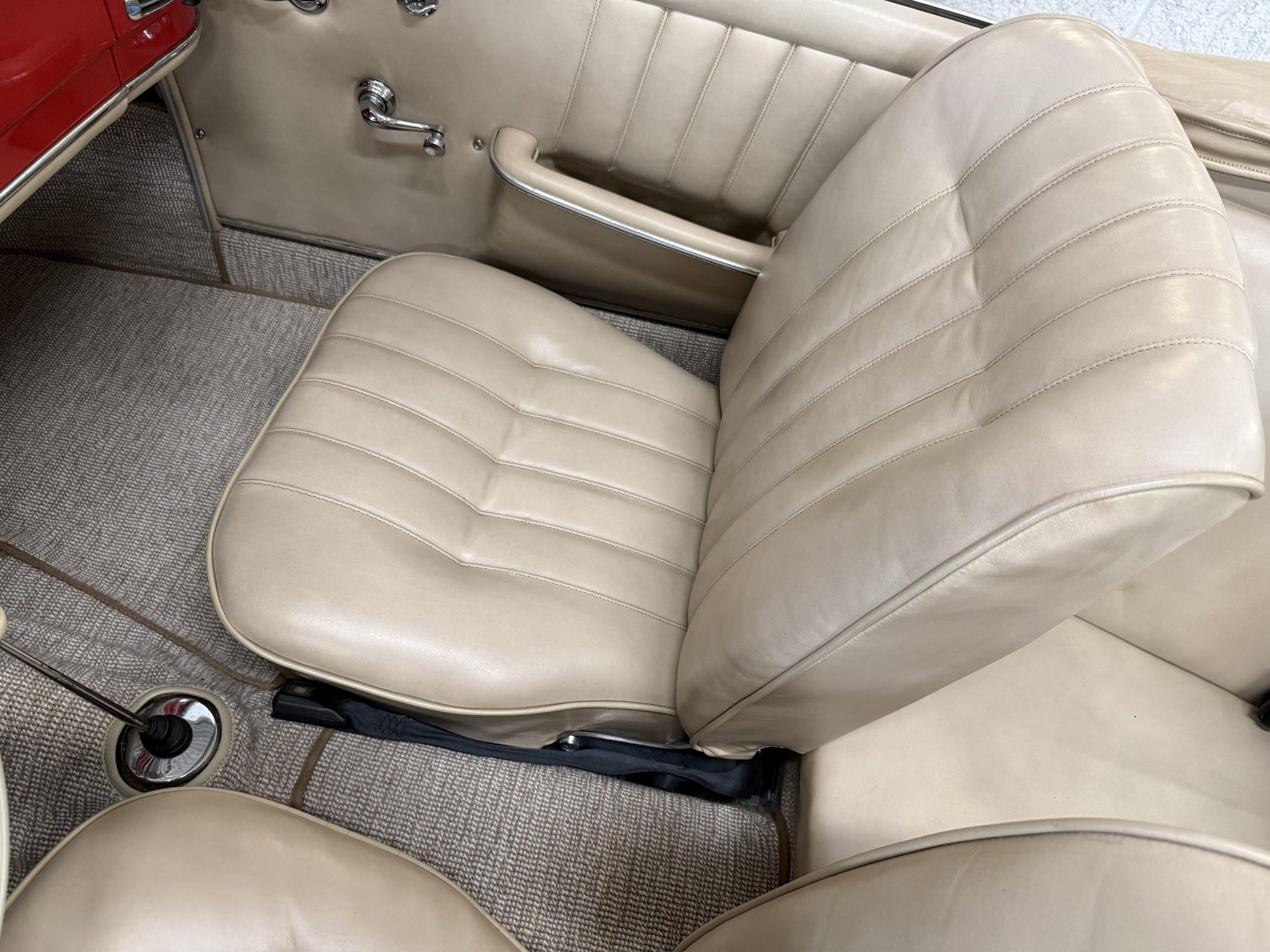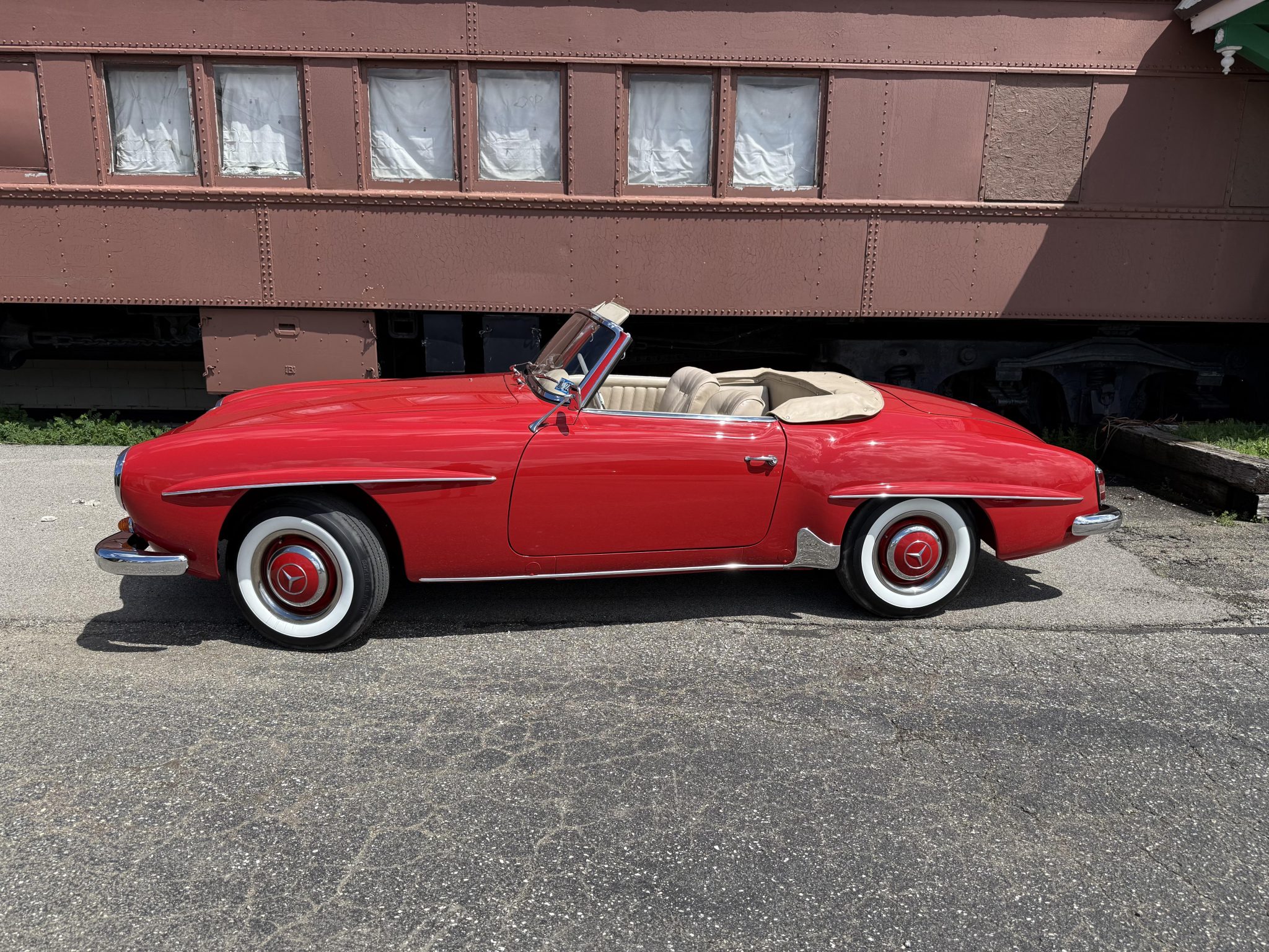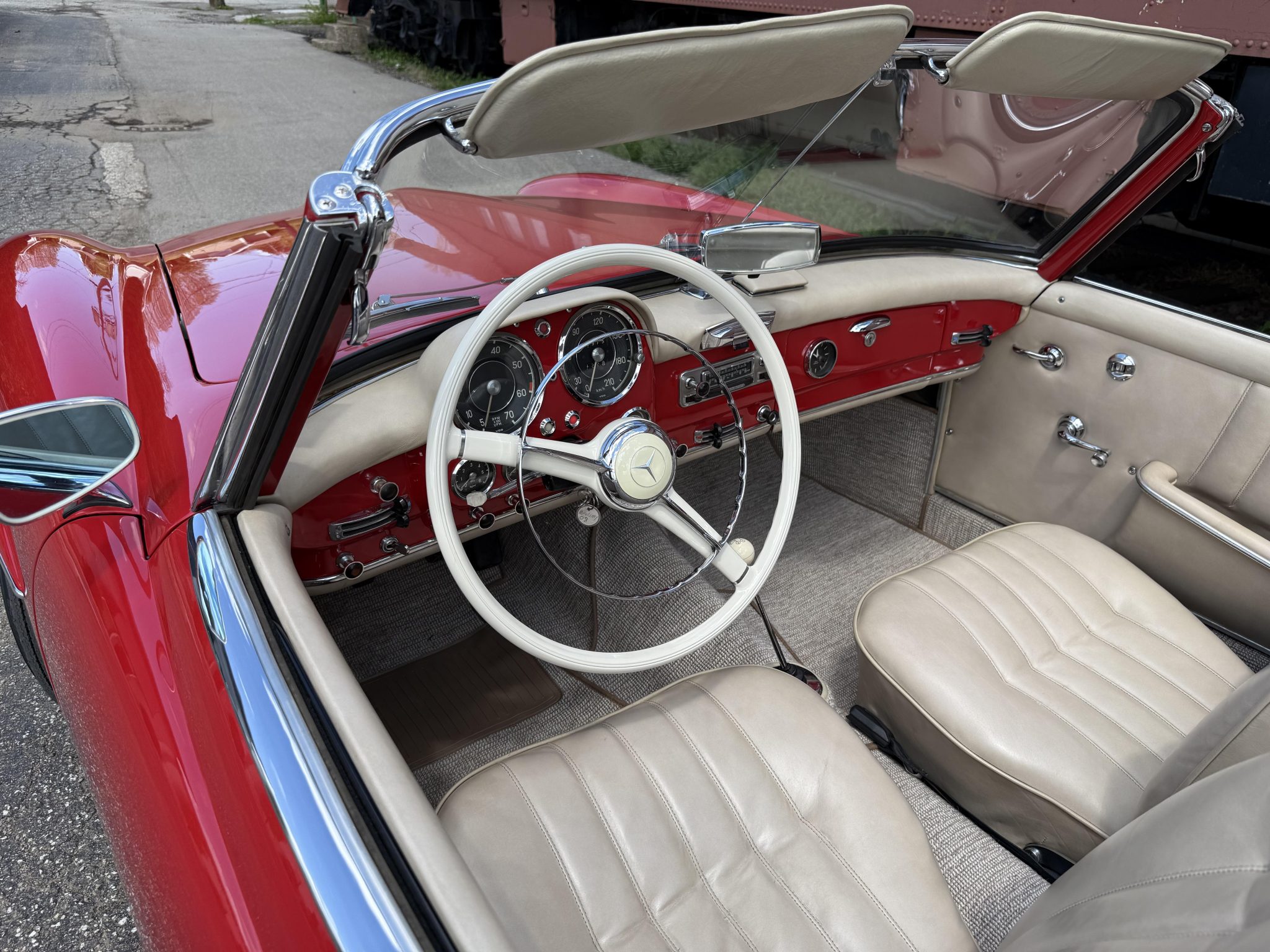 The car is finished in Signal Red over natural leather and powered by a 1.9-liter M121 inline-four paired with a four-speed manual transmission. Equipment includes a tan convertible top, 13″ steel wheels with body-color hubcaps, power-assisted drum brakes, a Becker Europa AM/FM radio, and a rear “Kinder” jump seat.