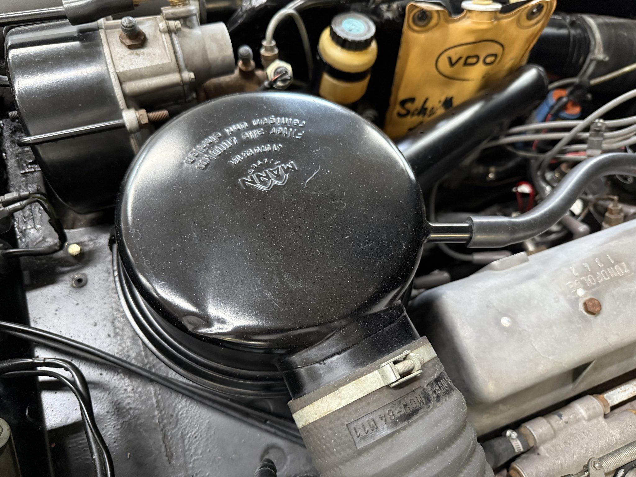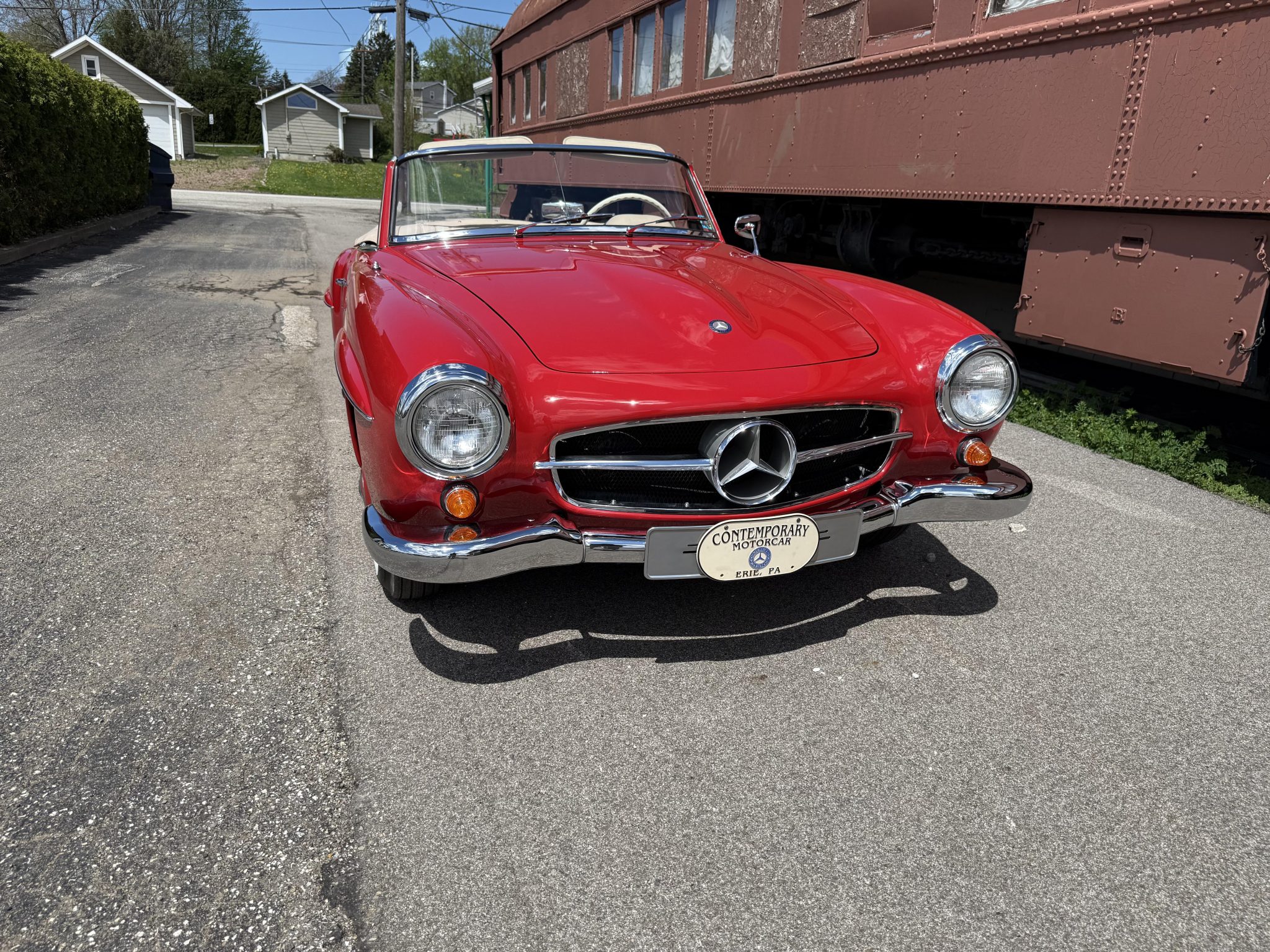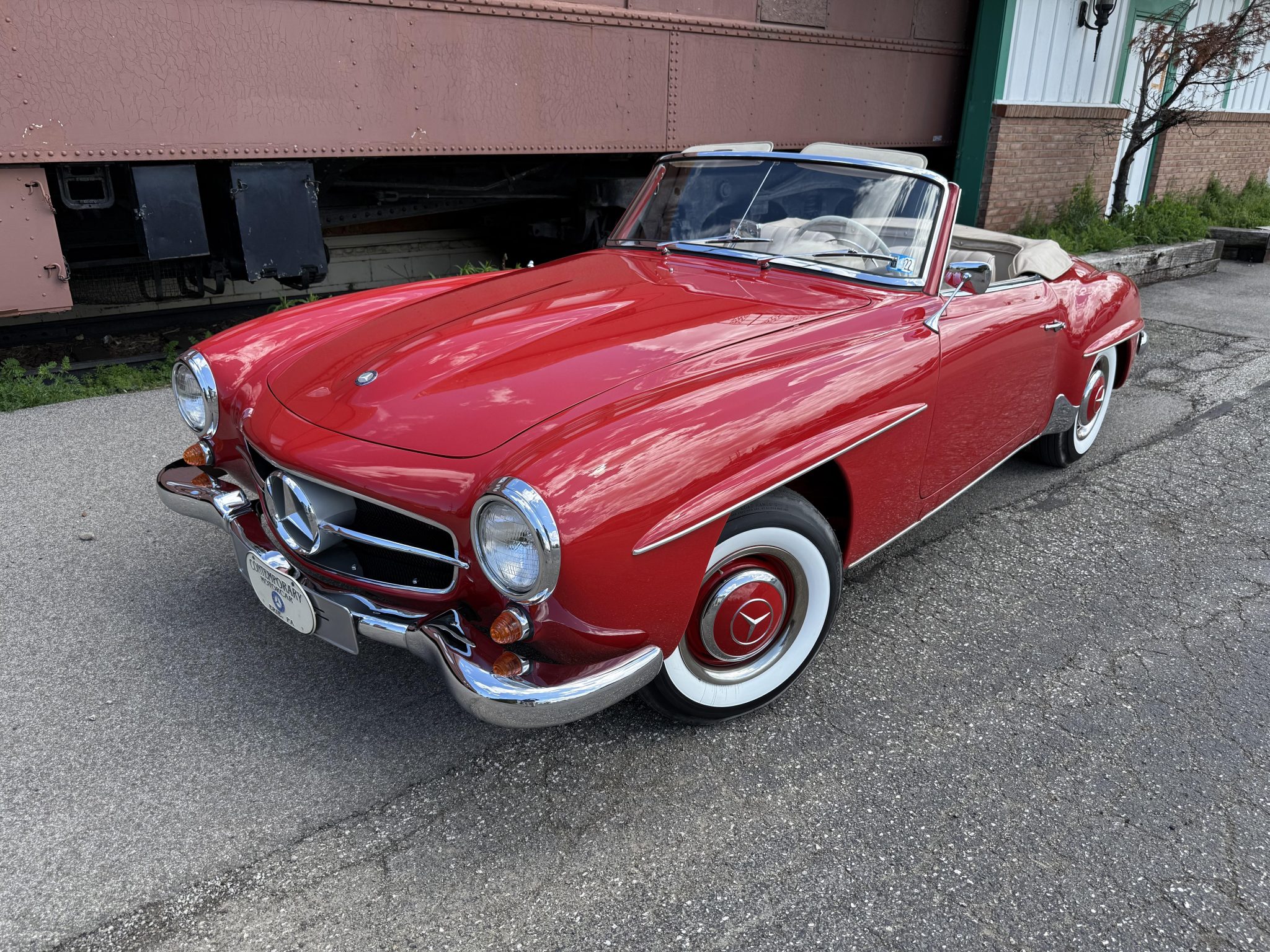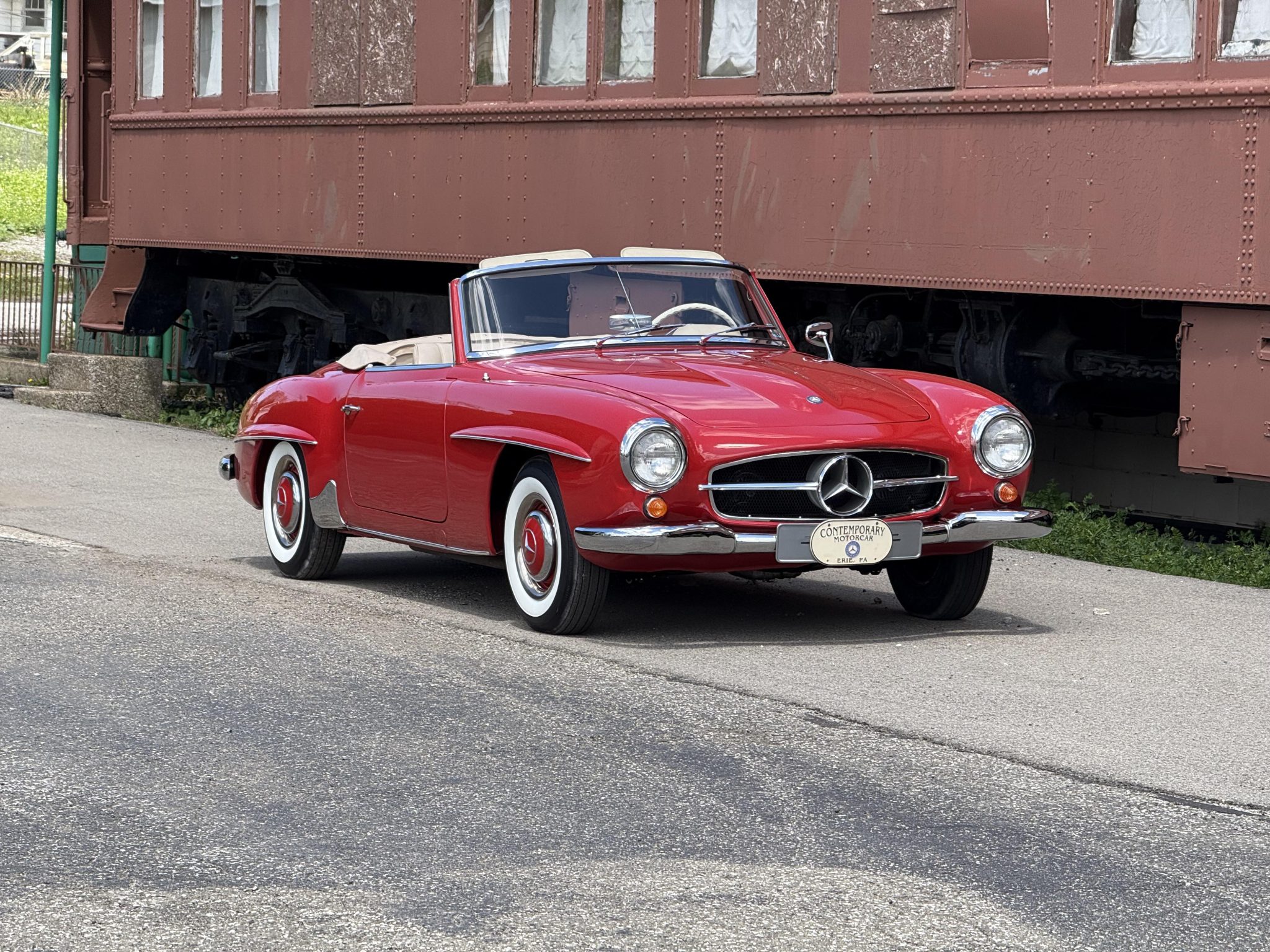 The car is finished in Signal Red over natural leather and powered by a 1.9-liter M121 inline-four paired with a four-speed manual transmission. Equipment includes a tan convertible top, 13″ steel wheels with body-color hubcaps, power-assisted drum brakes, a Becker Europa AM/FM radio, and a rear “Kinder” jump seat.