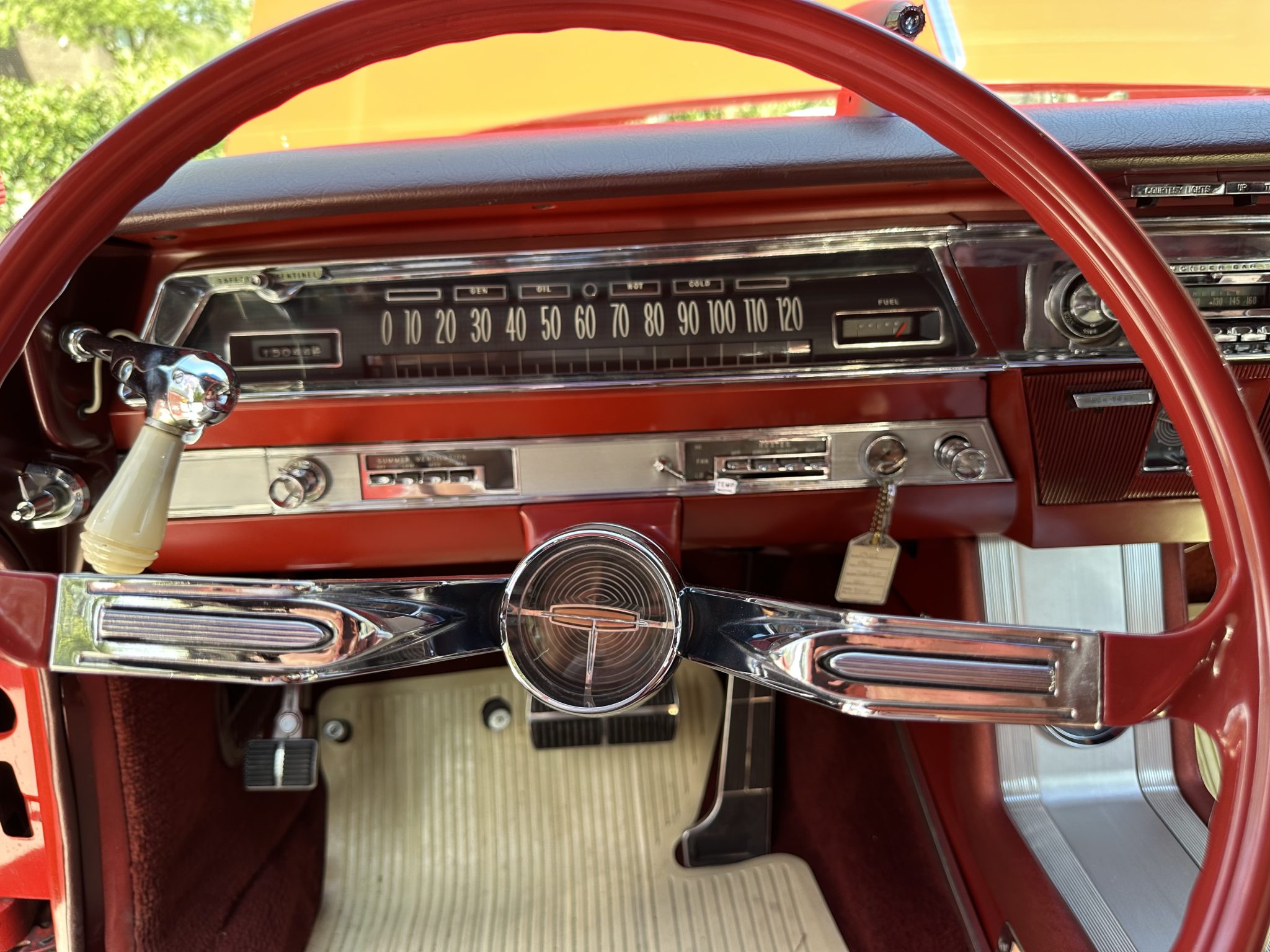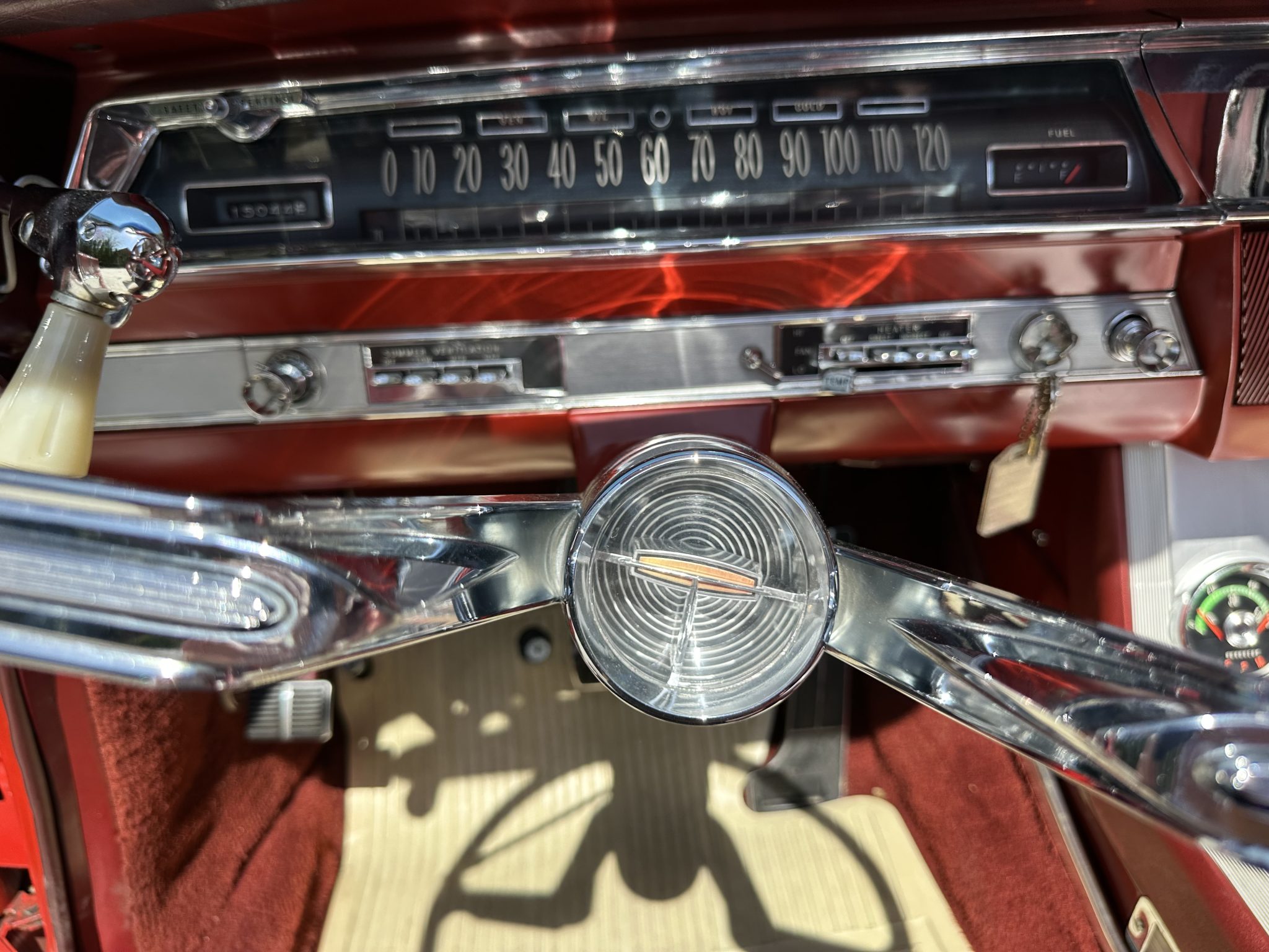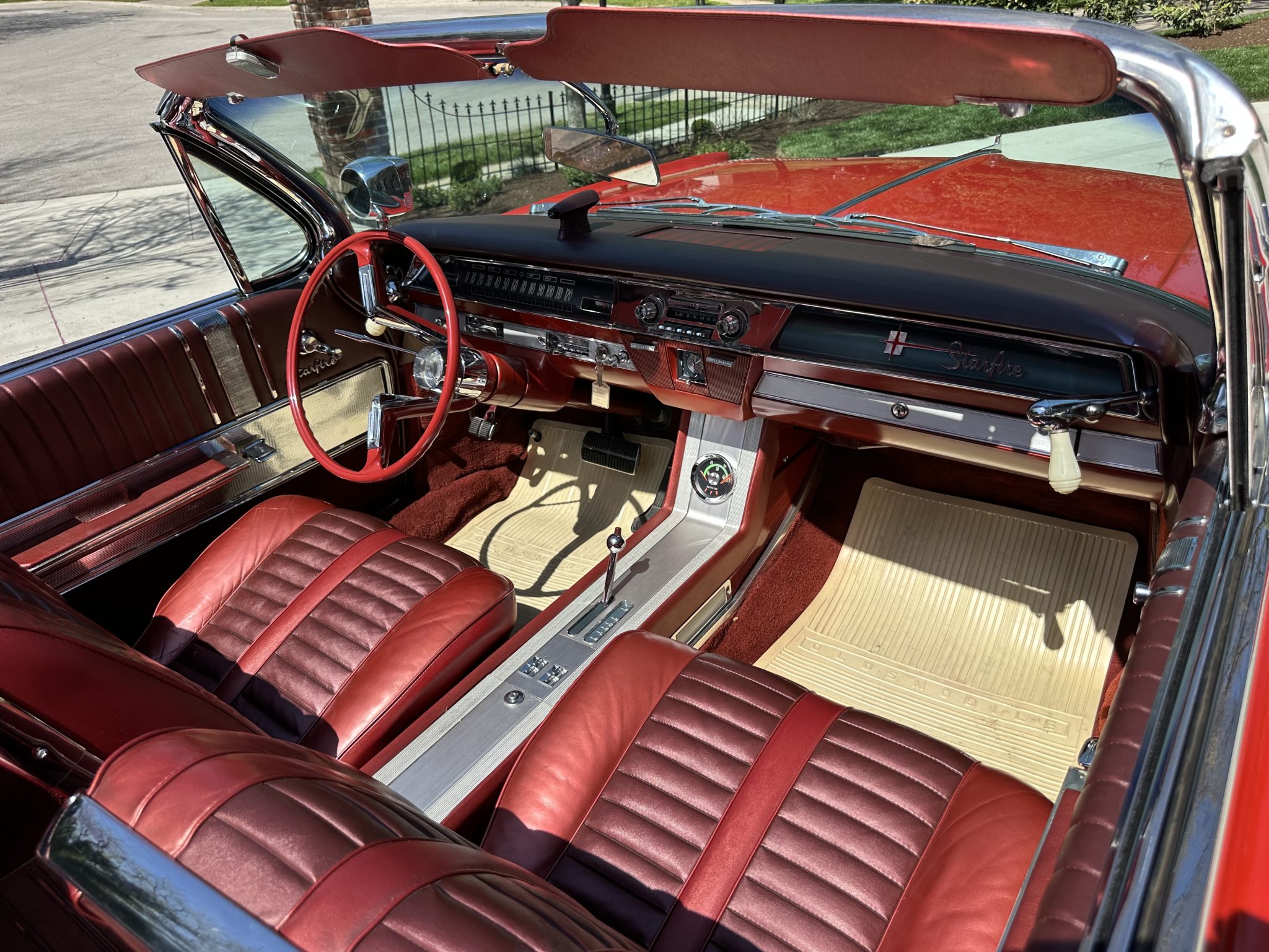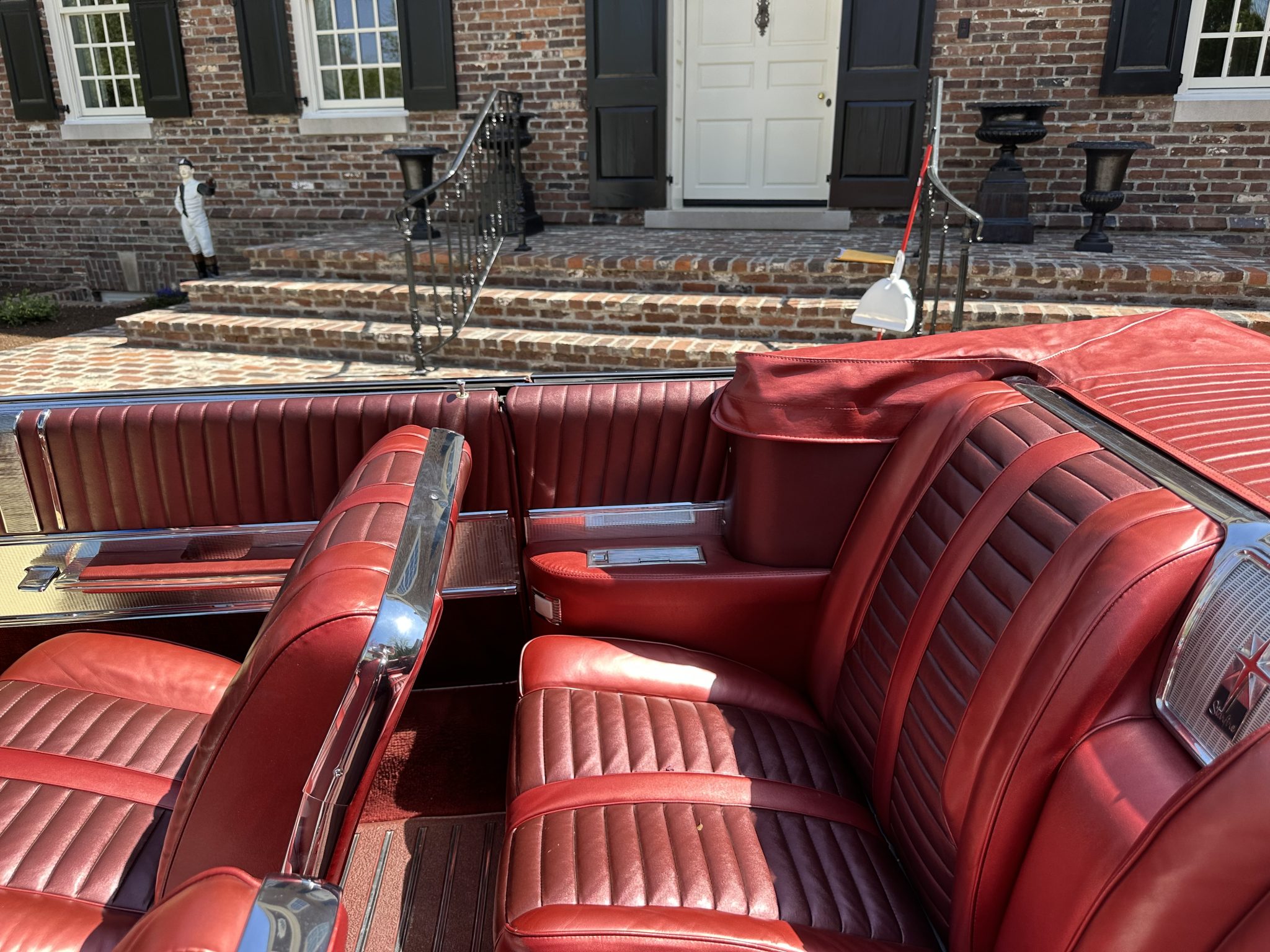The car is powered by a 394ci V8 mated to a Hydra-Matic three-speed automatic transmission and a limited-slip rear differential, and it is finished in Chariot Red over Medium Red leather and vinyl. Features include a power-operated convertible soft top, quad headlights, full-length fins, dual side mirrors, dual spotlights, brushed aluminum trim, power steering, power-assisted drum brakes, 14″ steel wheels, a power-adjustable driver’s seat, power windows, a signal-seeking AM radio, Safety Sentinel, and Guide-Matic power headlight control.