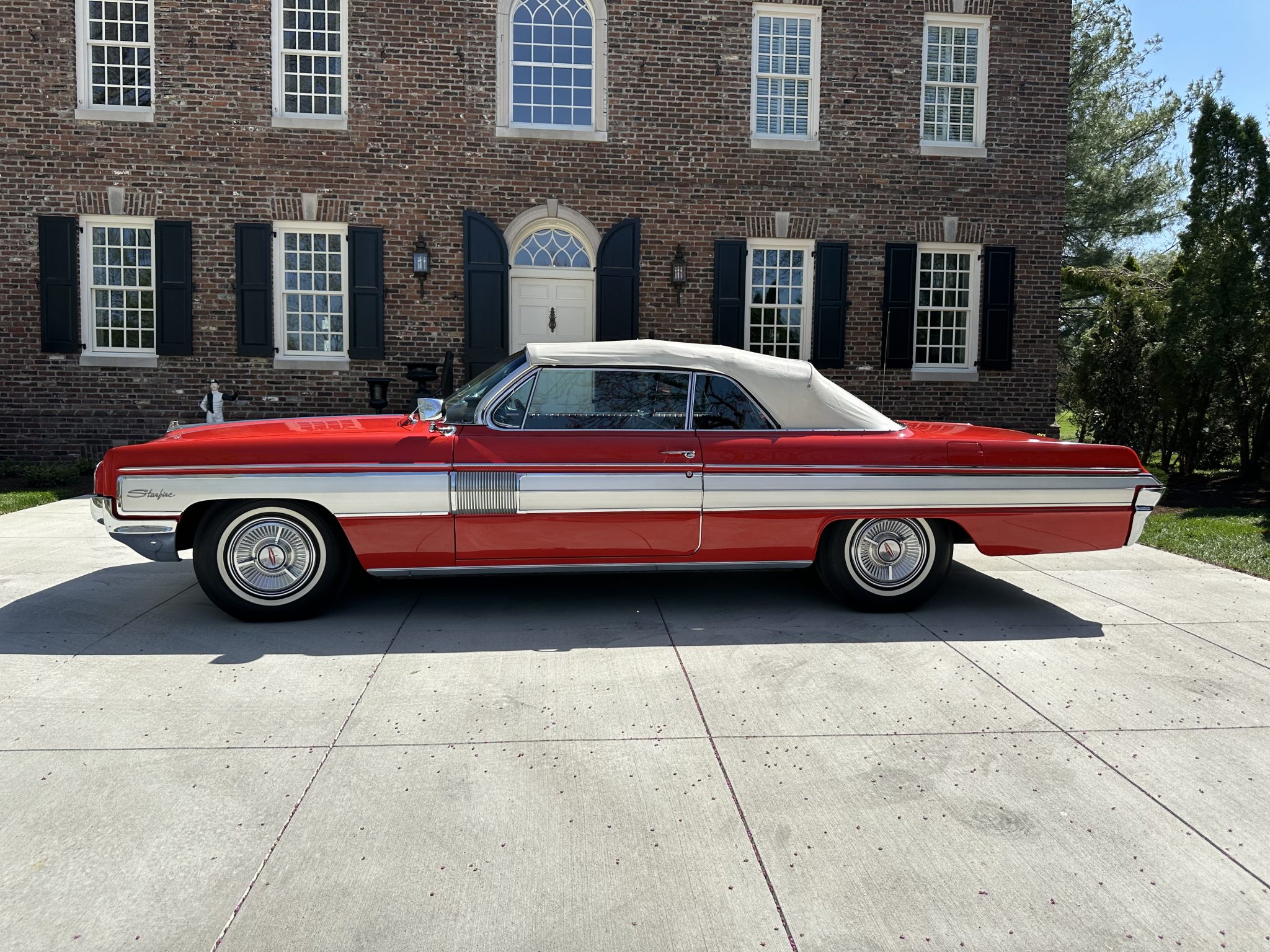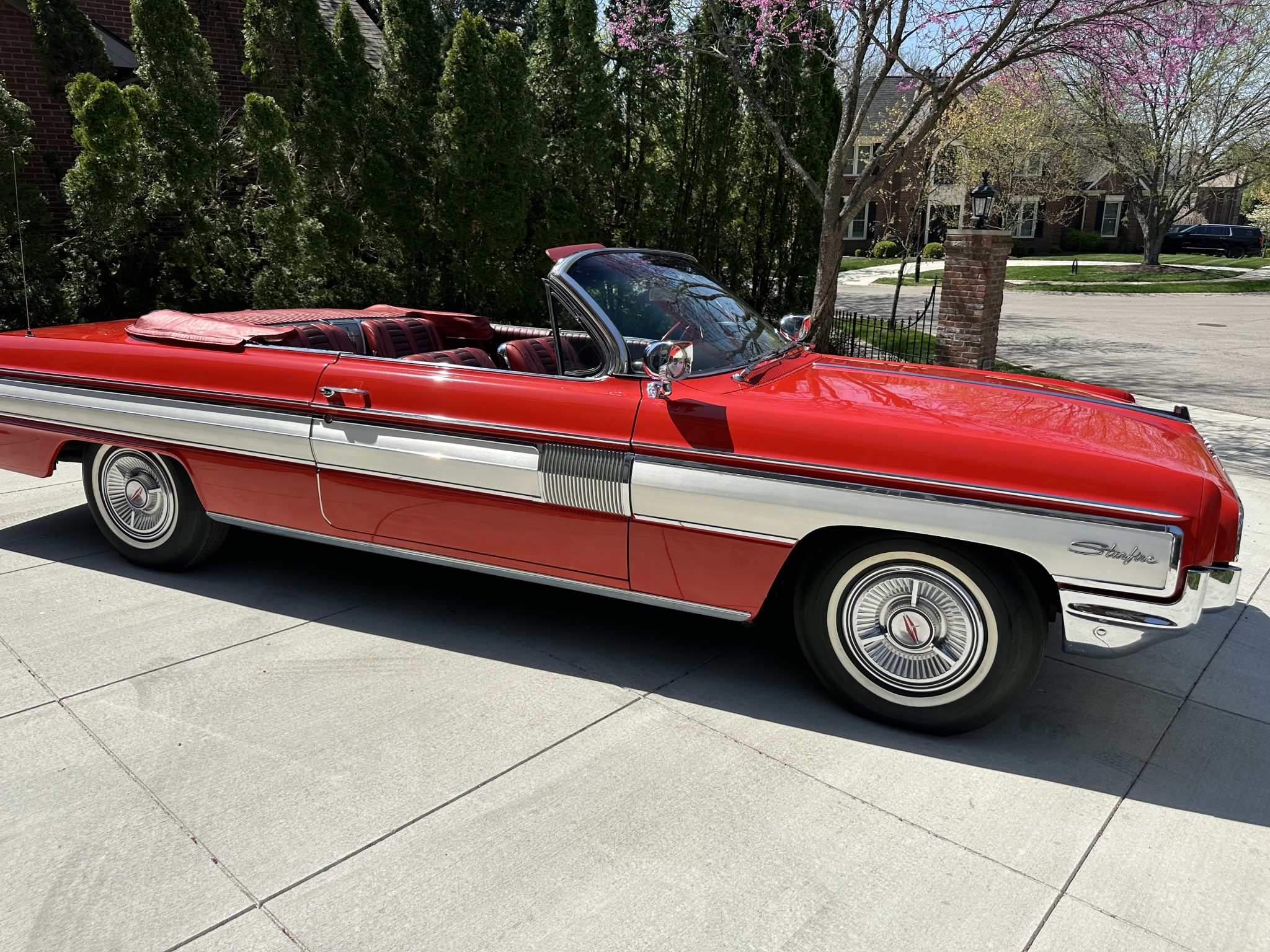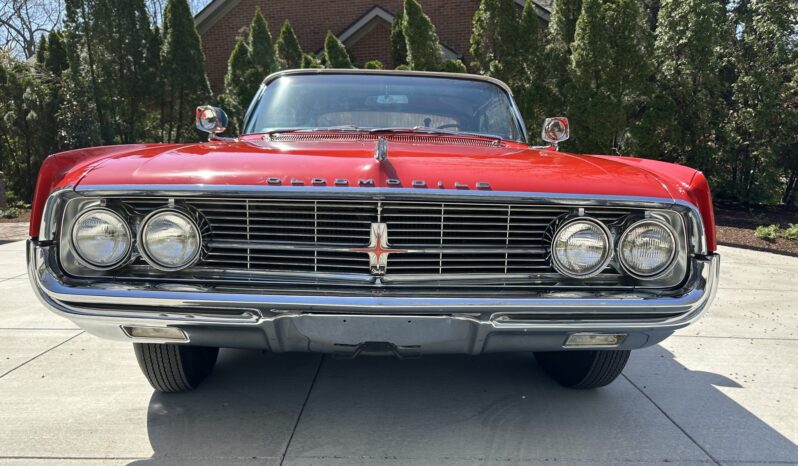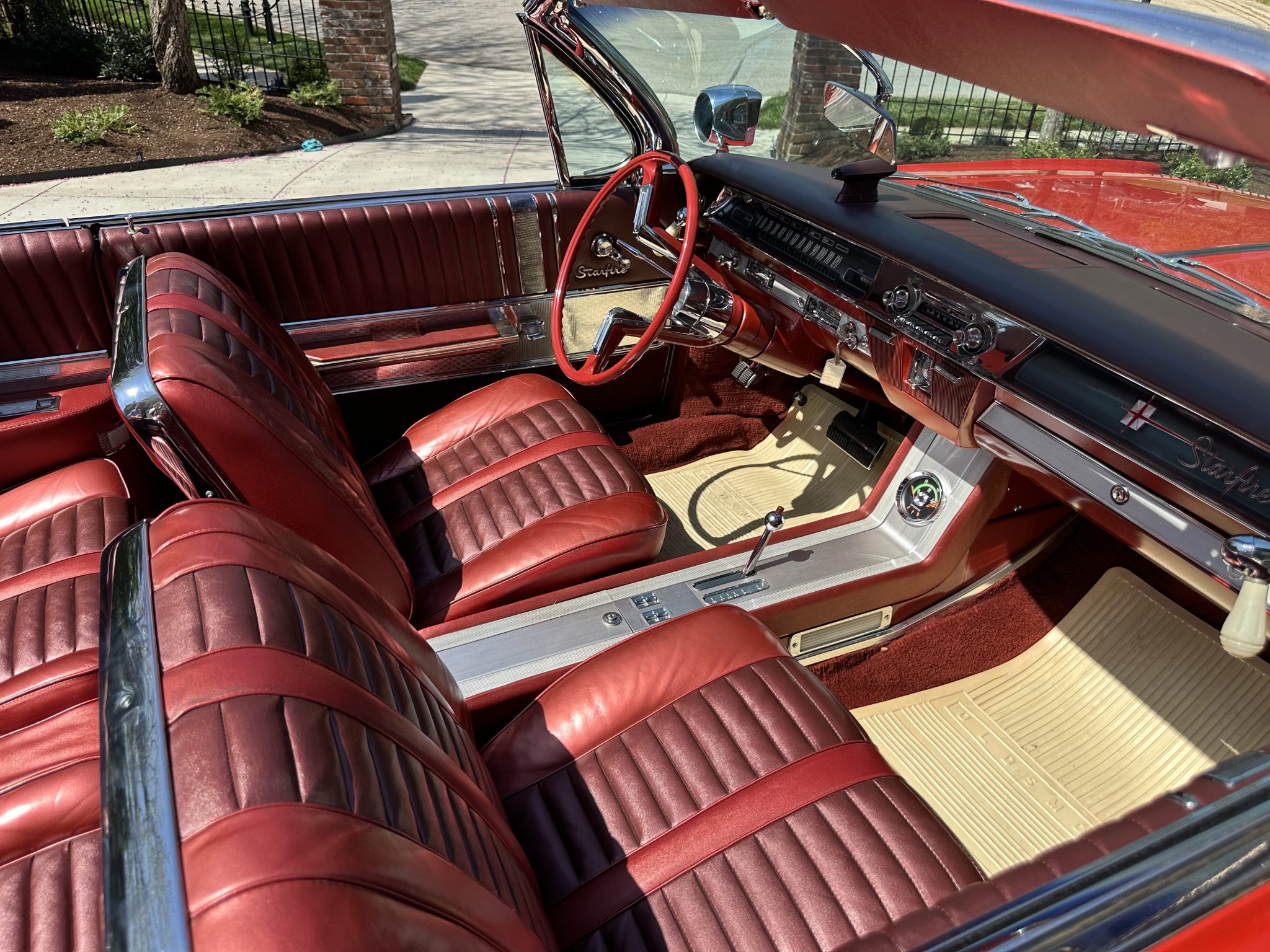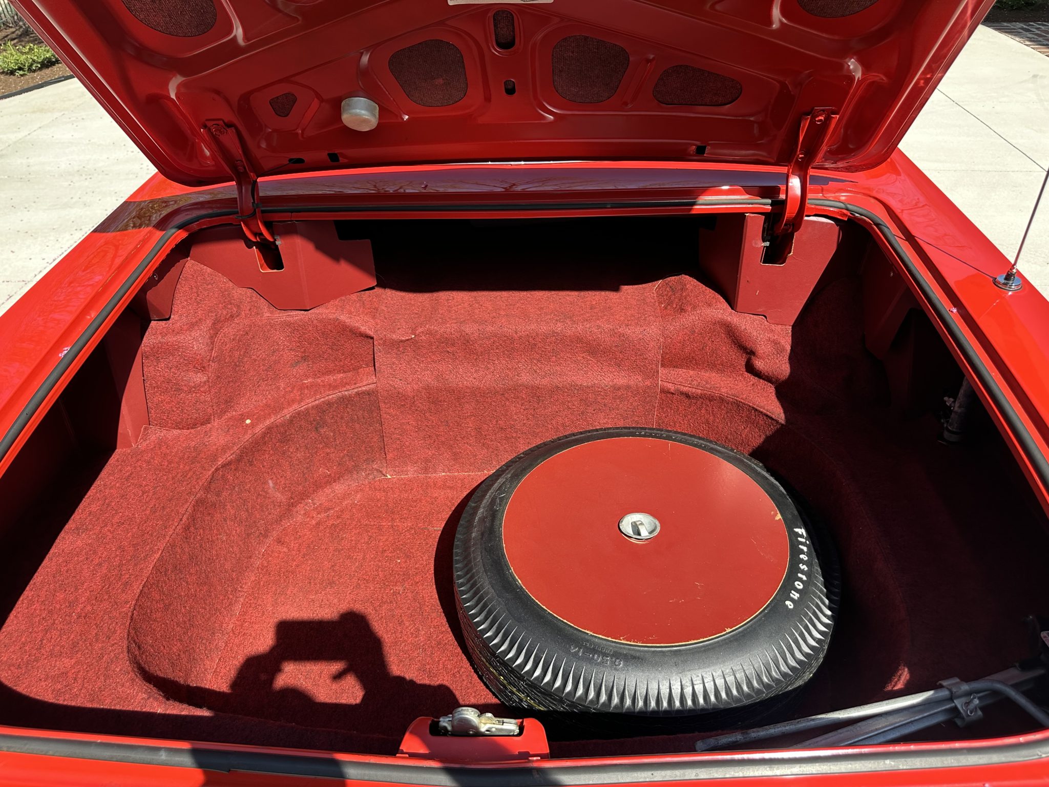 The car is powered by a 394ci V8 mated to a Hydra-Matic three-speed automatic transmission and a limited-slip rear differential, and it is finished in Chariot Red over Medium Red leather and vinyl. Features include a power-operated convertible soft top, quad headlights, full-length fins, dual side mirrors, dual spotlights, brushed aluminum trim, power steering, power-assisted drum brakes, 14″ steel wheels, a power-adjustable driver’s seat, power windows, a signal-seeking AM radio, Safety Sentinel, and Guide-Matic power headlight control.