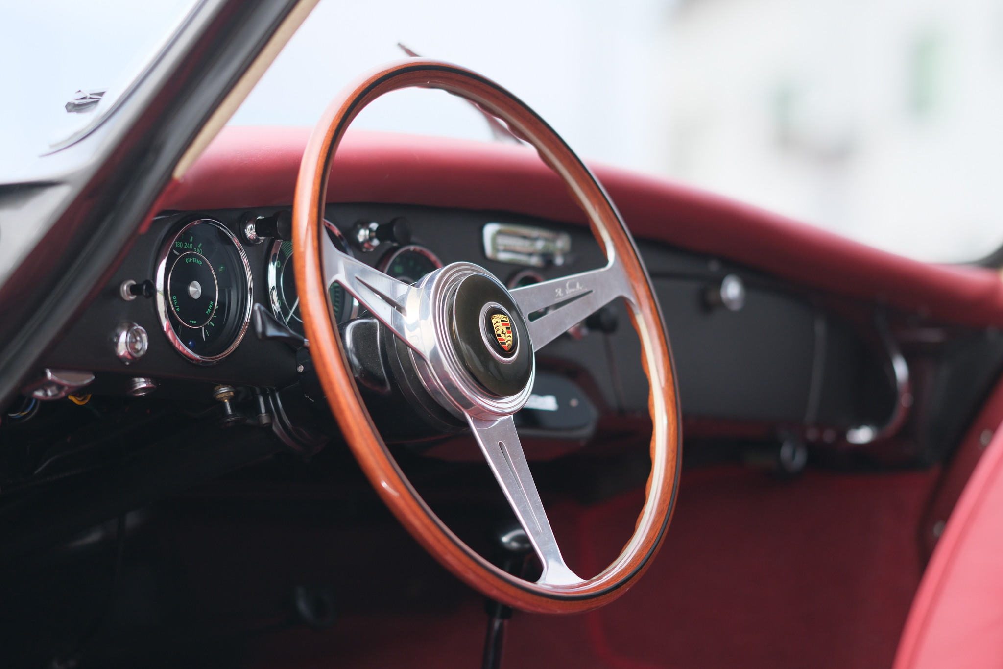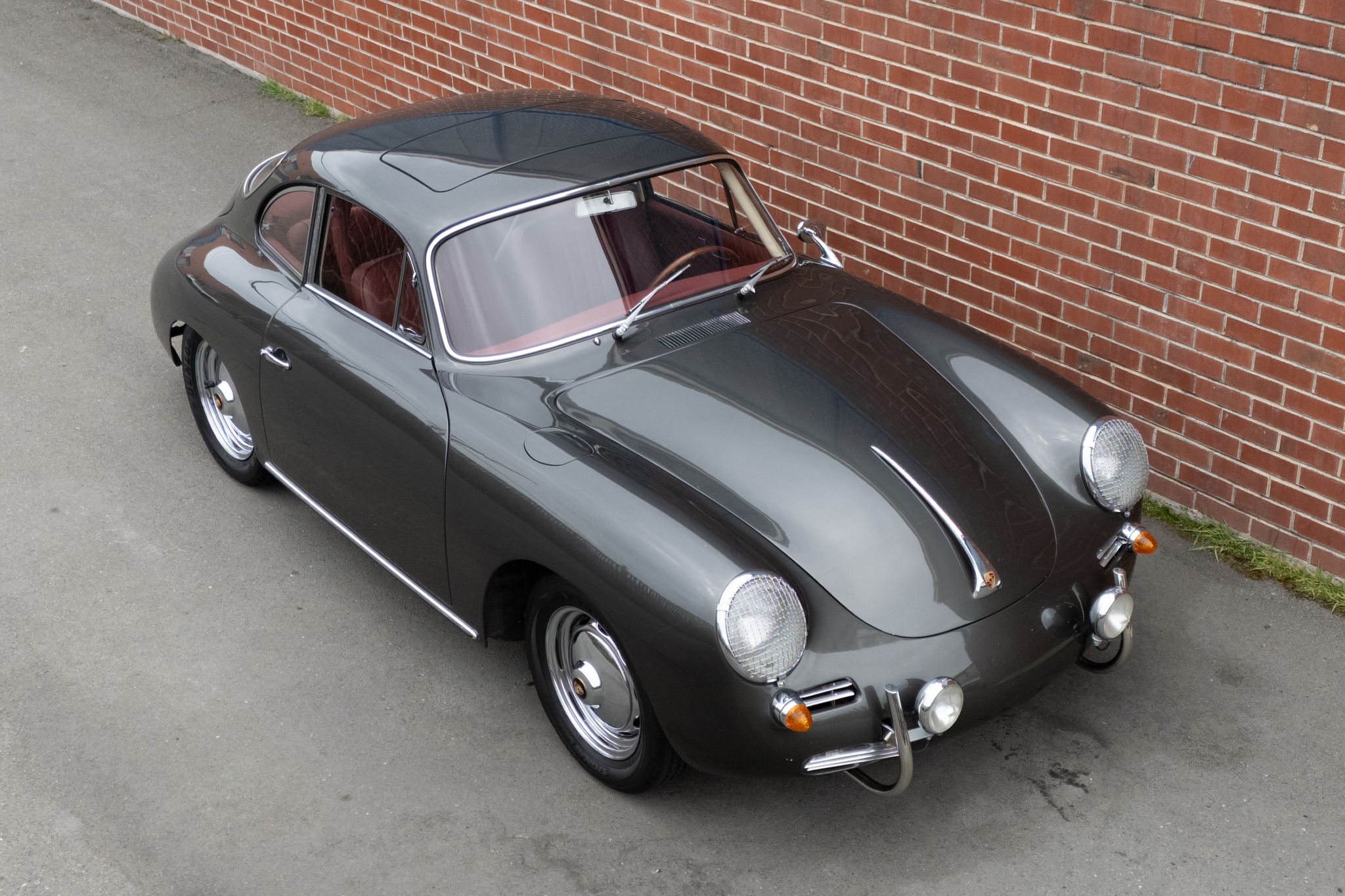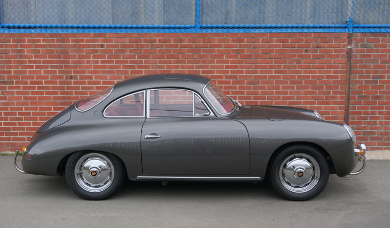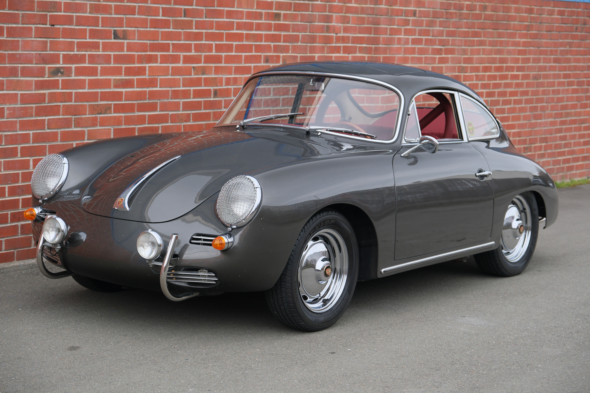 This 1962 Porsche 356B Super 90 coupe has at which time a refurbishment was commissioned that involved removing the bumpers and refinishing the body in dark gray metallic, refreshing the red interior, and installing front disc brakes. The 1.6-liter flat-four was overhauled in 2014 and fitted with ported 912-specification cylinder heads and replacement exhaust valves. Shifting is through a four-speed manual transaxle, and a WEVO shift coupler is installed. The car was outfitted with an electric sliding steel sunroof from the factory, and additional features include a roll bar, red leather upholstery, a Nardi steering wheel, 15″ wheels, auxiliary lights, dual Weber carburetors, and a fabricated exhaust system.