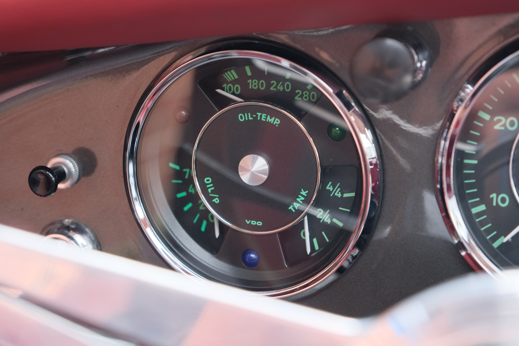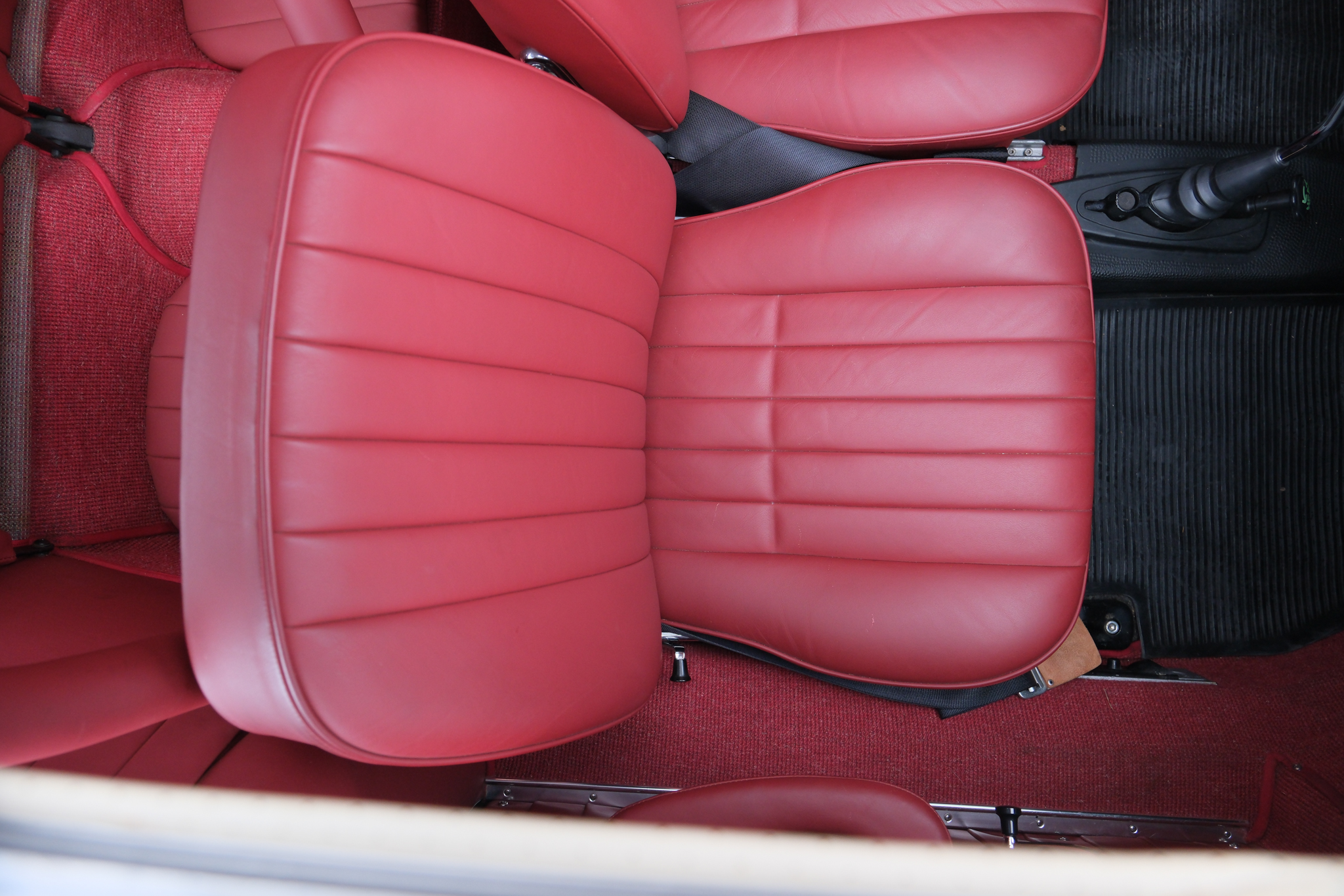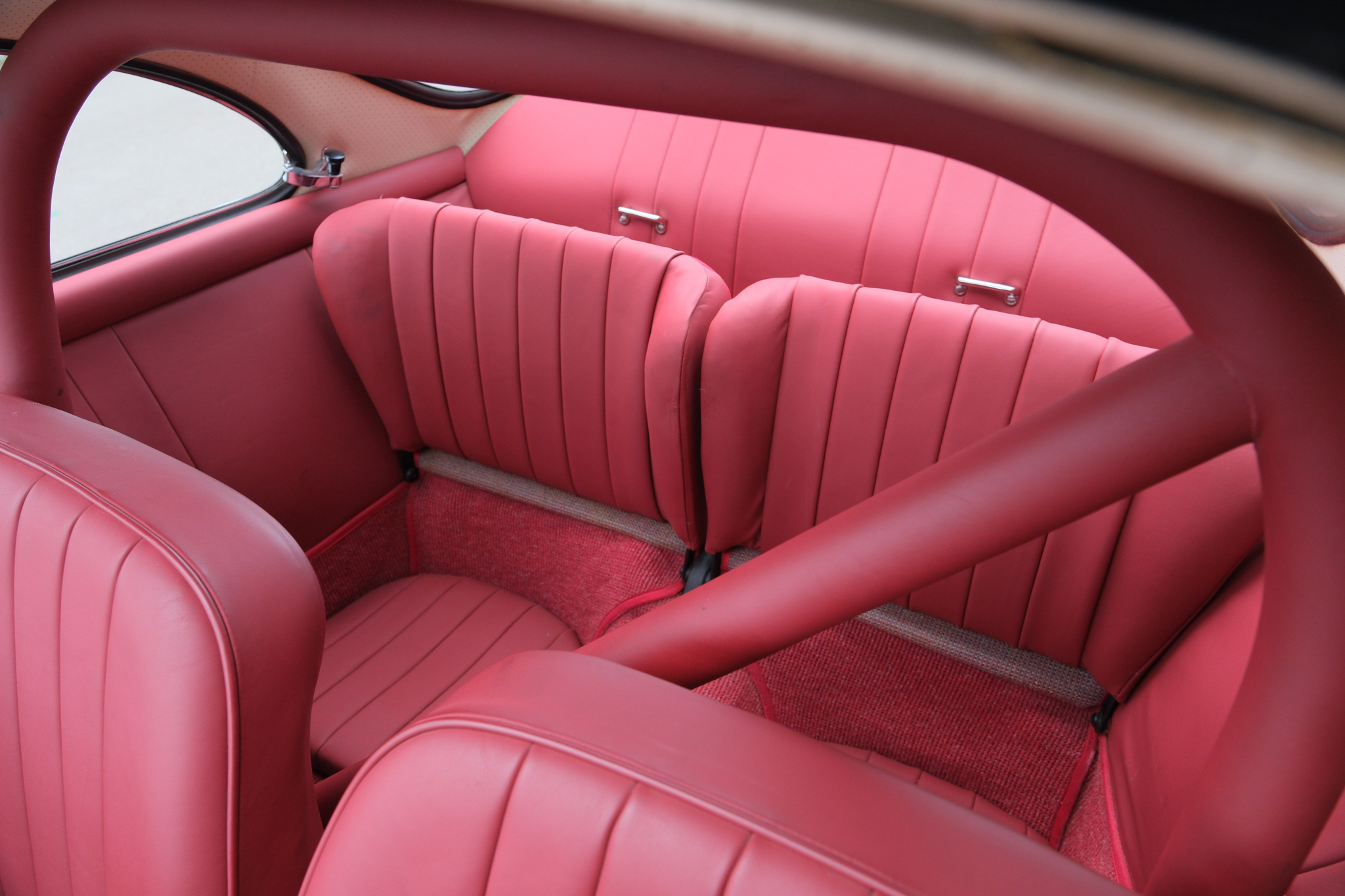 This 1962 Porsche 356B Super 90 coupe has at which time a refurbishment was commissioned that involved removing the bumpers and refinishing the body in dark gray metallic, refreshing the red interior, and installing front disc brakes. The 1.6-liter flat-four was overhauled in 2014 and fitted with ported 912-specification cylinder heads and replacement exhaust valves. Shifting is through a four-speed manual transaxle, and a WEVO shift coupler is installed. The car was outfitted with an electric sliding steel sunroof from the factory, and additional features include a roll bar, red leather upholstery, a Nardi steering wheel, 15″ wheels, auxiliary lights, dual Weber carburetors, and a fabricated exhaust system.