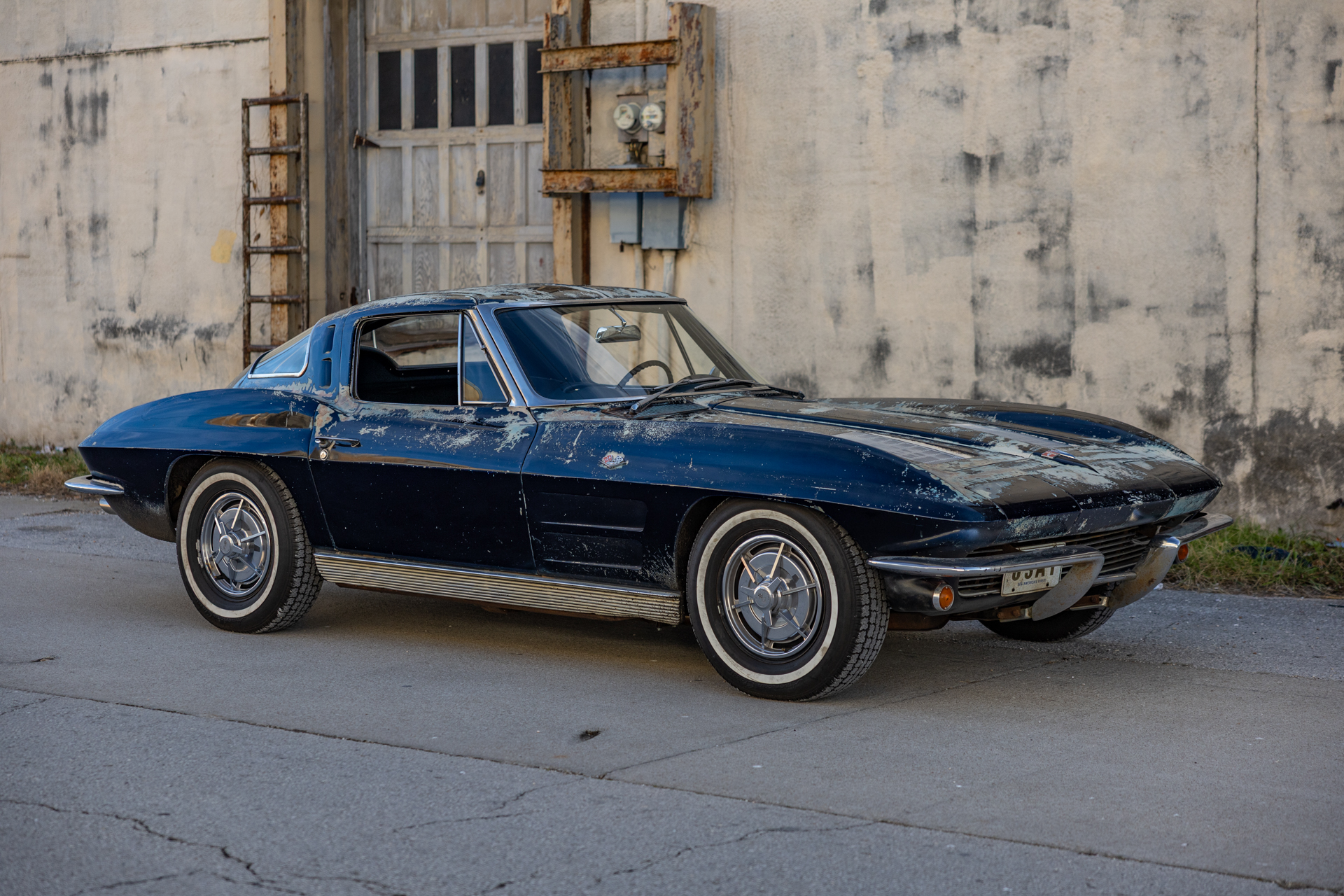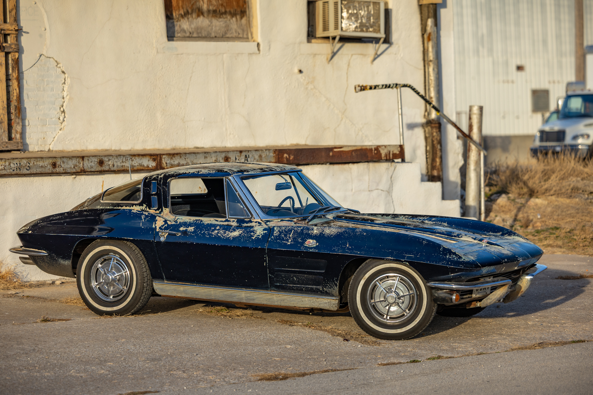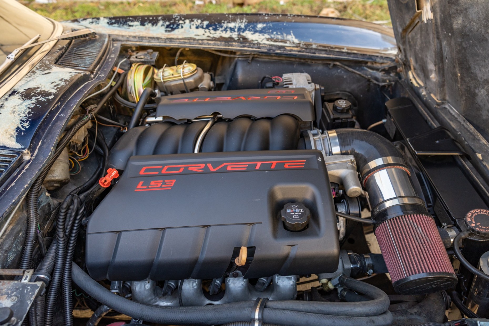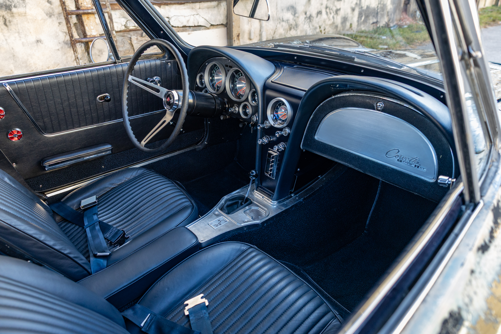 A 6.2-liter LS3 V8 was installed along with a rebuilt 4L60E four-speed automatic transmission, an aluminum radiator, and a replacement fuel tank. The interior was also overhauled in 2023 and features bucket seats trimmed in blue leather as well as a RetroSound stereo unit. The fiberglass body is coated in worn Daytona Blue paint that has chipped away in areas, and the chassis features independent suspension as well as power steering and power-assisted front disc brakes with drilled and slotted rotors.