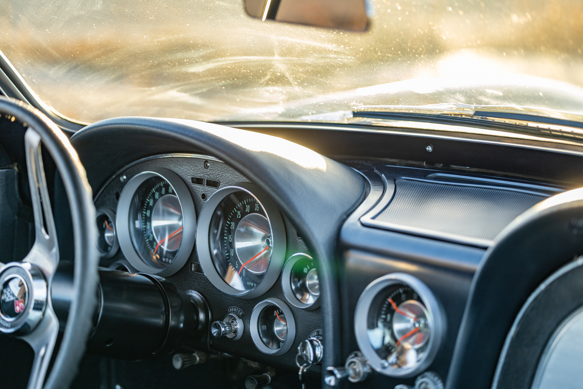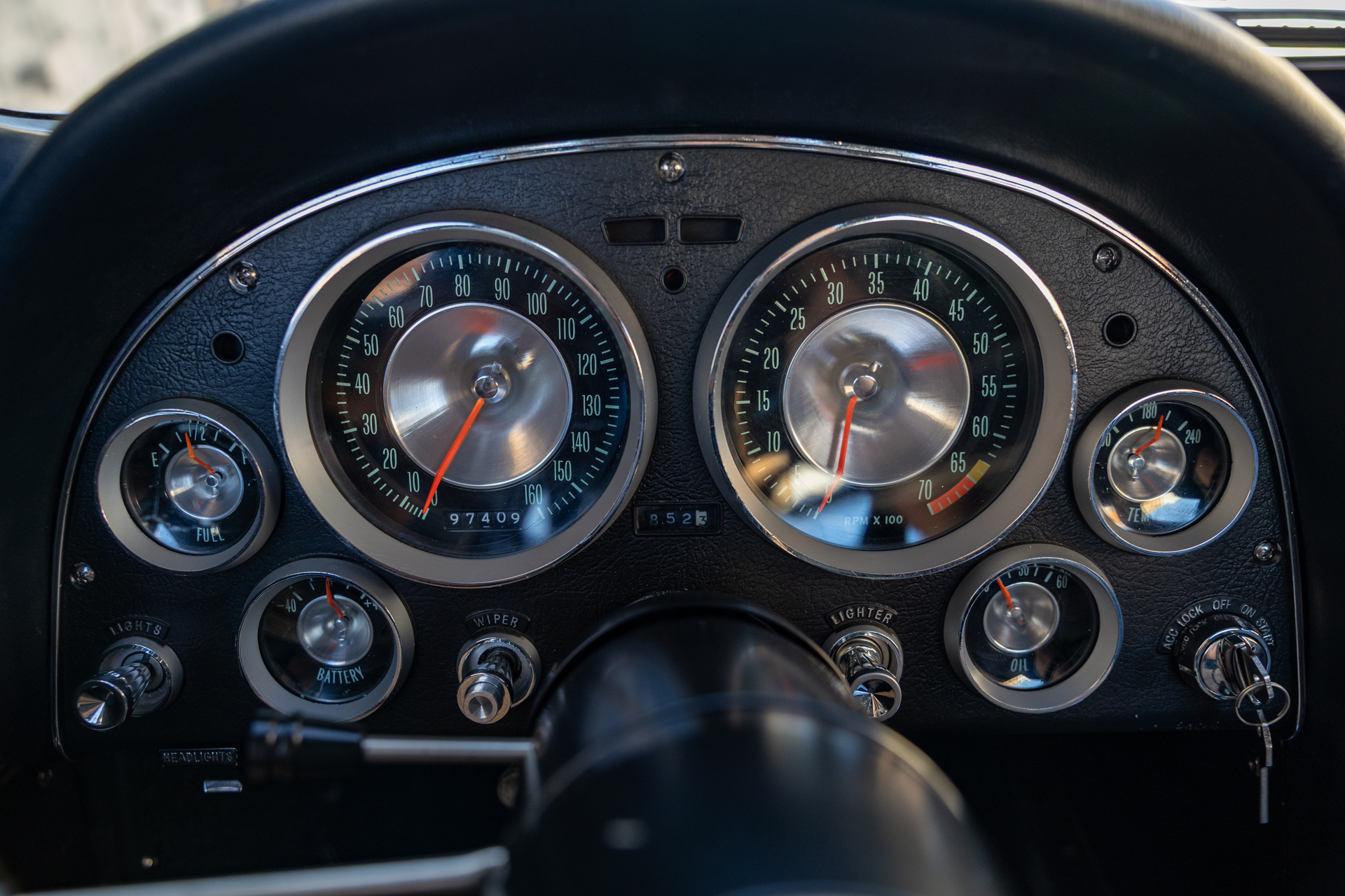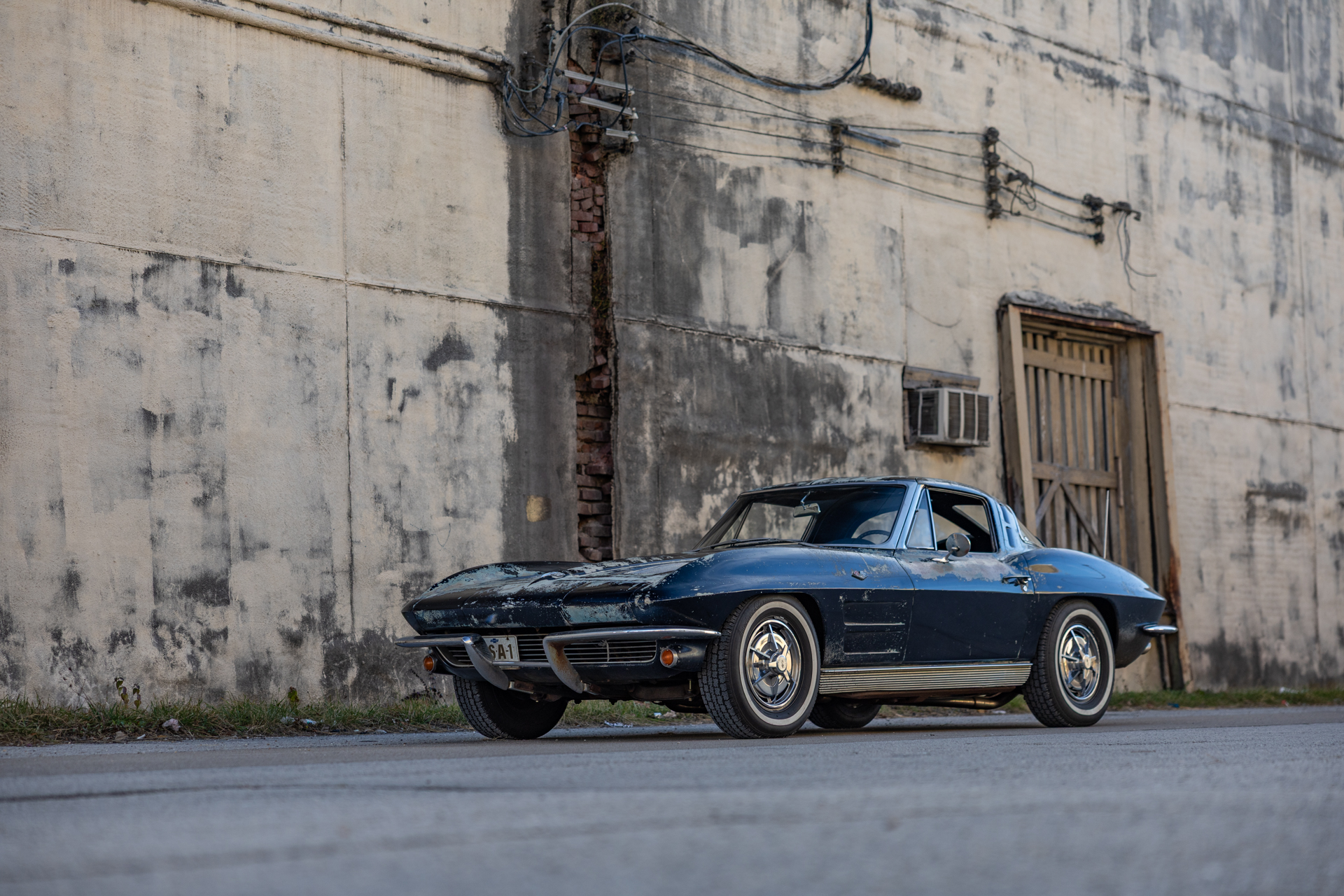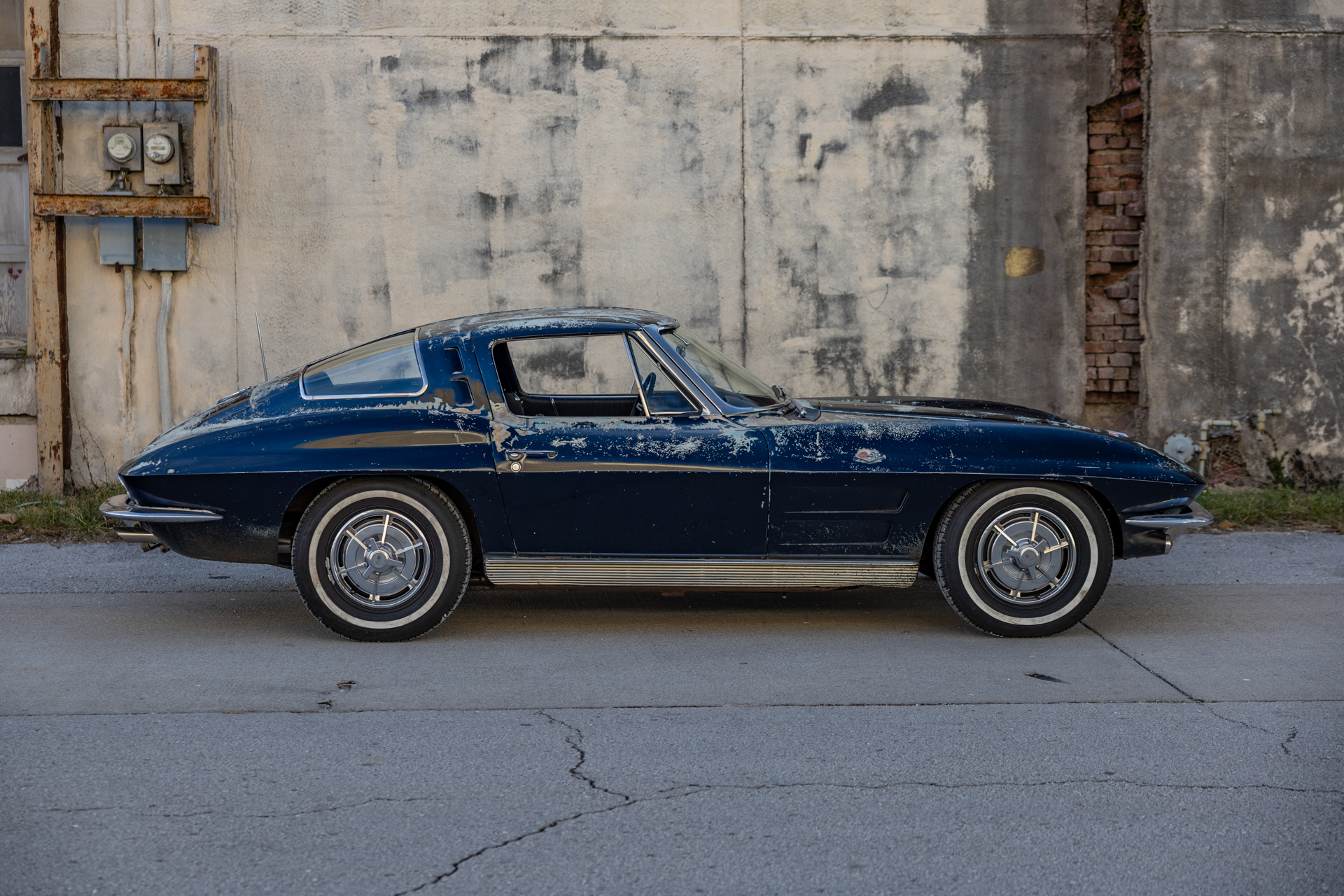 A 6.2-liter LS3 V8 was installed along with a rebuilt 4L60E four-speed automatic transmission, an aluminum radiator, and a replacement fuel tank. The interior was also overhauled in 2023 and features bucket seats trimmed in blue leather as well as a RetroSound stereo unit. The fiberglass body is coated in worn Daytona Blue paint that has chipped away in areas, and the chassis features independent suspension as well as power steering and power-assisted front disc brakes with drilled and slotted rotors.