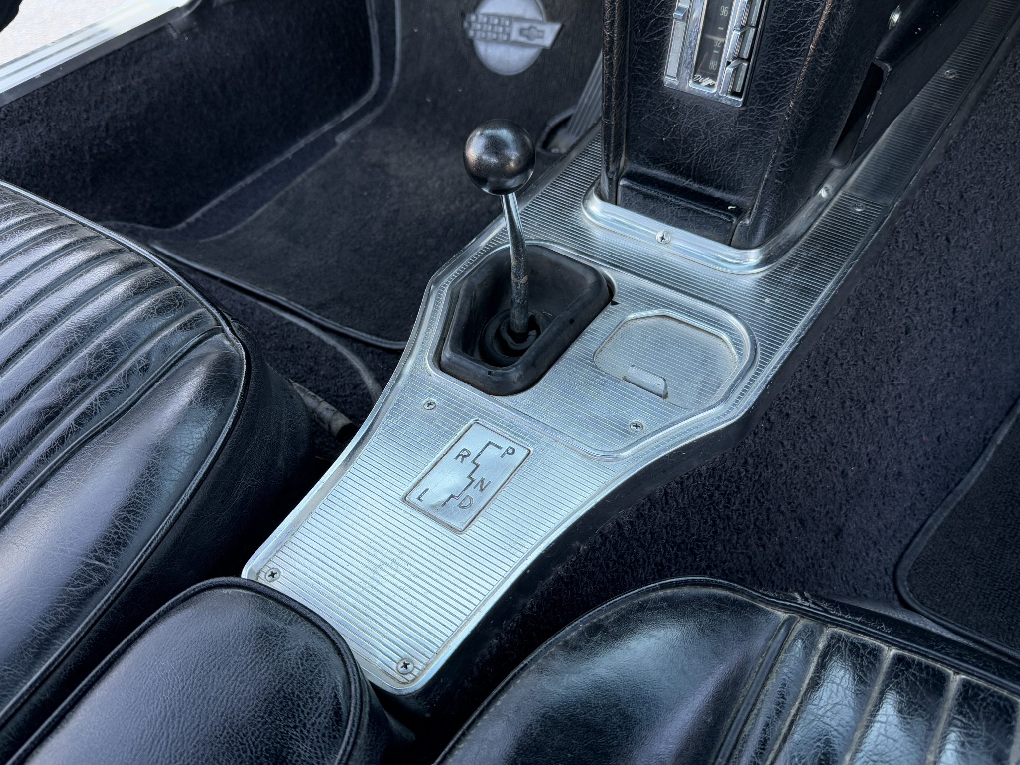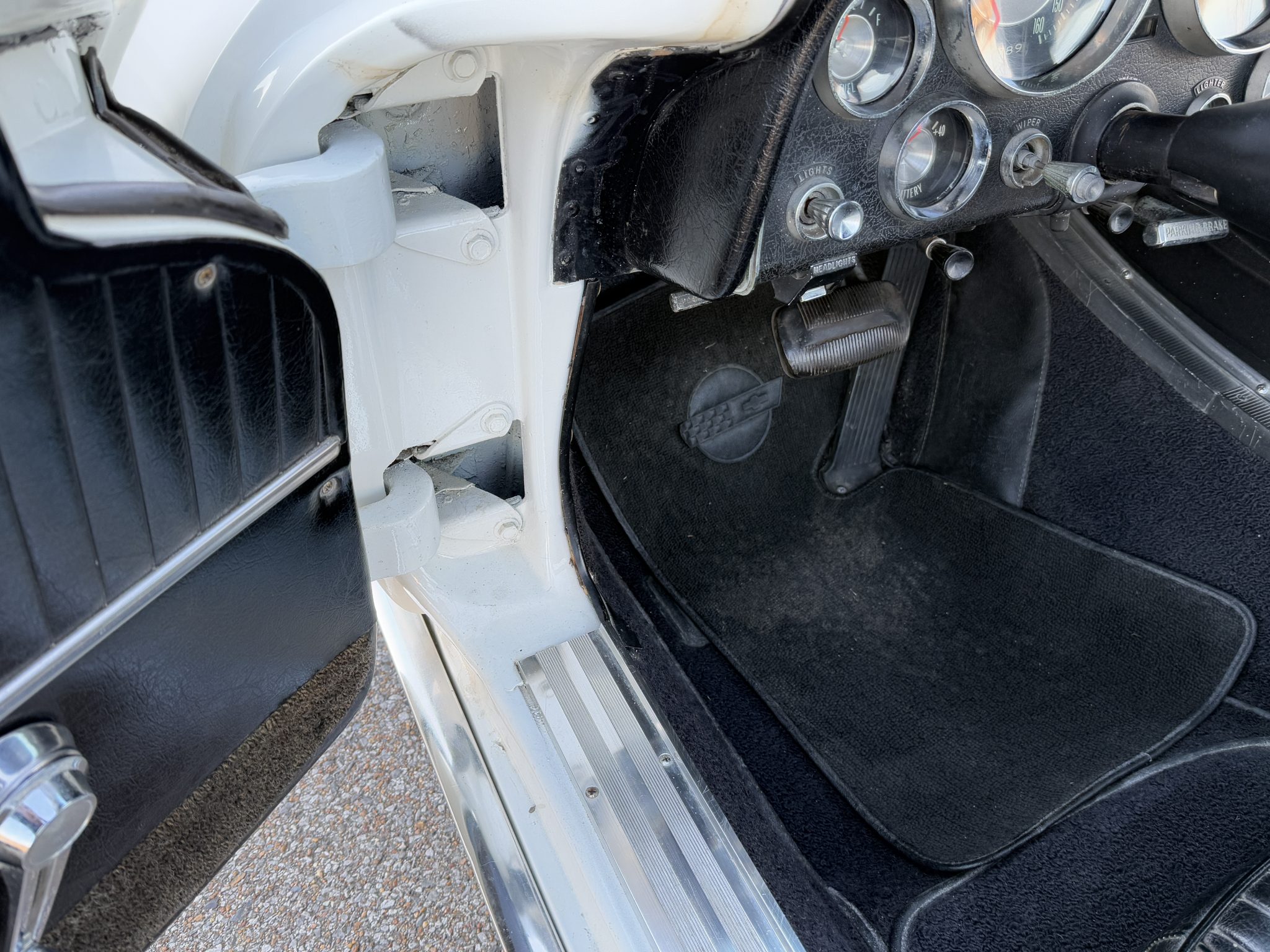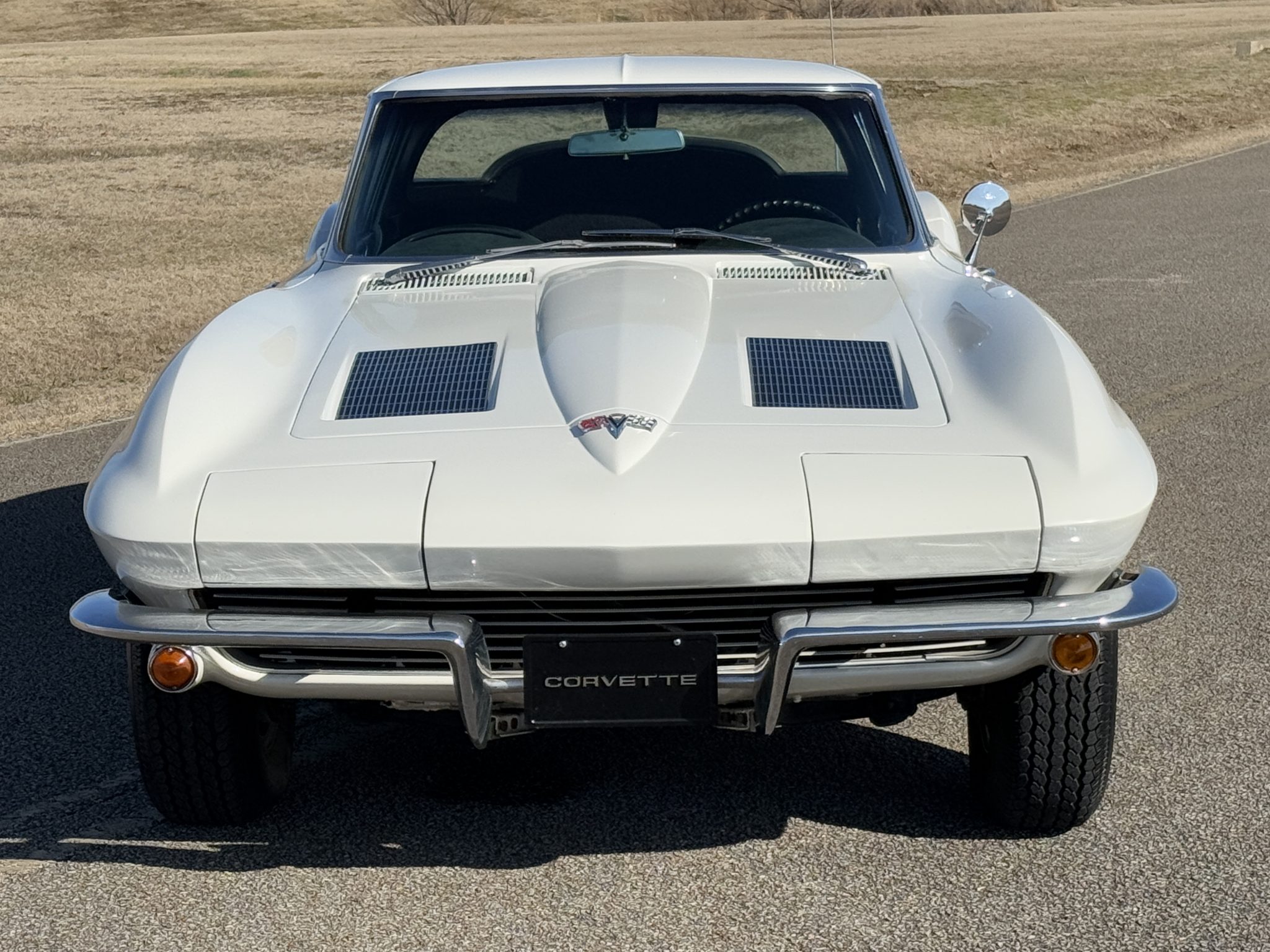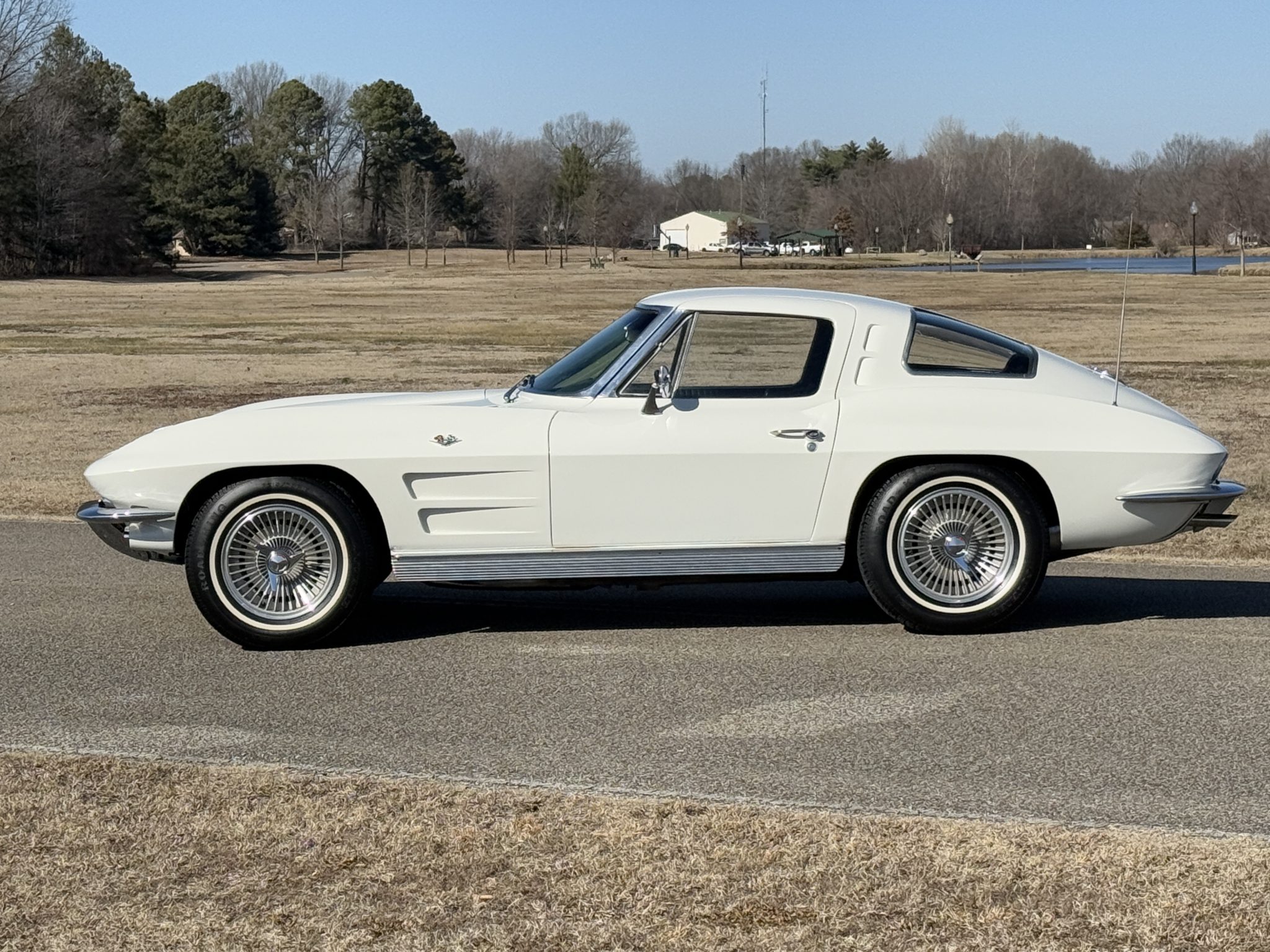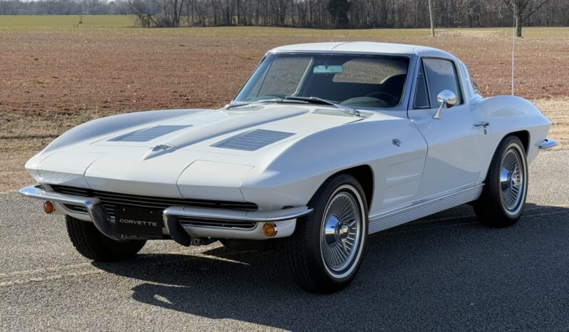 This 1963 Chevrolet Corvette split-window coupe is powered by a 327ci L75 V8 paired with a replacement three-speed automatic and is refinished in white. Features include 15″ turbine-style wheels with three-eared knock-off spinners, power steering, an AM/FM radio, and concealed headlights.