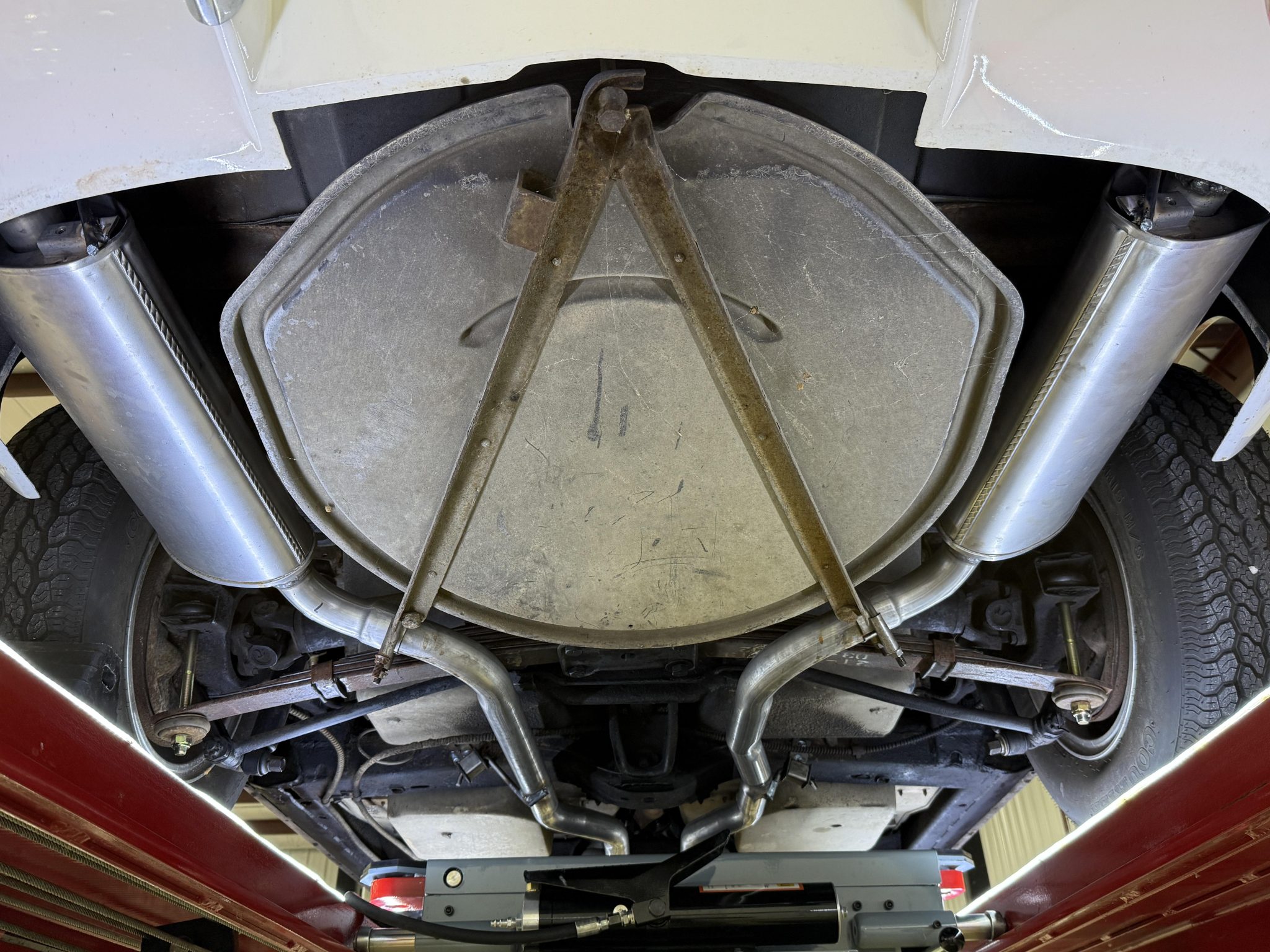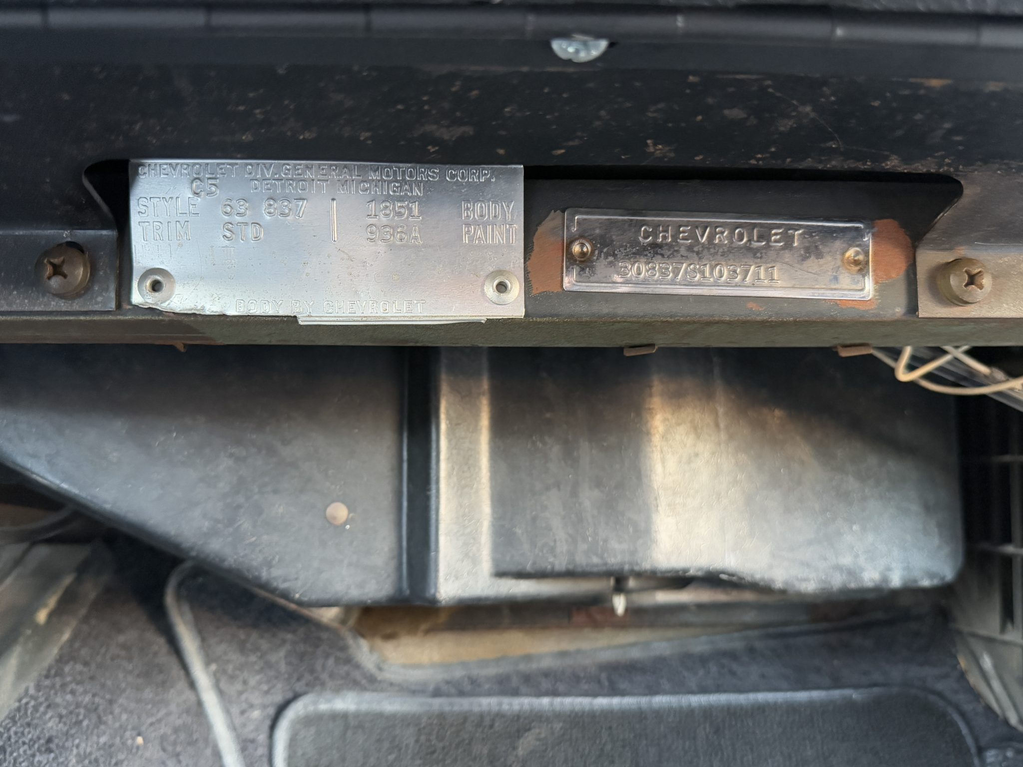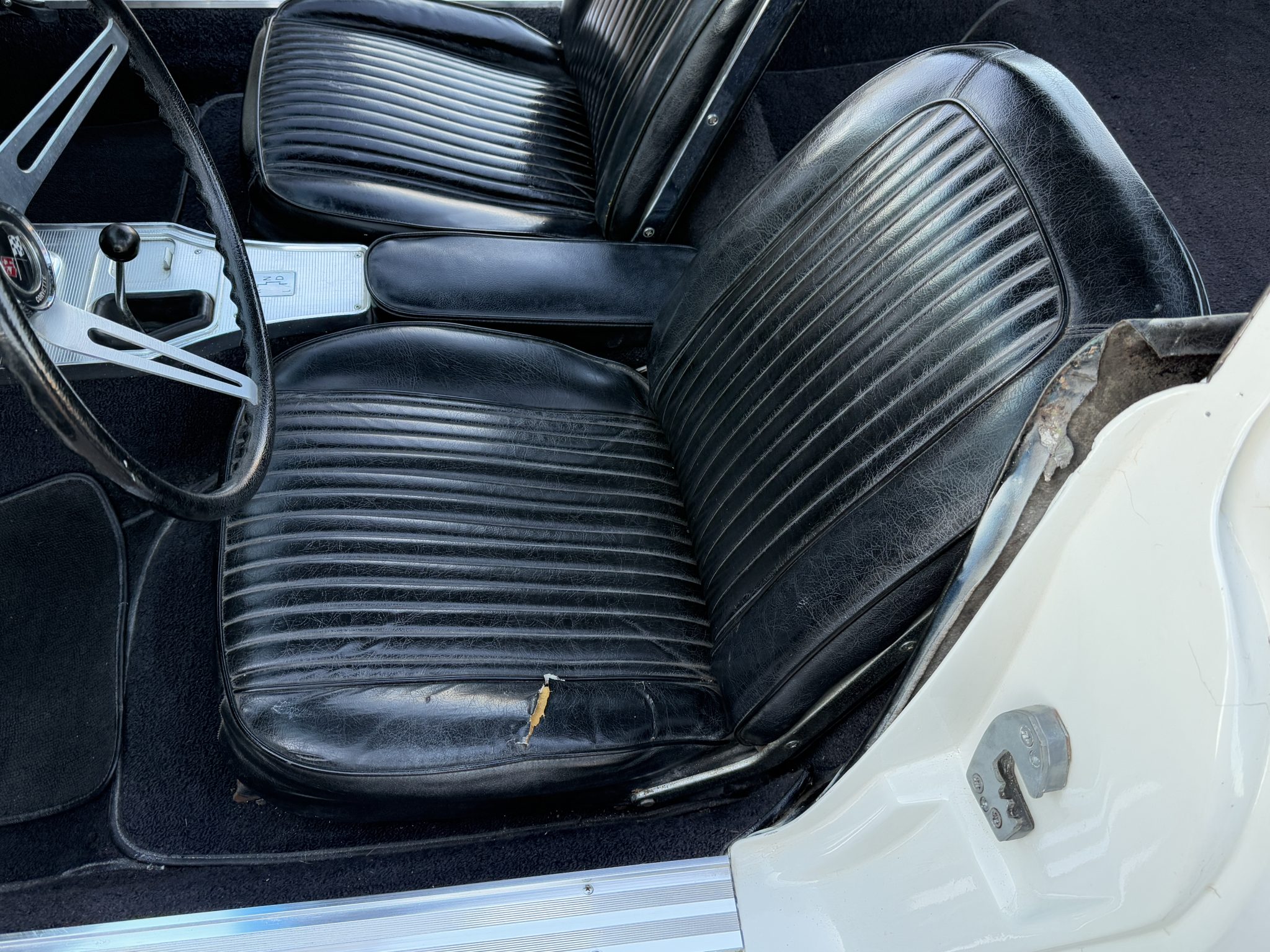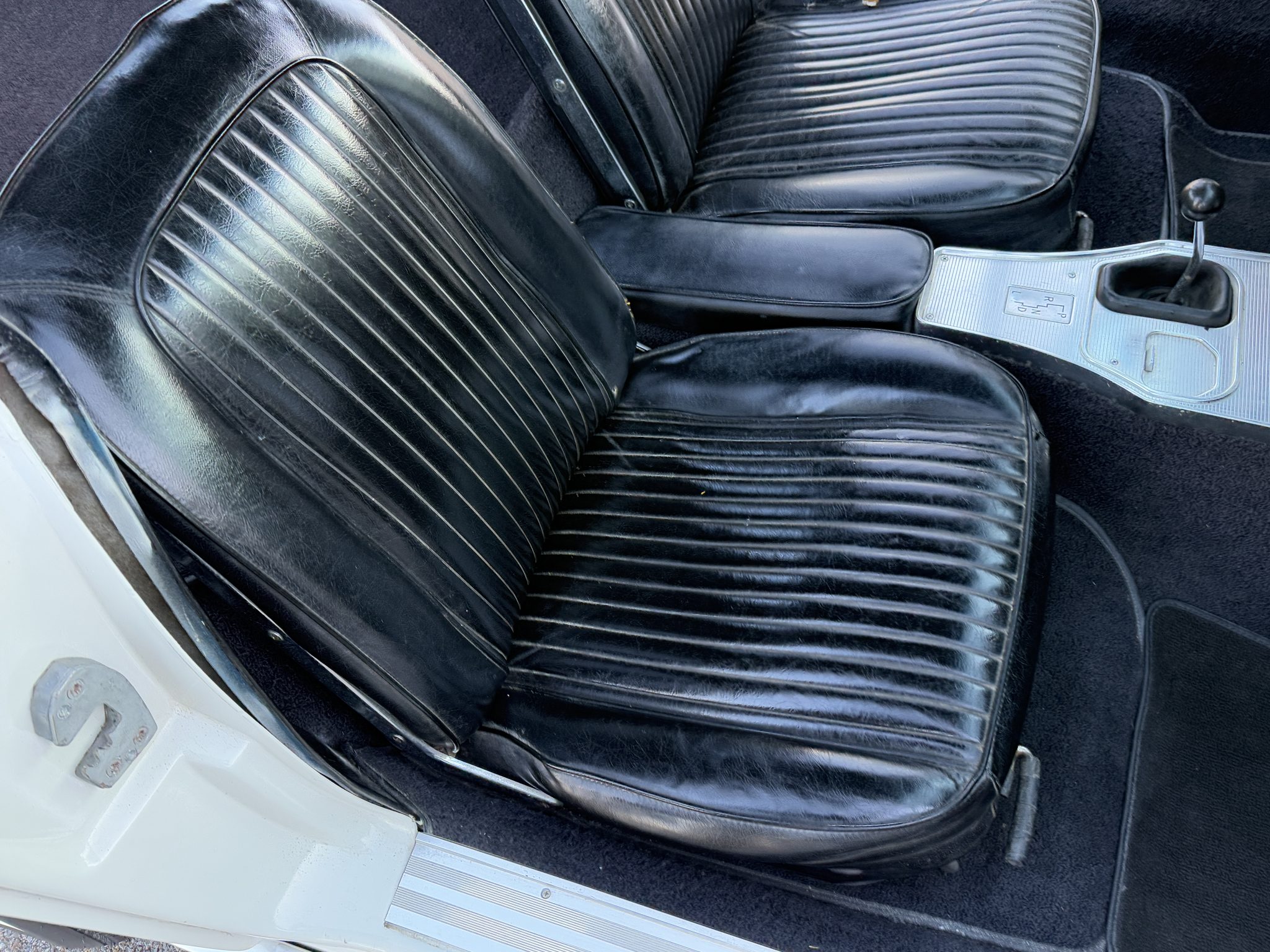 This 1963 Chevrolet Corvette split-window coupe is powered by a 327ci L75 V8 paired with a replacement three-speed automatic and is refinished in white. Features include 15″ turbine-style wheels with three-eared knock-off spinners, power steering, an AM/FM radio, and concealed headlights.