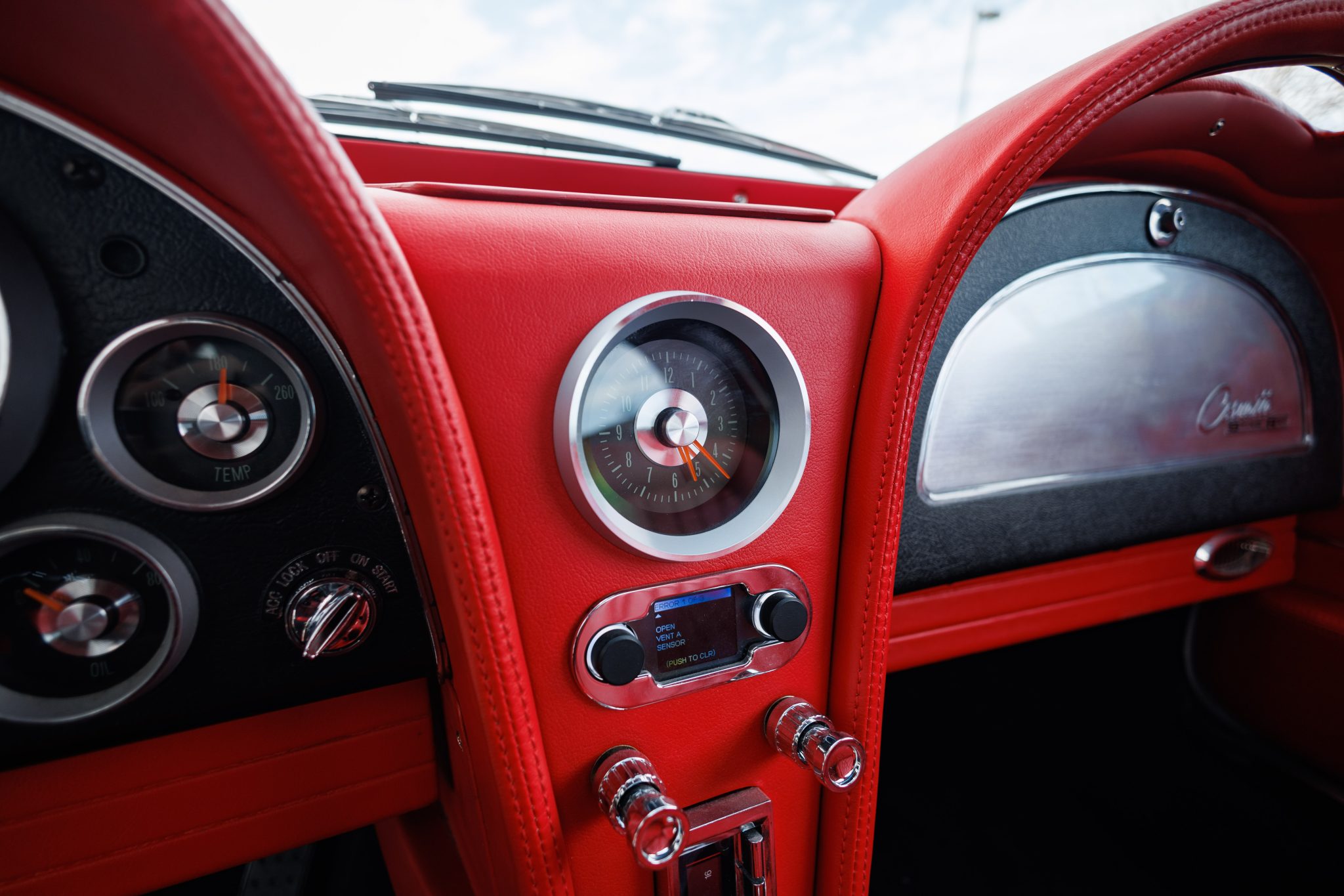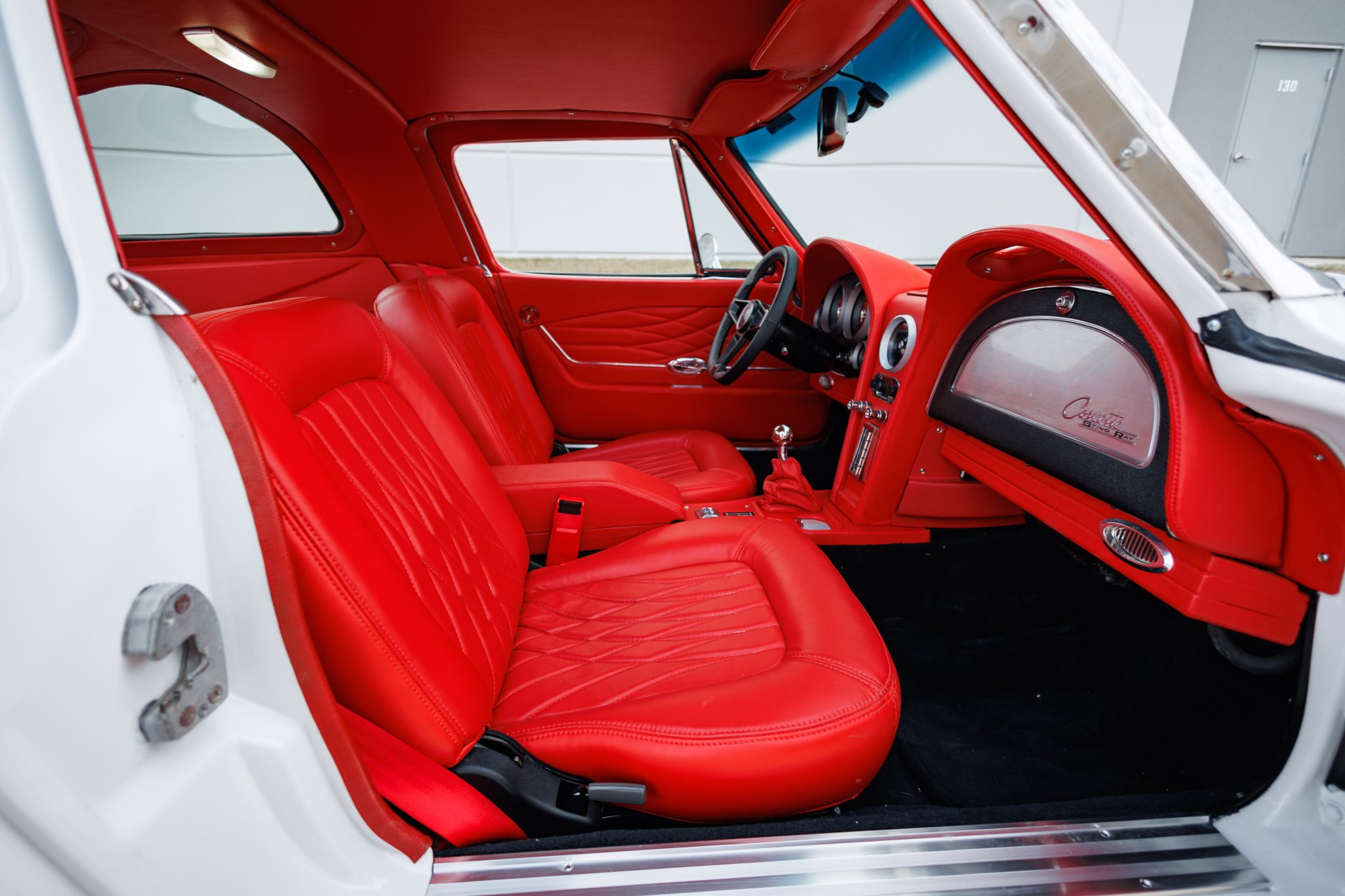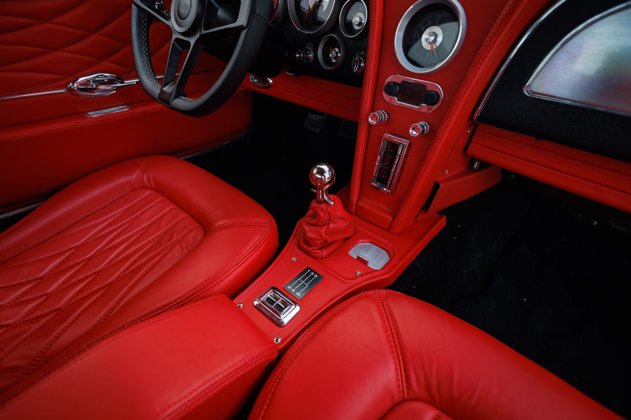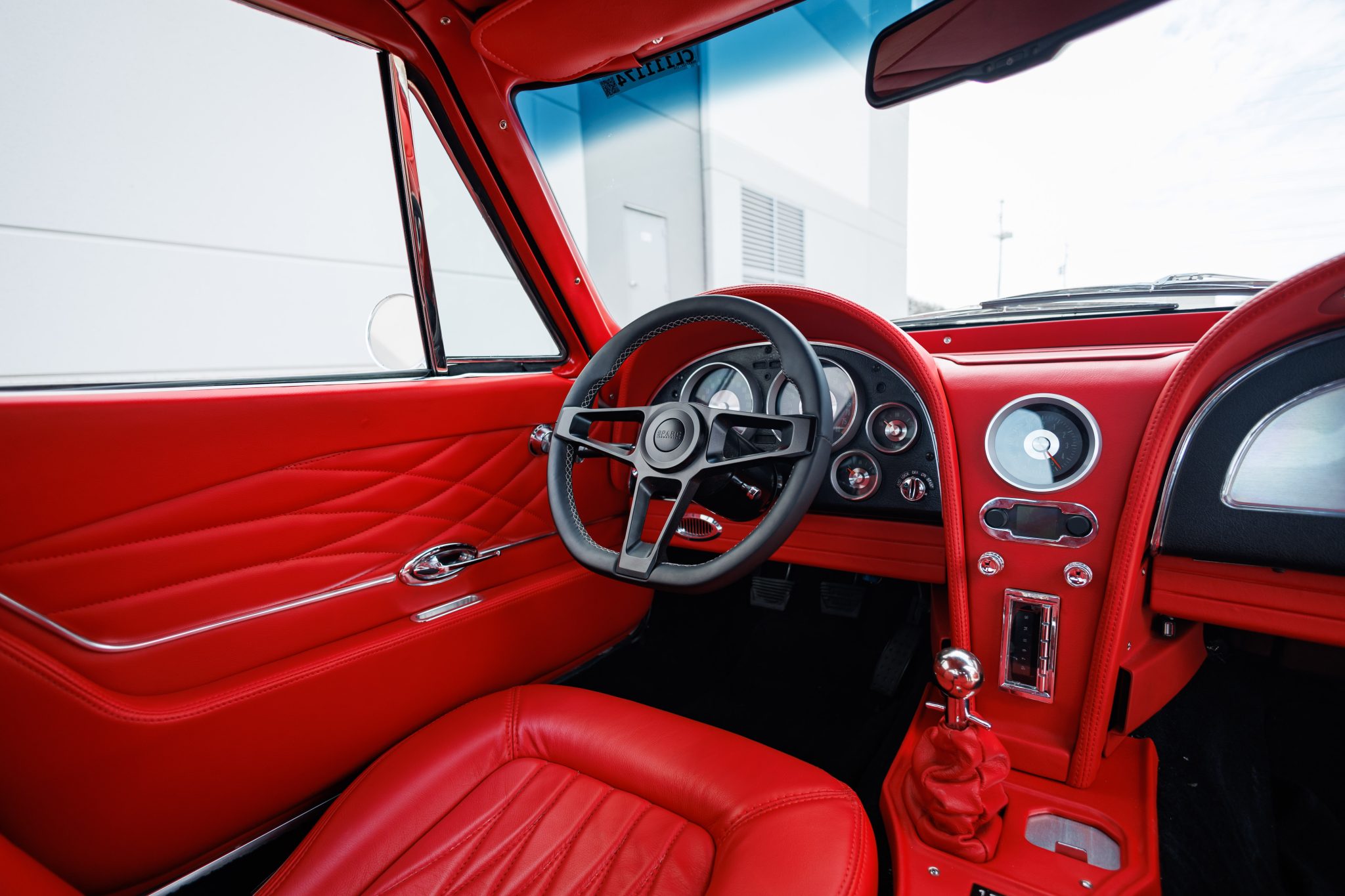 A 6.2-liter LS3 crate engine was installed along with a Tremec five-speed manual transmission, a hydraulic clutch kit, a limited-slip differential, and 19″ and 20″ CCW wheels. The interior was re-trimmed in red more recently by Introspective Design of Burleson, Texas, and fitted with a RetroSound stereo, Vintage Air climate control, and Dakota Digital gauges.