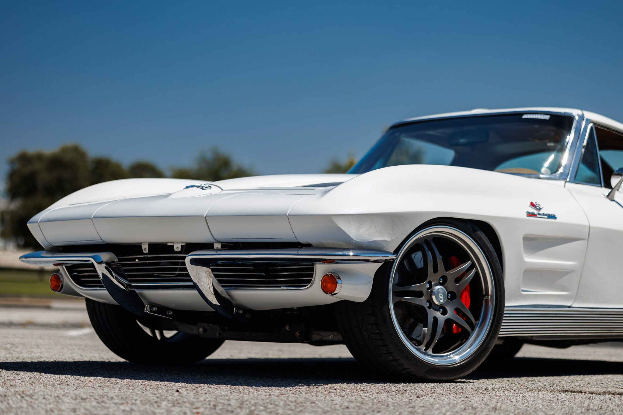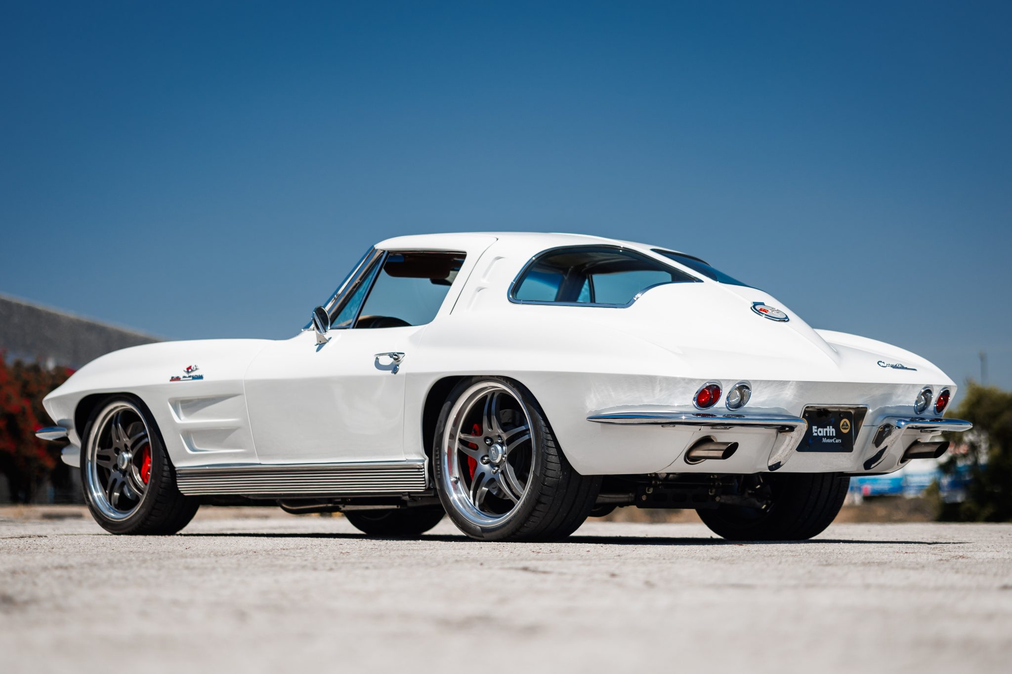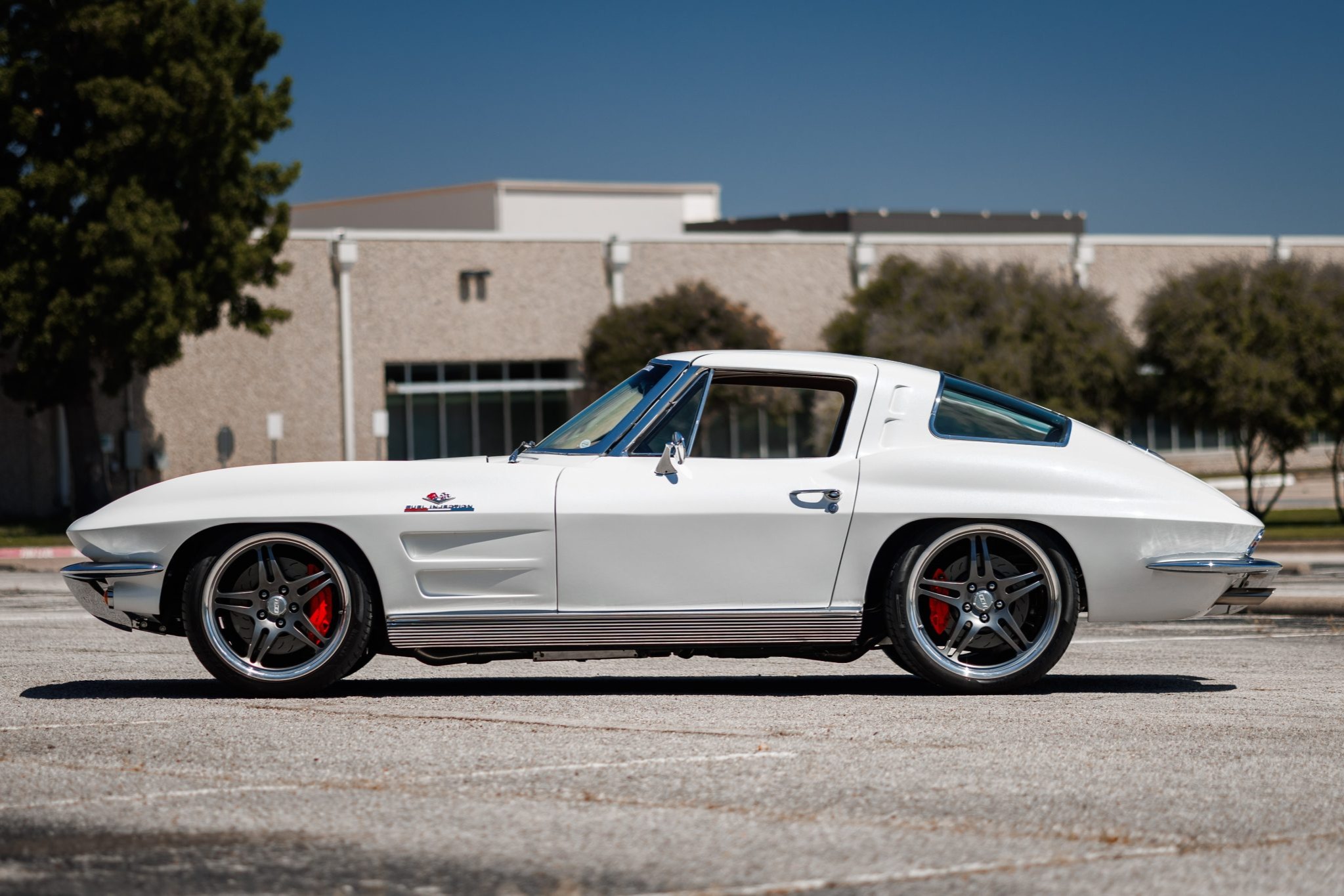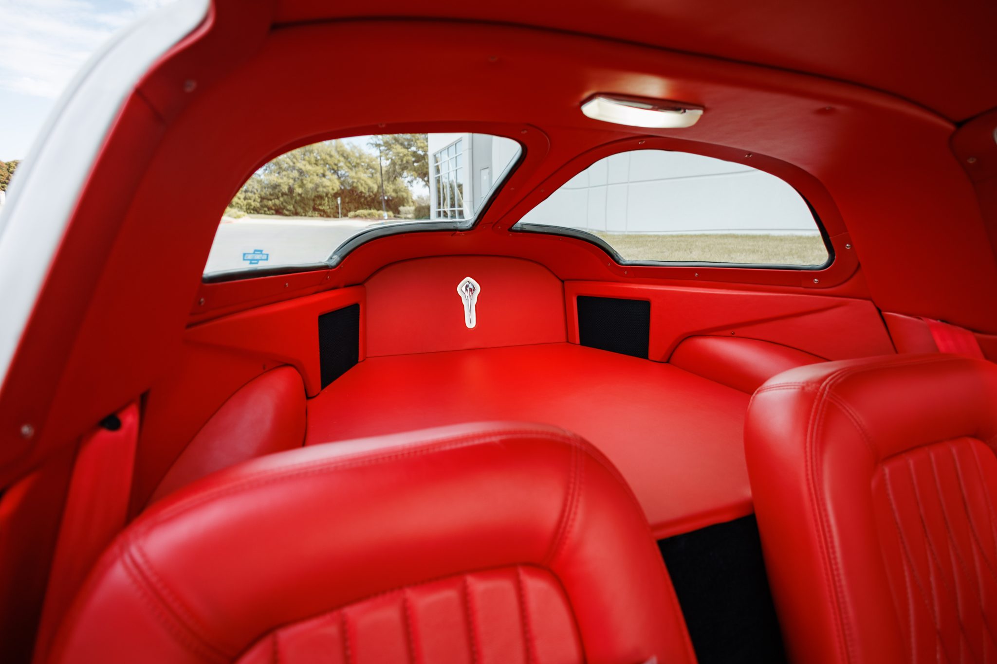 A 6.2-liter LS3 crate engine was installed along with a Tremec five-speed manual transmission, a hydraulic clutch kit, a limited-slip differential, and 19″ and 20″ CCW wheels. The interior was re-trimmed in red more recently by Introspective Design of Burleson, Texas, and fitted with a RetroSound stereo, Vintage Air climate control, and Dakota Digital gauges.