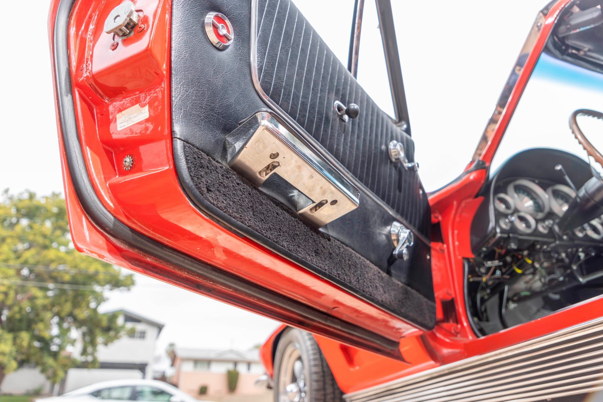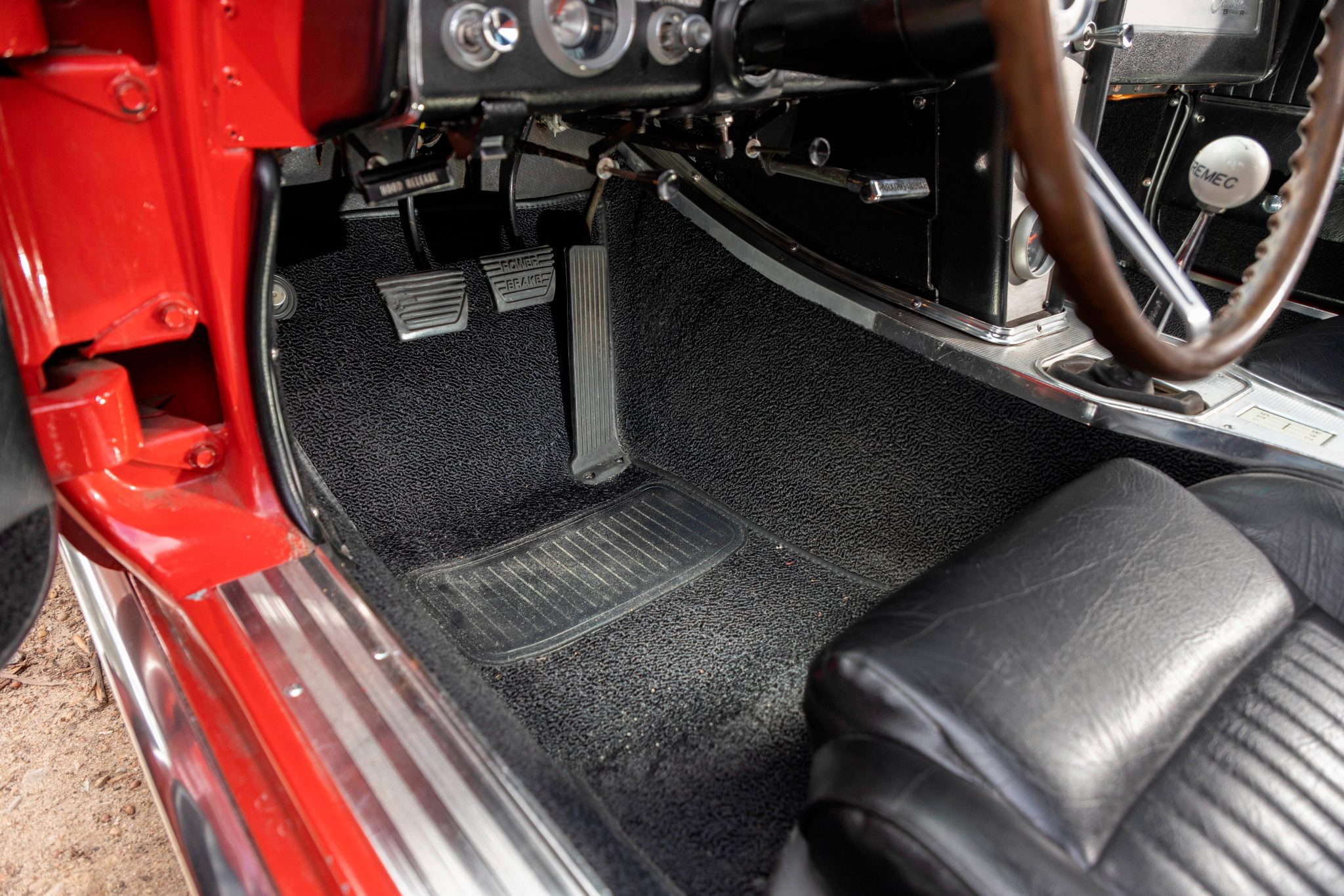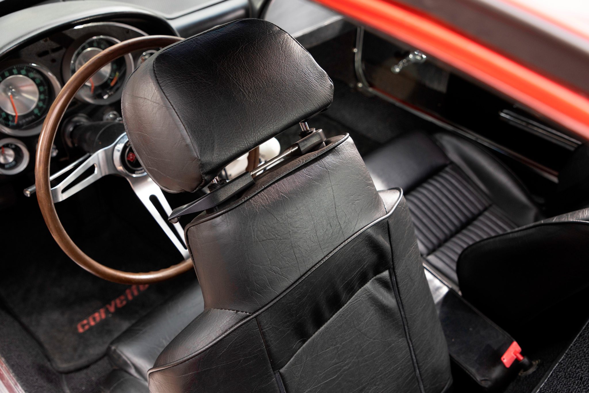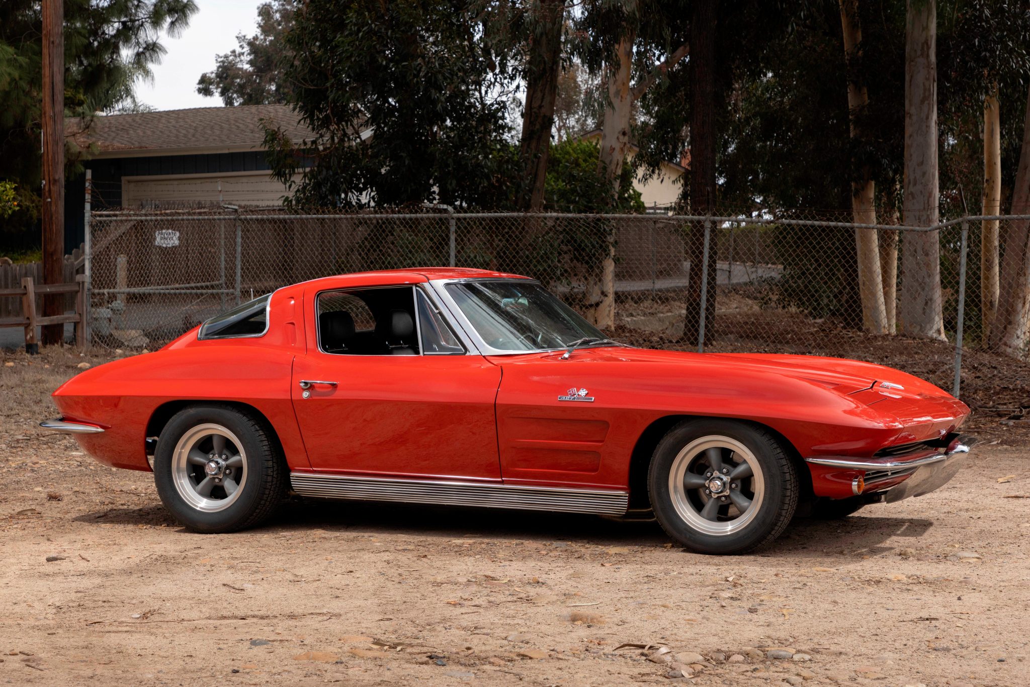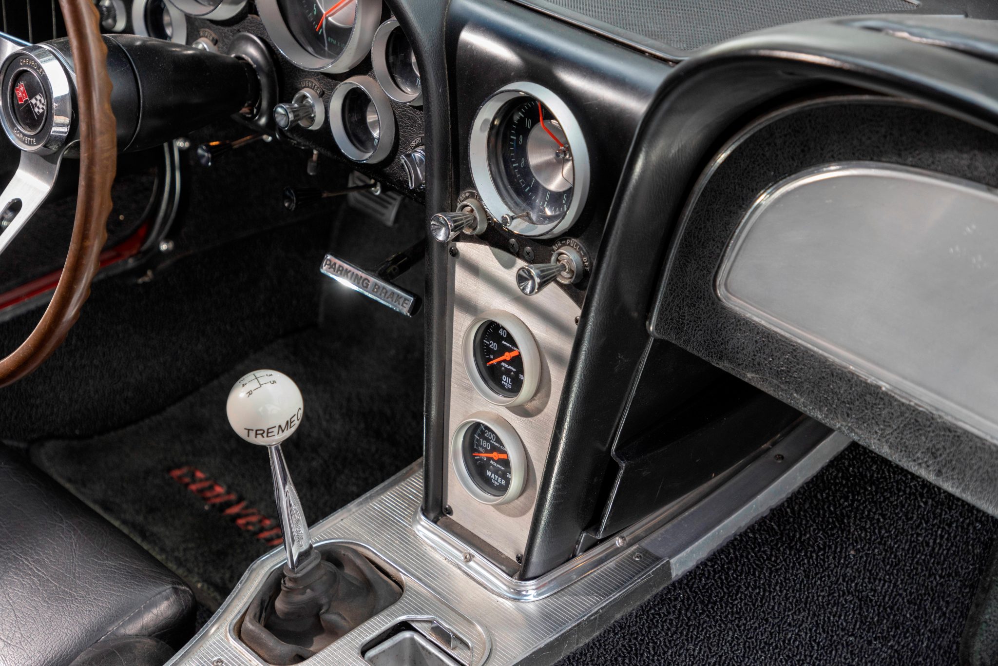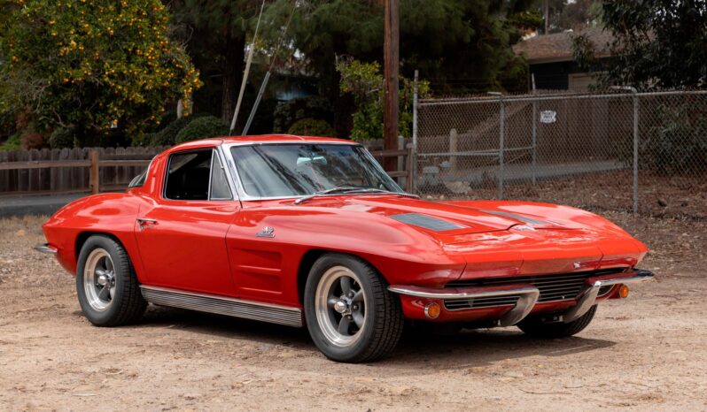 This 1963 Chevrolet Corvette split-window coupe was subsequently refurbished and fitted with a replacement 427ci stroker V8 as well as a Tremec TKO 600 five-speed manual transmission. Breathing through a Holley 800-cfm carburetor, the engine features a Dart block, a Schneider roller camshaft, a Melling oil pump, JE pistons, ARP hardware, Moroso stud girdles, an Edelbrock intake manifold, MSD ignition components, Hooker headers, and Allen’s chambered exhaust pipes. The body was repainted in red and modified with central exhaust outlets, and Honda-sourced bucket seats were installed and the battery was relocated to the cabin. Front disc brakes have been added, and other highlights include American Racing 15” wheels, Bilstein Shocks, a Flaming River steering box, and a limited-slip differential.