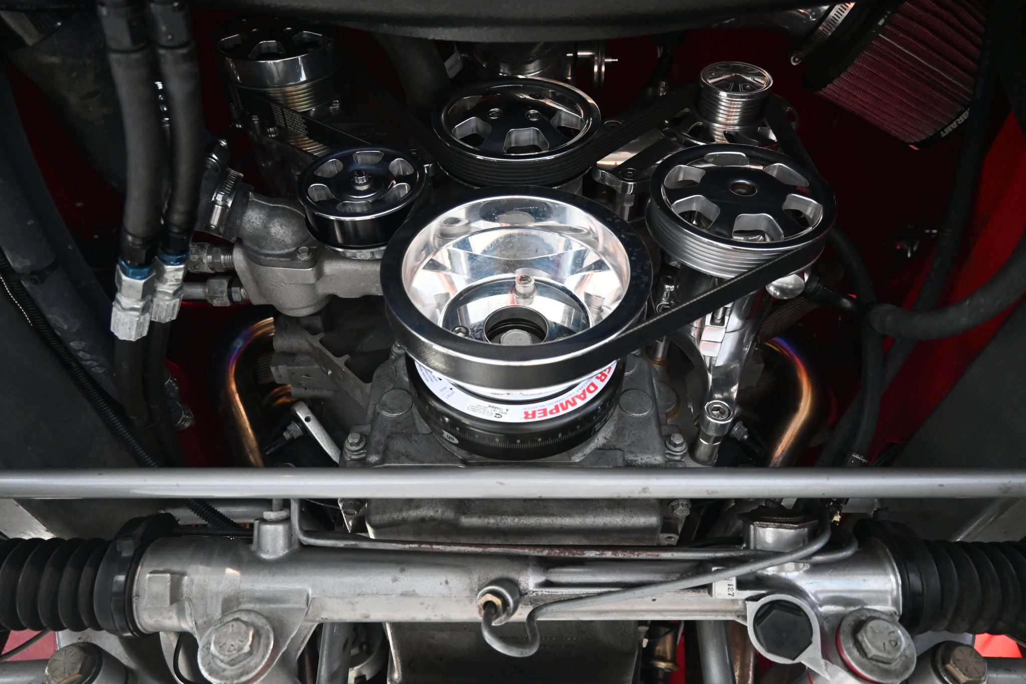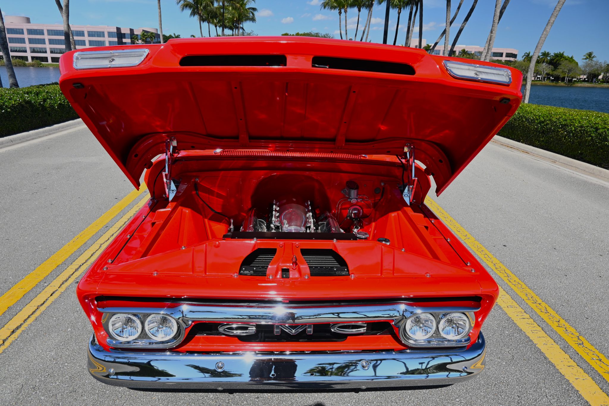 This 1963 GMC 1000 was modified at various times under prior ownership with the installation of a 5.7-liter LS V8, a four-speed 4L60E automatic transmission, and an Art Morrison chassis. Components also include a Brian Tooley Racing camshaft, a Holley intake manifold, LS7 lifters, and long-tube headers. The bodywork was refinished in red, the Wide-Side bed has a wood-lined floor, and the refreshed interior houses a bench seat trimmed in tan leather in addition to Vintage Air climate control, power windows, a Kenwood head unit, and Dakota Digital instrumentation. Further modifications include 20″ and 22″ Raceline wheels, Wilwood brakes, coilovers, power steering, and Magnaflow mufflers.