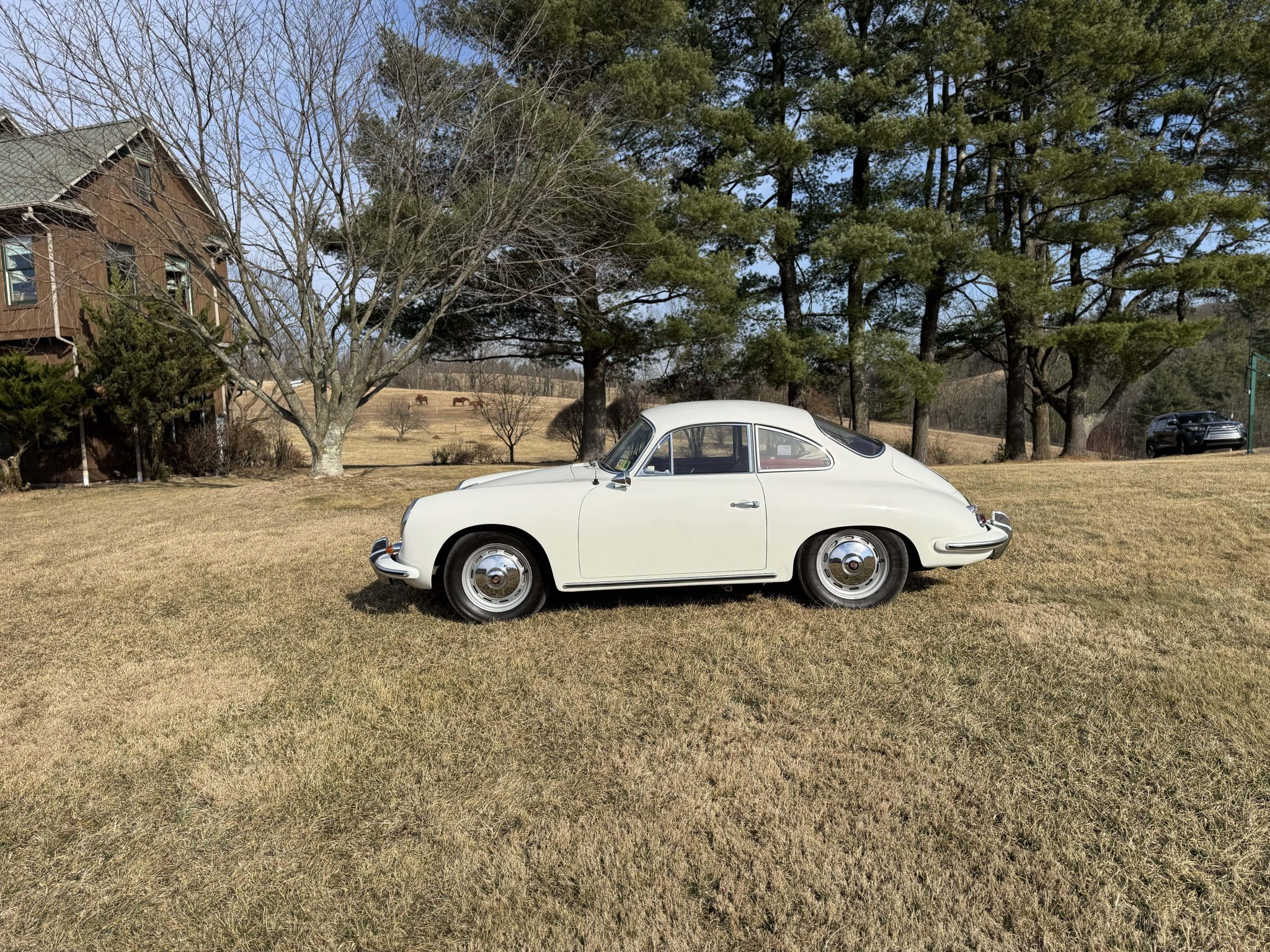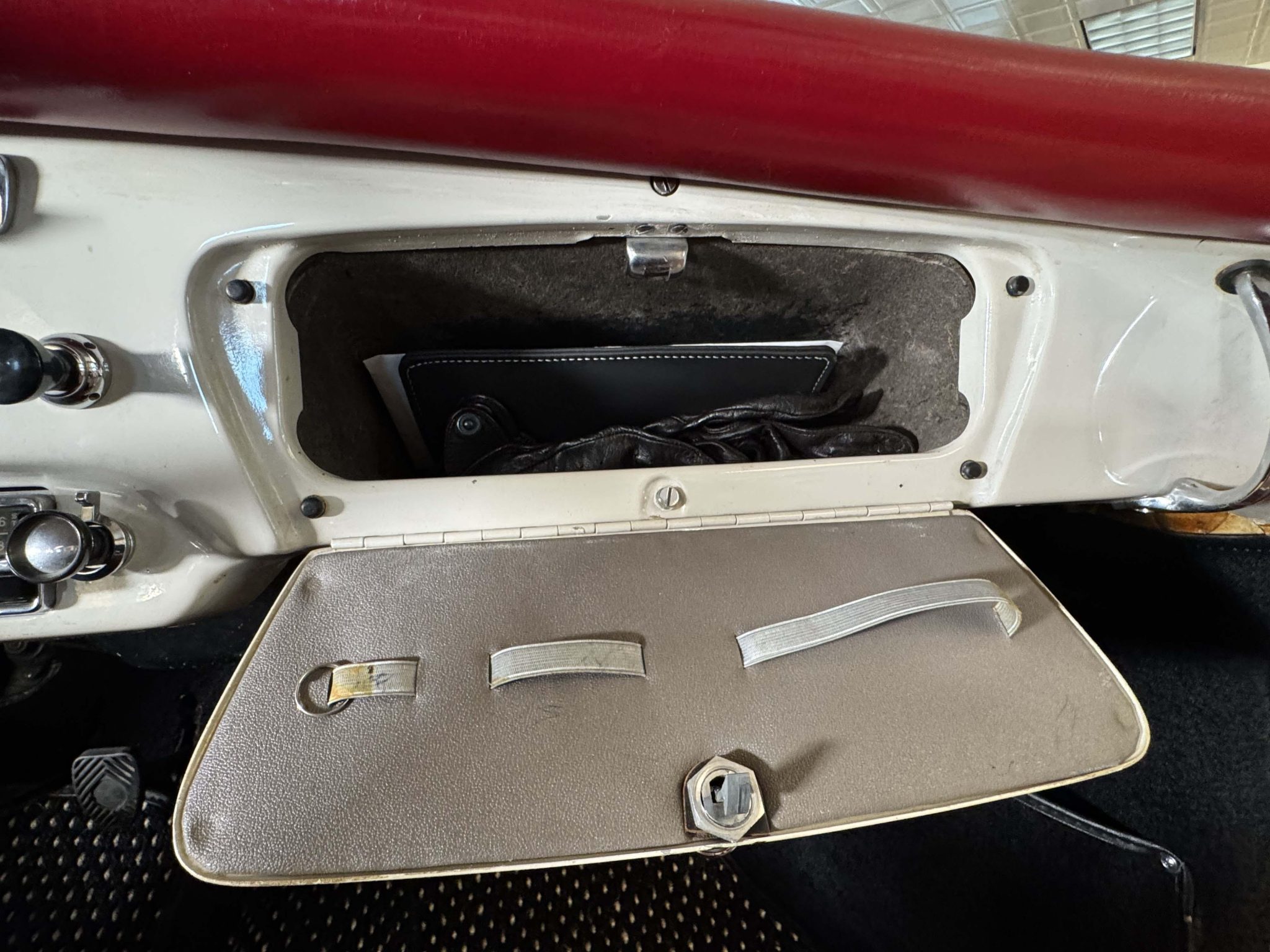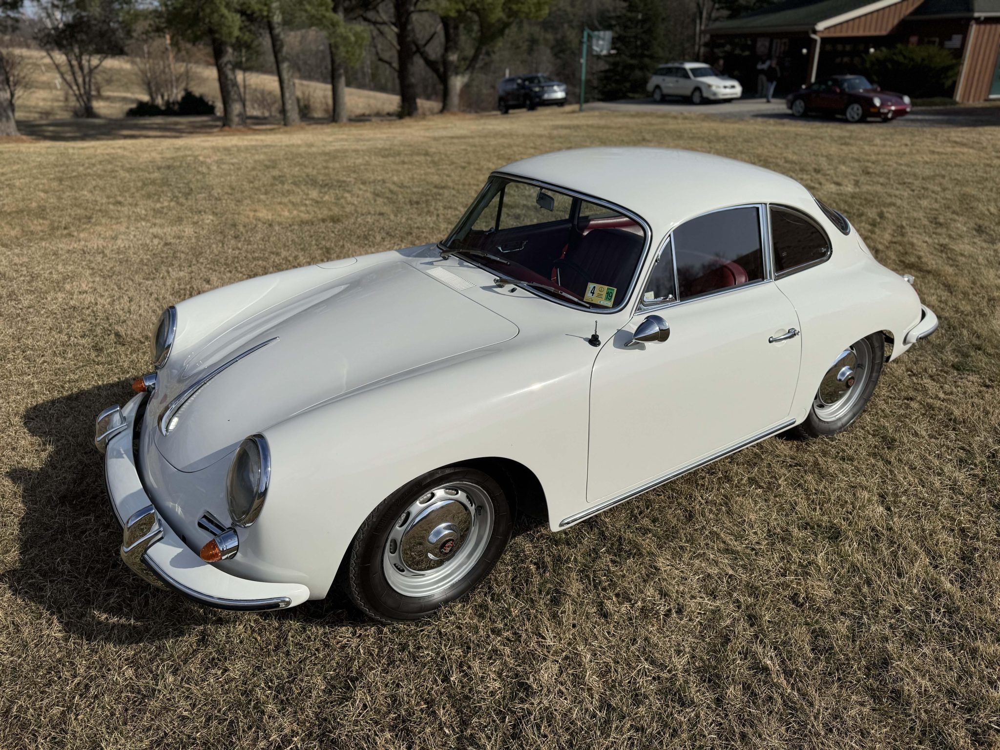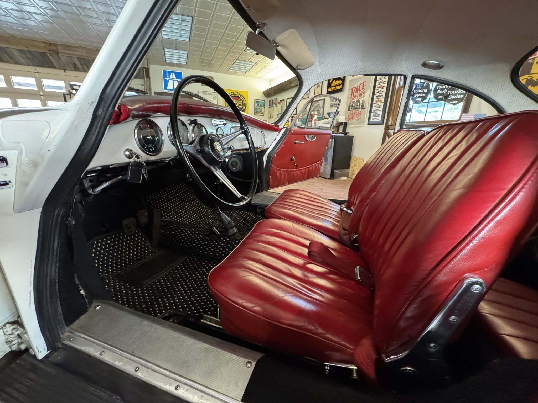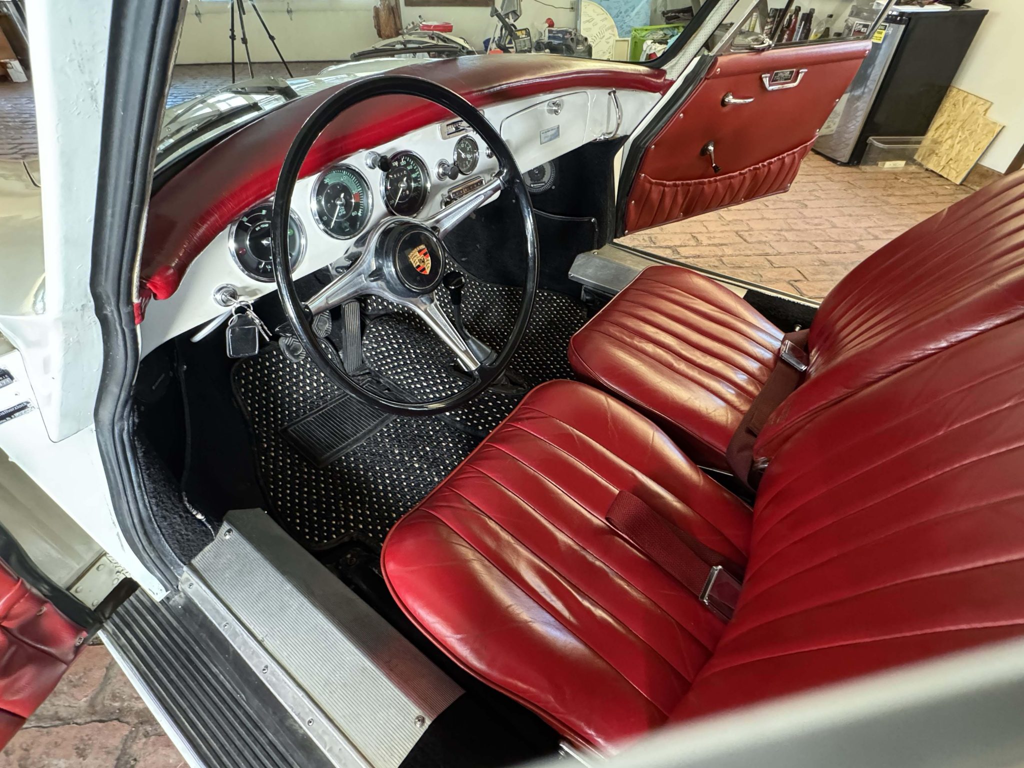 The Super flat-four has reportedly been increased in displacement to 1,800cc and is paired with a four-speed manual transaxle. It has been repainted white over red leather, and features include 15″ steel wheels, vent windows, body-color bumpers, an AM/FM radio, a cabin heater, and front bucket seats.