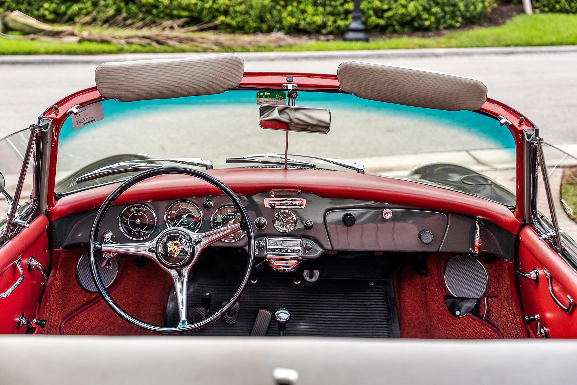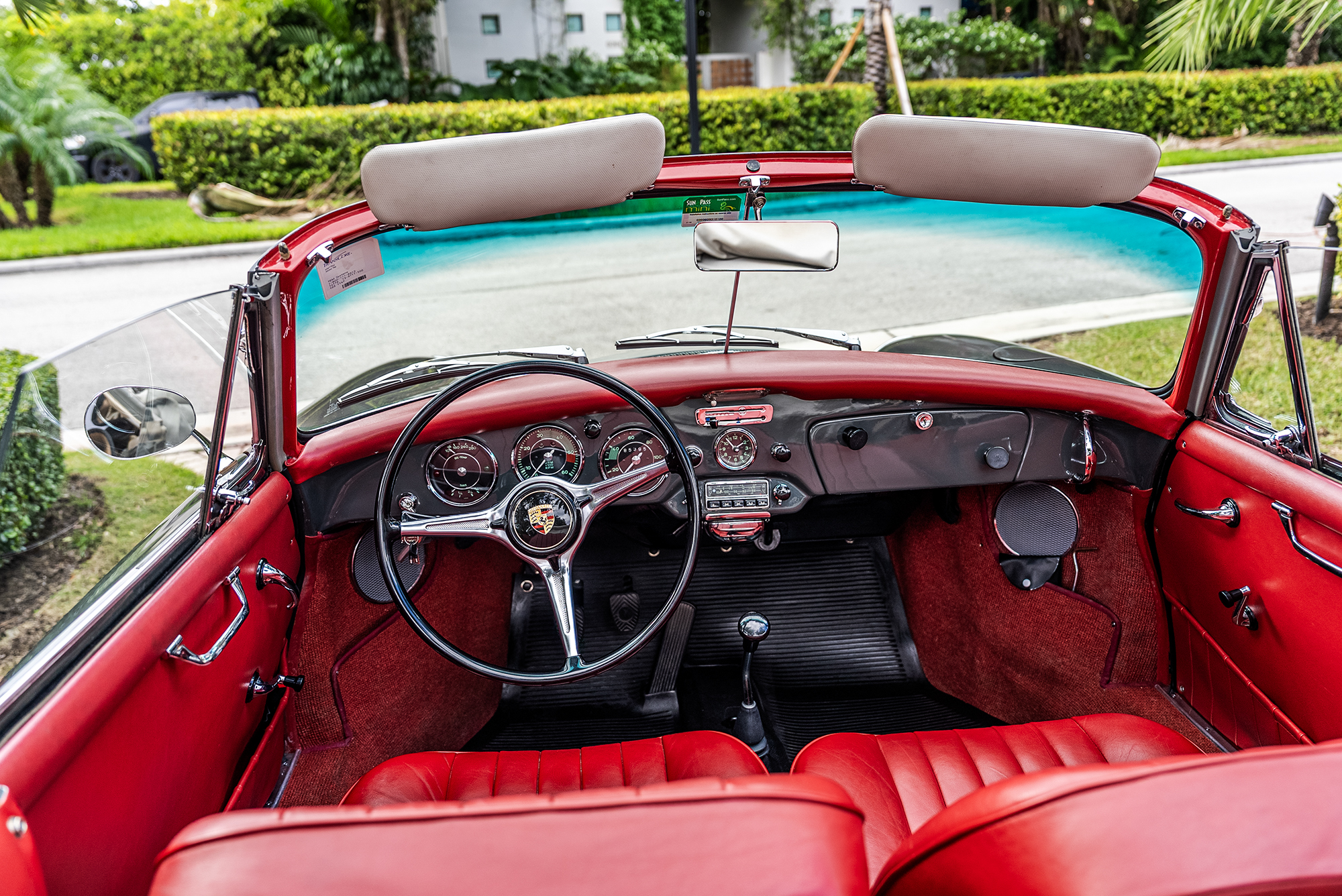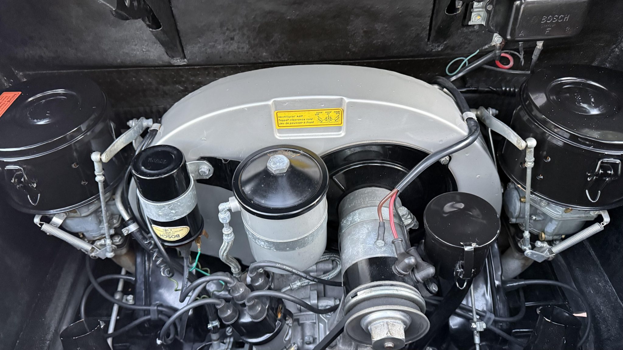 It is finished in Slate Gray over red leather and is powered by a 1.6-liter flat-four paired with a four-speed manual transaxle. Features include a black soft top, 15″ steel wheels, a driver-side mirror, vent windows, body-color bumpers, a Blaupunkt AM/FM radio with Bluetooth, a cabin heater, and front bucket seats.