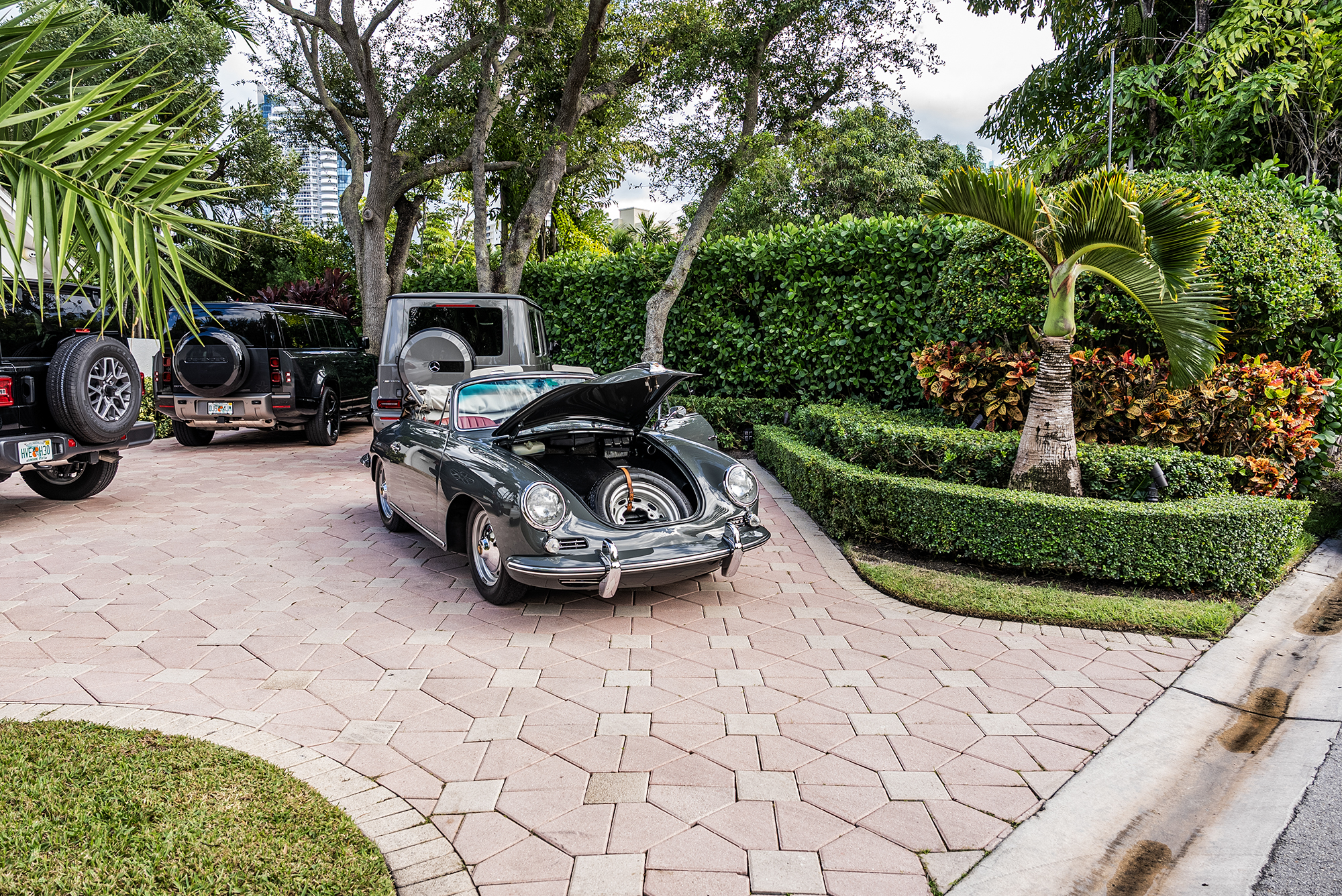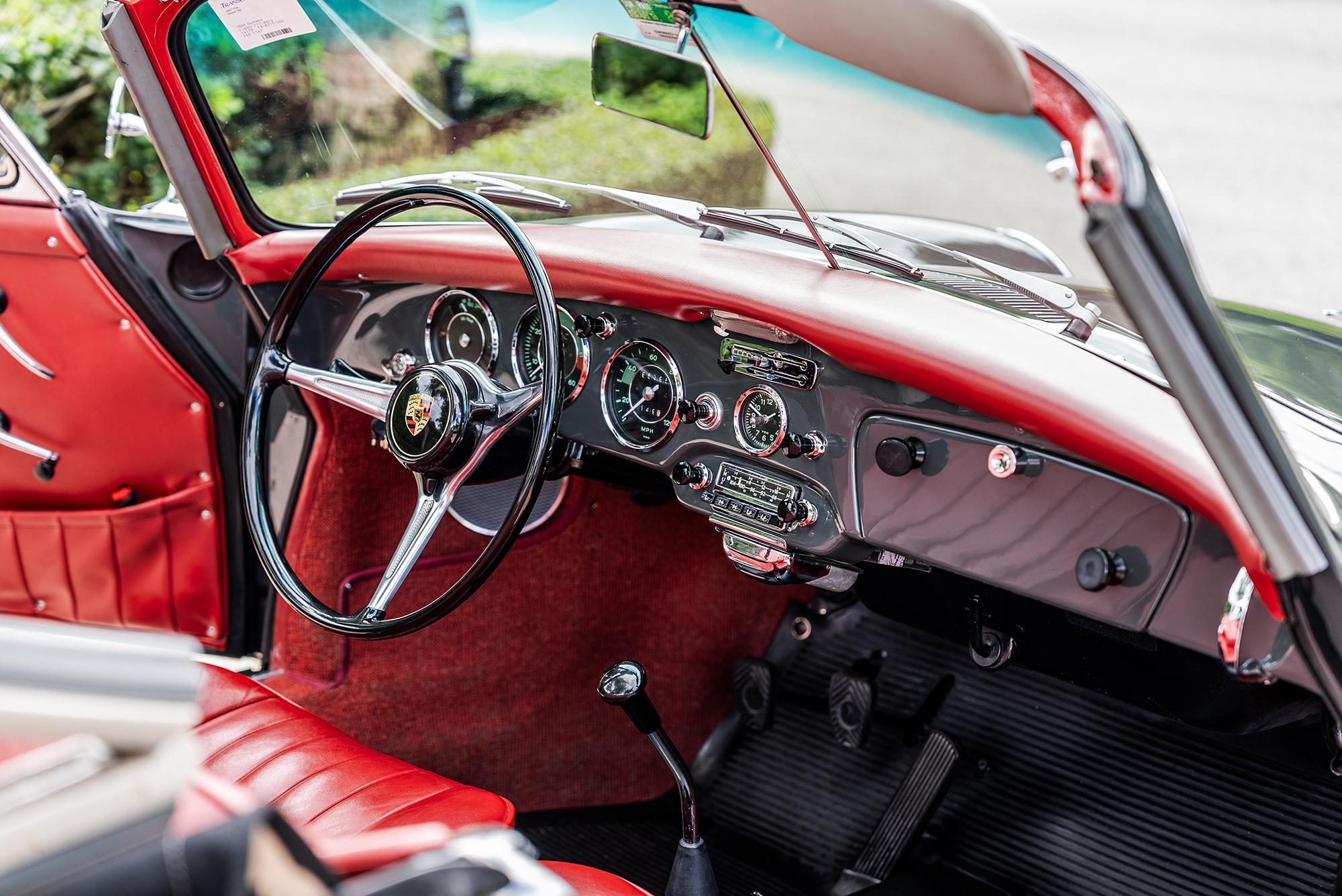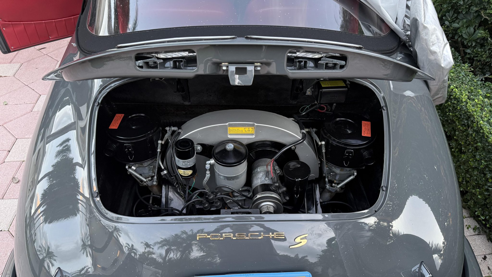 It is finished in Slate Gray over red leather and is powered by a 1.6-liter flat-four paired with a four-speed manual transaxle. Features include a black soft top, 15″ steel wheels, a driver-side mirror, vent windows, body-color bumpers, a Blaupunkt AM/FM radio with Bluetooth, a cabin heater, and front bucket seats.