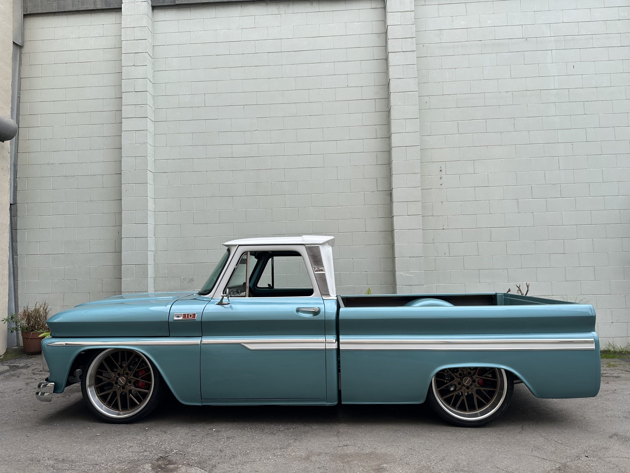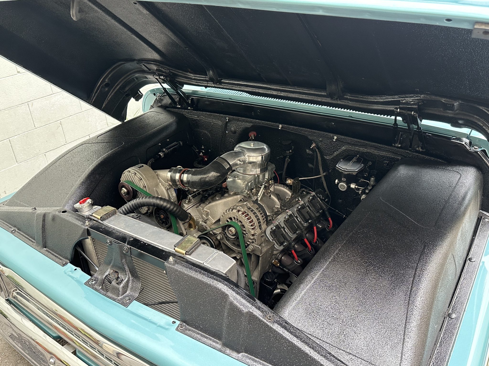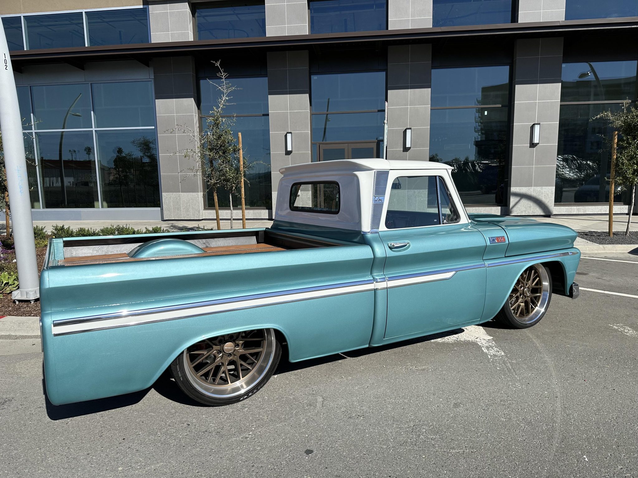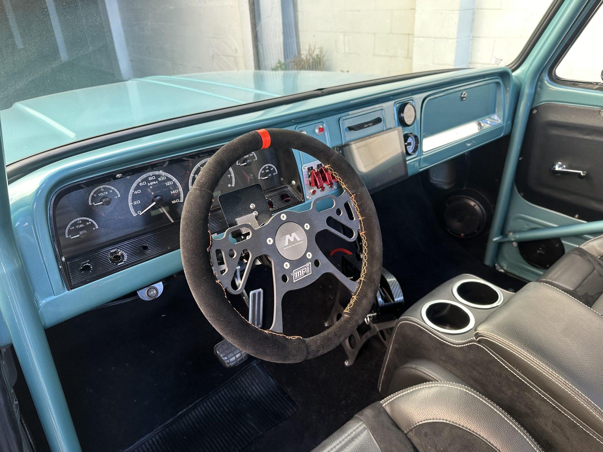 has since been modified with a No Limit Engineering chassis with Wilwood disc brakes, RideTech adjustable coilovers, and power-assisted steering, along with a supercharged 5.3L Vortec V8 with a blow-through carburetor and a built TH400 three-speed automatic transmission. The body is finished in teal with a white roof and features tubbed rear wheel wells, a modified rear roll valance, and a raised wood bed floor. The interior houses a roll cage with door bars as well as TMI bucket seats with harnesses, a Lokar shifter, a push-button starter, and Dakota Digital gauges. Additional equipment includes LED headlights, 22″ Corsart wheels, a nitrous oxide system, and 4.11:1 rear gearing.