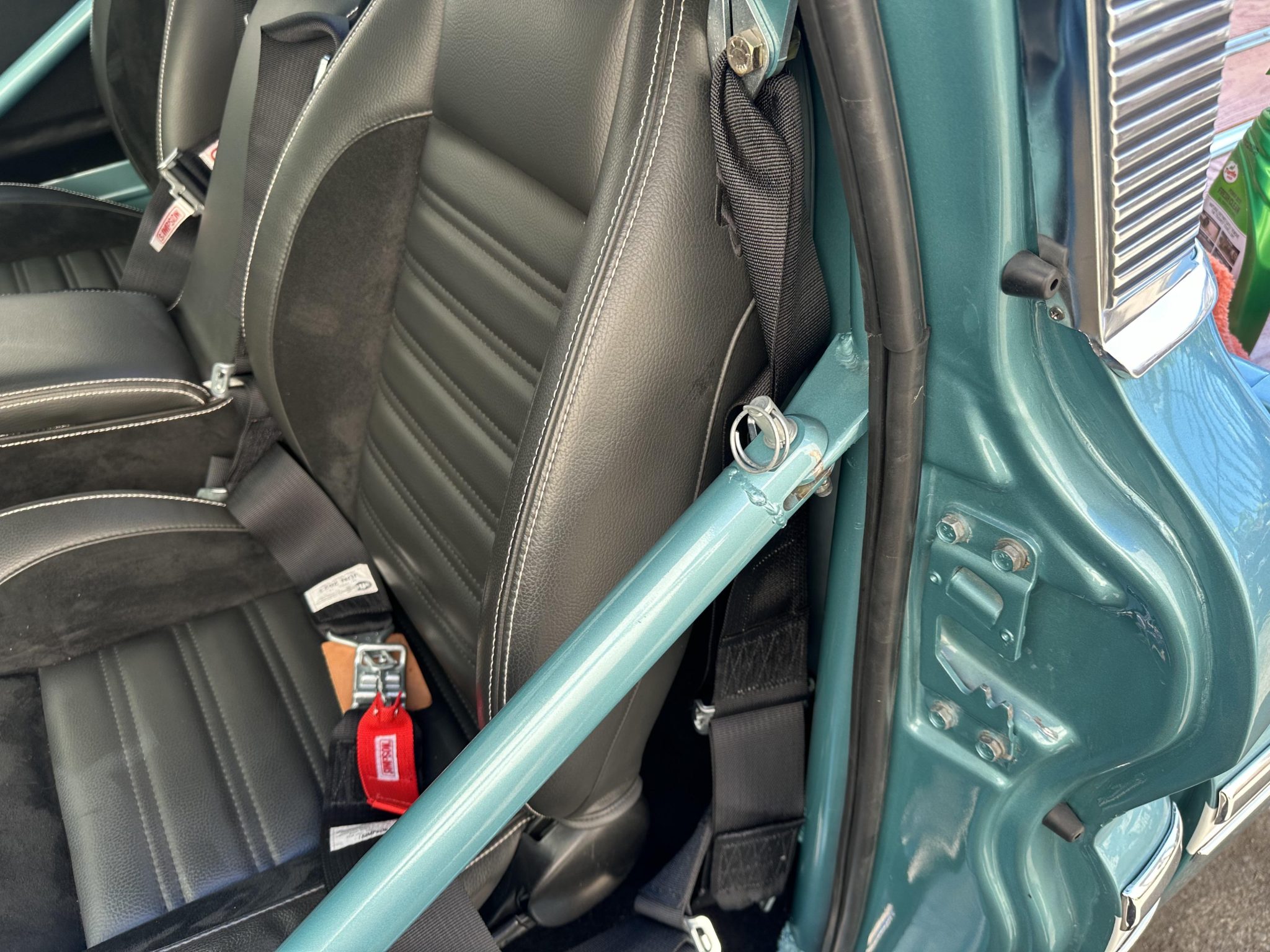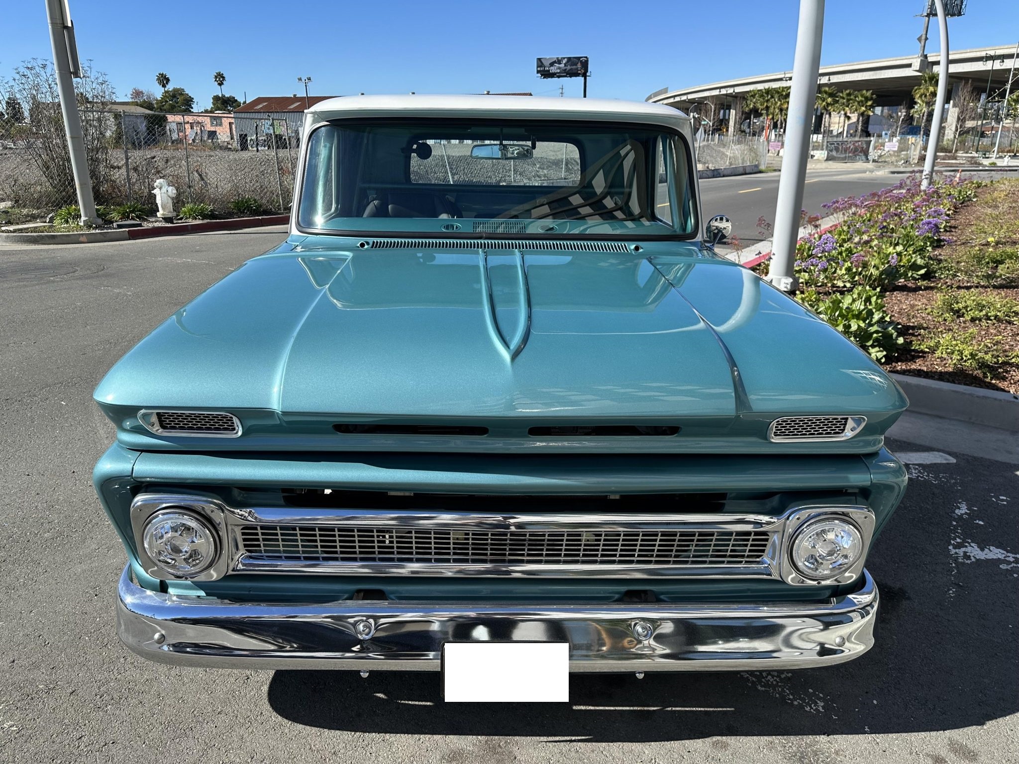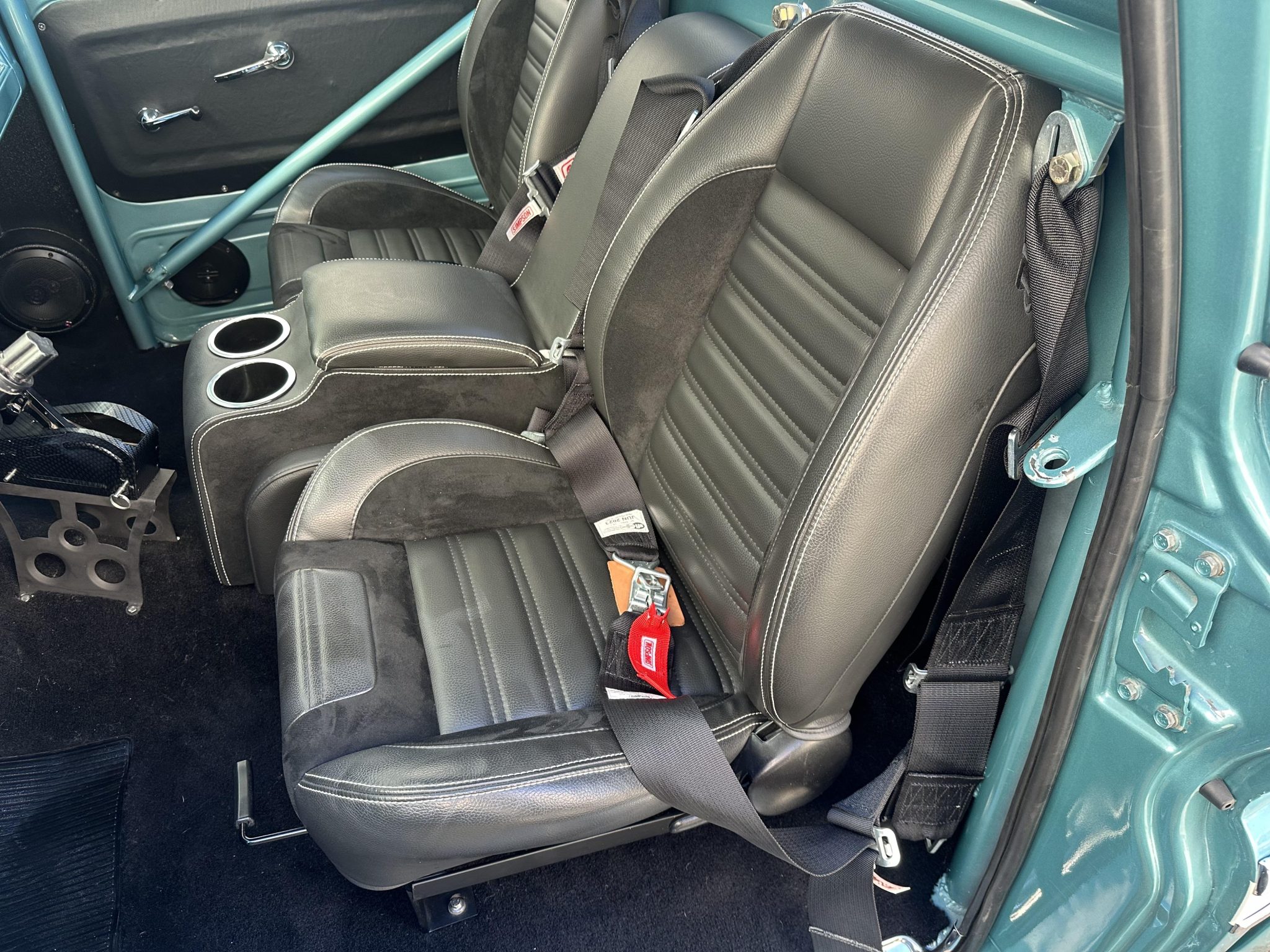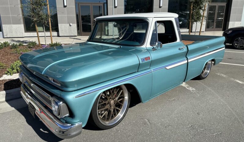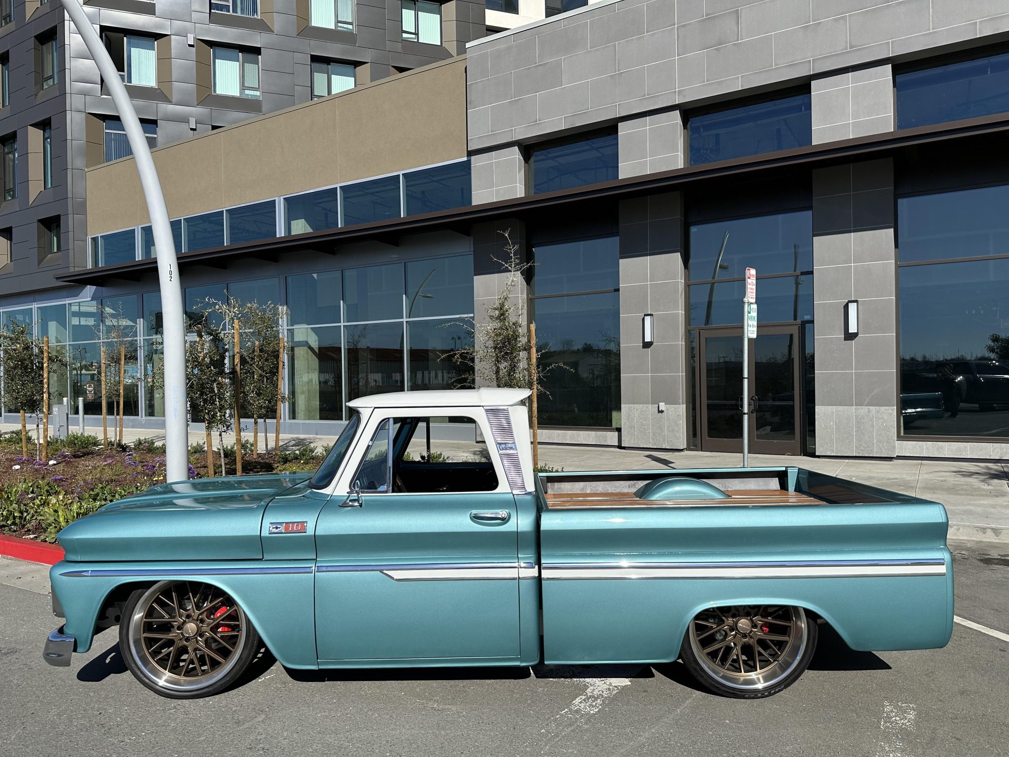 has since been modified with a No Limit Engineering chassis with Wilwood disc brakes, RideTech adjustable coilovers, and power-assisted steering, along with a supercharged 5.3L Vortec V8 with a blow-through carburetor and a built TH400 three-speed automatic transmission. The body is finished in teal with a white roof and features tubbed rear wheel wells, a modified rear roll valance, and a raised wood bed floor. The interior houses a roll cage with door bars as well as TMI bucket seats with harnesses, a Lokar shifter, a push-button starter, and Dakota Digital gauges. Additional equipment includes LED headlights, 22″ Corsart wheels, a nitrous oxide system, and 4.11:1 rear gearing.