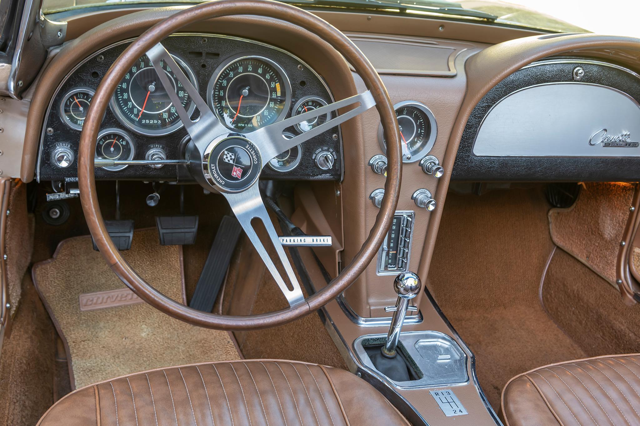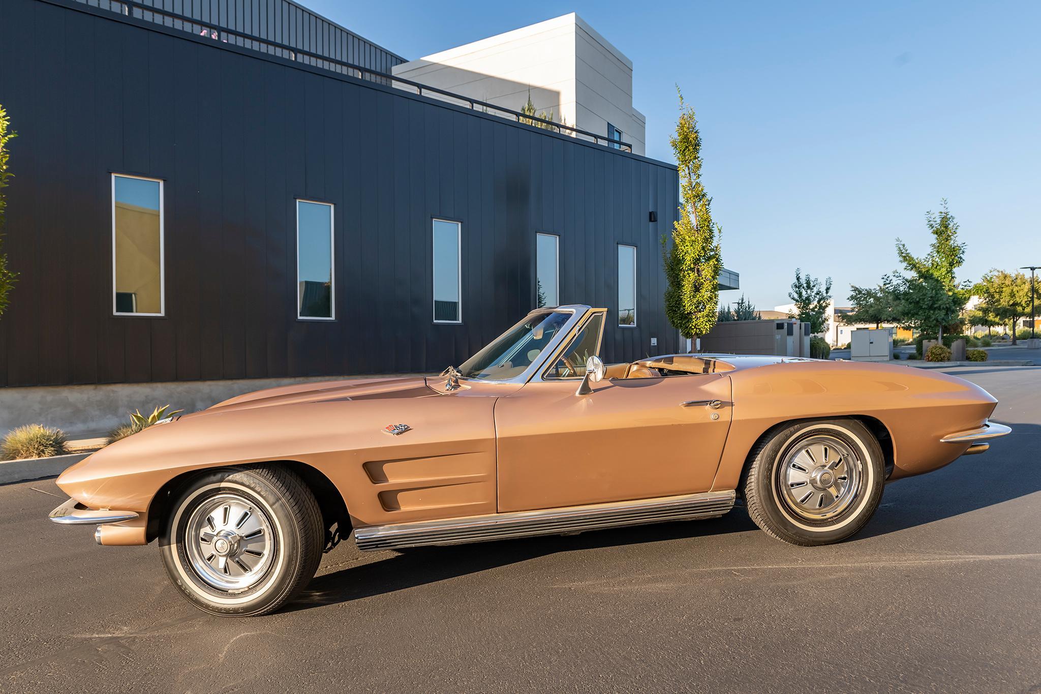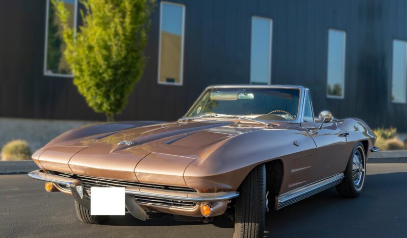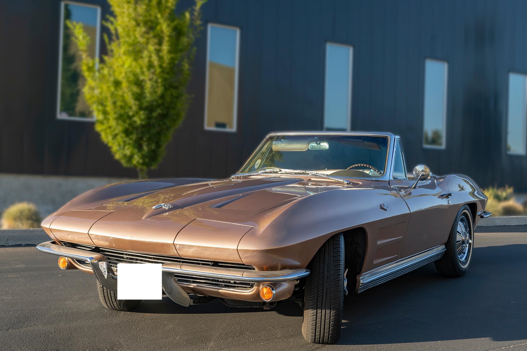 This 1964 Chevrolet Corvette convertible is powered by a 327ci V8 paired with a four-speed manual transmission and is finished in tan over saddle vinyl upholstery. Equipment includes a beige convertible soft top, 15″ steel wheels, an AM/FM radio, and concealed headlights.