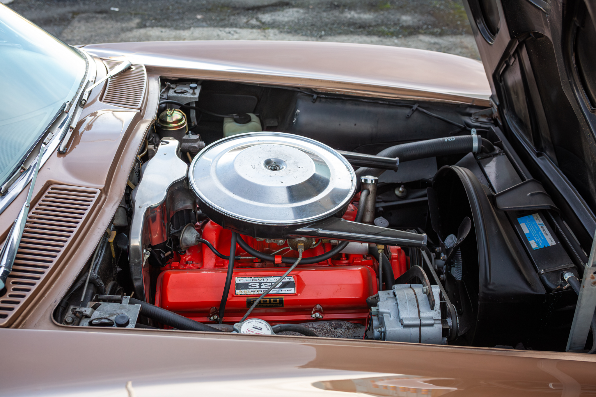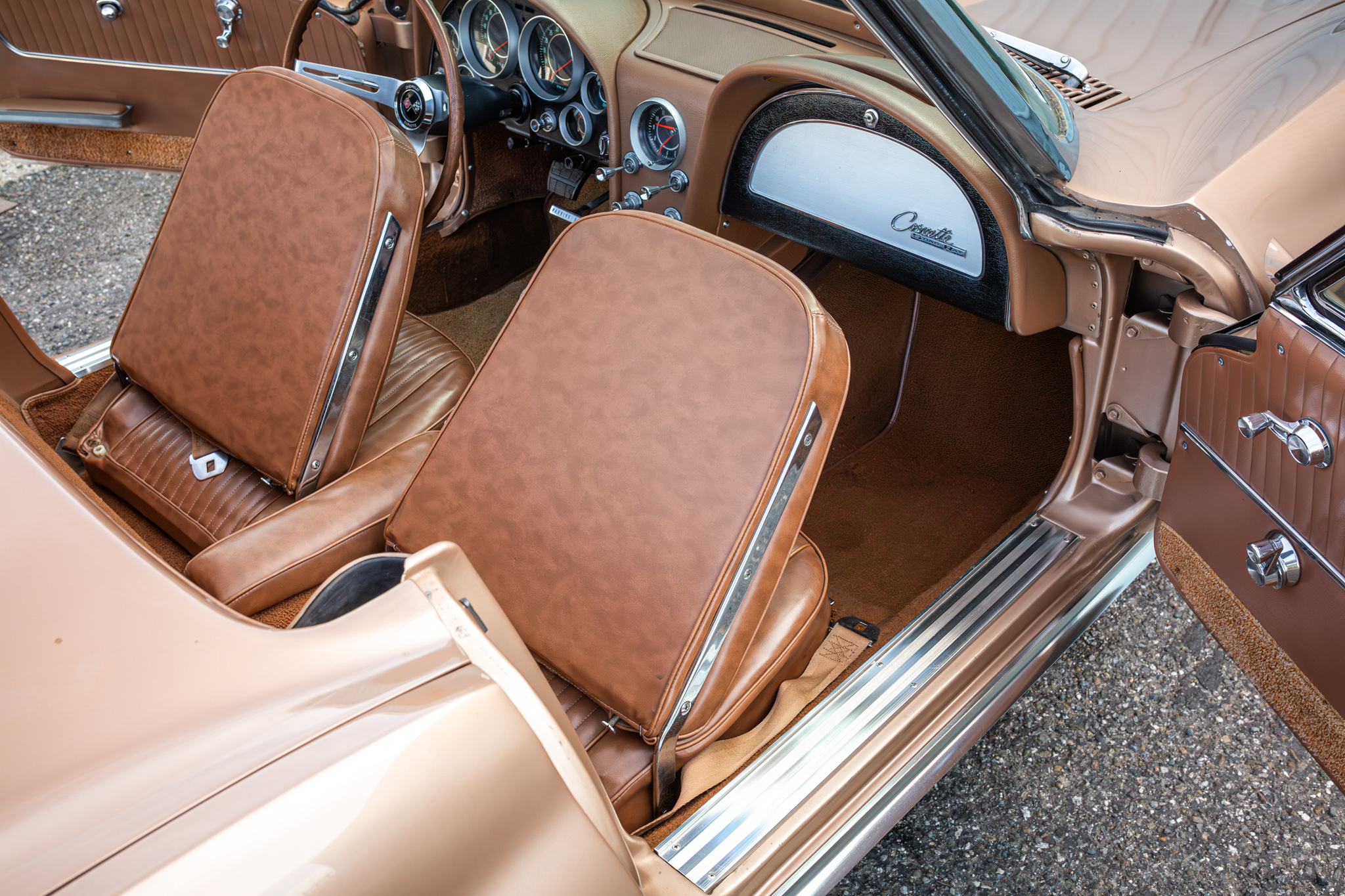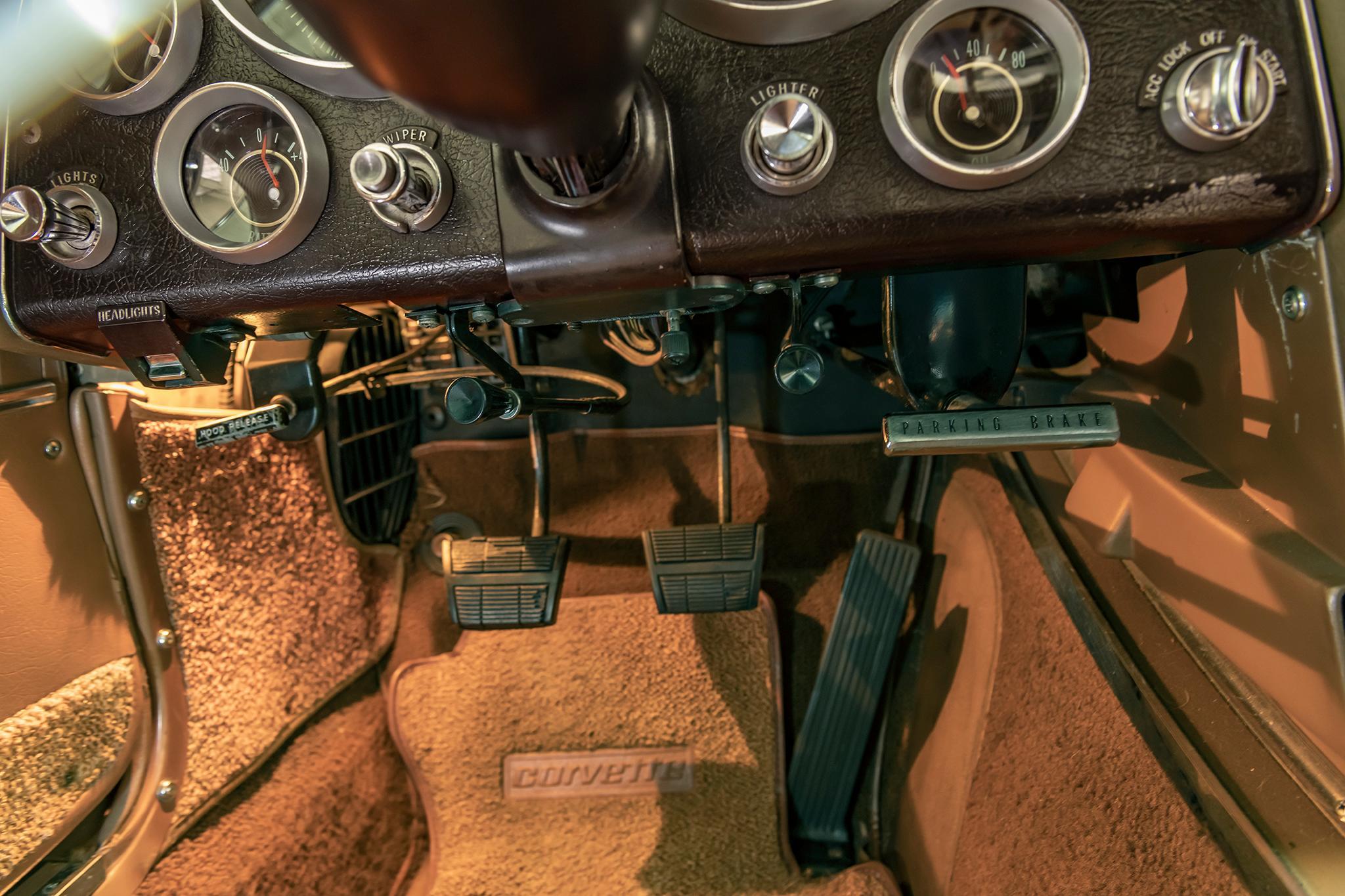 This 1964 Chevrolet Corvette convertible is powered by a 327ci V8 paired with a four-speed manual transmission and is finished in tan over saddle vinyl upholstery. Equipment includes a beige convertible soft top, 15″ steel wheels, an AM/FM radio, and concealed headlights.
