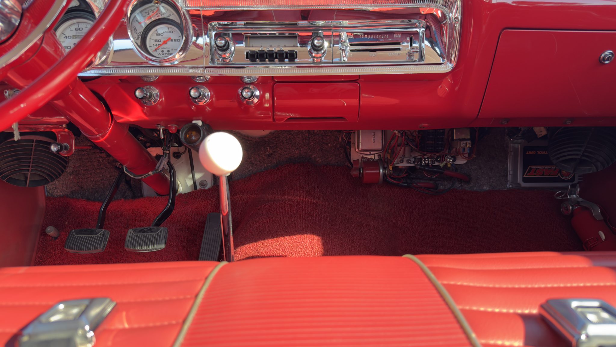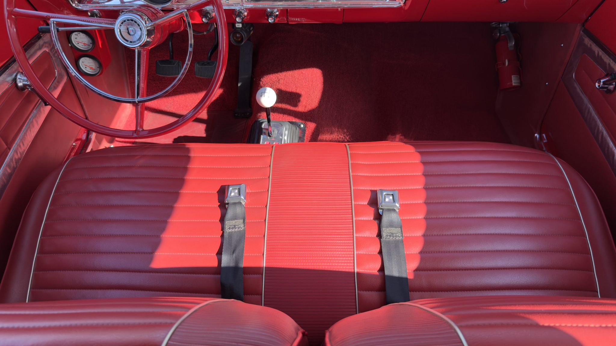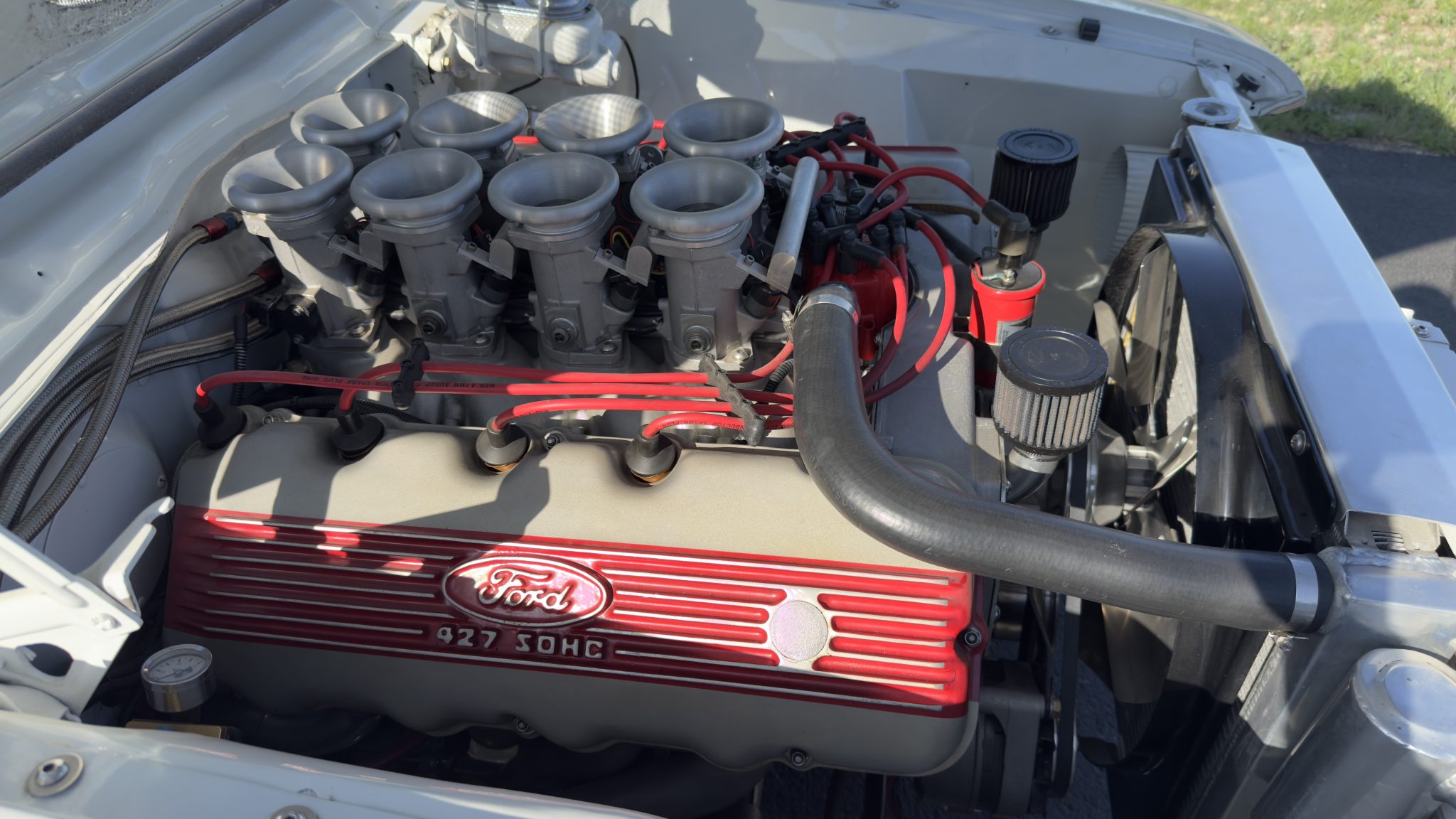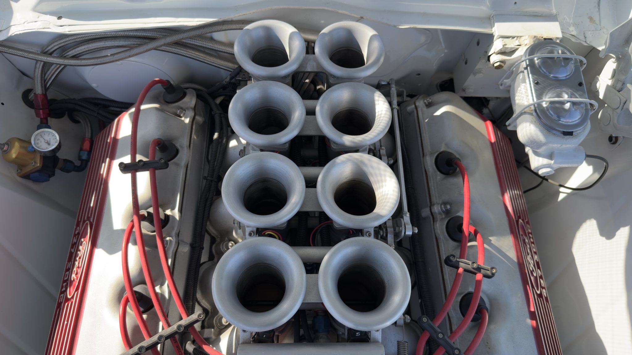 This 1964 Ford Fairlane 500 hardtop is powered by an aluminum 498ci “Cammer” V8 that utilizes a forged rotating assembly and an eight-stack throttle body setup. which results in a reported output of approximately 700 horsepower. Power is routed to the 31×16.5″ Mickey Thompson ET Streets through a David Kee Toploader four-speed transmission and a high-performance 9″ rear end, and the car rides on a modified chassis with a Mustang II-style front suspension, adjustable coilovers, and rear ladder bars. The exterior was refinished in white following the current owner’s 2011 acquisition, and details consist of a Thunderbolt-style hood and red bodyside accents. Inside, the red vinyl bench seats are joined by a push-button radio, AutoMeter instrumentation, and a Hurst shifter.