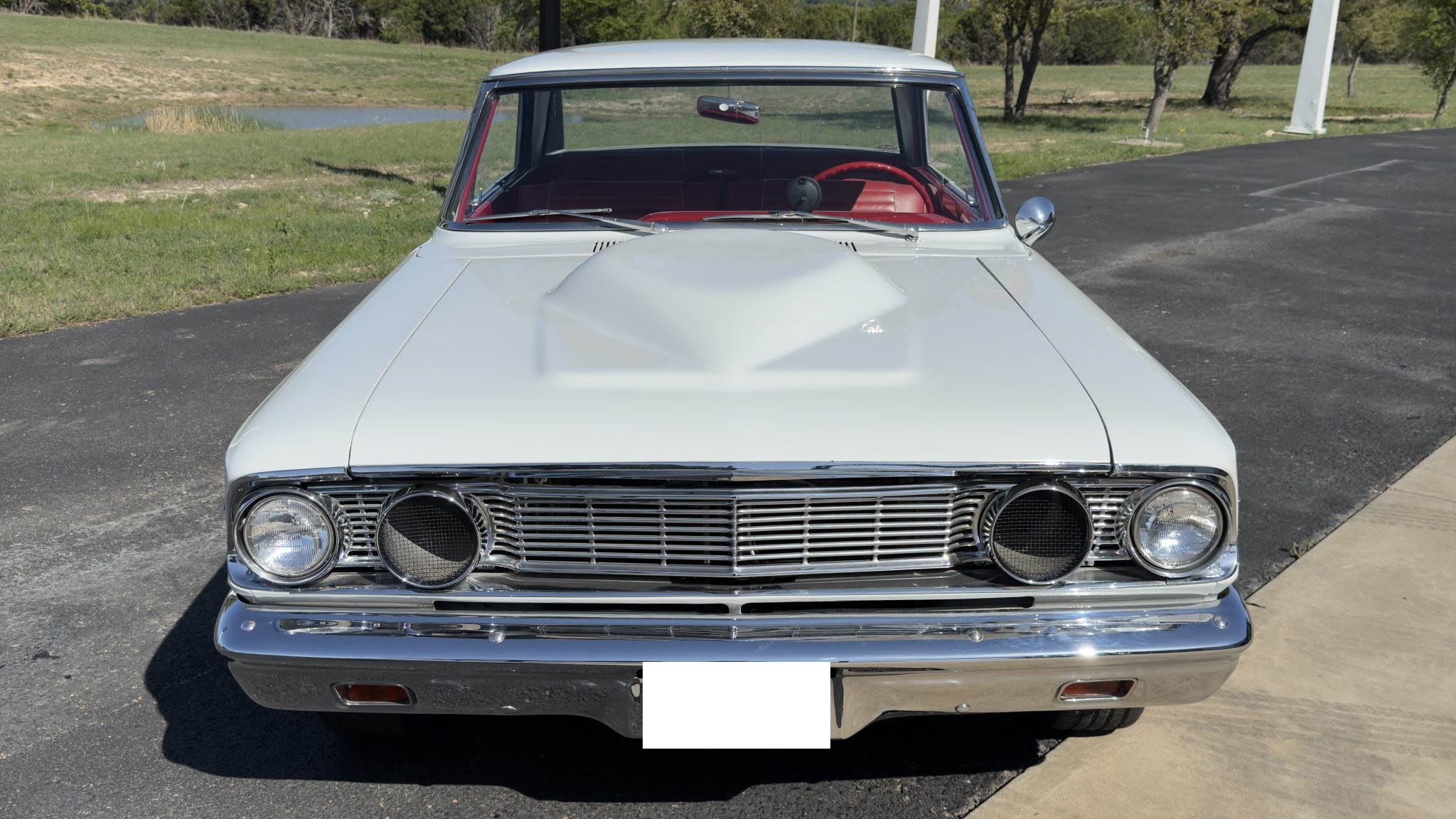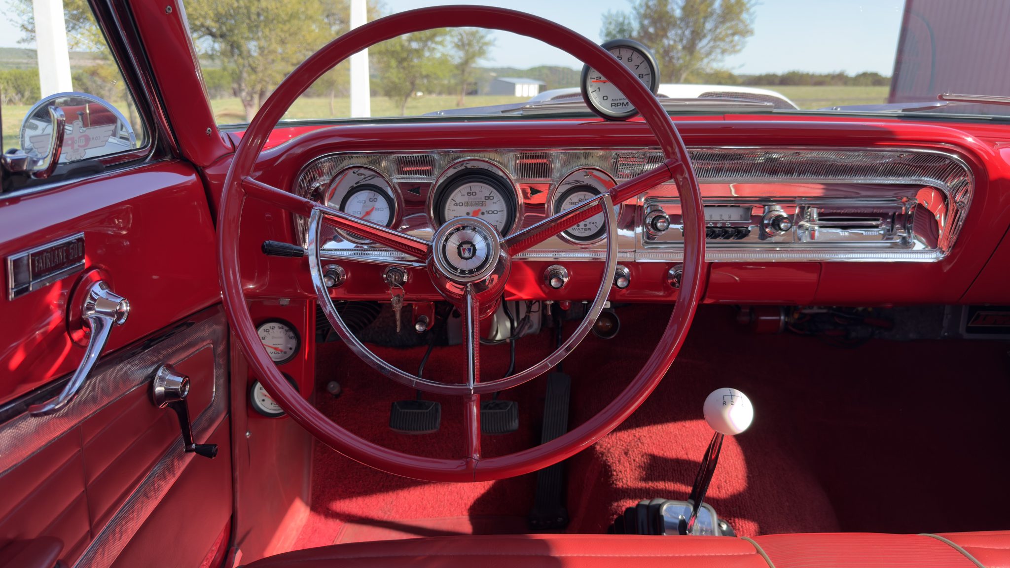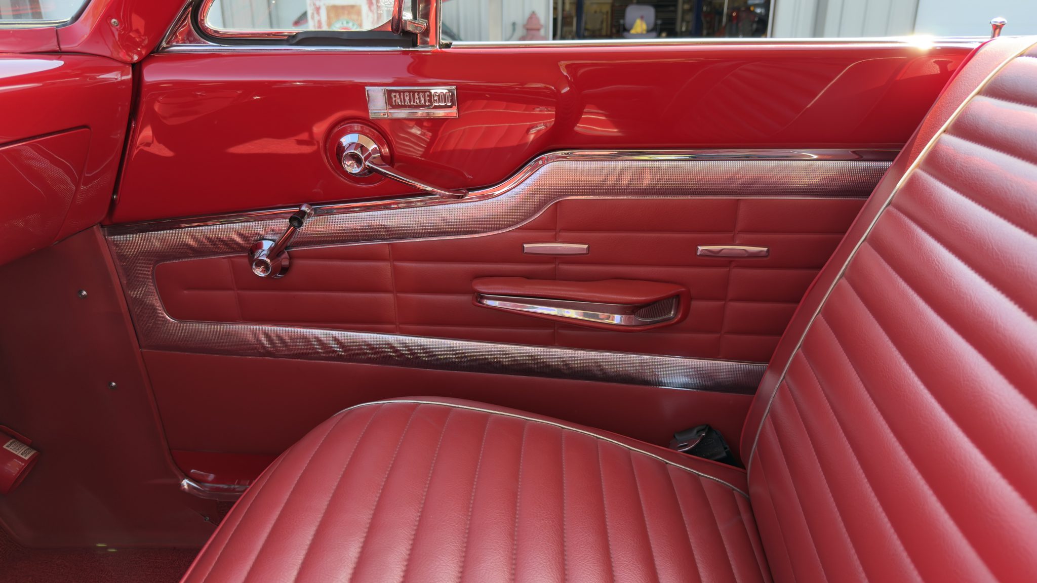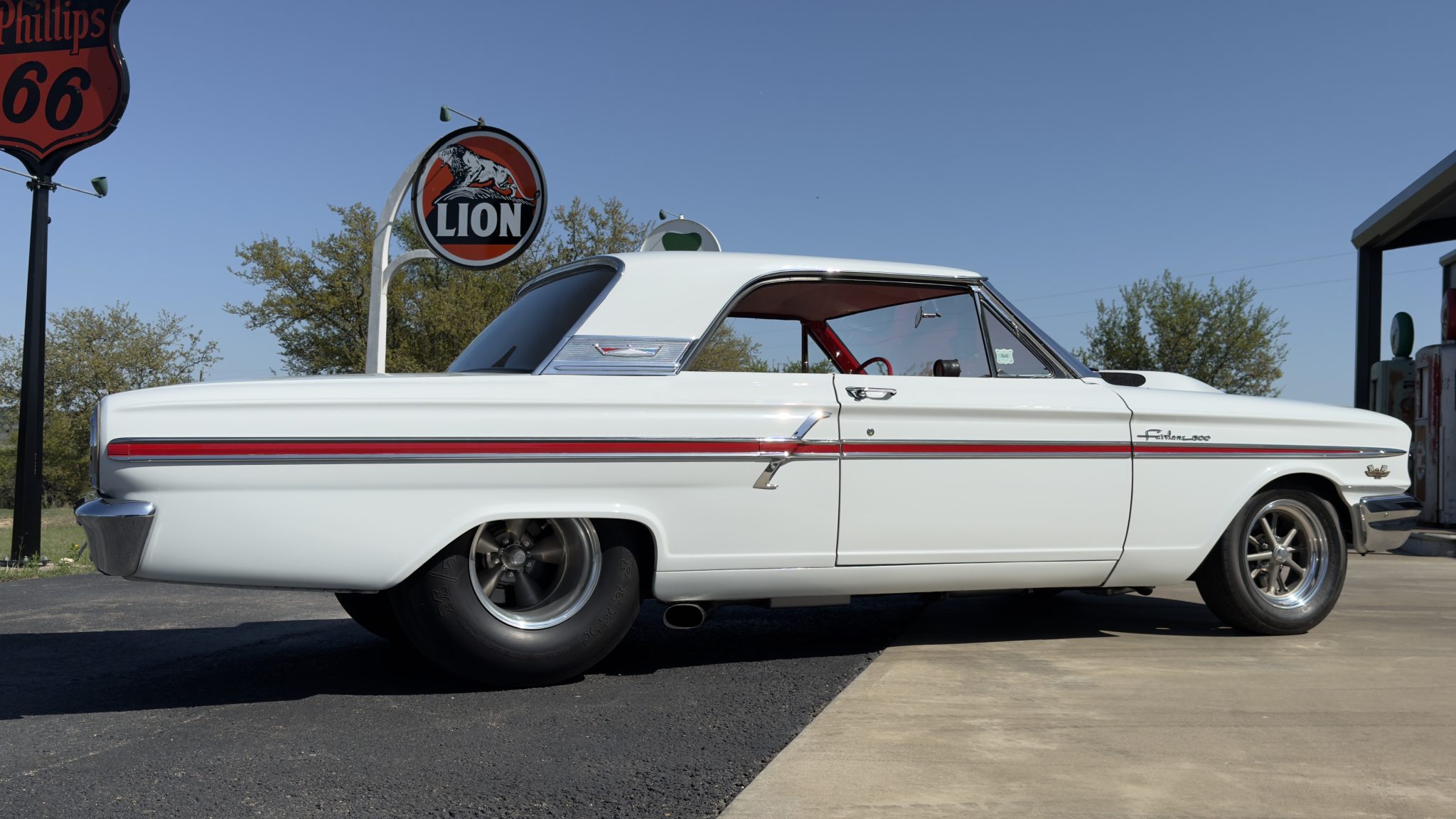 This 1964 Ford Fairlane 500 hardtop is powered by an aluminum 498ci “Cammer” V8 that utilizes a forged rotating assembly and an eight-stack throttle body setup. which results in a reported output of approximately 700 horsepower. Power is routed to the 31×16.5″ Mickey Thompson ET Streets through a David Kee Toploader four-speed transmission and a high-performance 9″ rear end, and the car rides on a modified chassis with a Mustang II-style front suspension, adjustable coilovers, and rear ladder bars. The exterior was refinished in white following the current owner’s 2011 acquisition, and details consist of a Thunderbolt-style hood and red bodyside accents. Inside, the red vinyl bench seats are joined by a push-button radio, AutoMeter instrumentation, and a Hurst shifter.