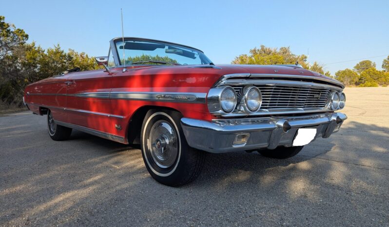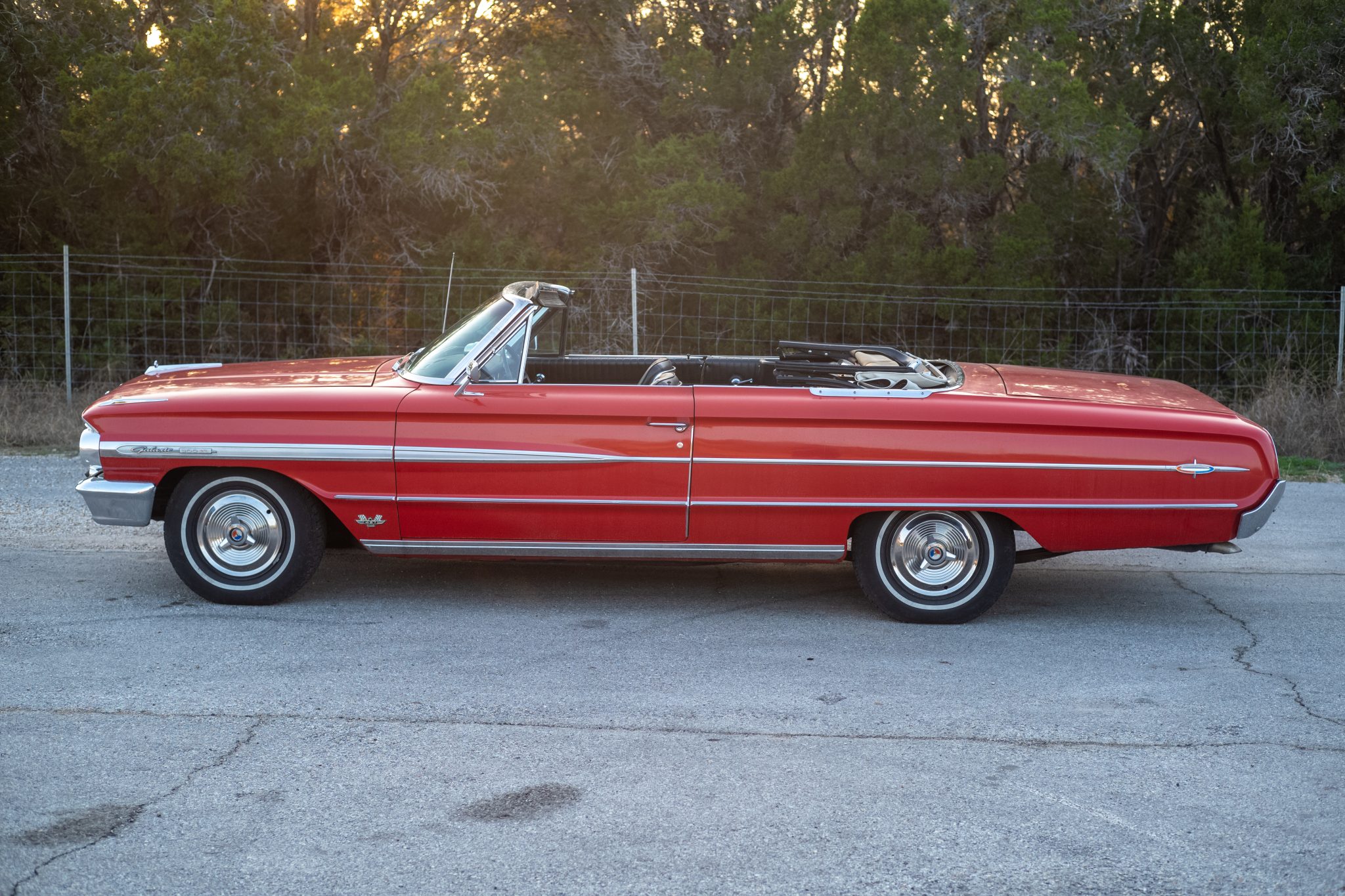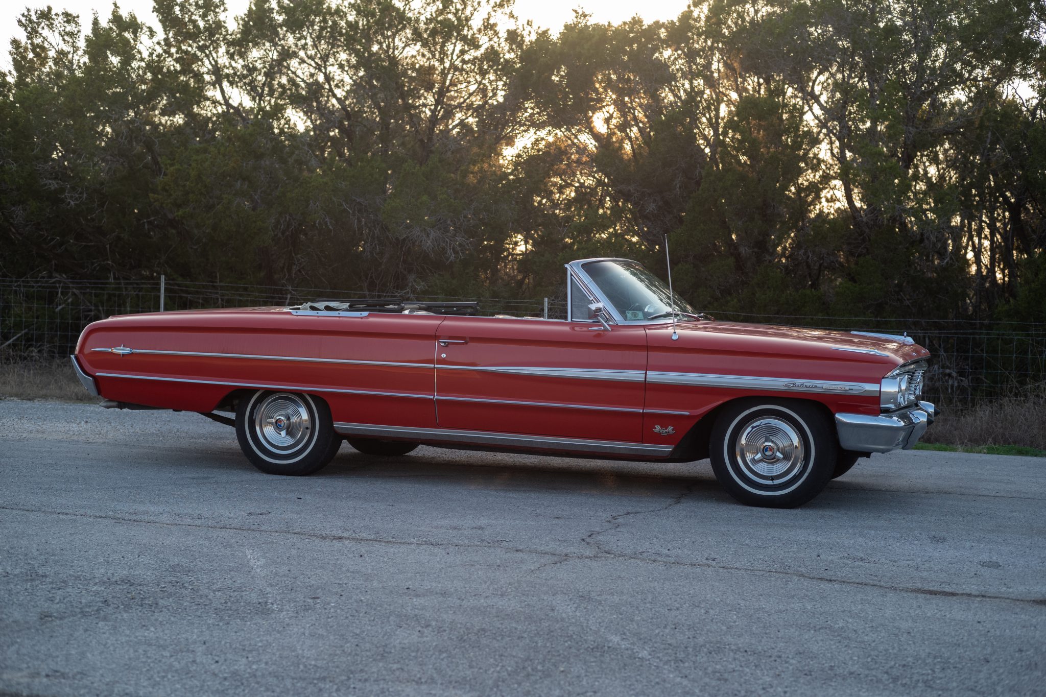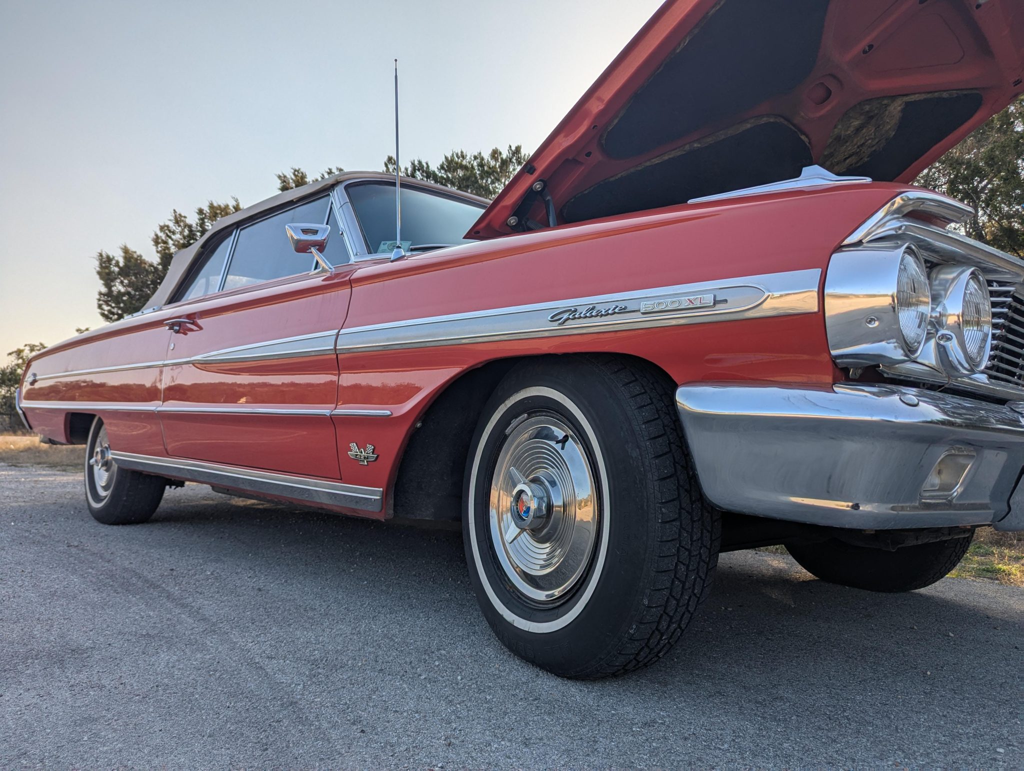 This Rangoon Red 1964 Ford Galaxie 500XL convertible was originally delivered with a 390ci V8, a four-speed toploader manual transmission, and a 3.50:1 differential. At some point the 390 V8 was replaced with a 427ci FE V8 that is topped by two Holley four-barrel carburetors, and work within the past few years included rebuilding the carburetors, master cylinder, and convertible top pump along with retrimming the front seats and replacing the carpeting
