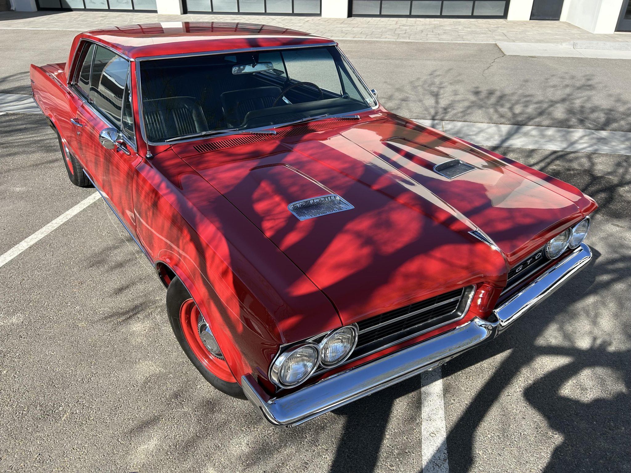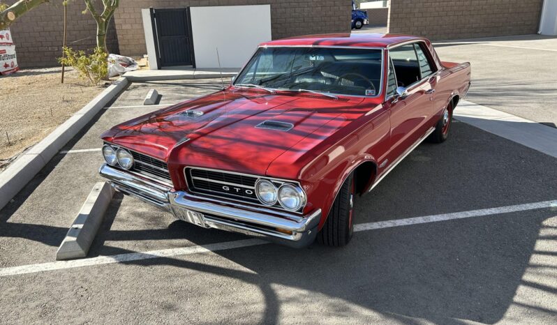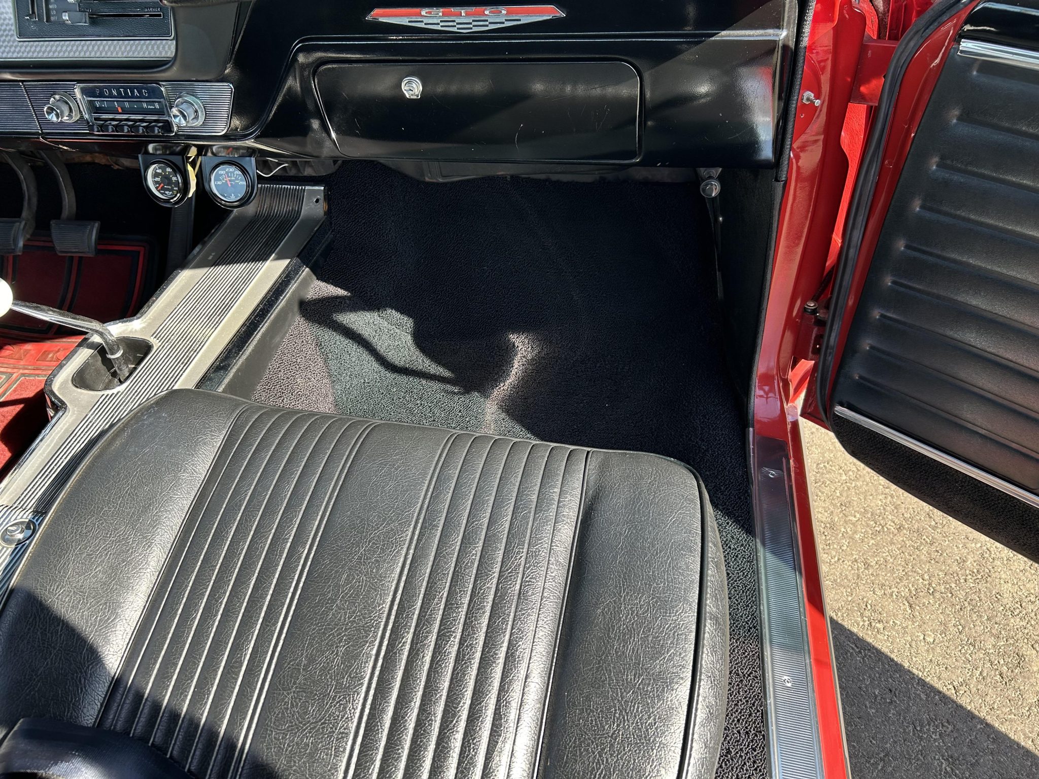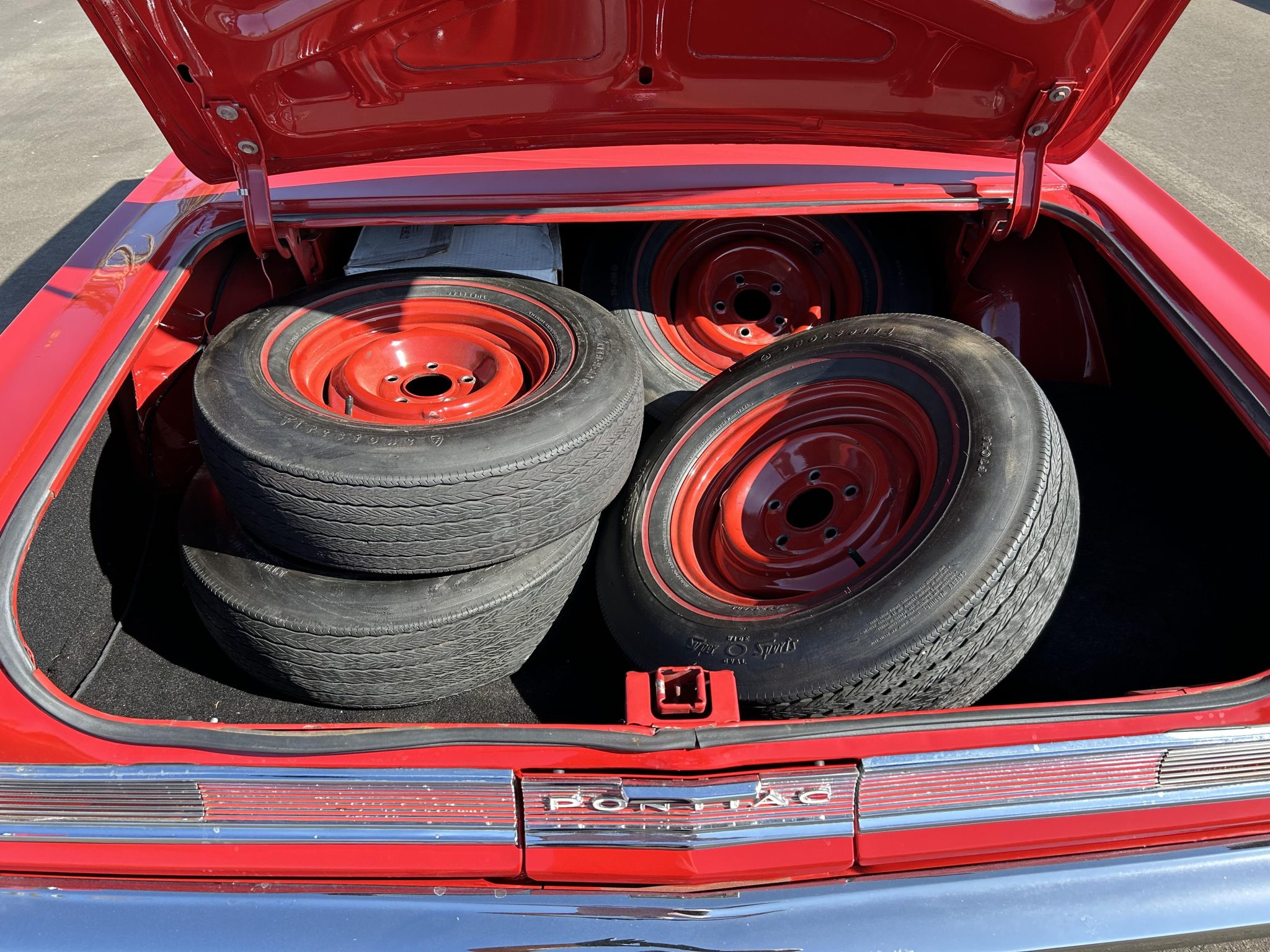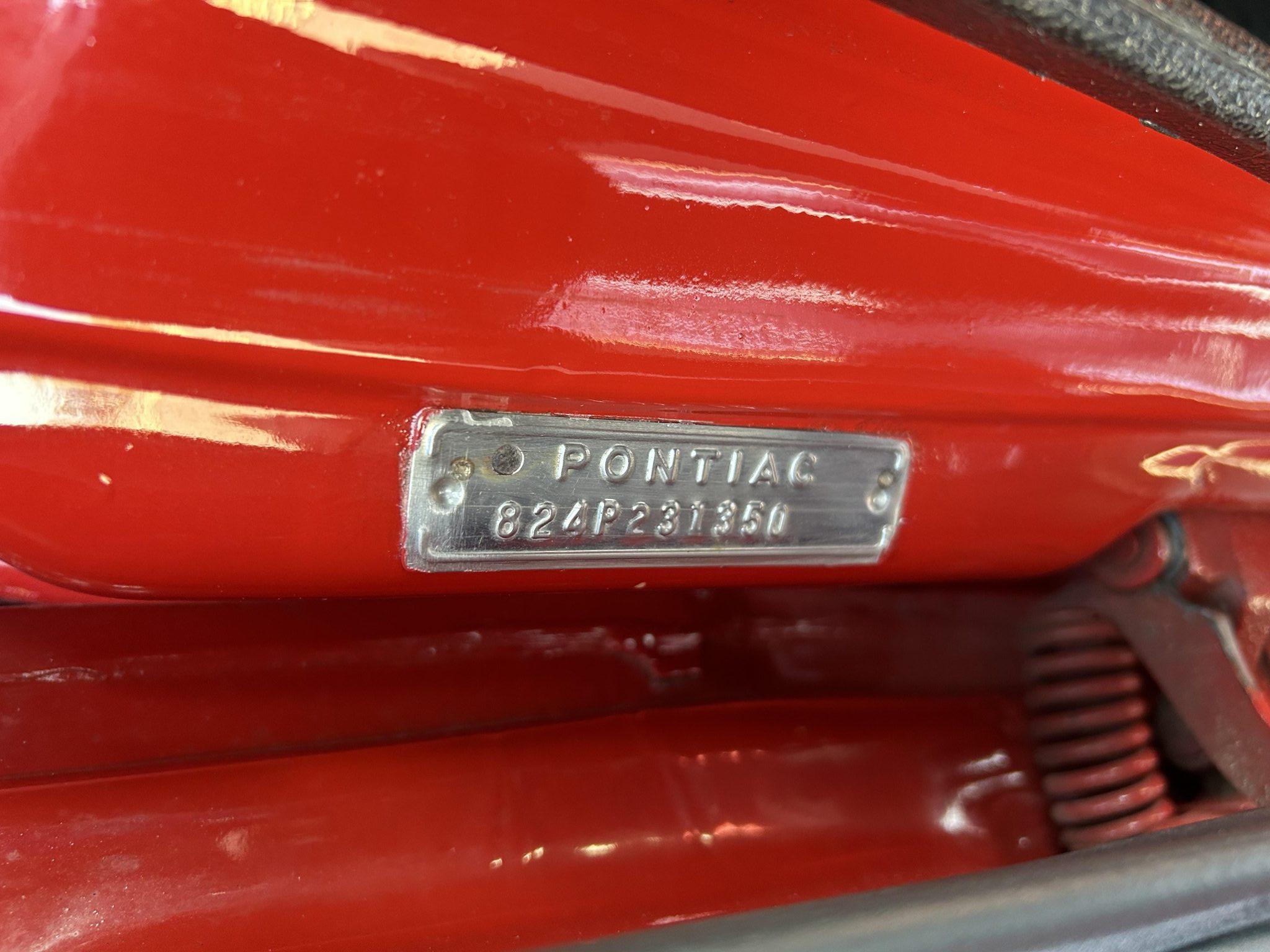 The car is finished in red over black and powered by a 389ci V8 paired with a four-speed manual transmission and 3.55:1 Saf-T-Track rear differential. Features include Tri-Power induction, a heavy-duty radiator, a Pypes dual exhaust, rear lowering springs, rear back-up lamps, a push-button AM radio, and 15″ steel wheels.