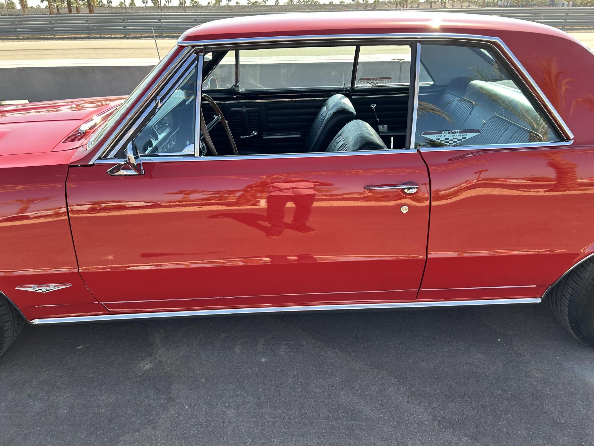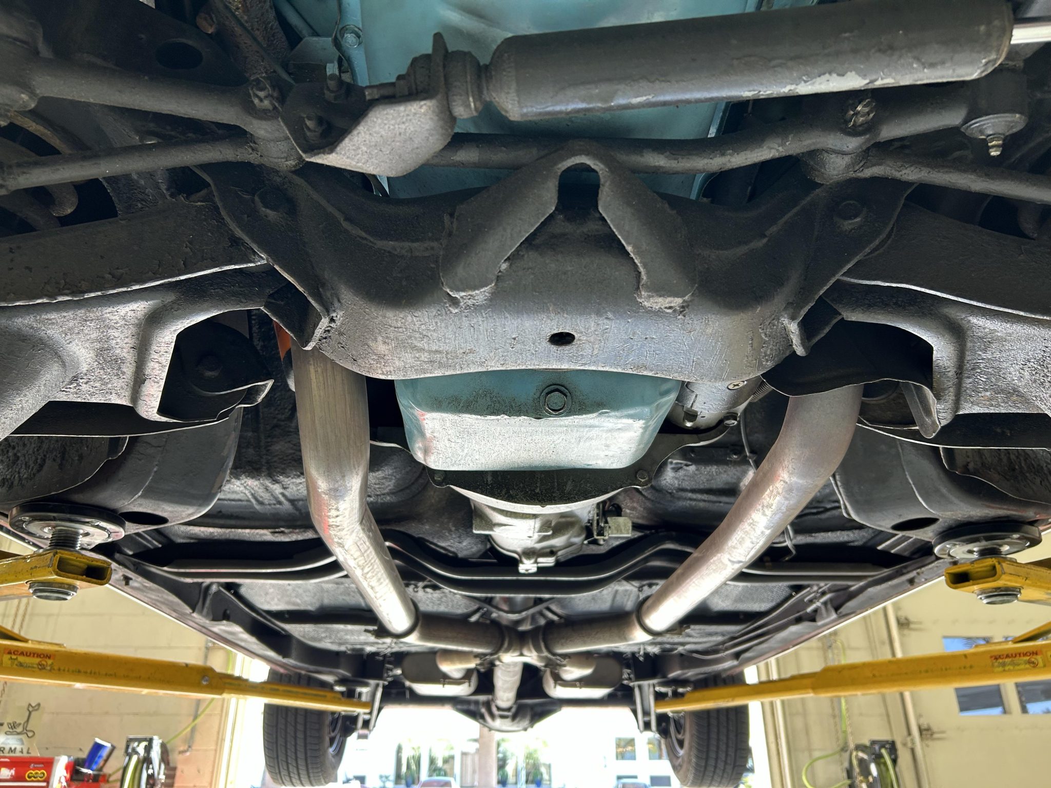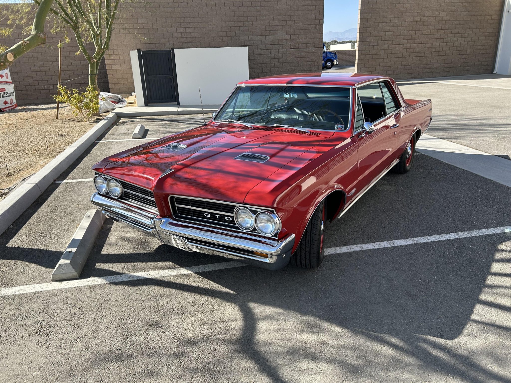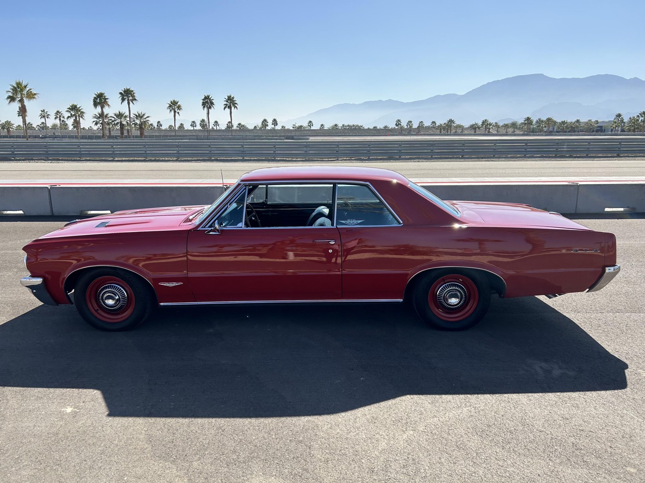 The car is finished in red over black and powered by a 389ci V8 paired with a four-speed manual transmission and 3.55:1 Saf-T-Track rear differential. Features include Tri-Power induction, a heavy-duty radiator, a Pypes dual exhaust, rear lowering springs, rear back-up lamps, a push-button AM radio, and 15″ steel wheels.