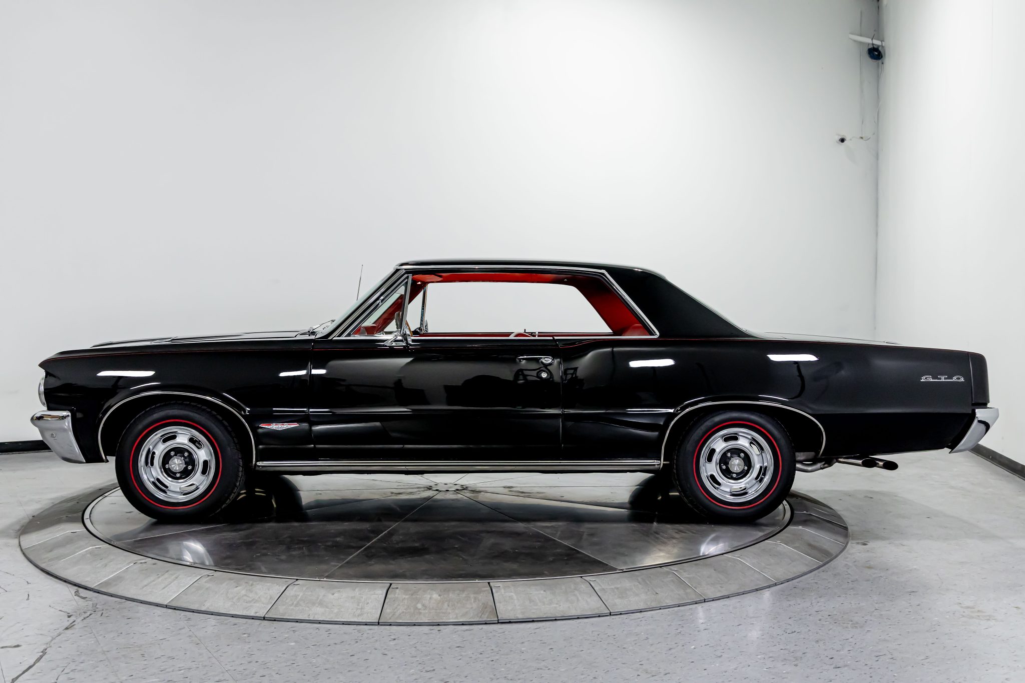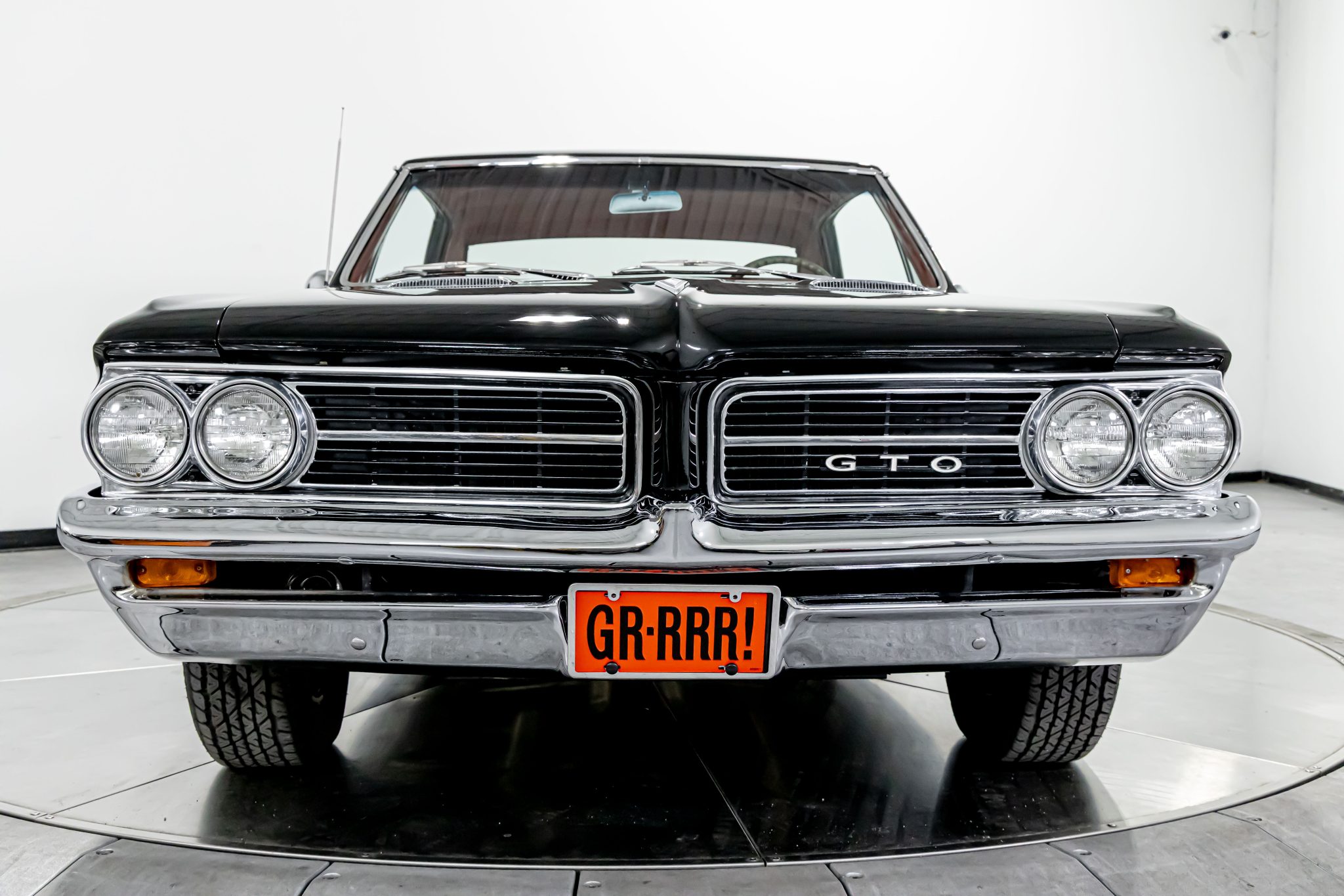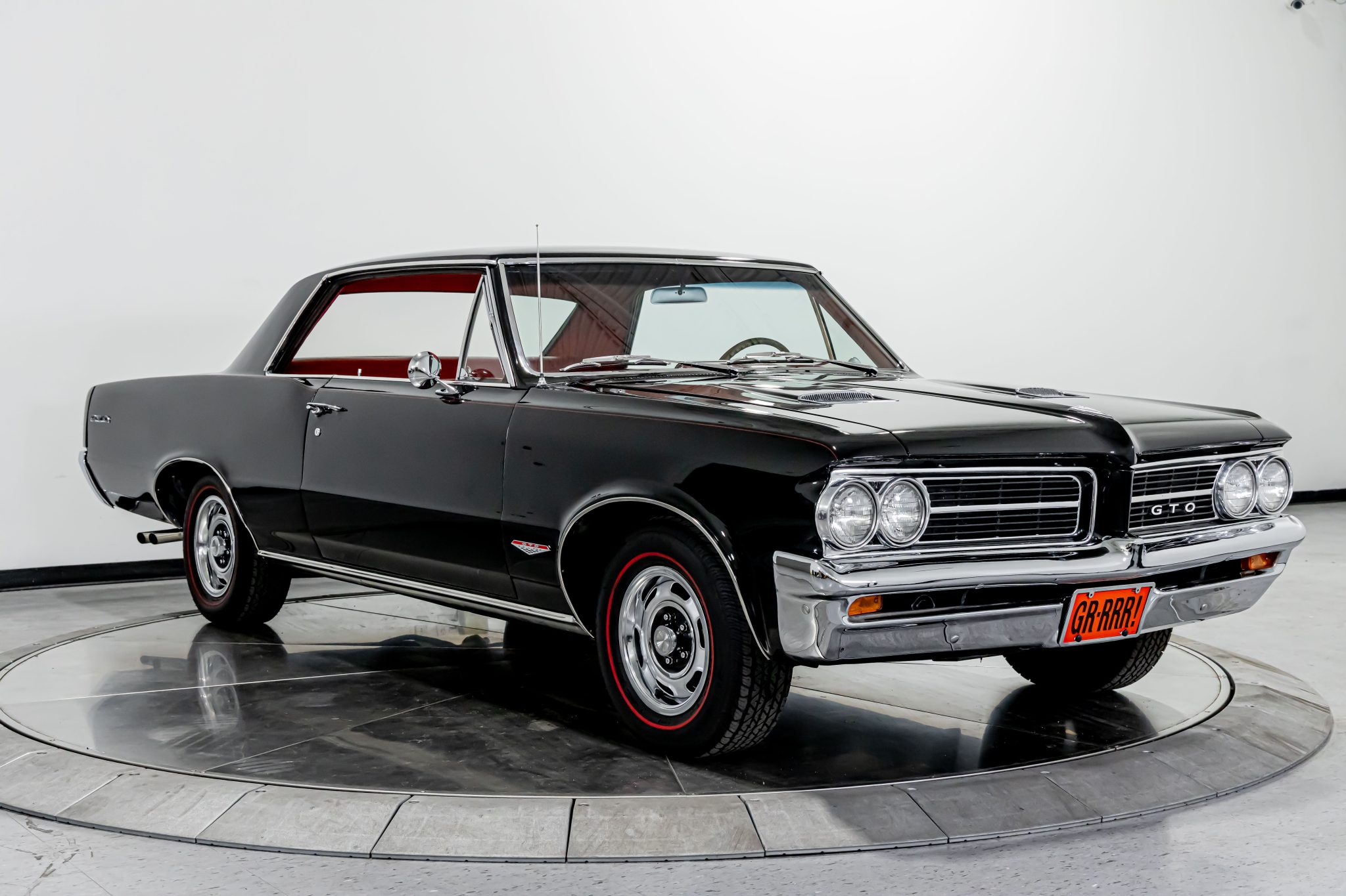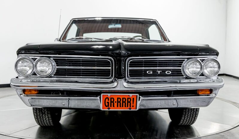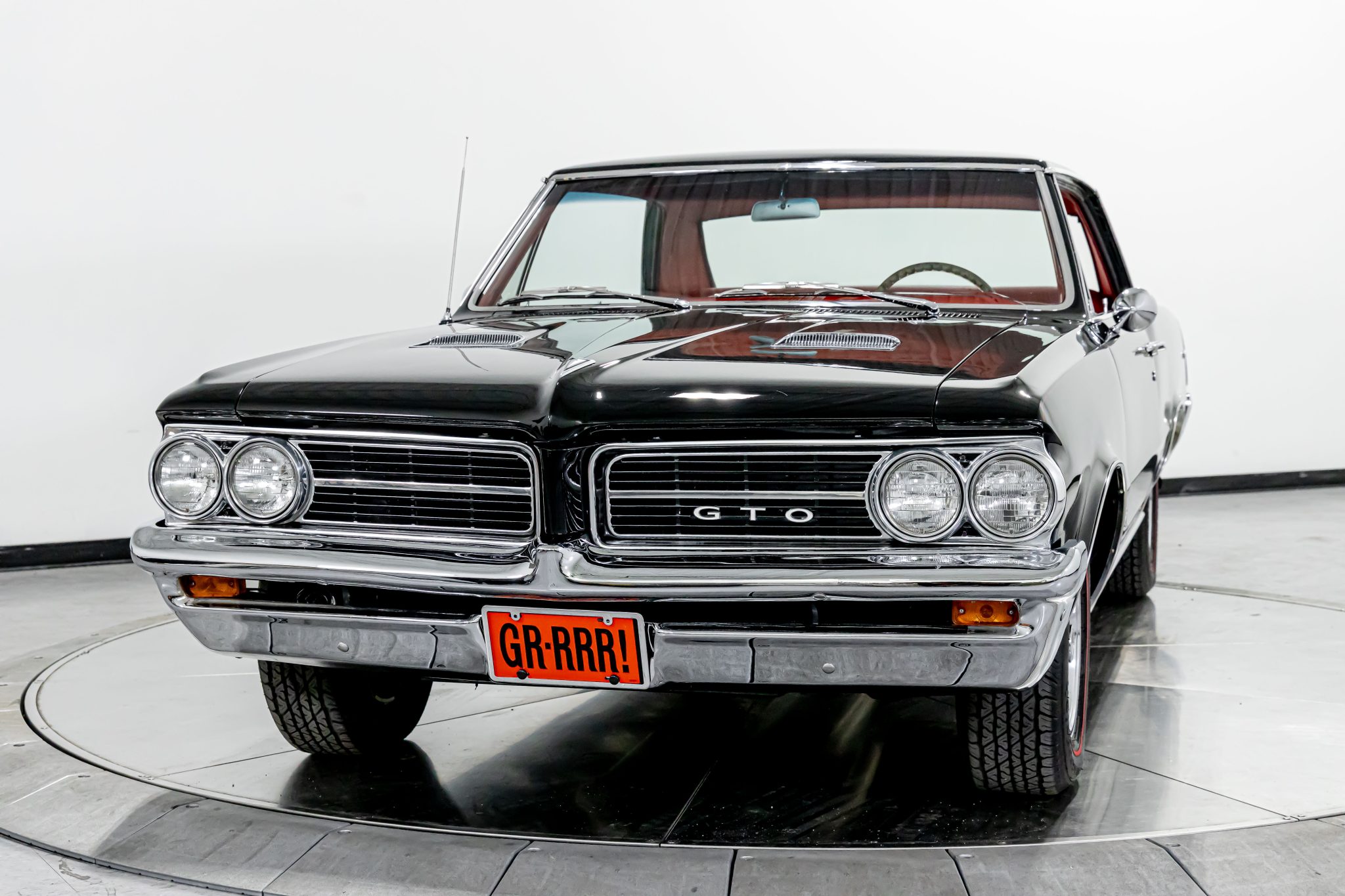This 1964 Pontiac GTO hardtop coupe was refurbished and is powered by a 421ci tri-power V8 linked with a four-speed manual transmission and a limited-slip differential. The car was refinished in black over red, and it is equipped with power-assisted Wilwood front disc brakes, KYB front shocks, power steering, 14″ Rally wheels, Flo-Pro mufflers, a center console, a Hurst shifter, and a CD stereo.