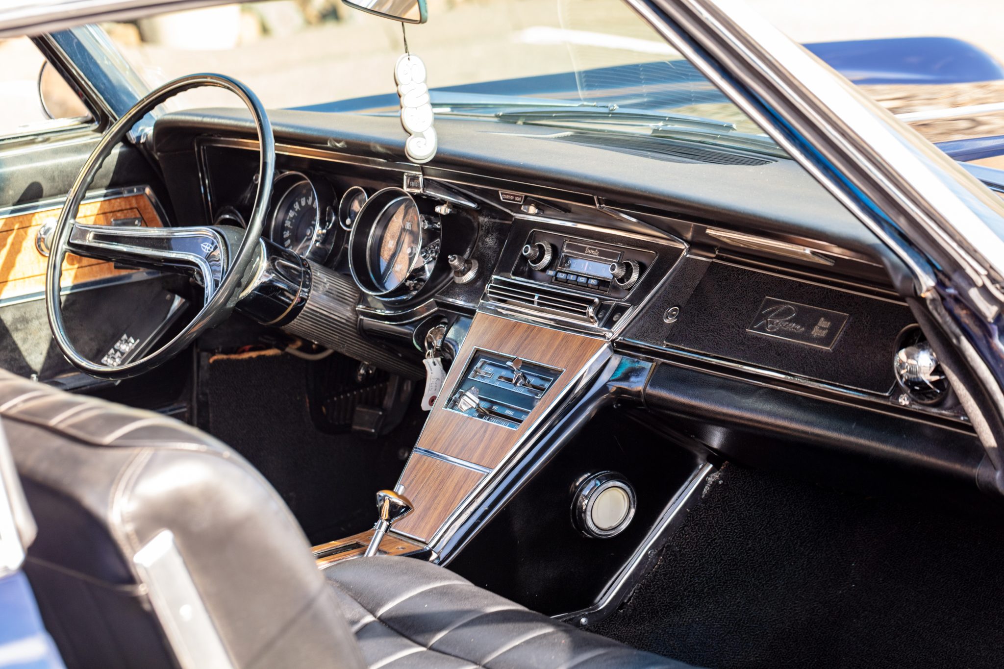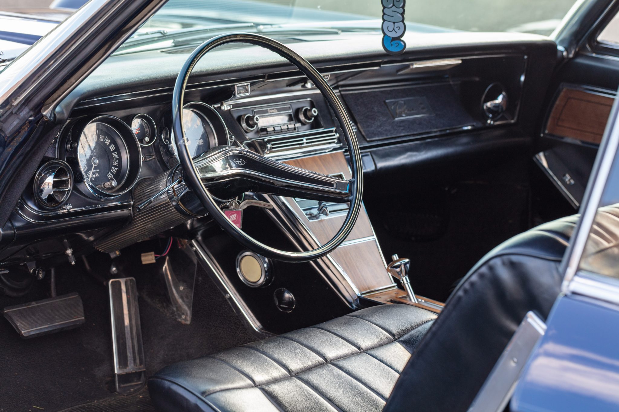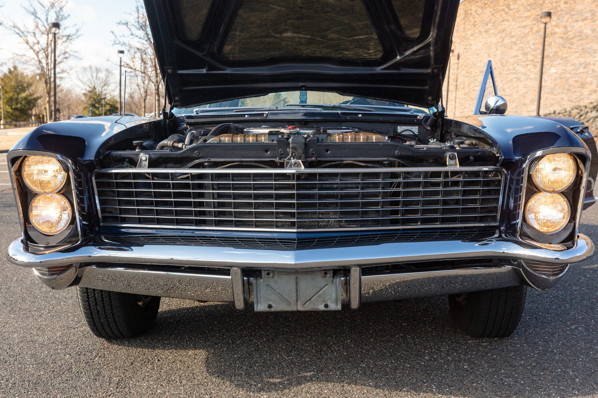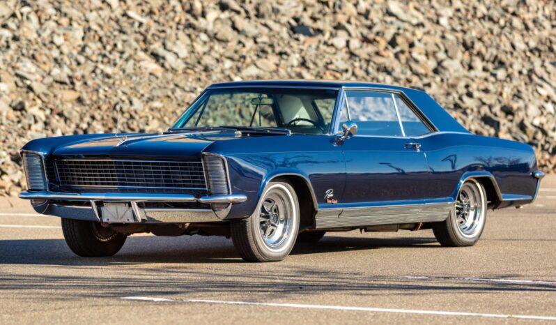 This 1965 Buick Riviera Gran Sport is one of 3,354 examples produced with the Gran Sport package A 425ci Nailhead V8 breathes through dual four-barrel carburetors and is mated to a three-speed automatic transmission and a limited-slip differential. The body has been refinished in blue, and the car is equipped with 15″ Rally wheels, concealed stacked headlights, a power-adjustable driver’s seat, rear bucket seats, power windows, cruise control, and a non-functioning air conditioning system.