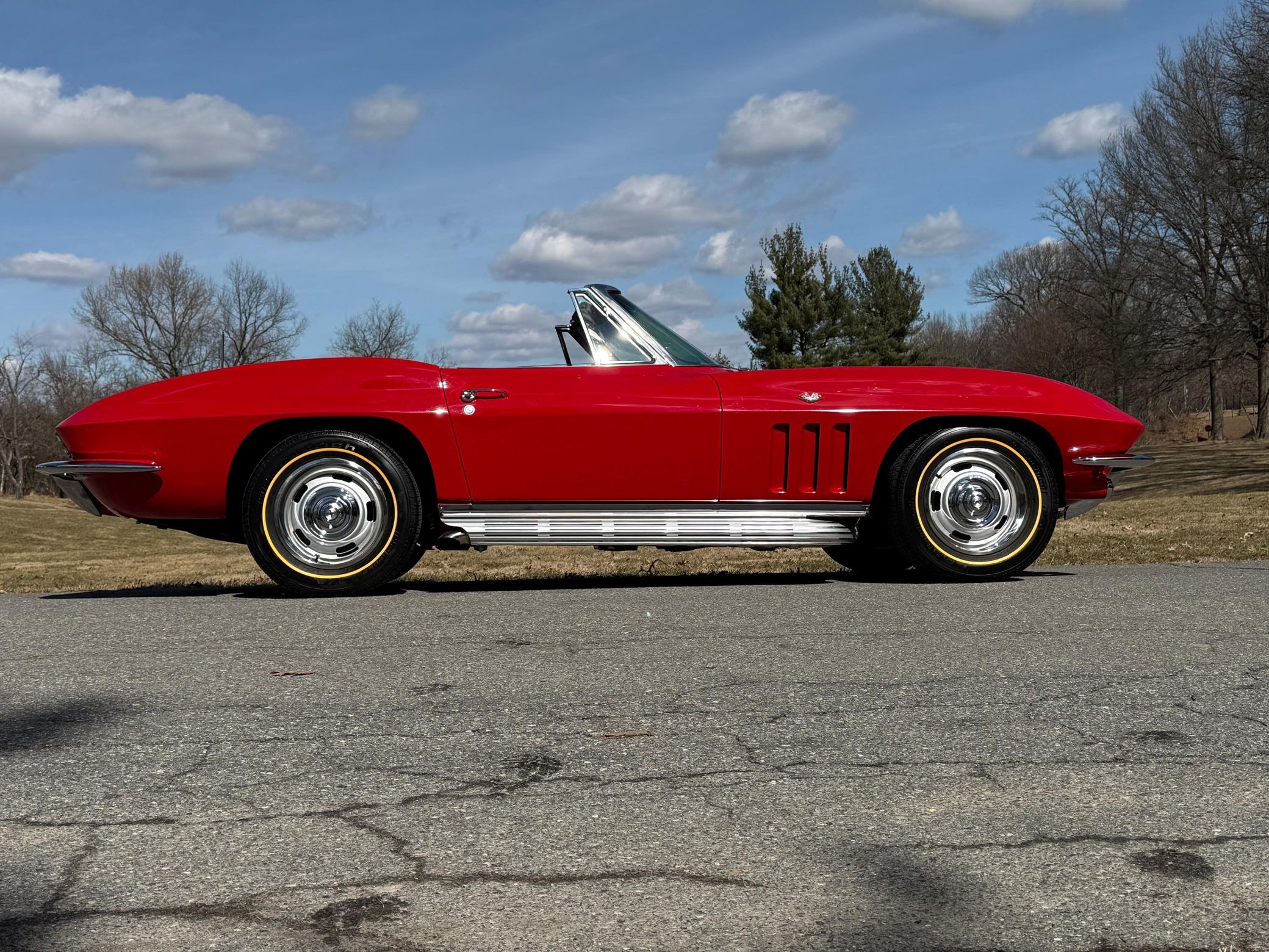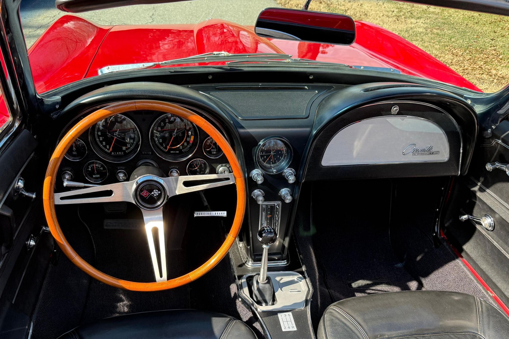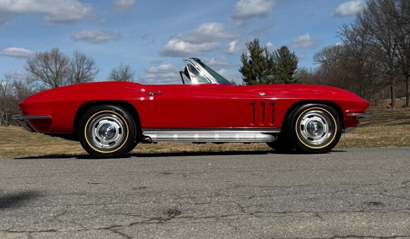 It's a convertible model that benefits from a restoration in 2023 that included a rebuild of the 327ci V8, and it's been fitted with a TREMEC 5-speed manual transmission. It also features a DeWitts aluminum radiator, electric cooling fans, a Positraction differential, and an Al Knoch upholstery kit – and the Rally Red finish looks fantastic.