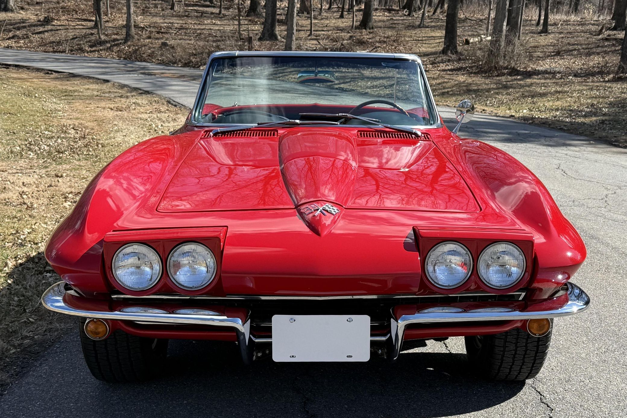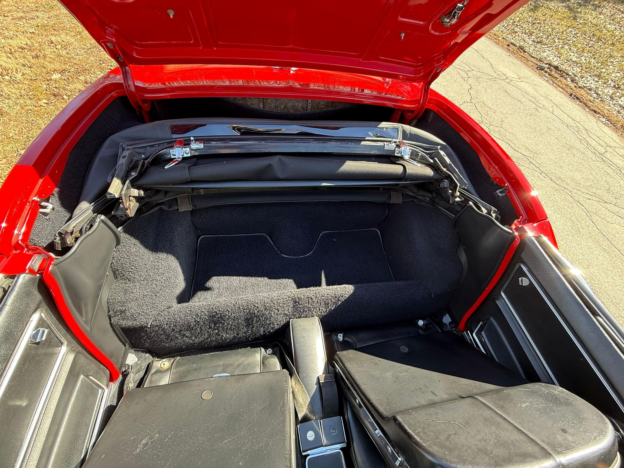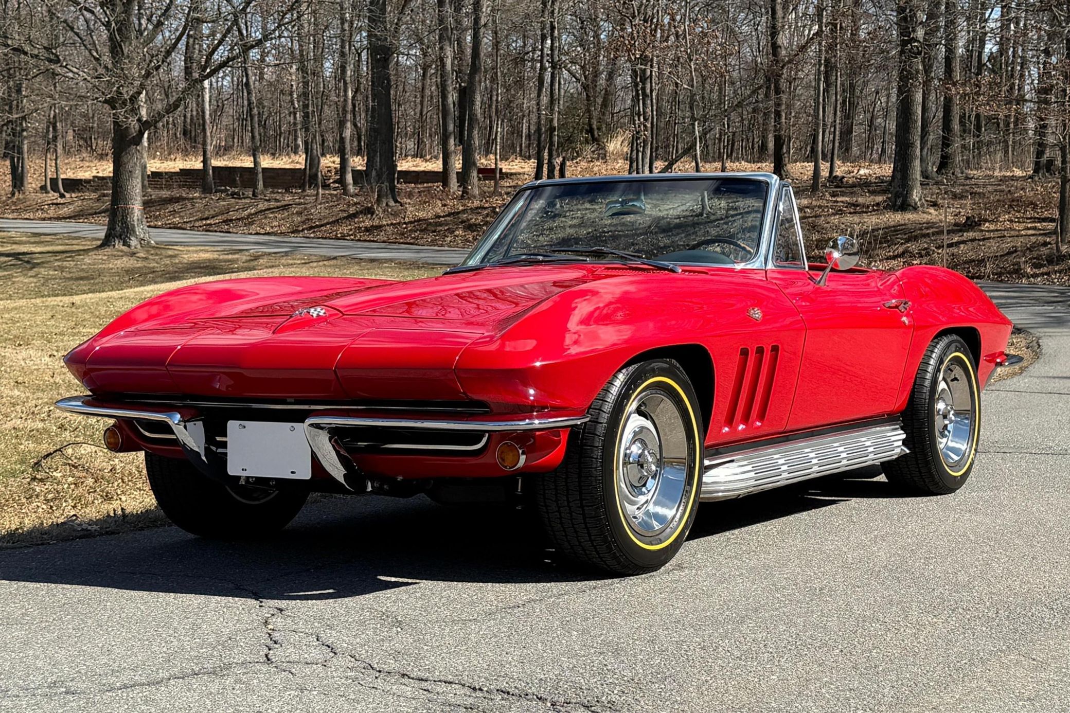 It's a convertible model that benefits from a restoration in 2023 that included a rebuild of the 327ci V8, and it's been fitted with a TREMEC 5-speed manual transmission. It also features a DeWitts aluminum radiator, electric cooling fans, a Positraction differential, and an Al Knoch upholstery kit – and the Rally Red finish looks fantastic.
