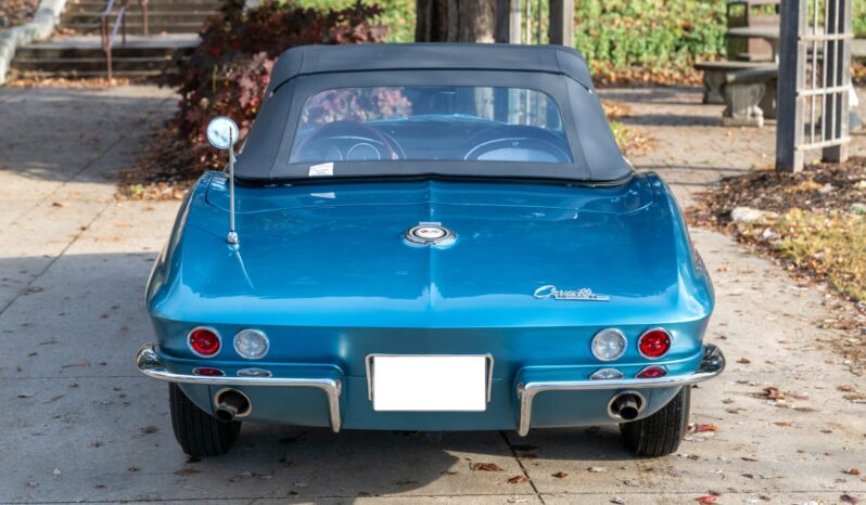 The car is powered by a fuel-injected 327ci L84 V8 paired with a four-speed manual transmission and is refinished in Nassau Blue over black vinyl upholstery. Features include a Positraction differential, a black convertible soft top, 15″ steel wheels, four-wheel disc brakes, an AM/FM radio, a telescopic steering column, a teakwood steering wheel, a power antenna, and retractable headlights.