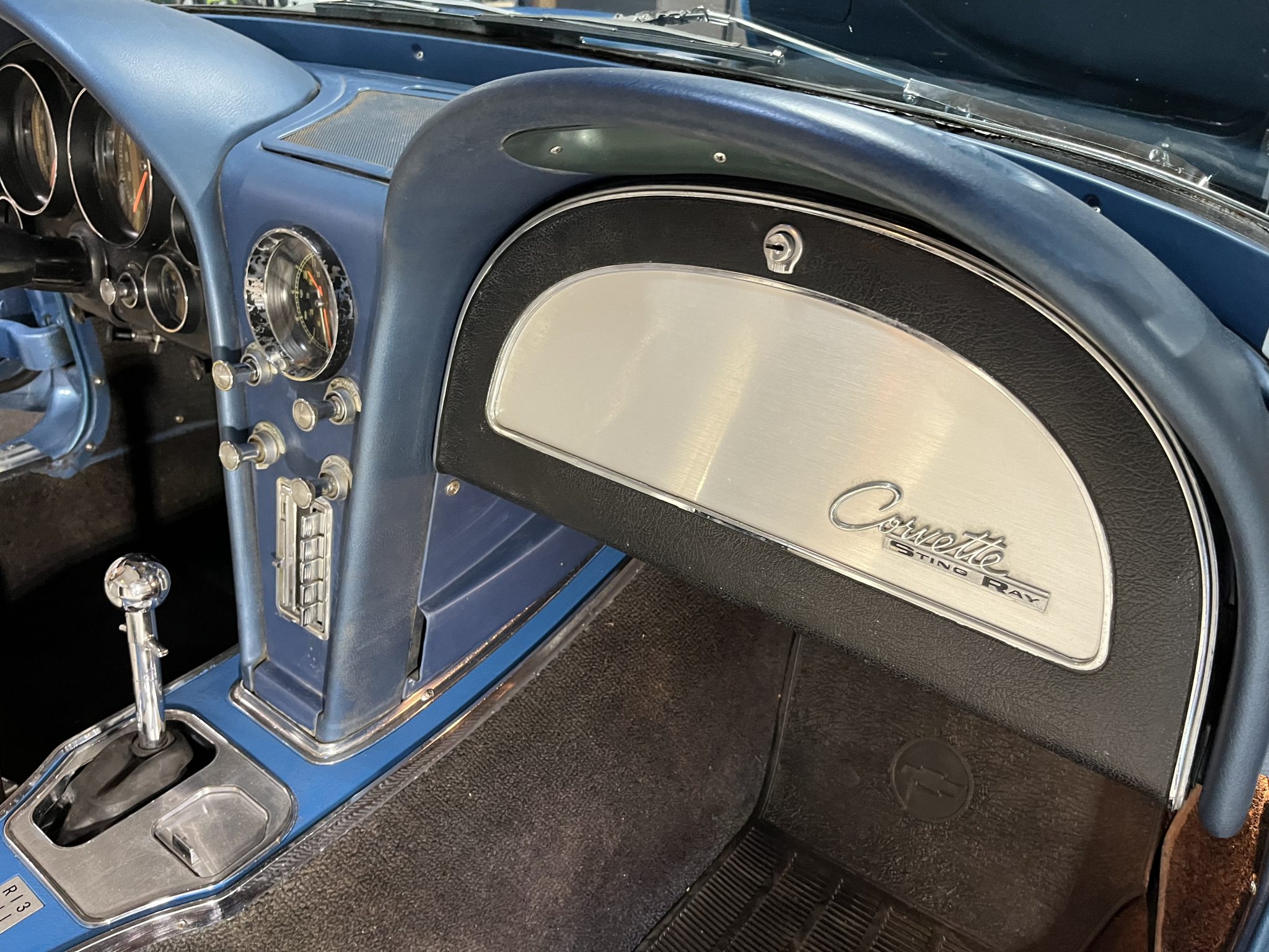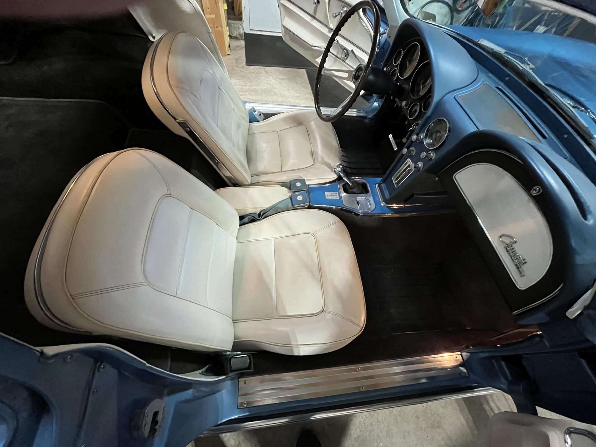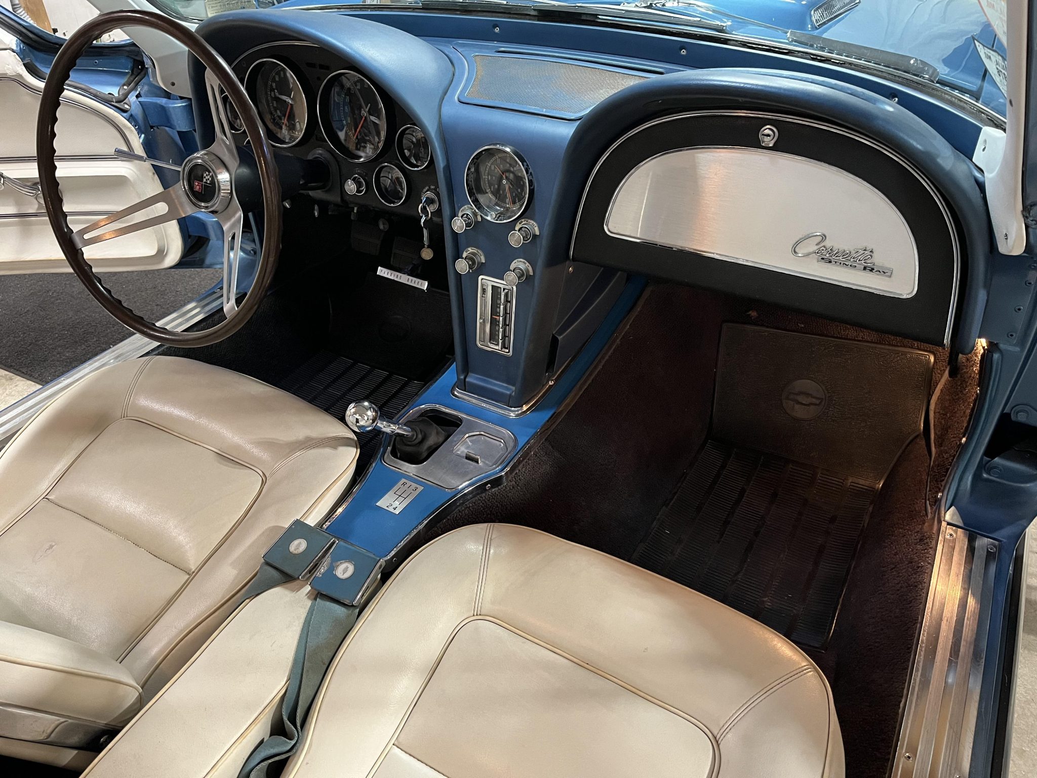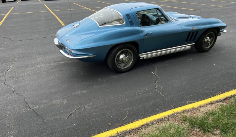 This 1965 Chevrolet Corvette coupe was refurbished in 2020 in blue and the 396ci L78 V8 was rebuilt at that time. The car is equipped with a four-speed manual transmission and a Positraction differential as well as four-wheel disc brakes, 15″ cast aluminum wheels, and a side exhaust system. The interior is trimmed in white and blue and features an AM/FM radio, an analog clock, and blue lap belts.