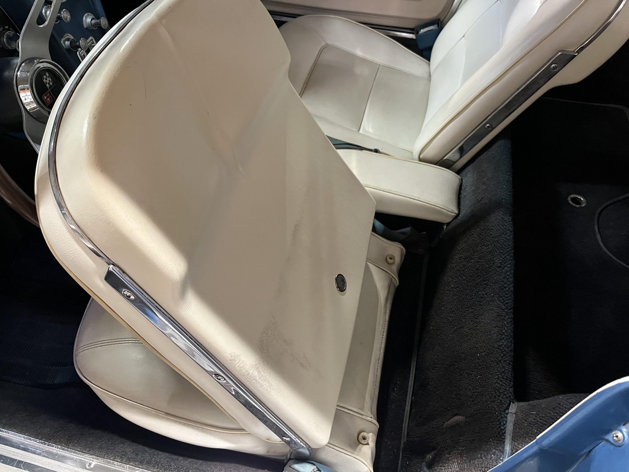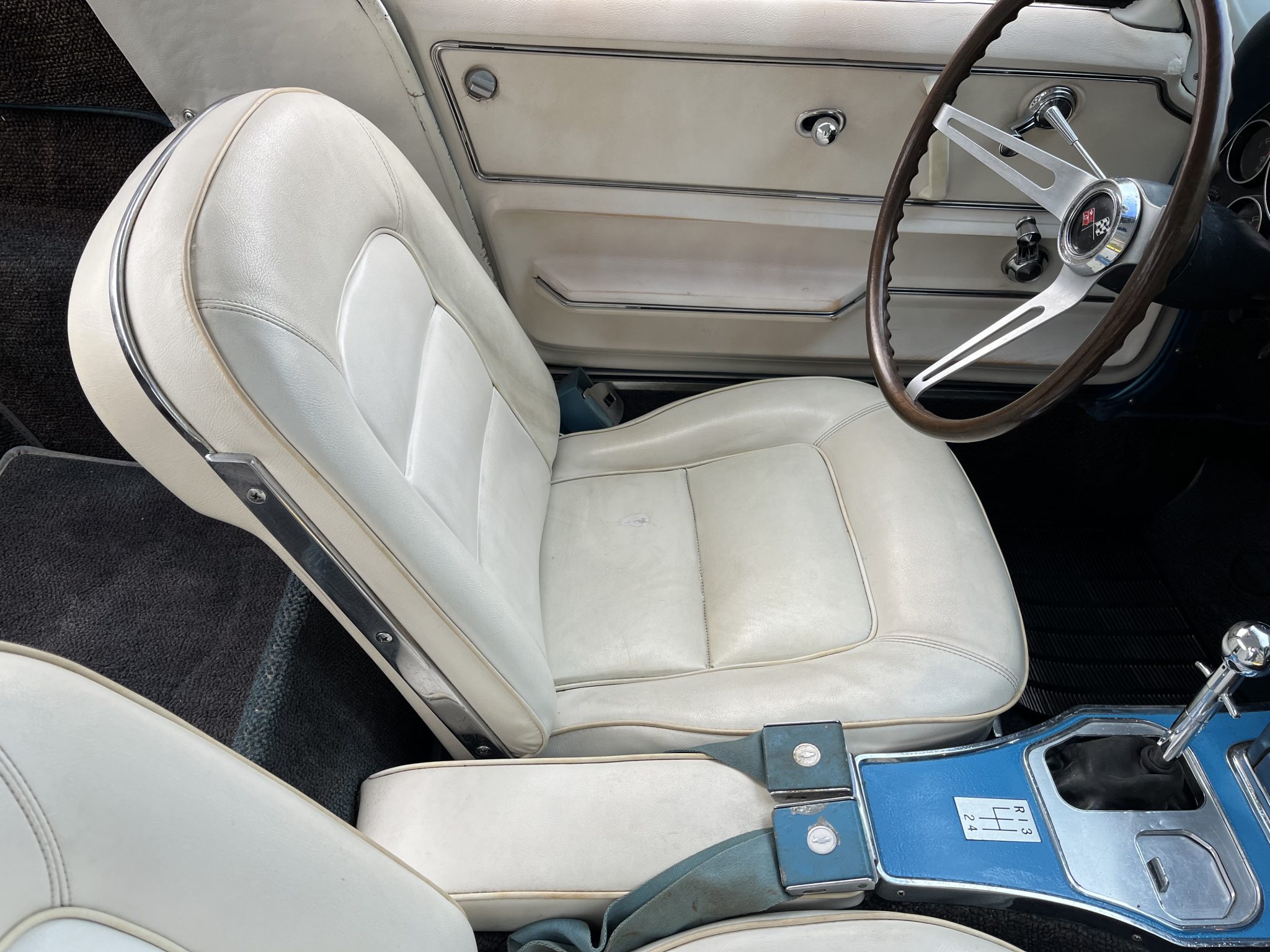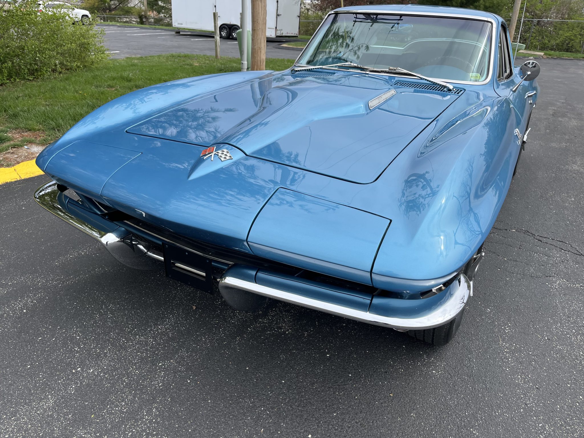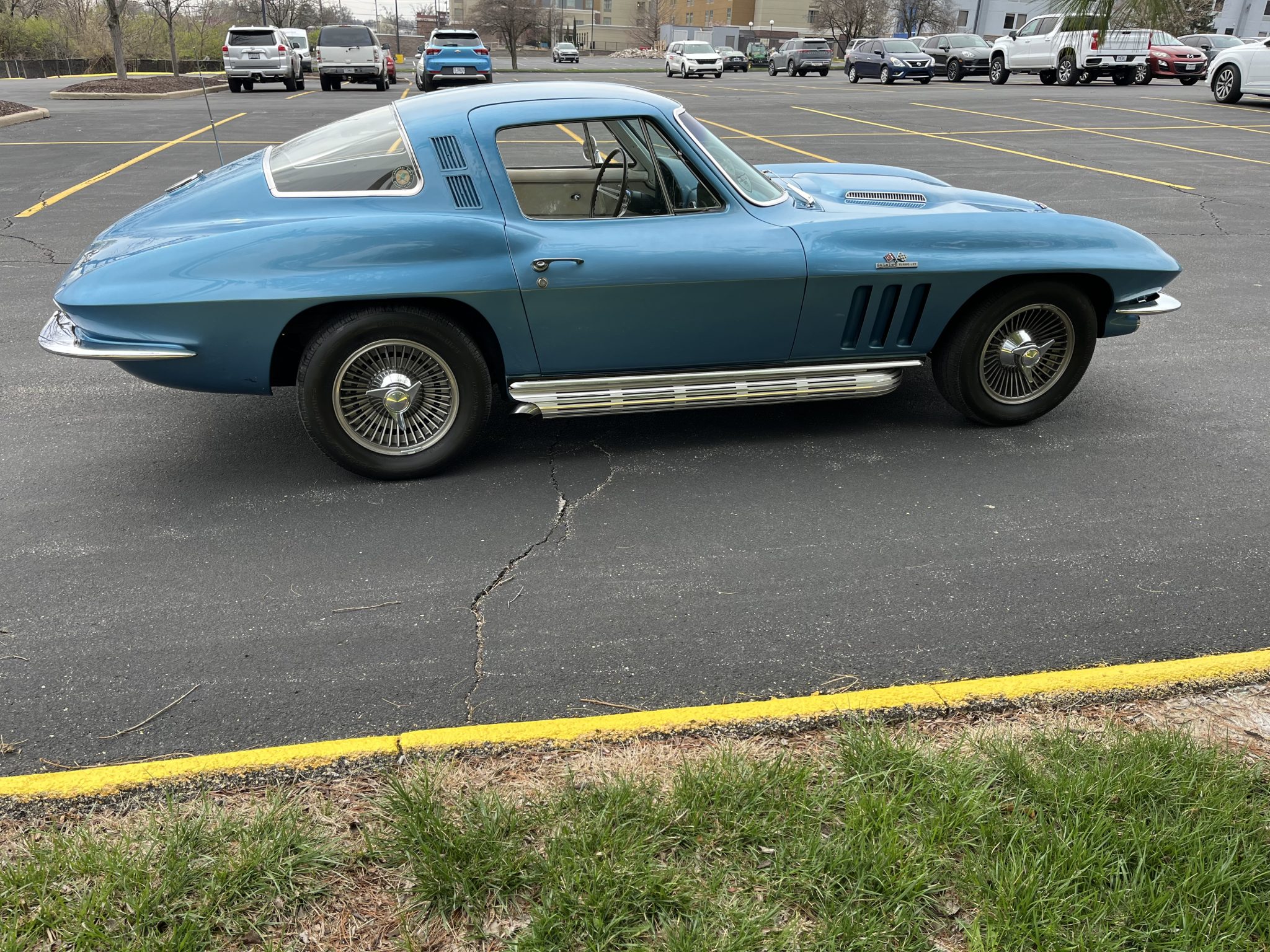 This 1965 Chevrolet Corvette coupe was refurbished in 2020 in blue and the 396ci L78 V8 was rebuilt at that time. The car is equipped with a four-speed manual transmission and a Positraction differential as well as four-wheel disc brakes, 15″ cast aluminum wheels, and a side exhaust system. The interior is trimmed in white and blue and features an AM/FM radio, an analog clock, and blue lap belts.