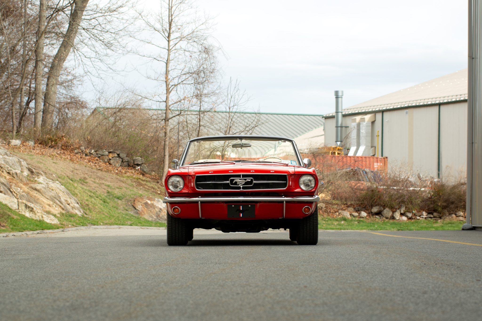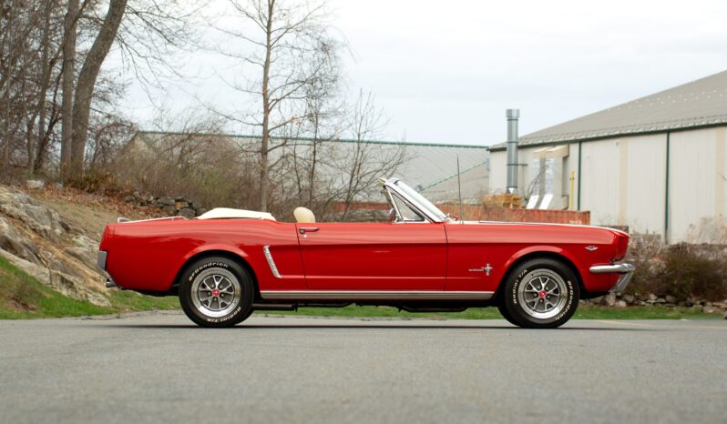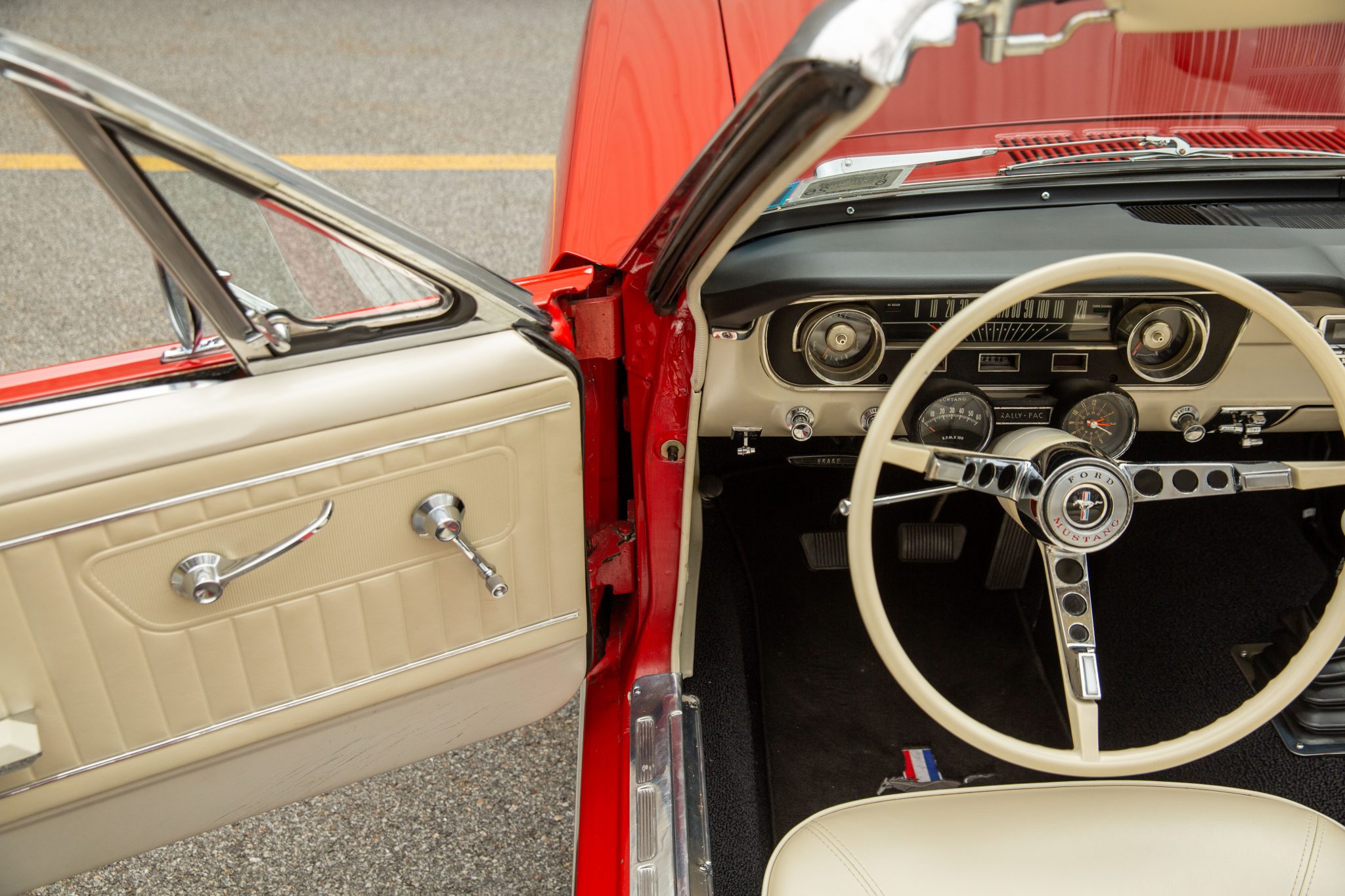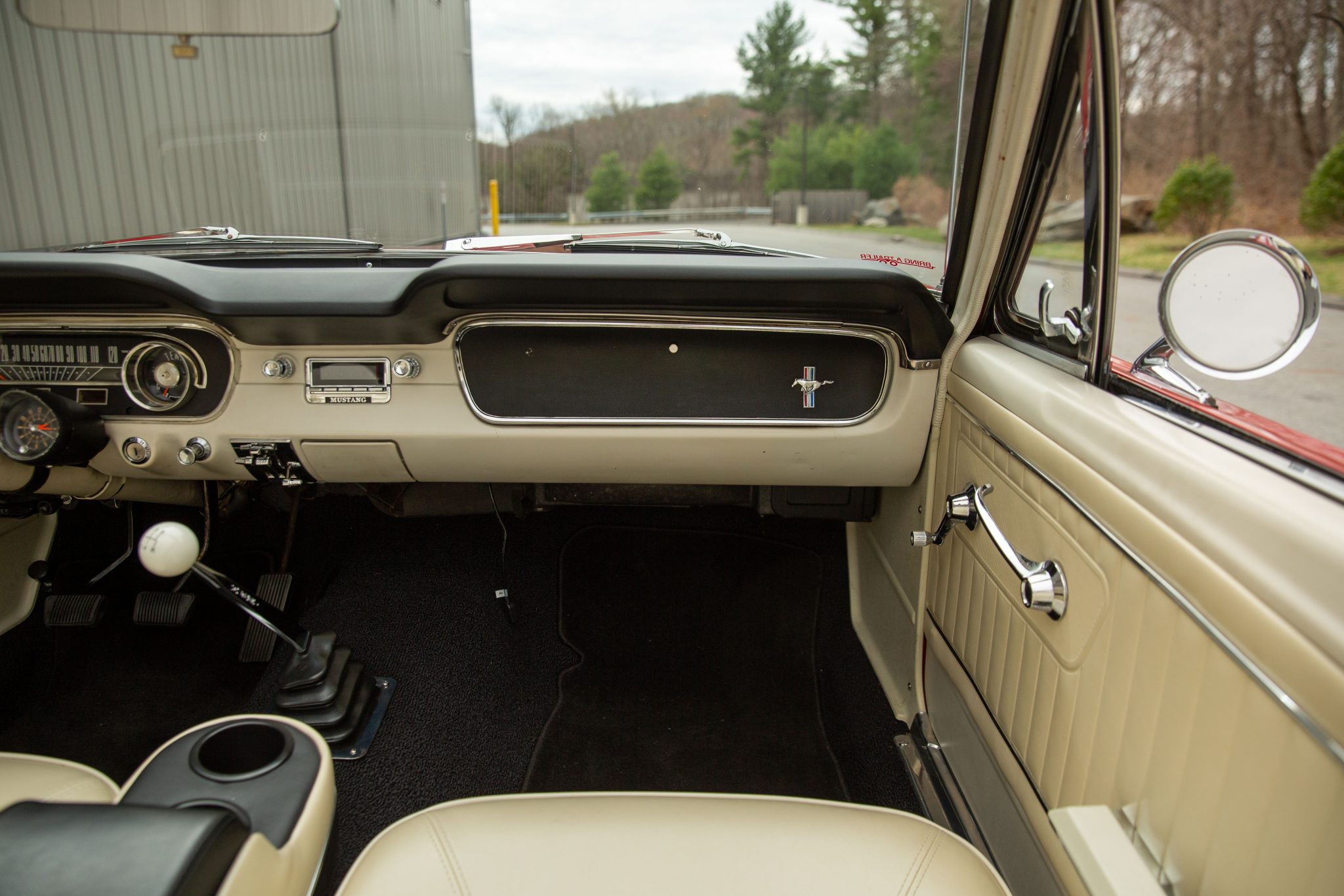 This 1965 Ford Mustang was delivered as a C-Code convertible with a 289ci V8 and automatic transmission In 2015 the engine was rebuilt to displace 293ci by Mustang Madness in Portland, Connecticut, and it is topped by Edelbrock heads and a Holley carburetor. A Tremec five-speed manual transmission, four-wheel discs, and a GT-style exhaust system and Rally-Pac instruments were also installed by the previous owners, while the seller mounted Scott Drake wheels, overhauled the interior, added a Custom Autosound Bluetooth stereo and power steering, and replaced the top, radiator, clutch, and more as described below.