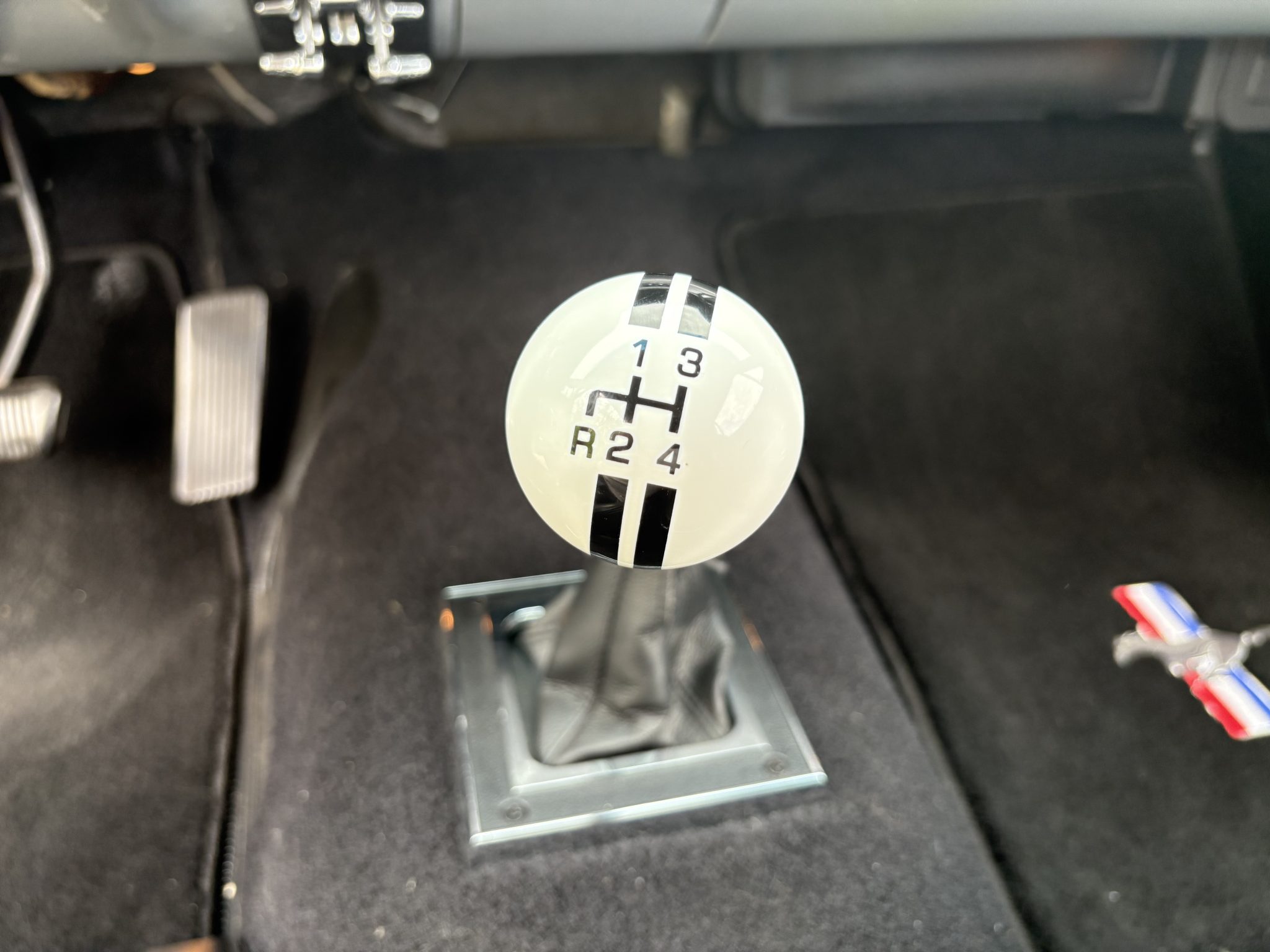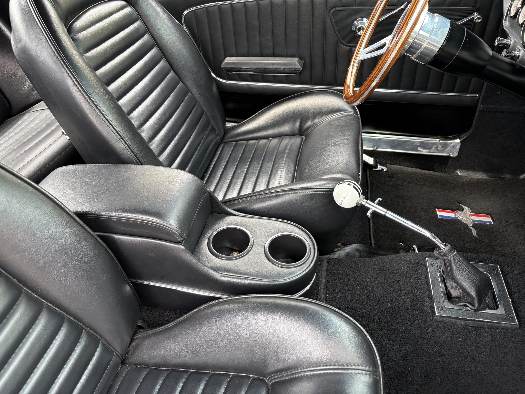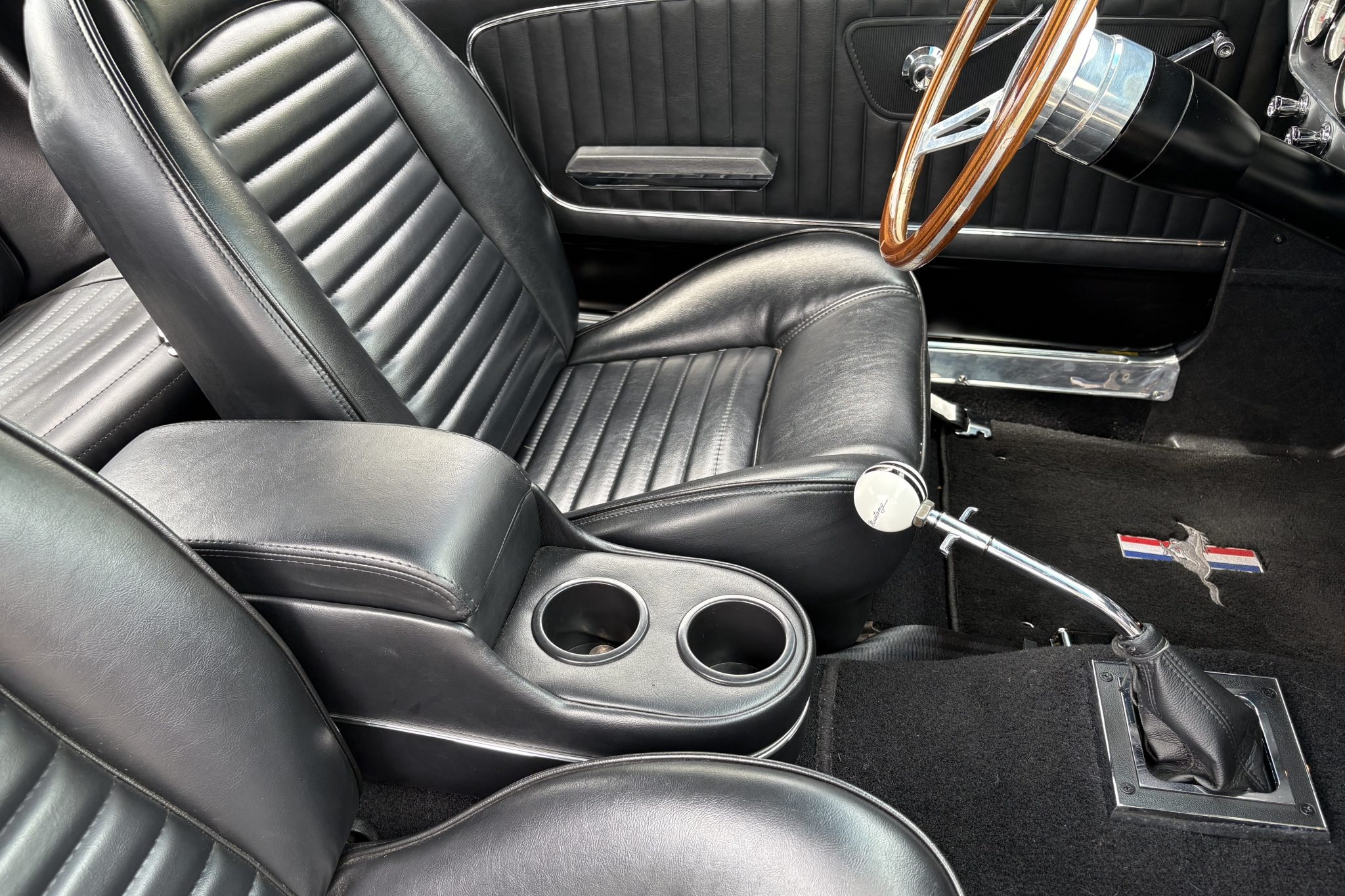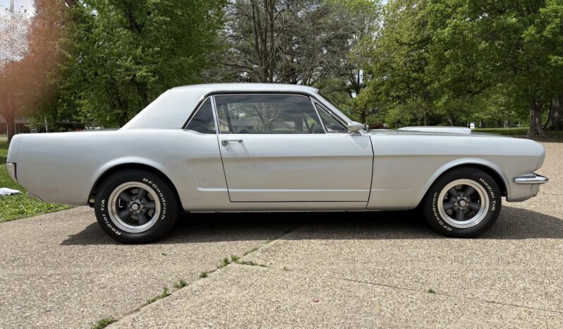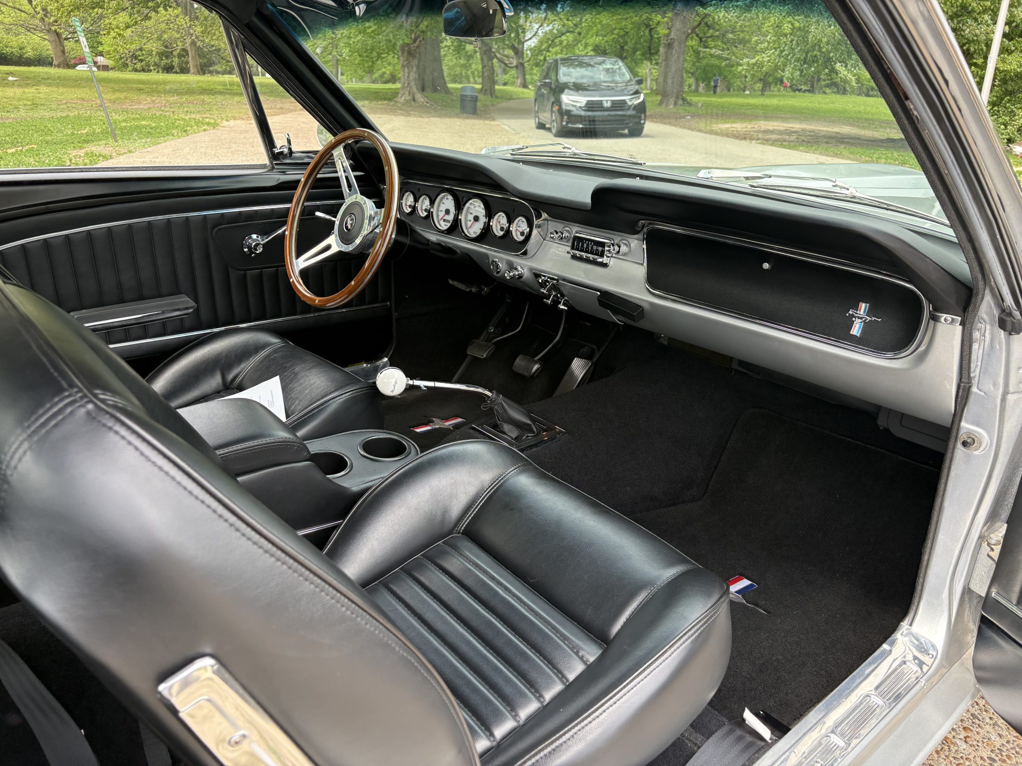 refurbishment work completed in 2015 involved overhauling the 289ci V8, refinishing the car in silver, and refreshing the black interior. The engine is equipped with a Weiand intake manifold and a Street Demon carburetor, the interior features TMI Products seating, and the car rides on 15″ American Racing Torq Thrust wheels and Grab-A-Trak suspension components. Additional equipment includes four-wheel disc brakes, power steering, MagnaFlow mufflers, a hood scoop, and bullet-style side mirrors.